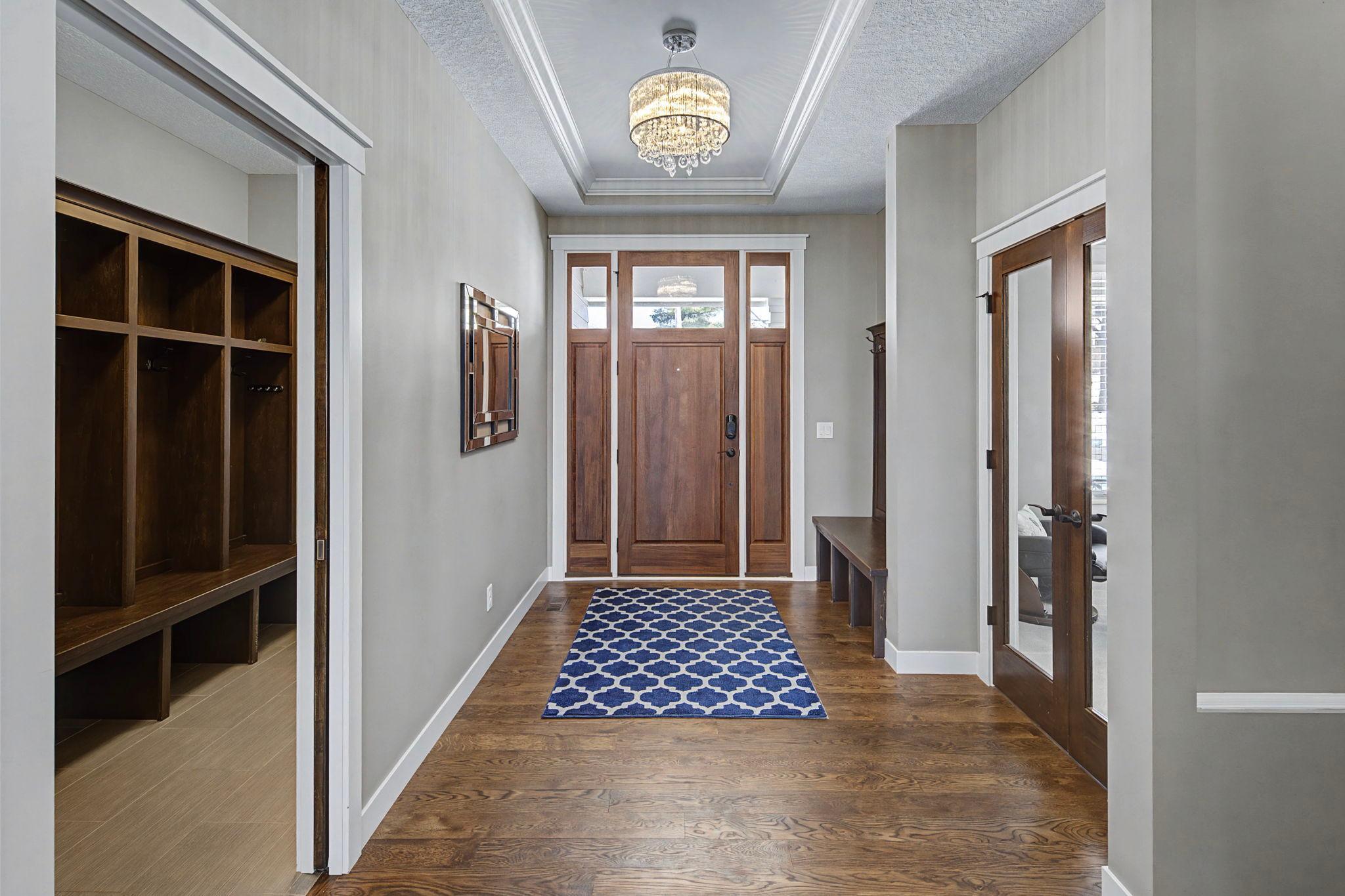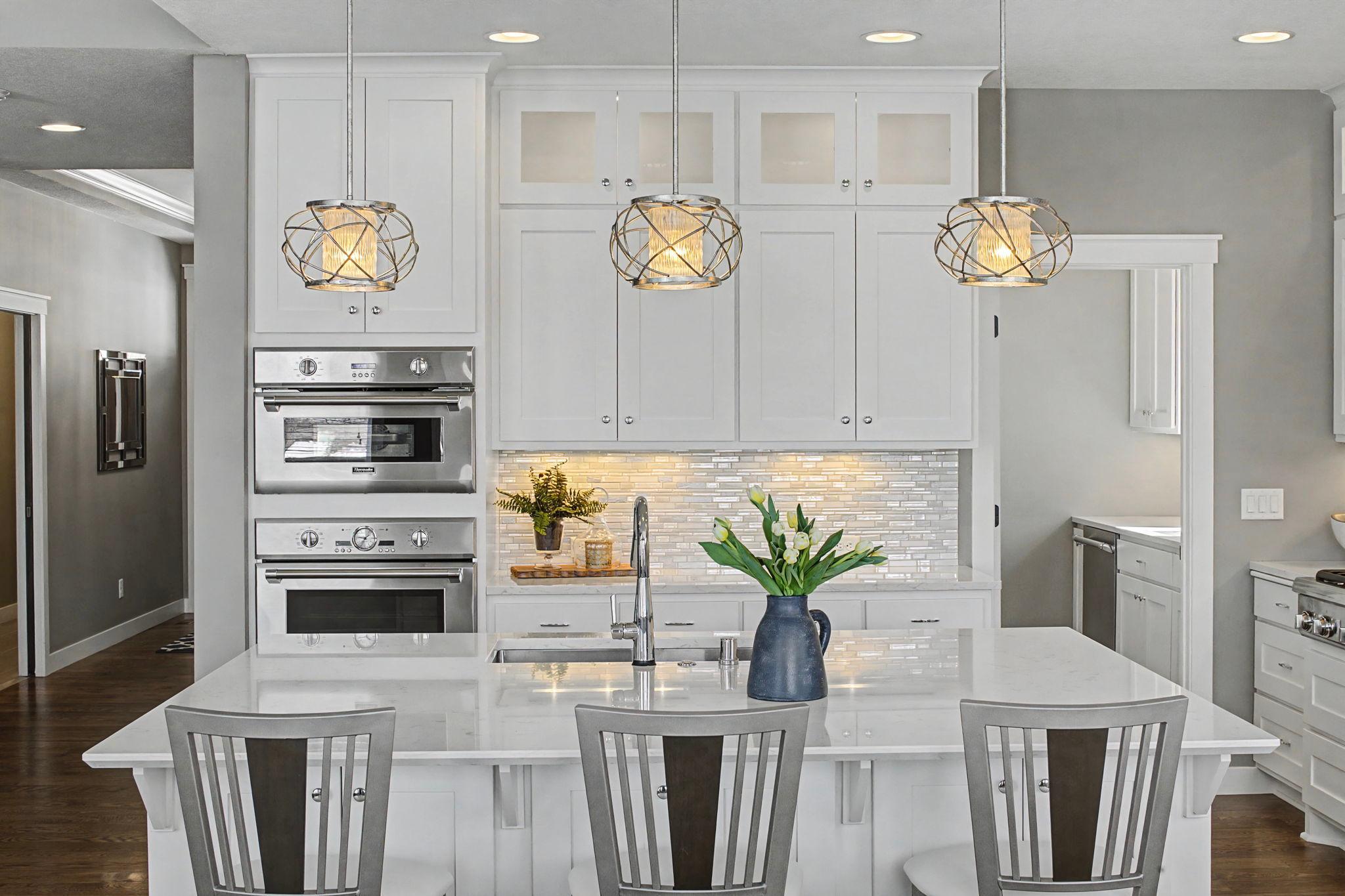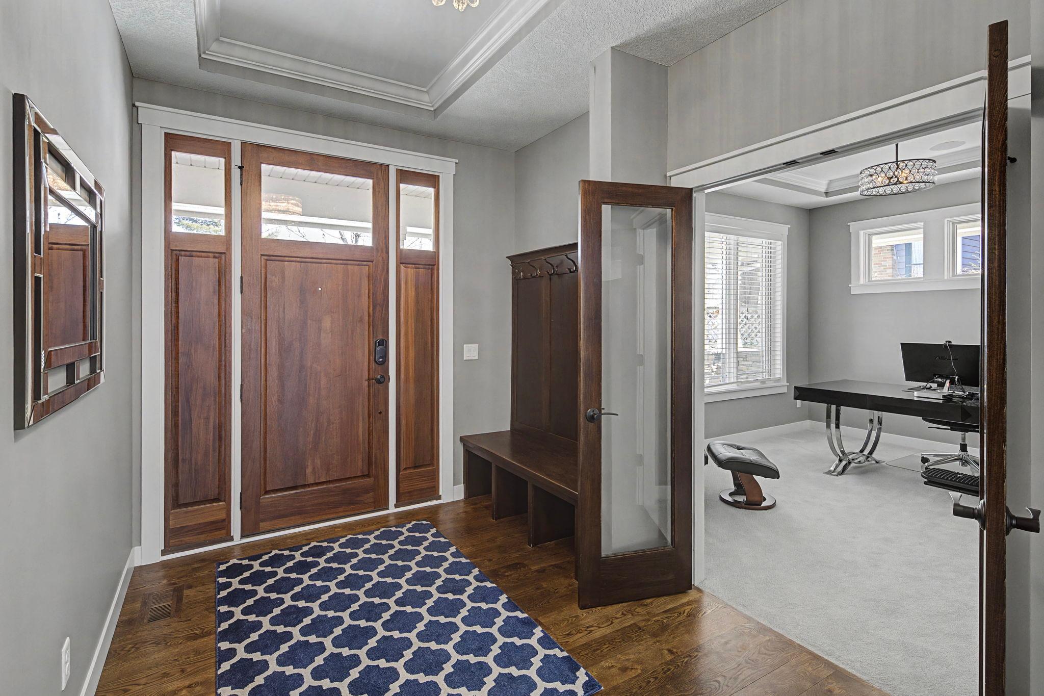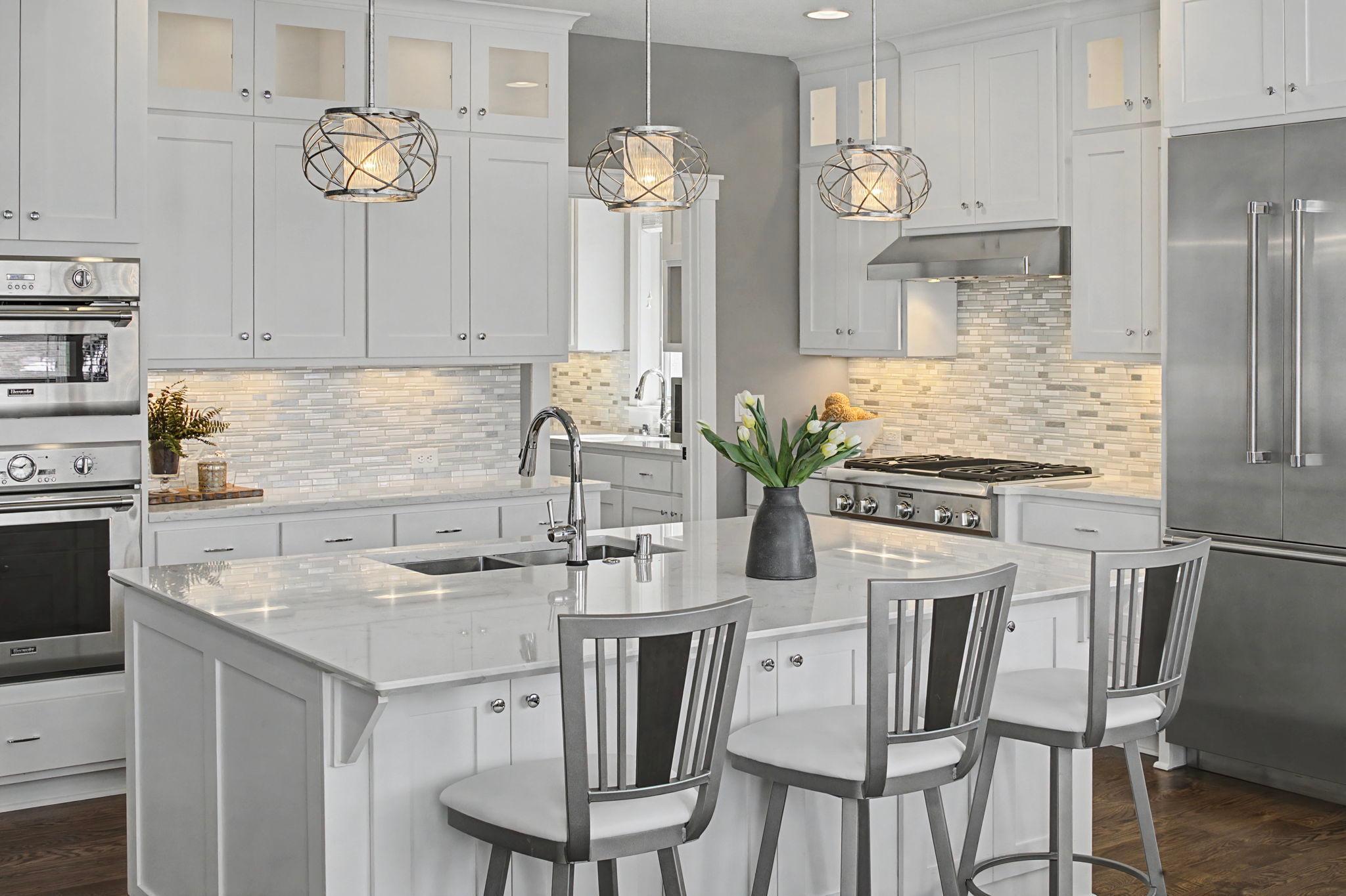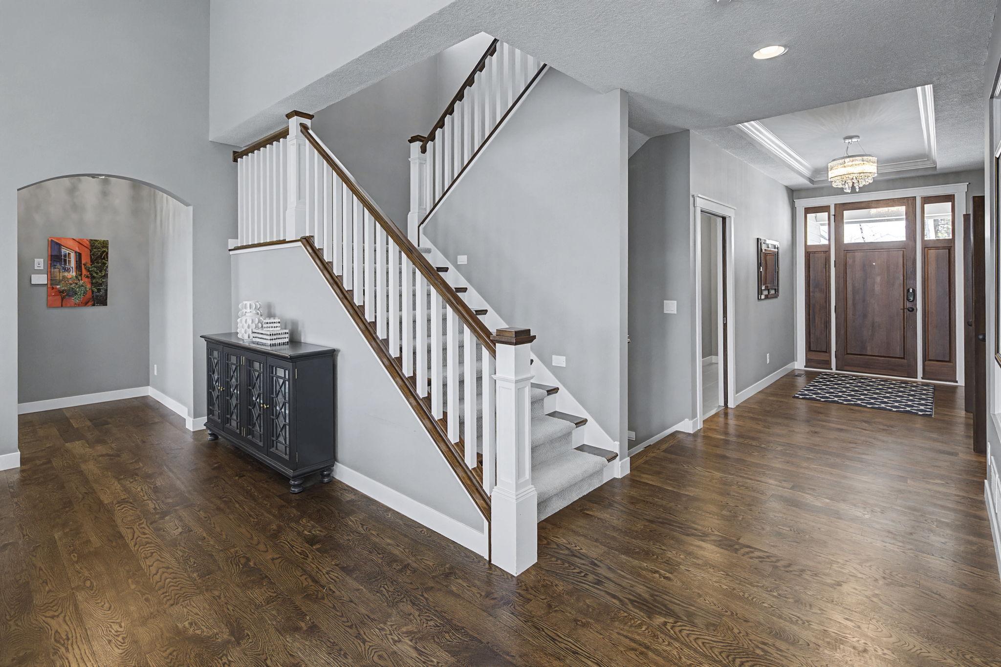 Set on a beautiful west facing double lot just steps to Lake Bde Maka Ska, this wonderful newer home features high ceilings, great natural light, a rare main level primary suite, and walls of glass overlooking the fully fenced rear yard. Take advantage of the spacious main level deck, front covered porch, and walkout level EZ screened porch. The main level features a 2-story great room with fireplace open to the expansive center island kitchen with Cambria counters, top-of-the-line appliances, hardwood floors and walk-in pantry, as well as a terrific den/office, ½ bath, mudroom, and heated attached garage. The convenient main level primary suite features a vaulted bedroom and full bath with dual vanities. Two additional bedrooms, bath and laundry are found on the upper level, while the walkout lower level offers a 4th bedroom, two baths, media room, exercise room, generous family room with 2-sided gas fireplace & wet bar, as well as access to the screened porch.