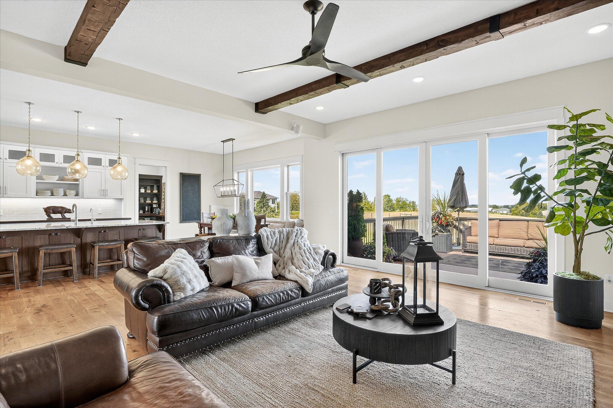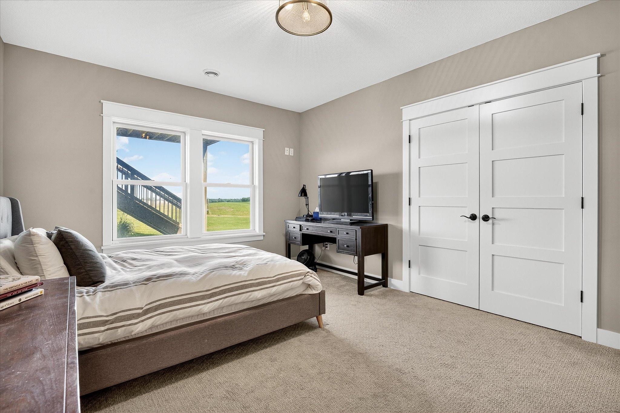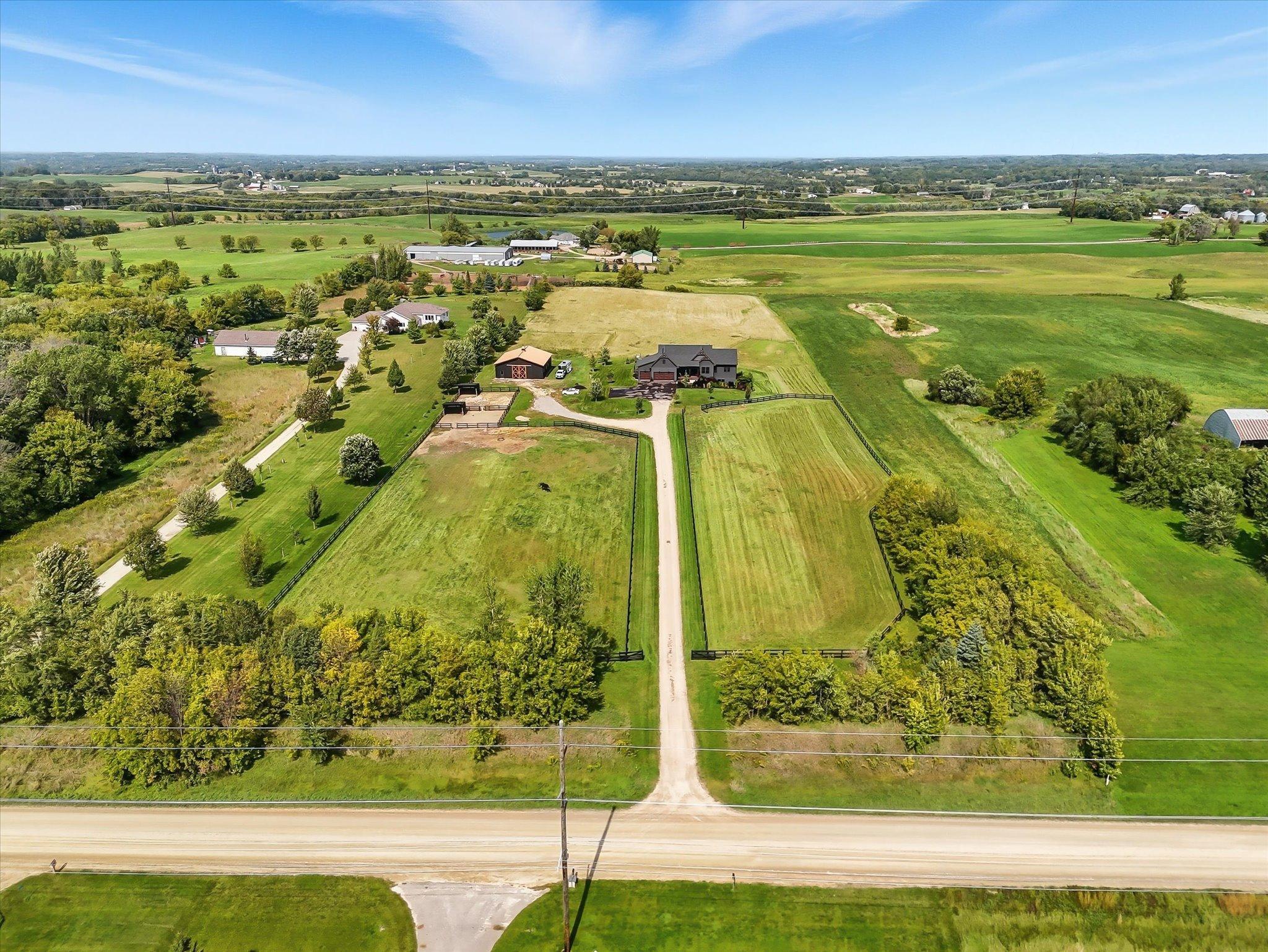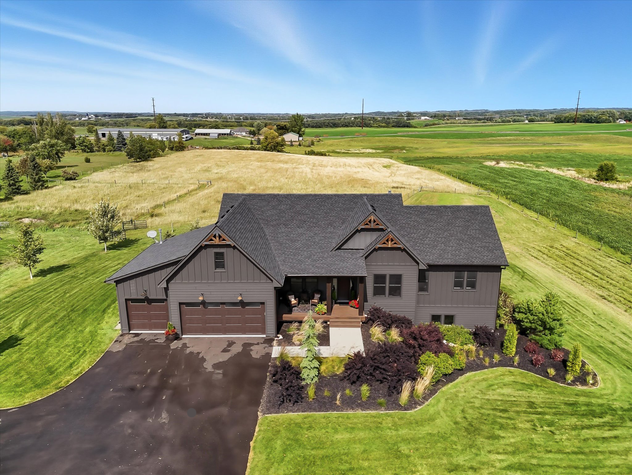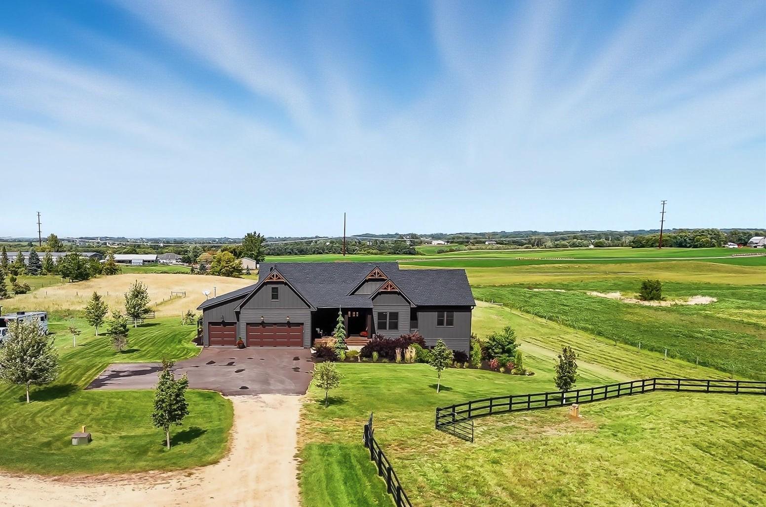 Welcome to a beautifully designed hobby farm opportunity in Elko New Market, offering space, functionality, and modern comfort on nearly 10 acres of usable land. Built in 2018, this custom rambler provides over 4,000 finished square feet with 4 bedrooms, 4 bathrooms, and a thoughtfully designed open-concept layout. The main level features spacious living areas filled with natural light, oversized windows, and seamless flow between the kitchen, dining, and living spaces. Double doors off the main living area open to a maintenance-free deck, creating an easy transition to outdoor living while taking in peaceful countryside views. The kitchen includes a large center island, walk-in pantry, and abundant cabinetry—ideal for everyday living and entertaining. The main-level primary suite offers a private bath, walk-in closet, and convenient access to the laundry room. A dedicated office/study provides flexibility for remote work or additional living space. The finished walkout lower level expands your living options with three additional bedrooms, including a Jack and Jill full bathroom, an additional ¾ bath, and generous open space for a family room, recreation area, or home gym. Designed with hobby farm and equestrian use in mind, the property includes three fenced pastures, water lines servicing the paddocks, and two lean-to shelters. A 42’ x 48’ pole building offers excellent potential for a future barn setup with space planned for 12’ stalls and a center aisle. Power and water are roughed in nearby, providing a strong foundation for future improvements. The front paddock features packed Class 5 footing, and pastures are seeded with a quality pasture mix. The heated 3-car garage adds functionality with a double bay depth of approximately 23’ and an extended third stall at 26’ deep, complete with a floor drain and utility sink. This property offers a rare combination of newer construction, acreage, scenic views, and infrastructure already in place—ideal for those seeking a hobby farm, equestrian property, or additional space with room to grow.