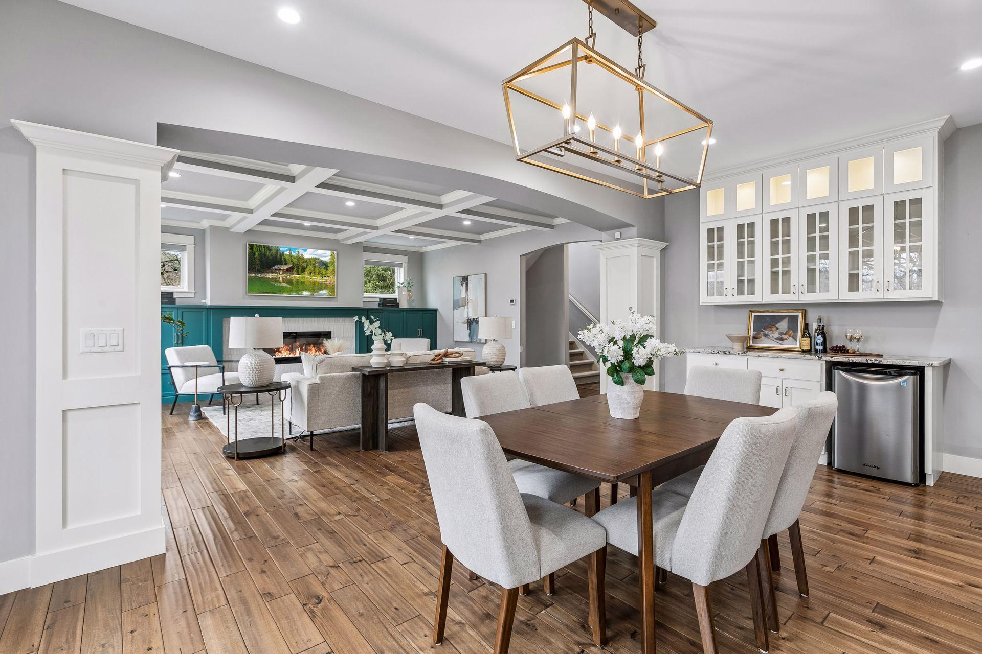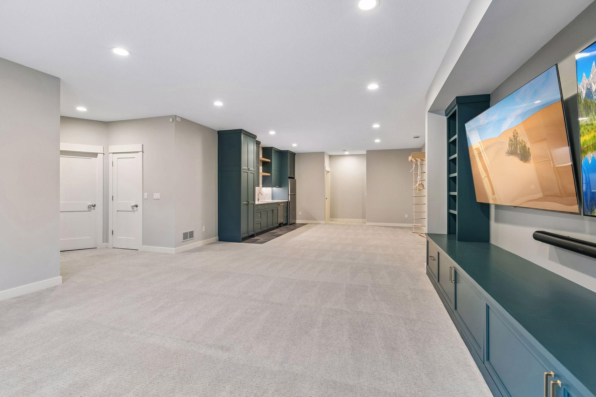 The lower level is an entertainer's paradise, boasting a custom-designed entertainment center with dual TVs, making it the ultimate spot for sports fans to cheer on their favorite teams in style.