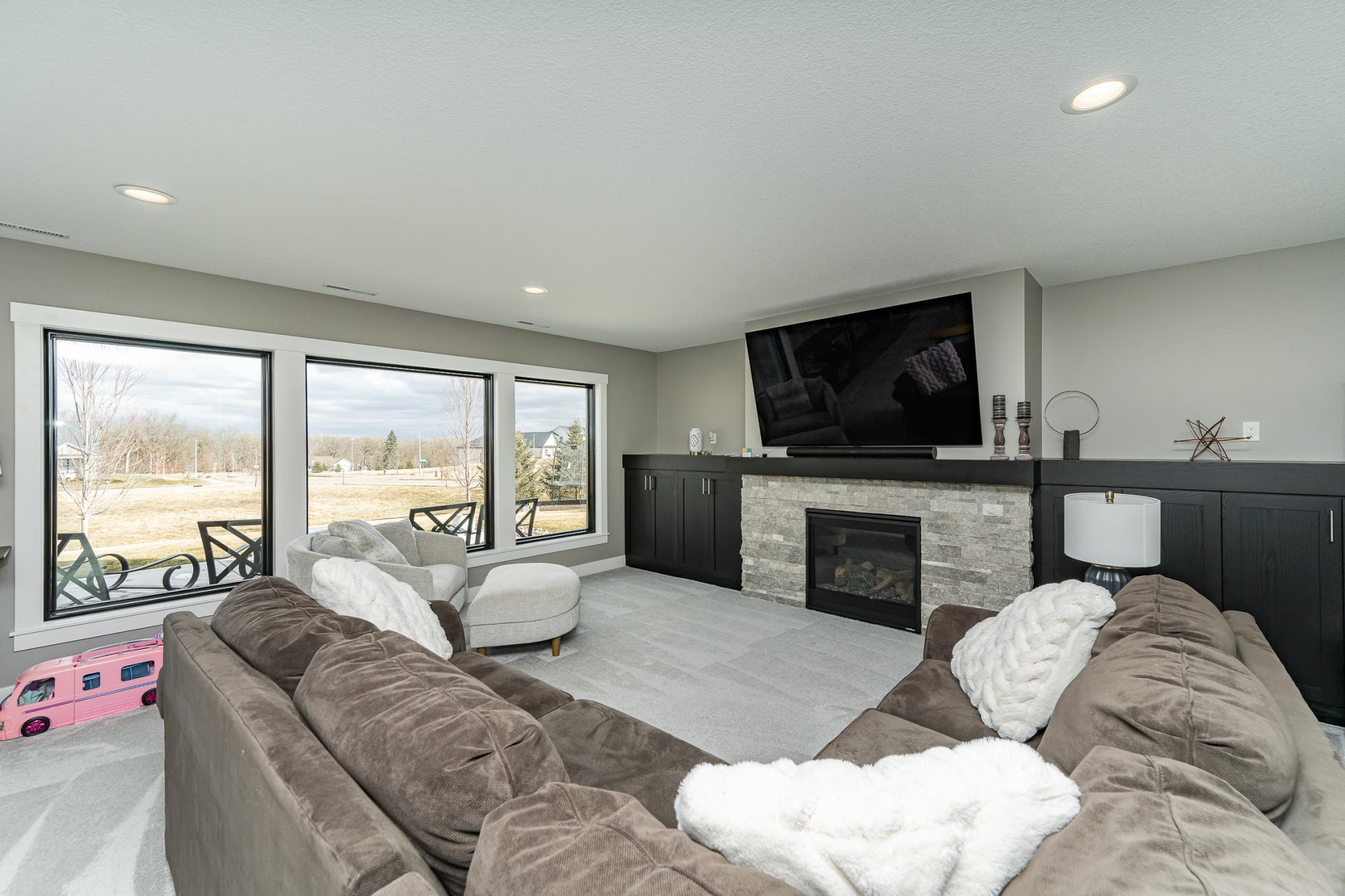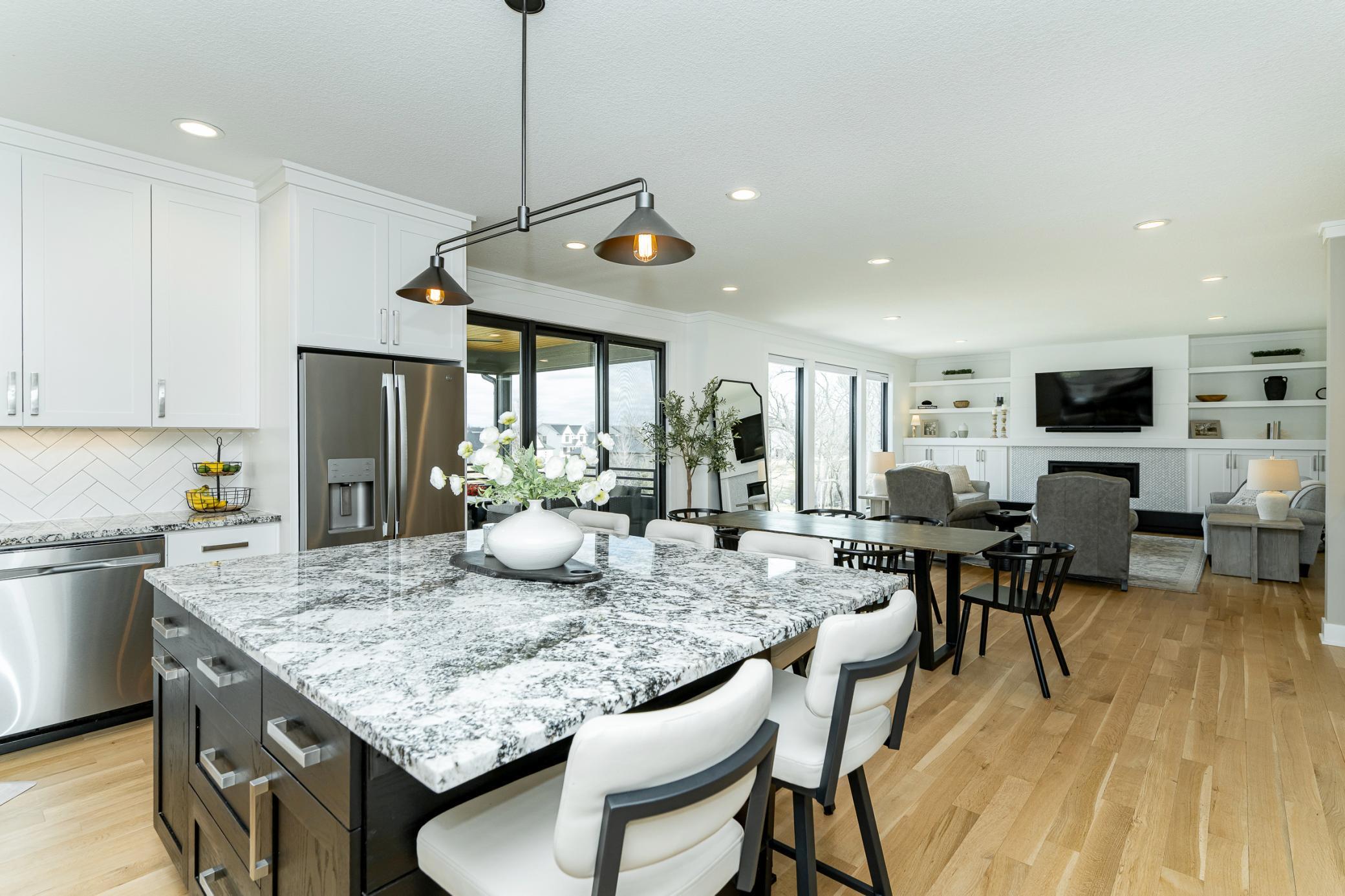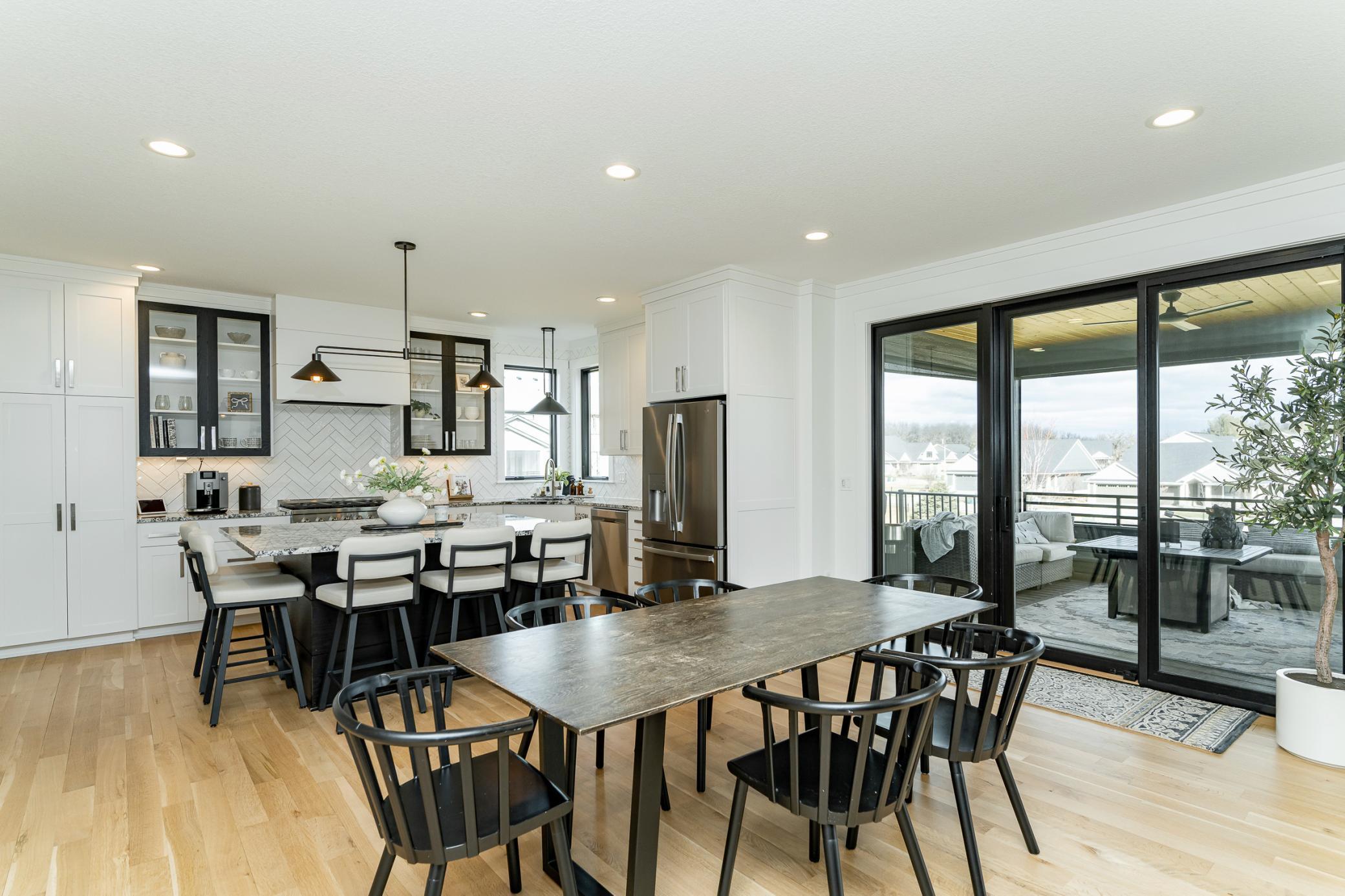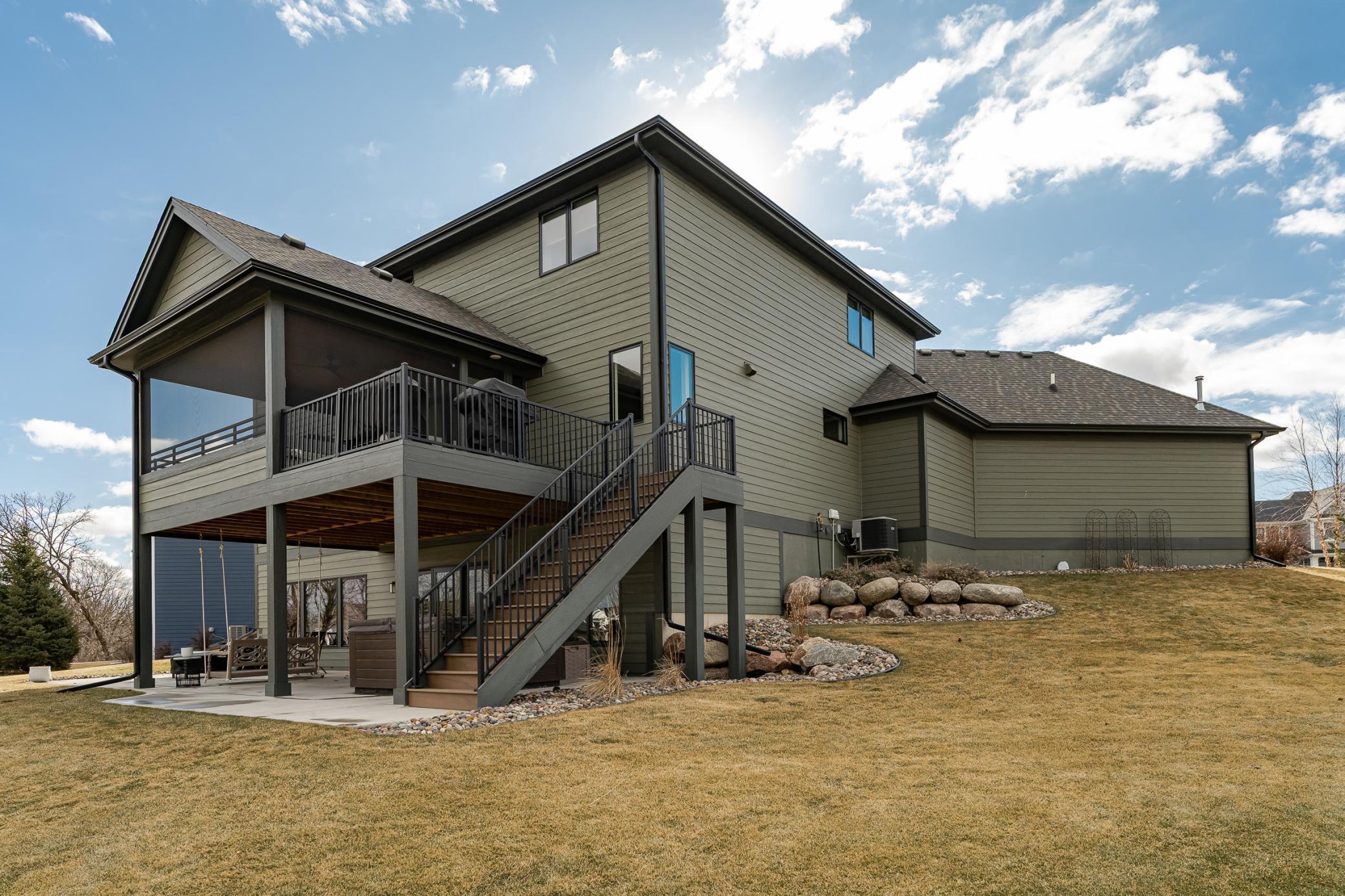 Welcome to Scenic Oaks West, where thoughtful design and elevated living come together in this beautifully finished walkout two-story home. From the moment you arrive, the home’s striking angled architecture and standout curb appeal create an inviting first impression. Inside, a bright and open layout is designed for both effortless entertaining and everyday comfort. The custom kitchen anchors the main level with a large center island, walk-in pantry, and seamless flow into the dining area and spacious family room, highlighted by a warm fireplace and abundant natural light. A dedicated study and versatile flex room provides additional space for work, hobbies, or entertaining. Just off the main living area, step onto the covered and screened deck, creating the perfect indoor-outdoor retreat for morning coffee or quiet evenings. The outdoor swing remains with the home, adding a charming and relaxing spot to enjoy the peaceful setting. Upstairs, the private primary suite offers a comfortable retreat with a spacious ensuite bath. Three additional bedrooms complete the level, including a Jack-and-Jill bath and a junior ensuite, along with a generously sized upper-level laundry room designed for convenience. The fully finished walkout lower level expands the home’s living space even further, featuring an expansive family room with fireplace, a stylish wet bar ideal for hosting, a dedicated home gym, a fifth bedroom, and an additional bath - creating the perfect environment for entertaining, guests, or everyday living. Blending thoughtful design, flexible spaces, and beautiful finishes, this Scenic Oaks West home delivers the ideal balance of style, comfort, and functionality.