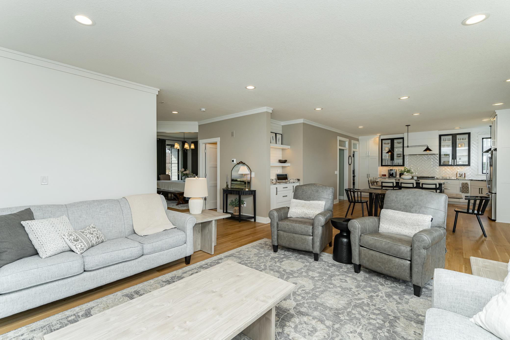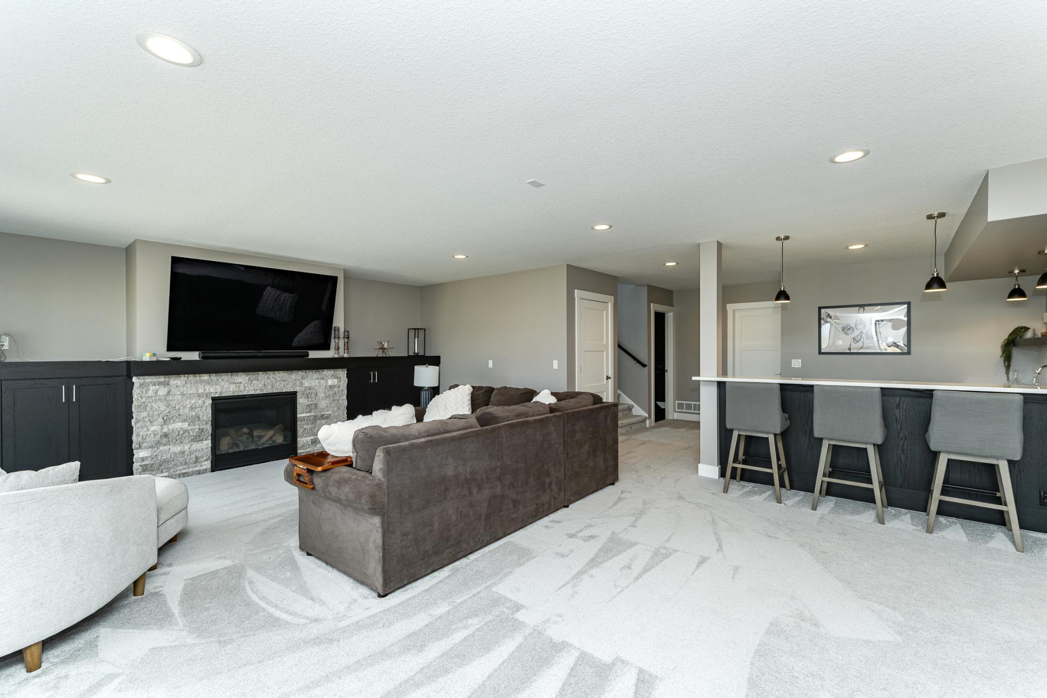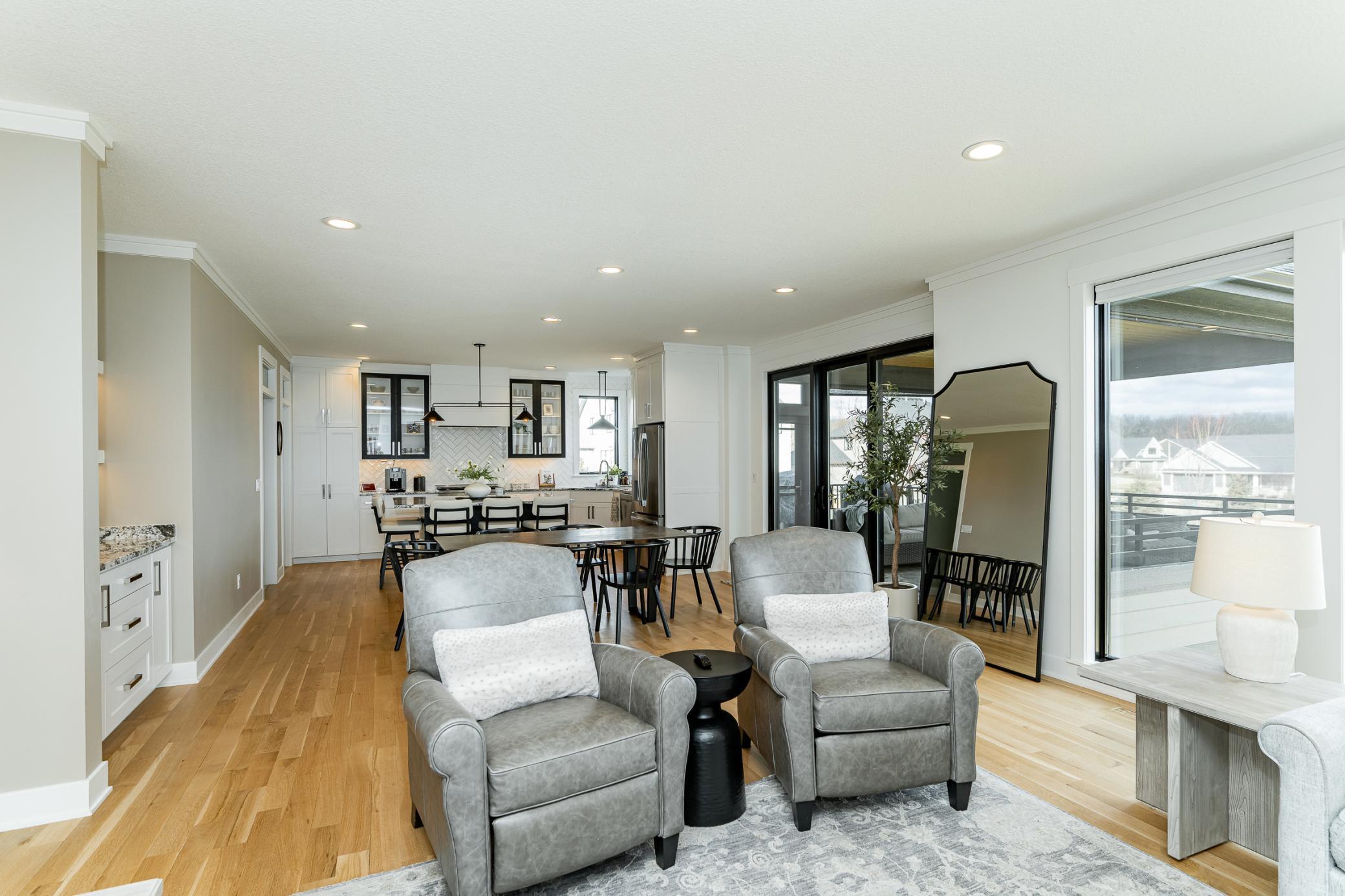 Welcome to Scenic Oaks West, where thoughtful design and elevated living come together in this beautifully finished walkout two-story home. From the moment you arrive, the home’s striking angled architecture and standout curb appeal create an inviting first impression. Inside, a bright and open layout is designed for both effortless entertaining and everyday comfort. The custom kitchen anchors the main level with a large center island, walk-in pantry, and seamless flow into the dining area and spacious family room, highlighted by a warm fireplace and abundant natural light. A dedicated study and versatile flex room provides additional space for work, hobbies, or entertaining. Just off the main living area, step onto the covered and screened deck, creating the perfect indoor-outdoor retreat for morning coffee or quiet evenings. The outdoor swing remains with the home, adding a charming and relaxing spot to enjoy the peaceful setting. Upstairs, the private primary suite offers a comfortable retreat with a spacious ensuite bath. Three additional bedrooms complete the level, including a Jack-and-Jill bath and a junior ensuite, along with a generously sized upper-level laundry room designed for convenience. The fully finished walkout lower level expands the home’s living space even further, featuring an expansive family room with fireplace, a stylish wet bar ideal for hosting, a dedicated home gym, a fifth bedroom, and an additional bath - creating the perfect environment for entertaining, guests, or everyday living. Blending thoughtful design, flexible spaces, and beautiful finishes, this Scenic Oaks West home delivers the ideal balance of style, comfort, and functionality.