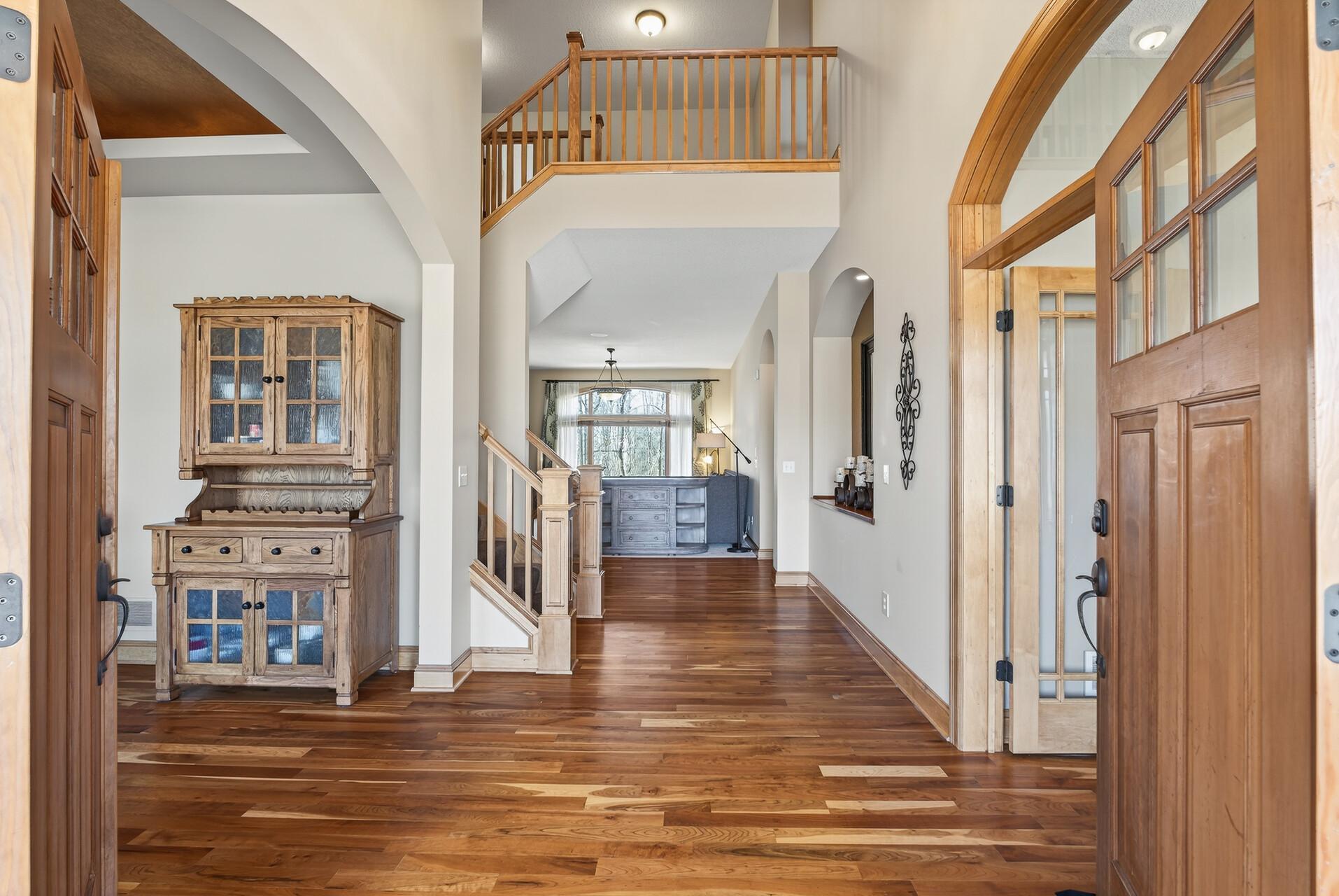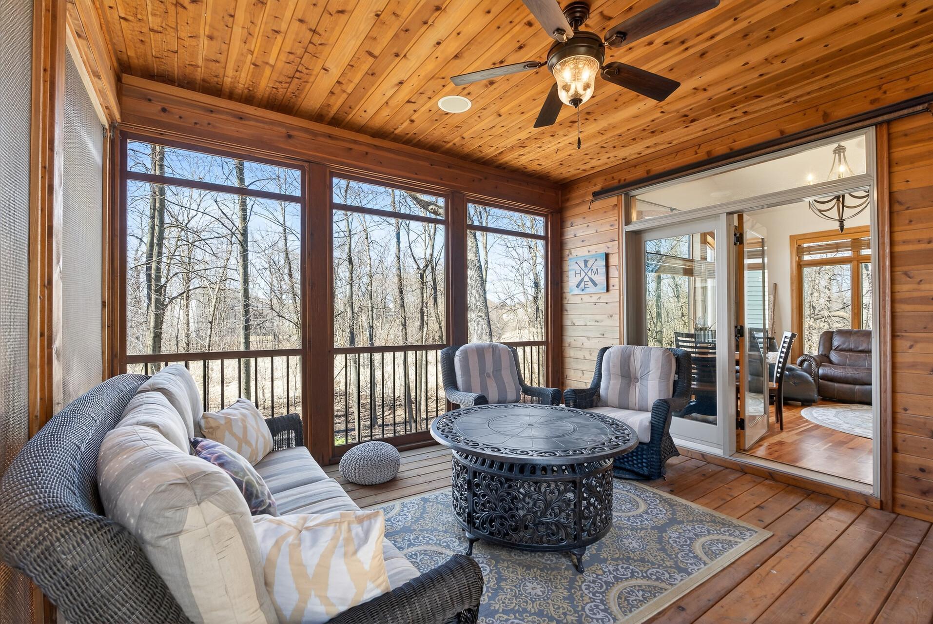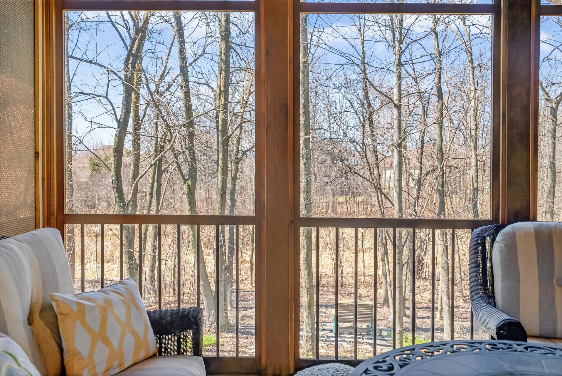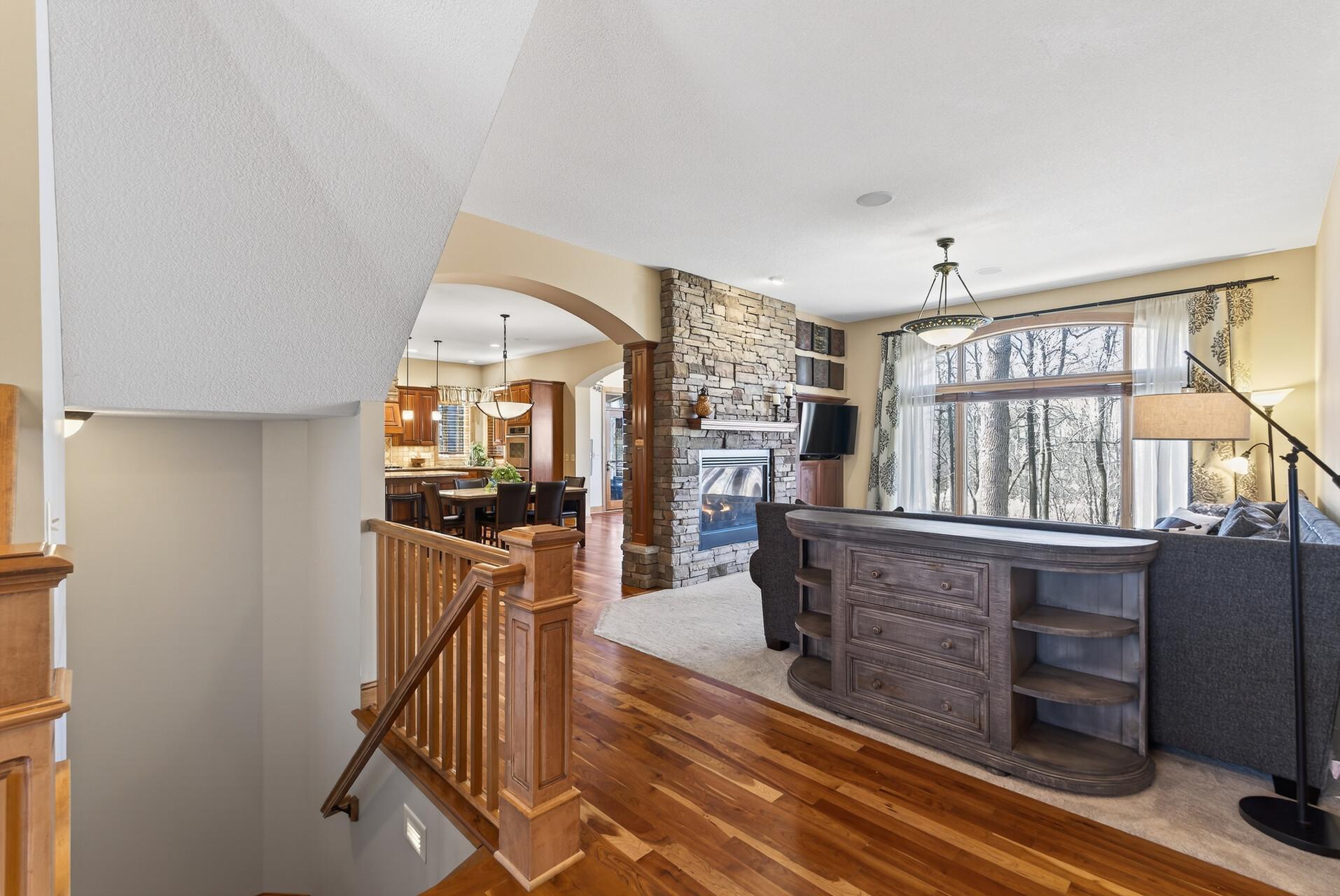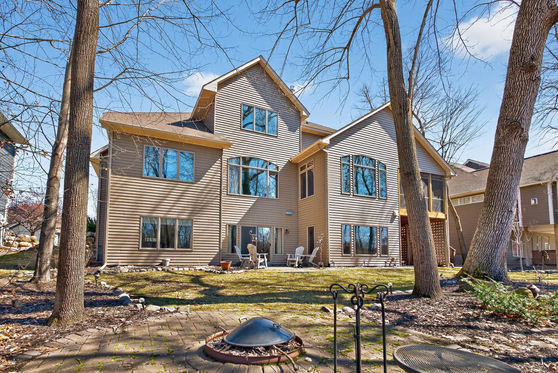Welcome to this exceptional custom home in sought-after Dunlavin Woods, where craftsmanship, space, and thoughtful design come together beautifully. From the striking paver circular driveway and pillared front porch to the wooded backyard and wetland views, the setting is just as impressive as the home itself. Inside, you’ll find cherrywood floors, vaulted ceilings, and a stunning 3-sided fireplace anchoring the main living spaces. The gourmet kitchen features granite countertops, stainless steel appliances, a center island, walk-in pantry, and mini bar—perfect for everyday living and entertaining alike. A vaulted four-season porch flows seamlessly to the screened porch, deck, and paver patio, creating incredible indoor-outdoor living. The main-level primary suite offers privacy and comfort with a spacious layout, heated bathroom floors, jetted tub, walk-in shower, and dual vanities. Upstairs includes three generously sized bedrooms, including a Jack-and-Jill bath and an additional private bath, plus a massive bonus room with its own fireplace. The fully finished walkout lower level is built for entertaining, complete with a full bar, second kitchen, large amusement space, additional bedroom, and flexible rooms ideal for a home gym, office, or hobby space. Additional highlights include heated floors, newer mechanicals, built-ins throughout, central vacuum, whole-home sound system, main-level laundry with mudroom, and a heated garage with floor drain, lift system, and access to both the main and lower levels. Enjoy a low-maintenance yard, abundant wildlife, and a neighborhood known for its strong sense of community. This is a rare opportunity to own a truly well-appointed home with space, function, and character at every turn.