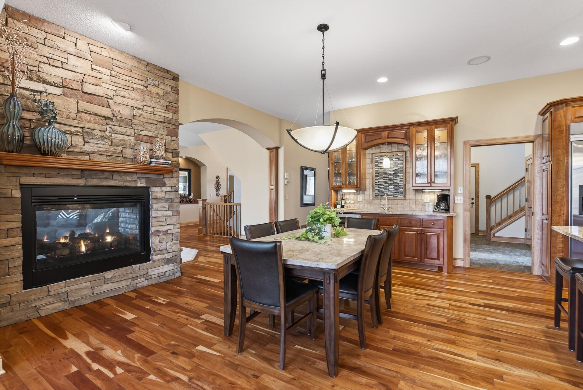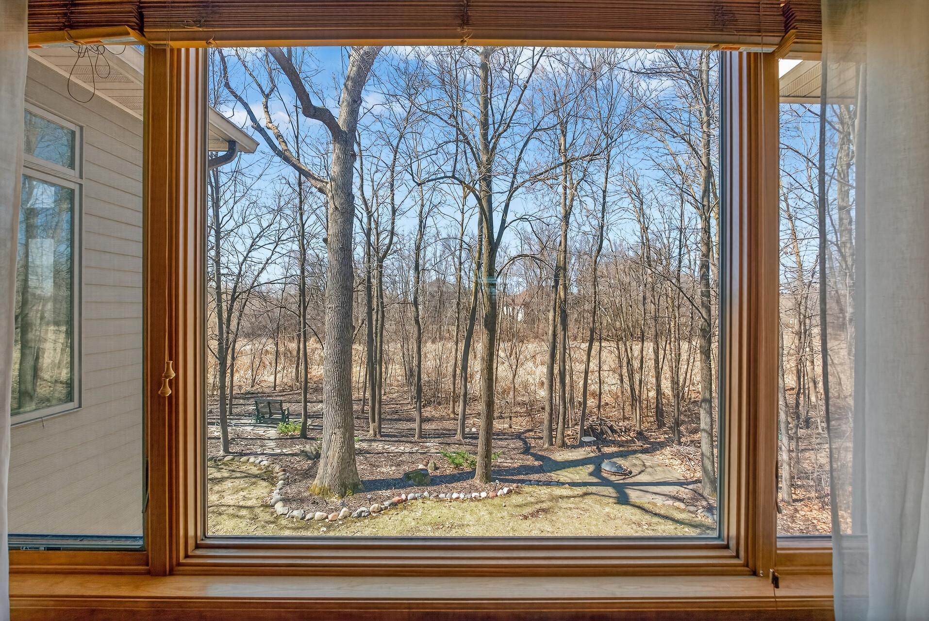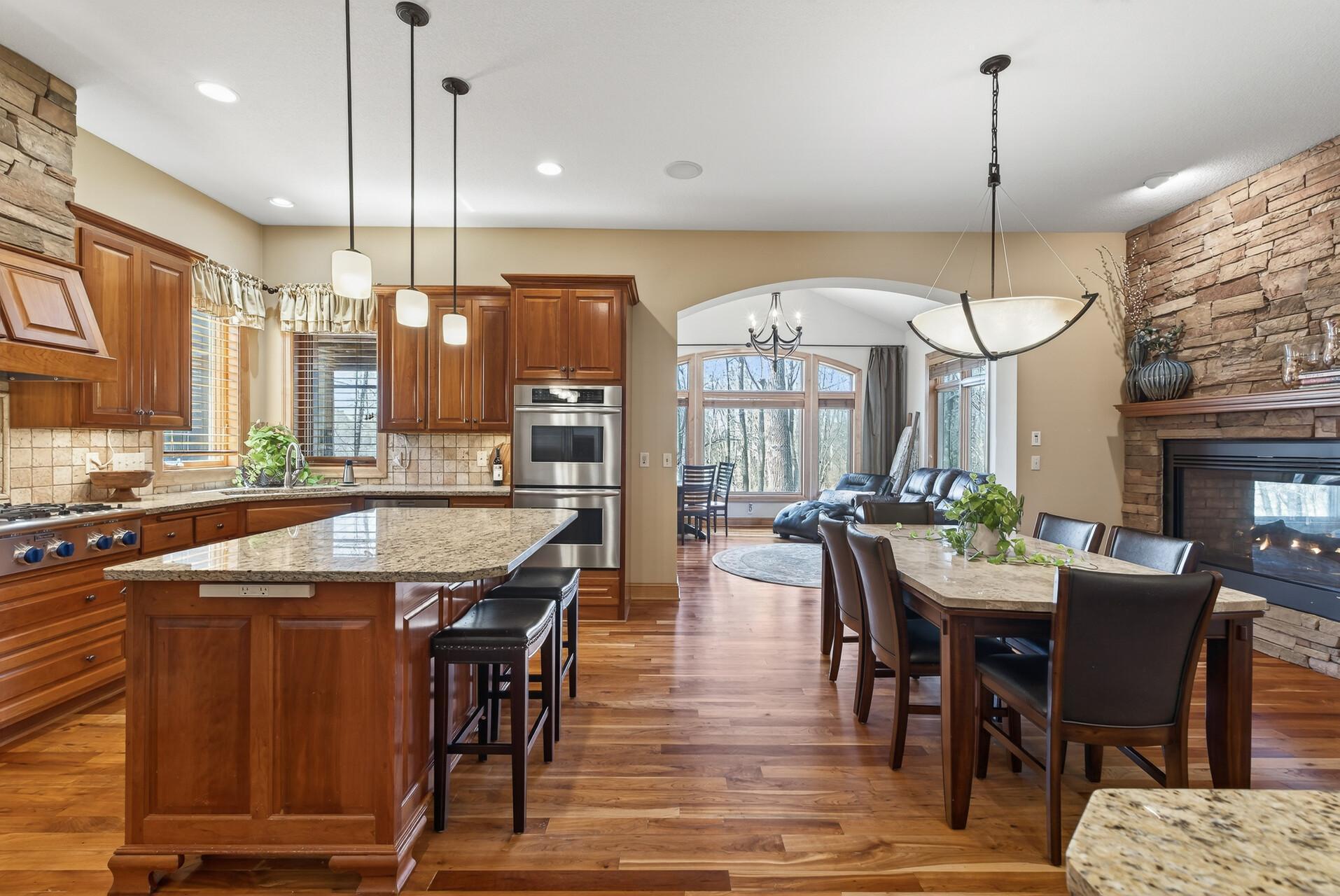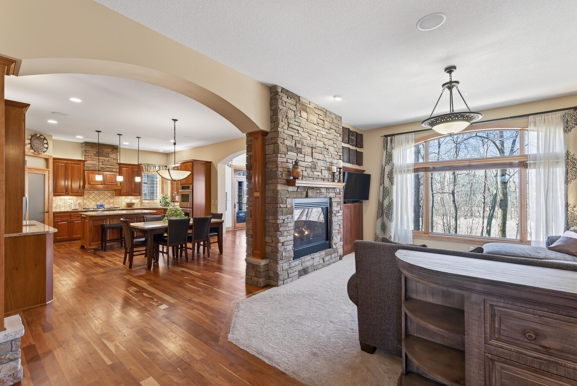 Welcome to this exceptional custom home in sought-after Dunlavin Woods, where craftsmanship, space, and thoughtful design come together beautifully. From the striking paver circular driveway and pillared front porch to the wooded backyard and wetland views, the setting is just as impressive as the home itself. Inside, you’ll find cherrywood floors, vaulted ceilings, and a stunning 3-sided fireplace anchoring the main living spaces. The gourmet kitchen features granite countertops, stainless steel appliances, a center island, walk-in pantry, and mini bar—perfect for everyday living and entertaining alike. A vaulted four-season porch flows seamlessly to the screened porch, deck, and paver patio, creating incredible indoor-outdoor living. The main-level primary suite offers privacy and comfort with a spacious layout, heated bathroom floors, jetted tub, walk-in shower, and dual vanities. Upstairs includes three generously sized bedrooms, including a Jack-and-Jill bath and an additional private bath, plus a massive bonus room with its own fireplace. The fully finished walkout lower level is built for entertaining, complete with a full bar, second kitchen, large amusement space, additional bedroom, and flexible rooms ideal for a home gym, office, or hobby space. Additional highlights include heated floors, newer mechanicals, built-ins throughout, central vacuum, whole-home sound system, main-level laundry with mudroom, and a heated garage with floor drain, lift system, and access to both the main and lower levels. Enjoy a low-maintenance yard, abundant wildlife, and a neighborhood known for its strong sense of community. This is a rare opportunity to own a truly well-appointed home with space, function, and character at every turn.