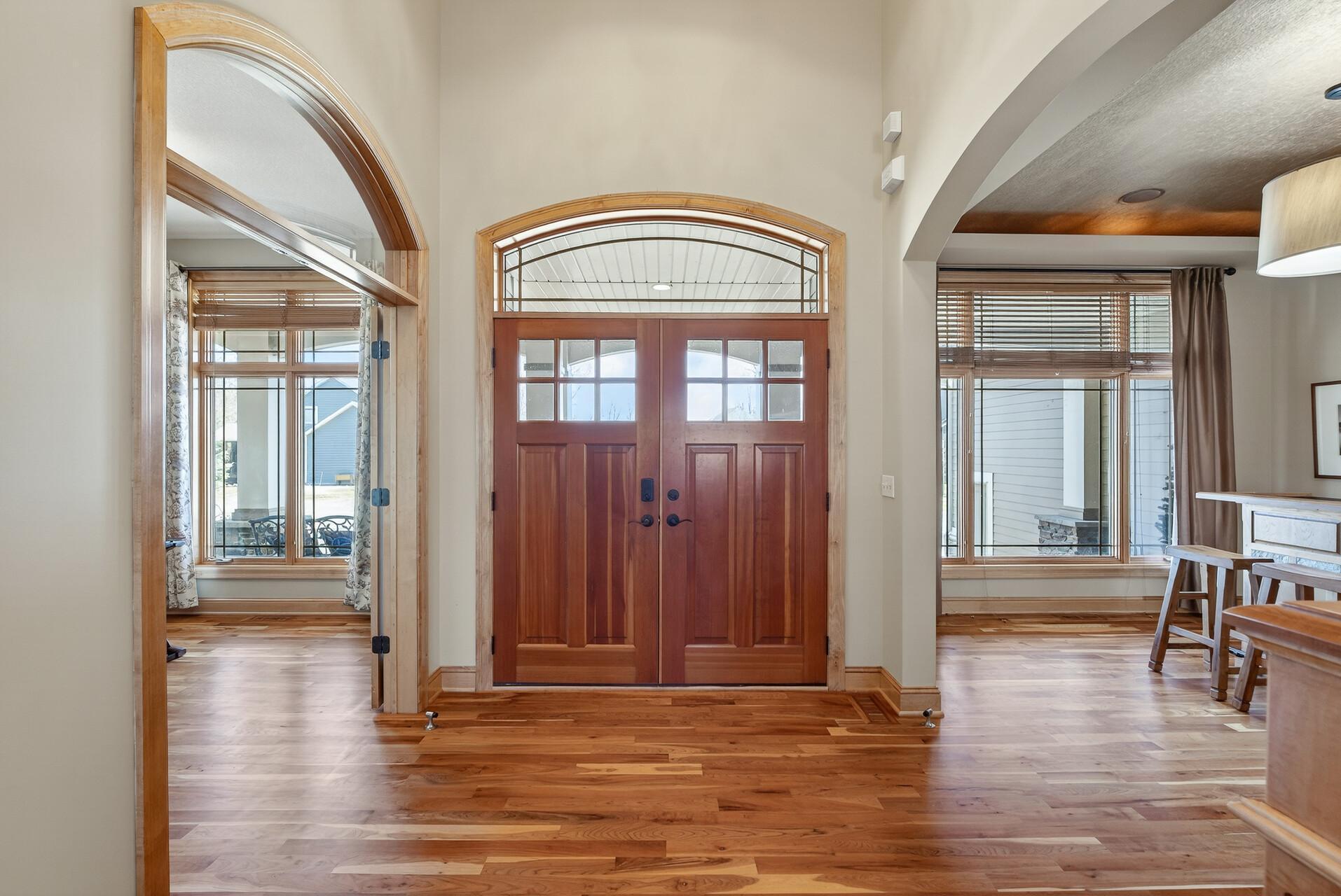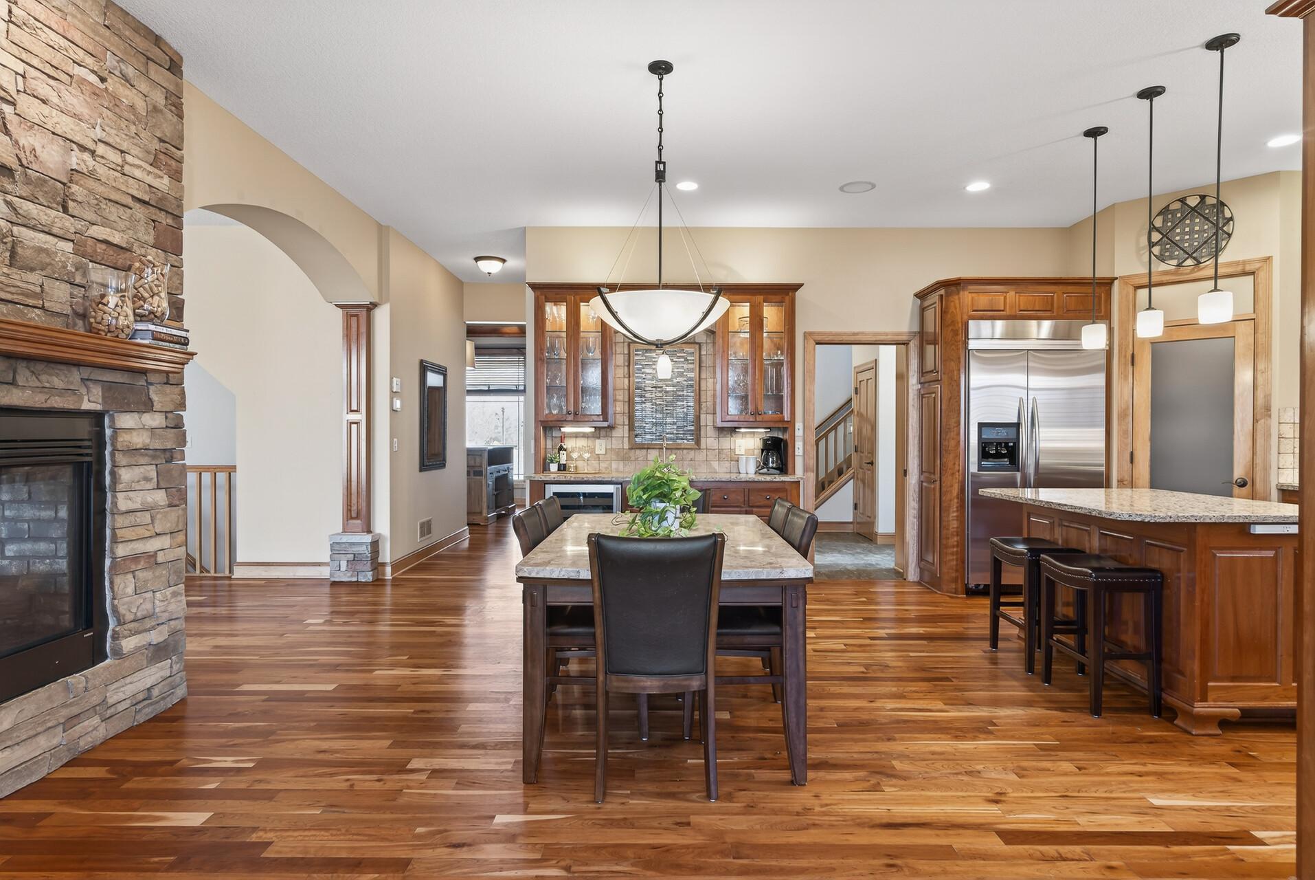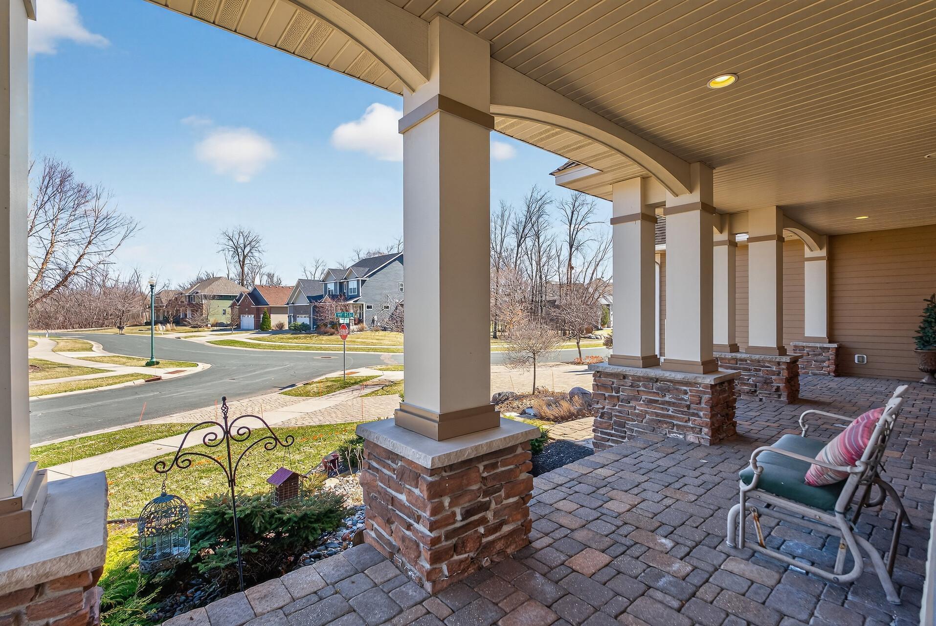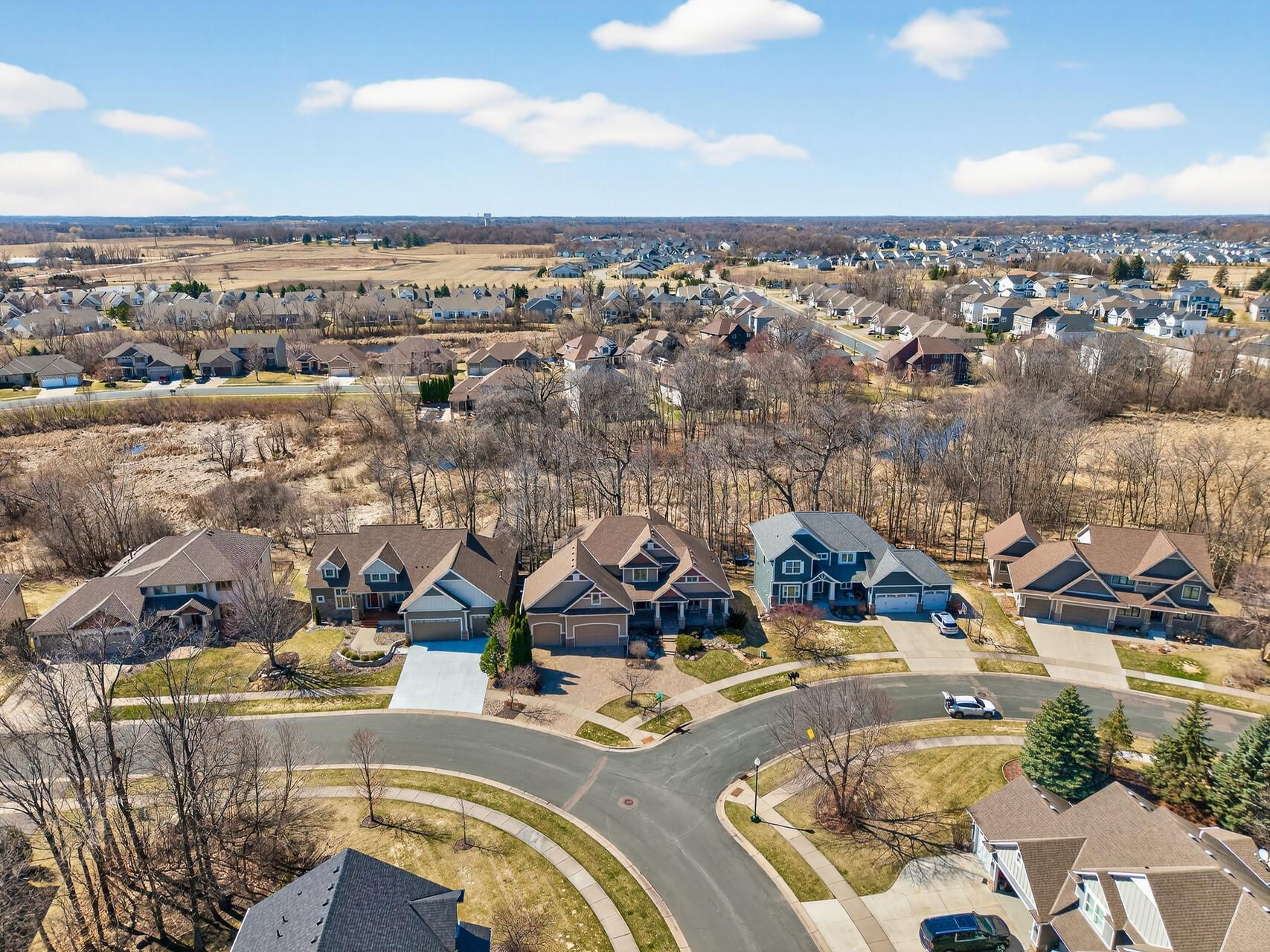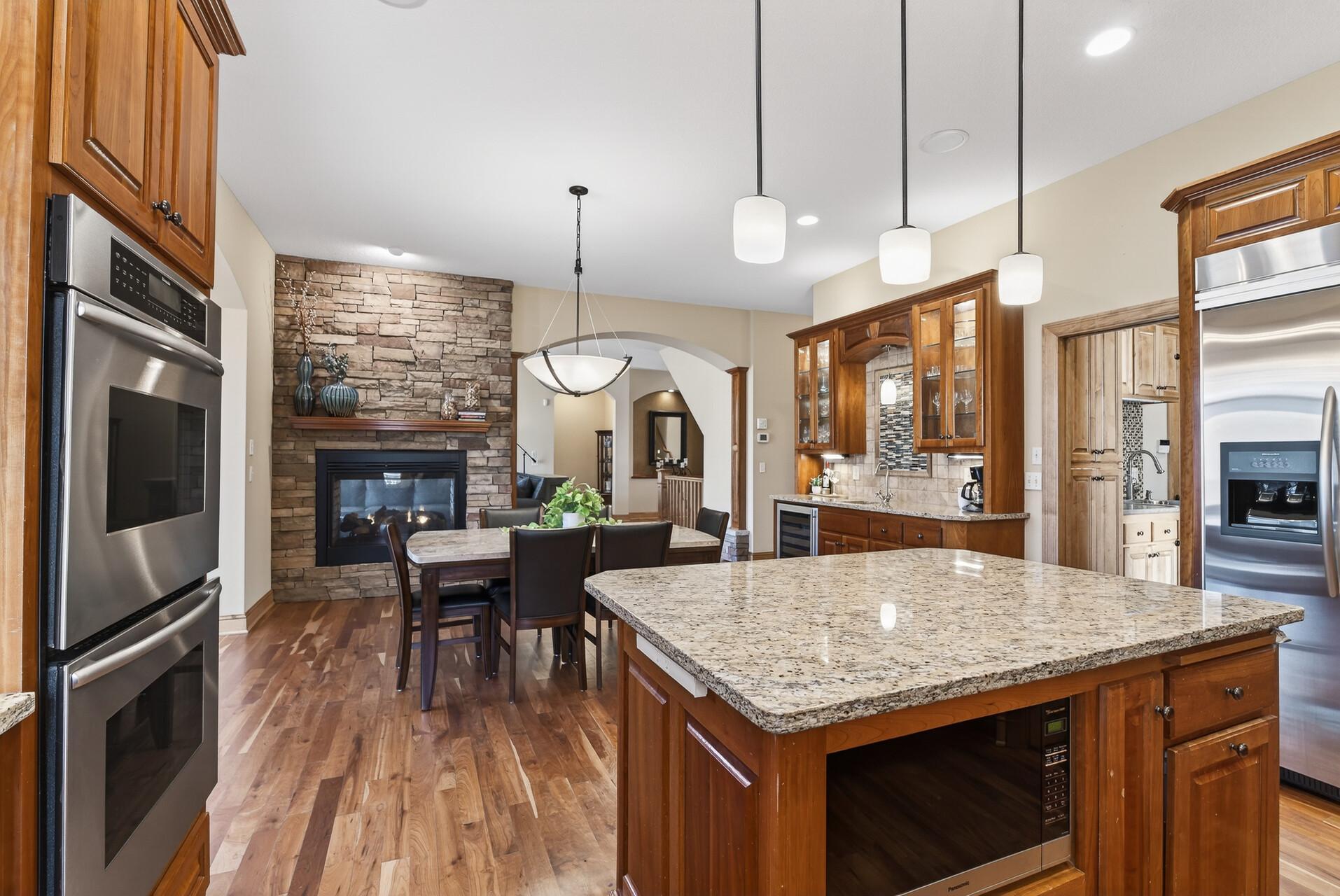 Welcome to this exceptional custom home in sought-after Dunlavin Woods, where craftsmanship, space, and thoughtful design come together beautifully. From the striking paver circular driveway and pillared front porch to the wooded backyard and wetland views, the setting is just as impressive as the home itself. Inside, you’ll find cherrywood floors, vaulted ceilings, and a stunning 3-sided fireplace anchoring the main living spaces. The gourmet kitchen features granite countertops, stainless steel appliances, a center island, walk-in pantry, and mini bar—perfect for everyday living and entertaining alike. A vaulted four-season porch flows seamlessly to the screened porch, deck, and paver patio, creating incredible indoor-outdoor living. The main-level primary suite offers privacy and comfort with a spacious layout, heated bathroom floors, jetted tub, walk-in shower, and dual vanities. Upstairs includes three generously sized bedrooms, including a Jack-and-Jill bath and an additional private bath, plus a massive bonus room with its own fireplace. The fully finished walkout lower level is built for entertaining, complete with a full bar, second kitchen, large amusement space, additional bedroom, and flexible rooms ideal for a home gym, office, or hobby space. Additional highlights include heated floors, newer mechanicals, built-ins throughout, central vacuum, whole-home sound system, main-level laundry with mudroom, and a heated garage with floor drain, lift system, and access to both the main and lower levels. Enjoy a low-maintenance yard, abundant wildlife, and a neighborhood known for its strong sense of community. This is a rare opportunity to own a truly well-appointed home with space, function, and character at every turn.