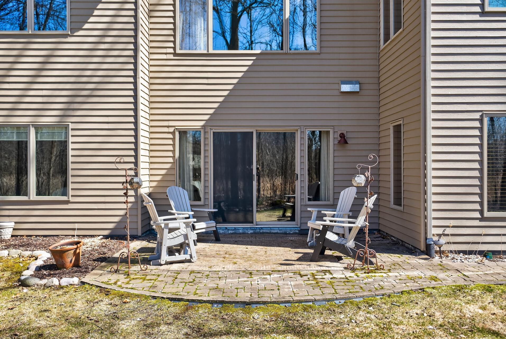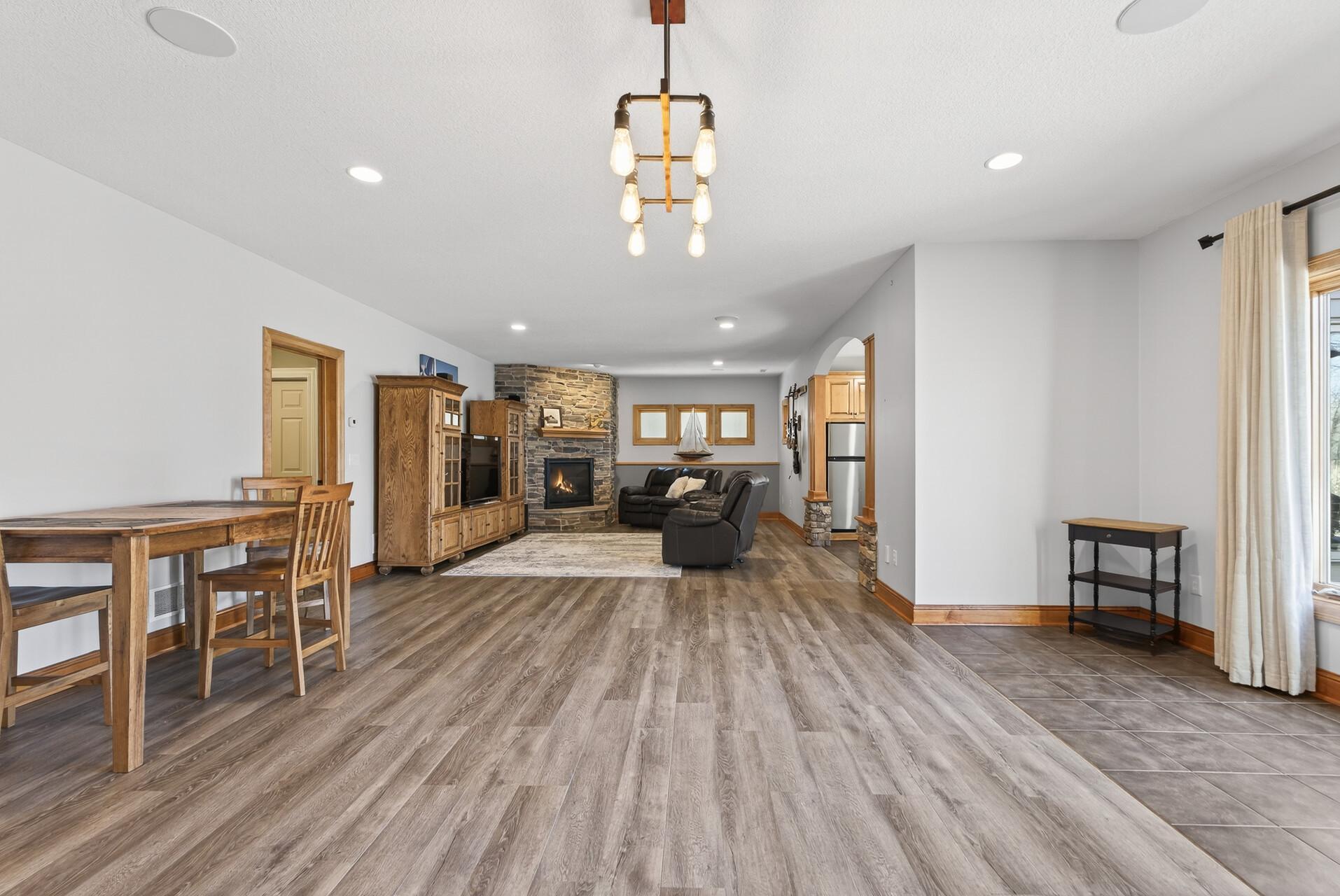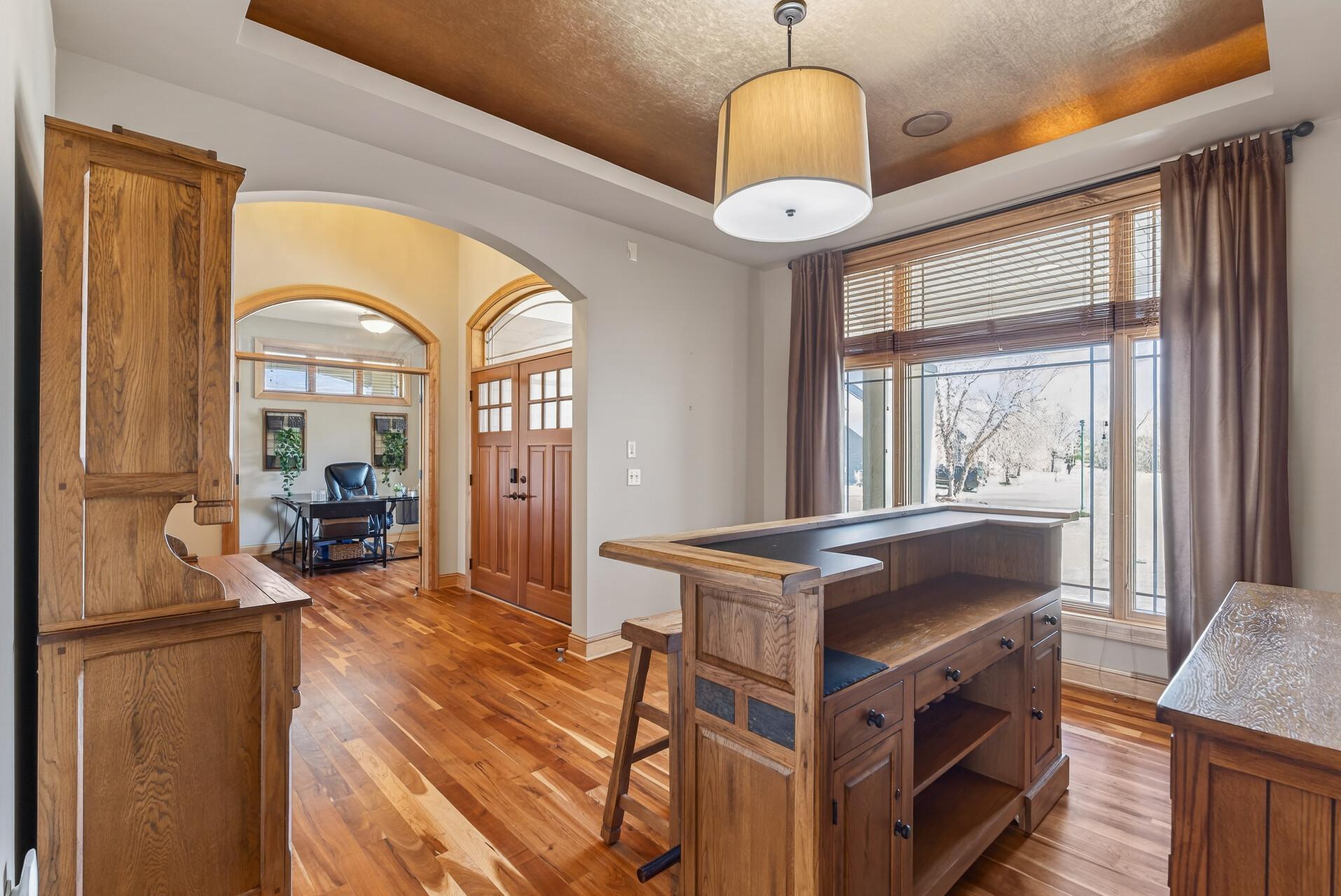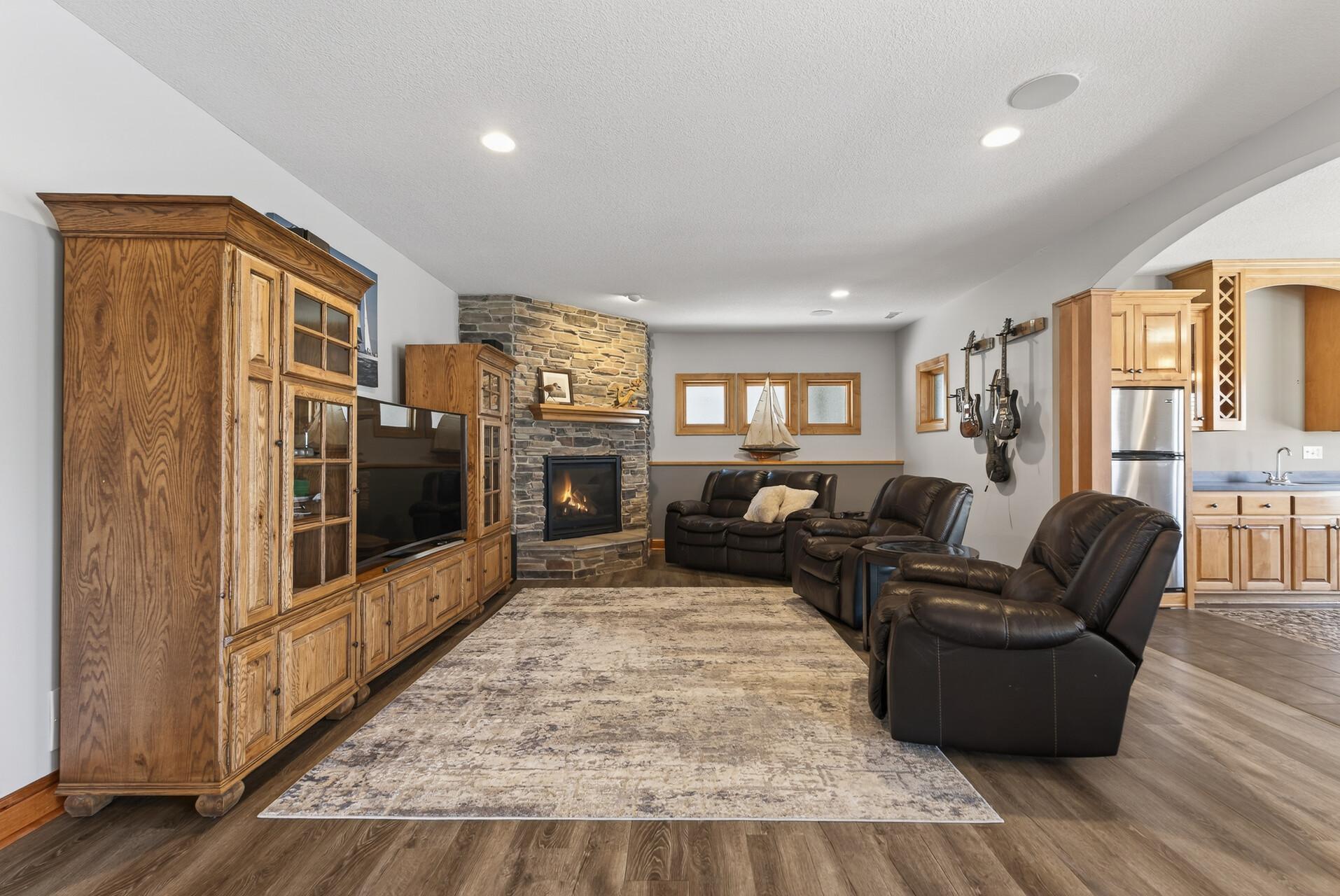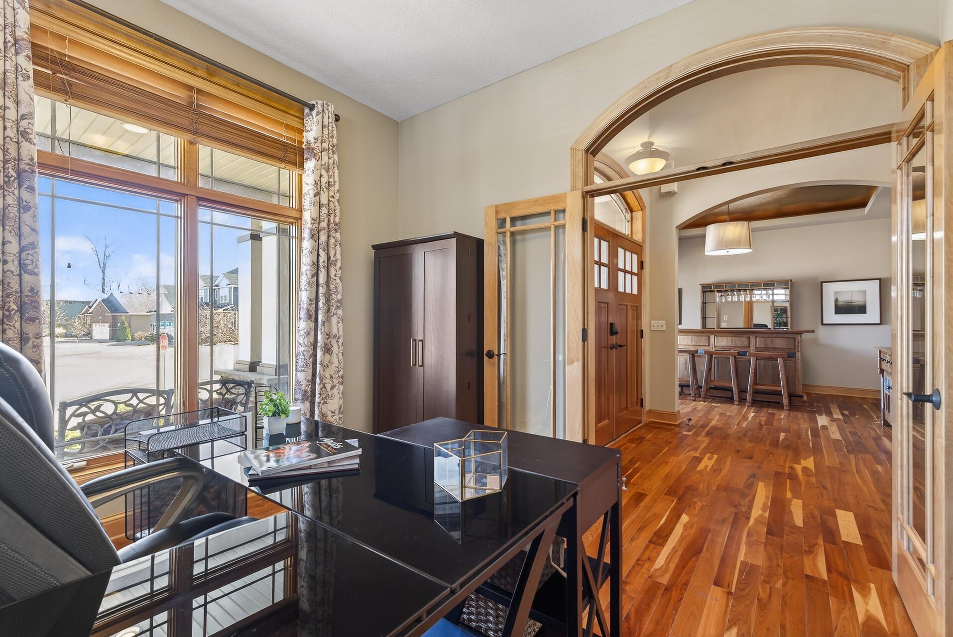 Welcome to this exceptional custom home in sought-after Dunlavin Woods, where craftsmanship, space, and thoughtful design come together beautifully. From the striking paver circular driveway and pillared front porch to the wooded backyard and wetland views, the setting is just as impressive as the home itself. Inside, you’ll find cherrywood floors, vaulted ceilings, and a stunning 3-sided fireplace anchoring the main living spaces. The gourmet kitchen features granite countertops, stainless steel appliances, a center island, walk-in pantry, and mini bar—perfect for everyday living and entertaining alike. A vaulted four-season porch flows seamlessly to the screened porch, deck, and paver patio, creating incredible indoor-outdoor living. The main-level primary suite offers privacy and comfort with a spacious layout, heated bathroom floors, jetted tub, walk-in shower, and dual vanities. Upstairs includes three generously sized bedrooms, including a Jack-and-Jill bath and an additional private bath, plus a massive bonus room with its own fireplace. The fully finished walkout lower level is built for entertaining, complete with a full bar, second kitchen, large amusement space, additional bedroom, and flexible rooms ideal for a home gym, office, or hobby space. Additional highlights include heated floors, newer mechanicals, built-ins throughout, central vacuum, whole-home sound system, main-level laundry with mudroom, and a heated garage with floor drain, lift system, and access to both the main and lower levels. Enjoy a low-maintenance yard, abundant wildlife, and a neighborhood known for its strong sense of community. This is a rare opportunity to own a truly well-appointed home with space, function, and character at every turn.