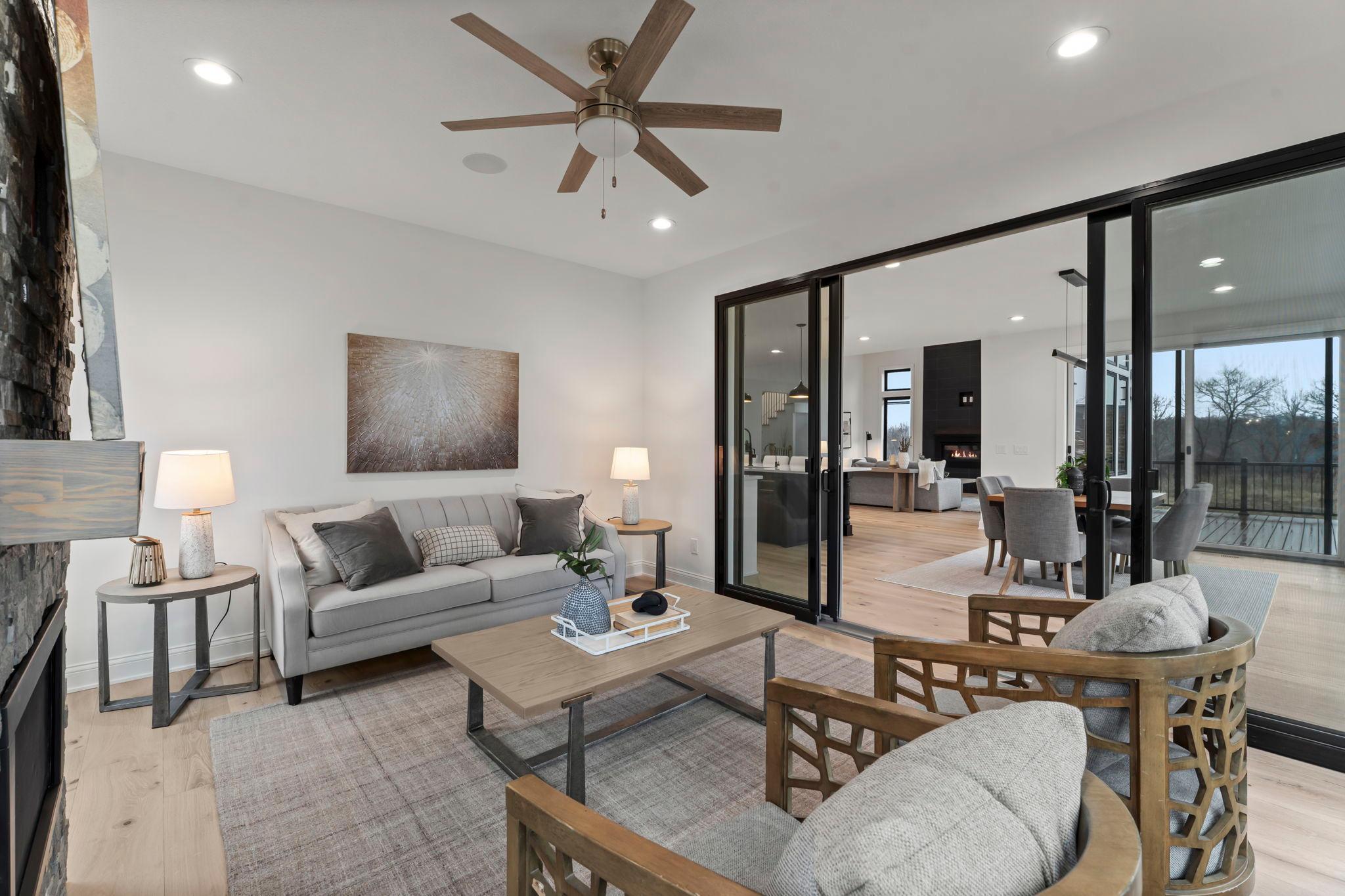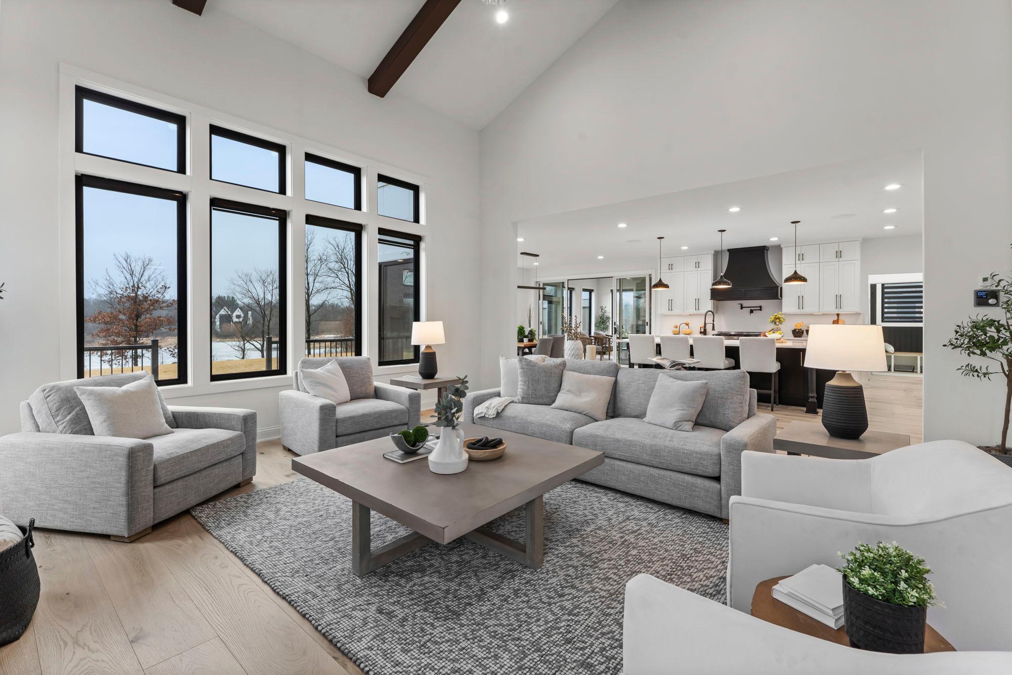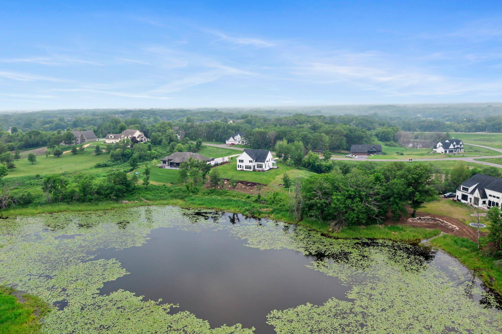 Exceptional custom-built home on 3.47 acres in Lakeville, offering luxurious design and everyday comfort in a serene acreage neighborhood. The main level features a dramatic great room with 18-ft vaulted ceilings, wood beams, oak hardwood floors, and a floor-to-ceiling tiled fireplace. A chef’s dream kitchen boasts quartz countertops, a professional gas range, custom panel appliances, an oversized island, and a walk-in pantry with a full fridge and prep space. Enjoy panoramic pond views from the dining room, or relax year-round in the cozy 4-season porch with a gas fireplace. Upstairs, the spacious primary suite includes 11-ft vaulted ceilings, a spa-like en-suite with dual vanities, private commode, expansive walk-in closet with custom built-ins, and direct access to the laundry room with a dog wash station. Three other additional bedrooms on this floor offer walk-in closets and ensuite or Jack-and-Jill bathrooms. The finished lower level is designed to entertain with 9-ft ceilings, a large family room, wet bar with quartz counters, wine fridge, and built-in speakers. A sixth bedroom and ¾ bath complete the space. The fully finished, heated 3-car garage includes 11-ft ceilings, epoxy floors, and EV charger rough-in. Smart features include Sonos audio, Ring doorbell, Swann security system, smart mirrors, and full water filtration. Professionally landscaped with irrigation, Hardie siding, and steel roofing over the porch and garage. All just minutes from I-35W—luxury country living at its finest!