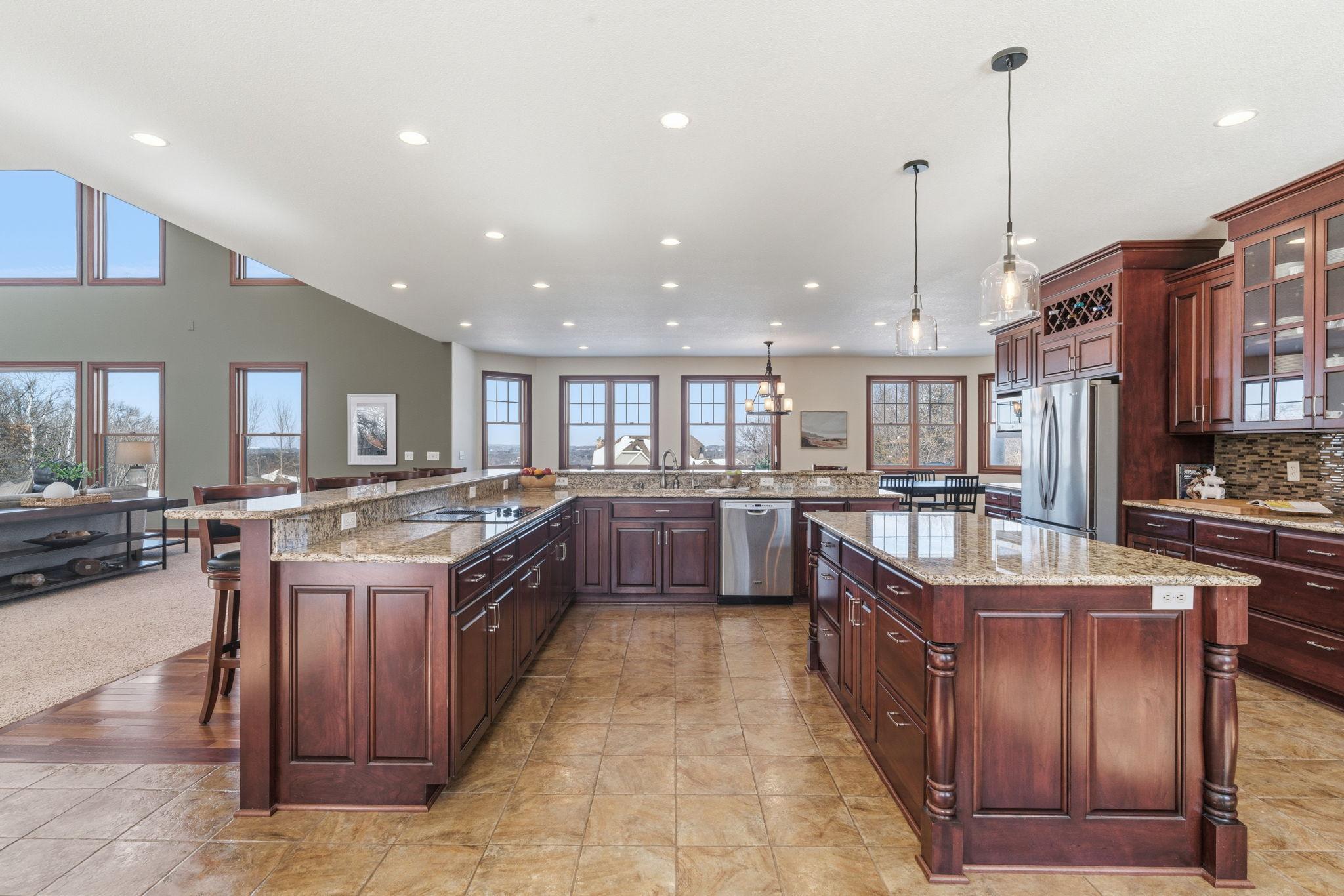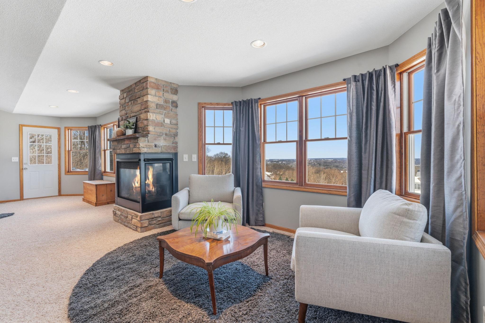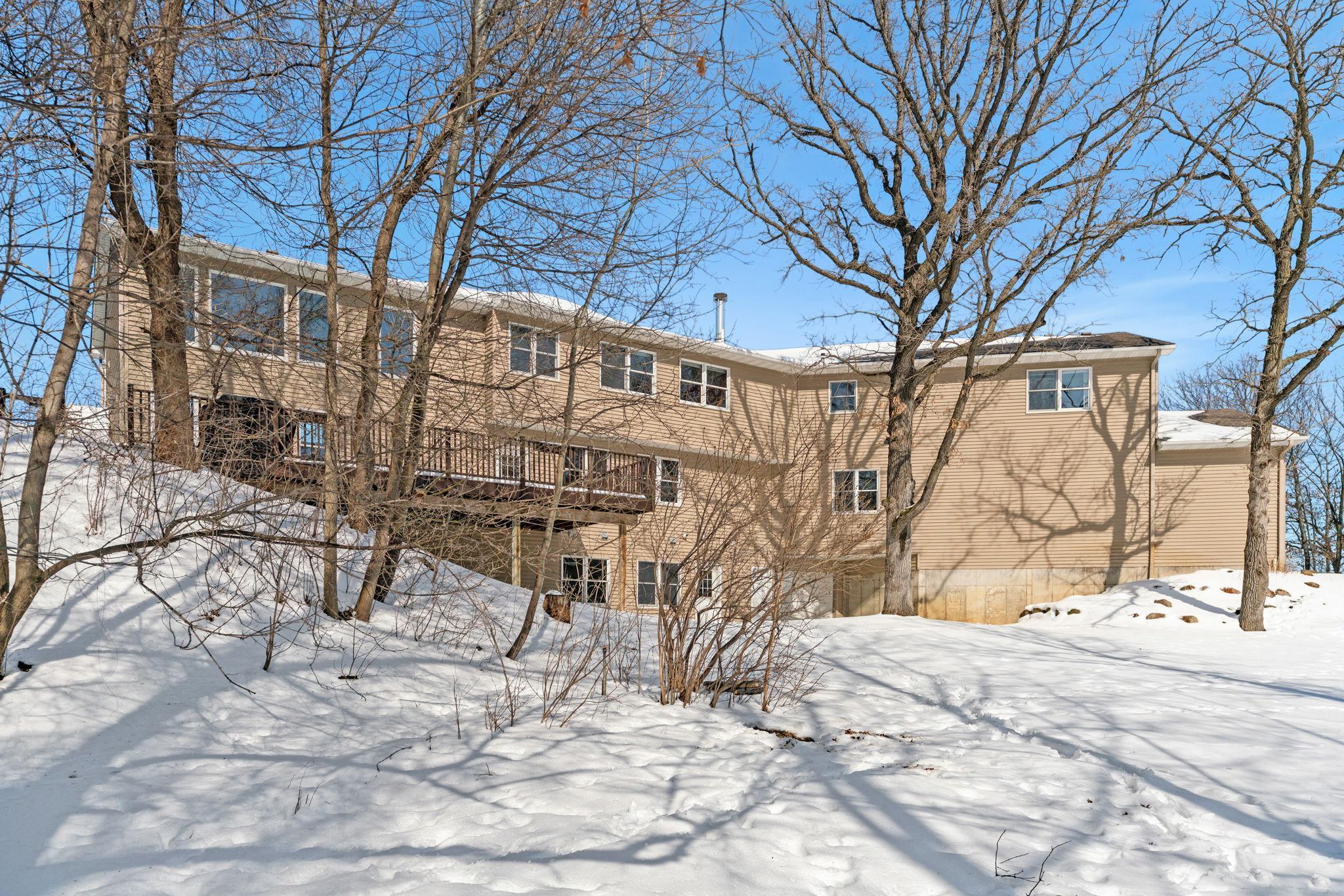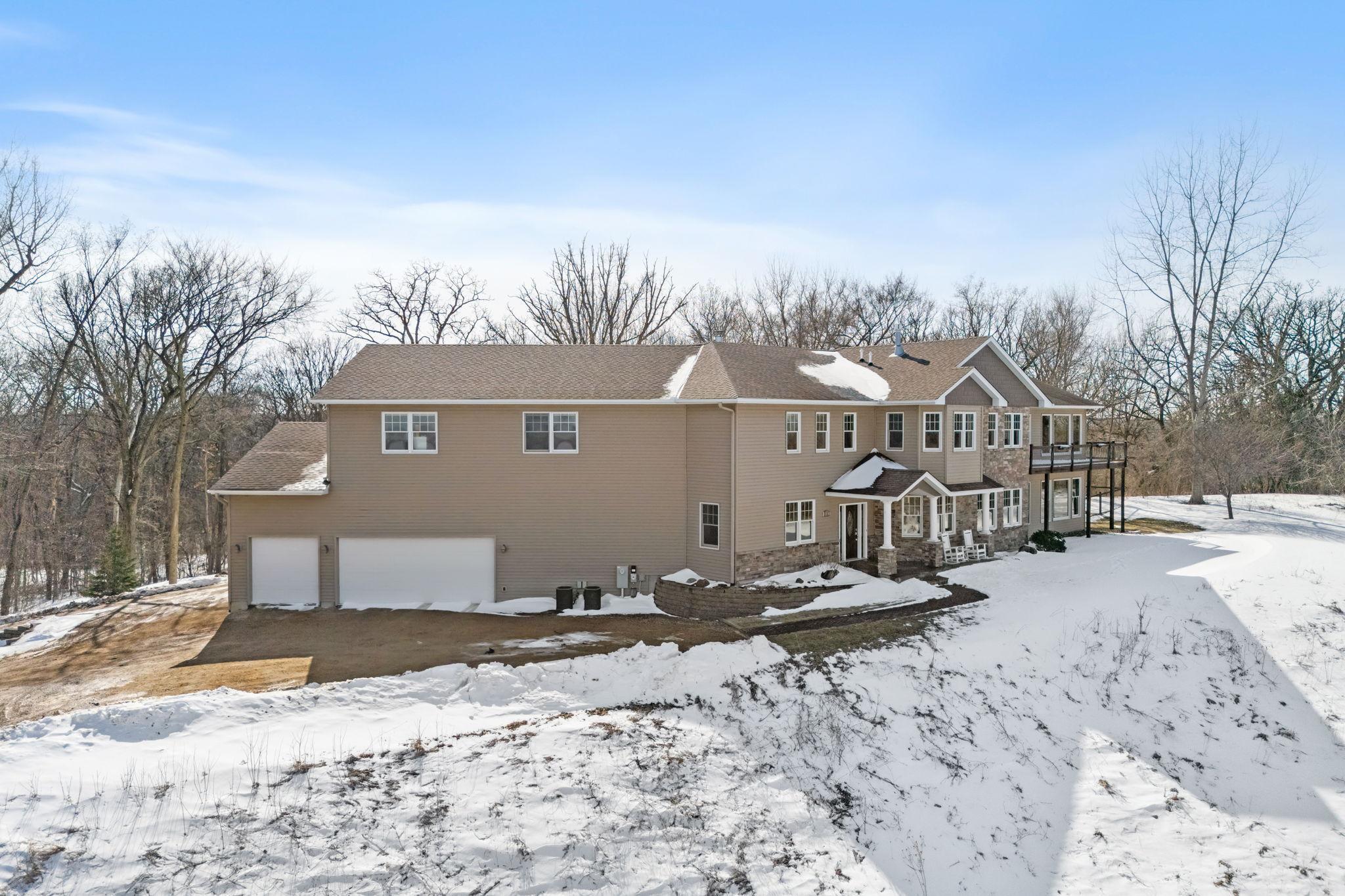 Escape to your private 2.5 acre retreat perched on top of an old ski hill with breathtaking panoramic views ! Step inside to a foyer that opens to the main level Great Room that is the " Show Stopper" Expansive 2 story windows, floor to ceiling stone fireplace, and a staircase leading to the upper level loft create a gathering space with a grandeur vibe. The kitchen showcasing rich cherry cabinets, walk in pantry, stainless steel appliances, double oven, and two kitchen islands creates a warm ambiance for cooking and entertaining alike. The main level also includes a separate living room, office and mudroom with ample closet storage. The spacious upper level primary suite offers a vaulted ceiling, cozy gas fireplace and a sitting area to relax and unwind. The primary bathroom features a space tub and walk in tiled shower with double sinks and vanity. From the primary suite, you can walk out to the wrap around deck to soak in the stunning view. The upper level includes 4 other bedrooms, 2 full bathrooms and a loft. The walk out lower level extends the living space with an additional 6th bedroom, 3/4th bath with a tiled walk in shower, recreation room with a fireplace, wet bar and ample storage. The lower level garage/workshop is accessible from this area and has endless opportunities for a new buyer with a garage door access to the backyard. Watch and enjoy the nature and wildlife in your private backyard space. Enjoy the summer months hosting a pool party in the heated pool. This is a one of a kind home that comes with excellent District 196 schools. Don't miss this opportunity to own this special property.