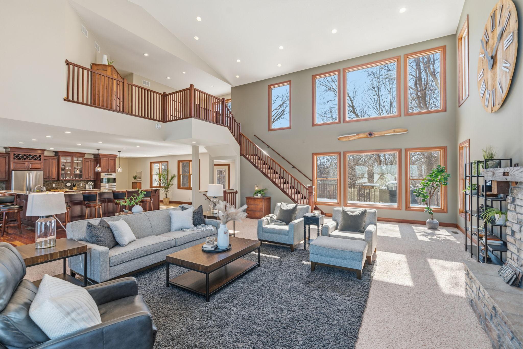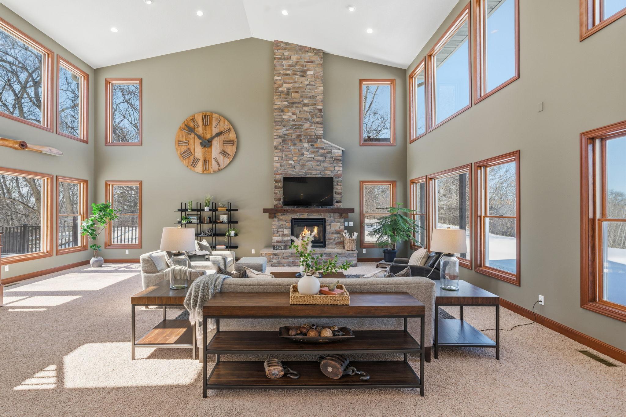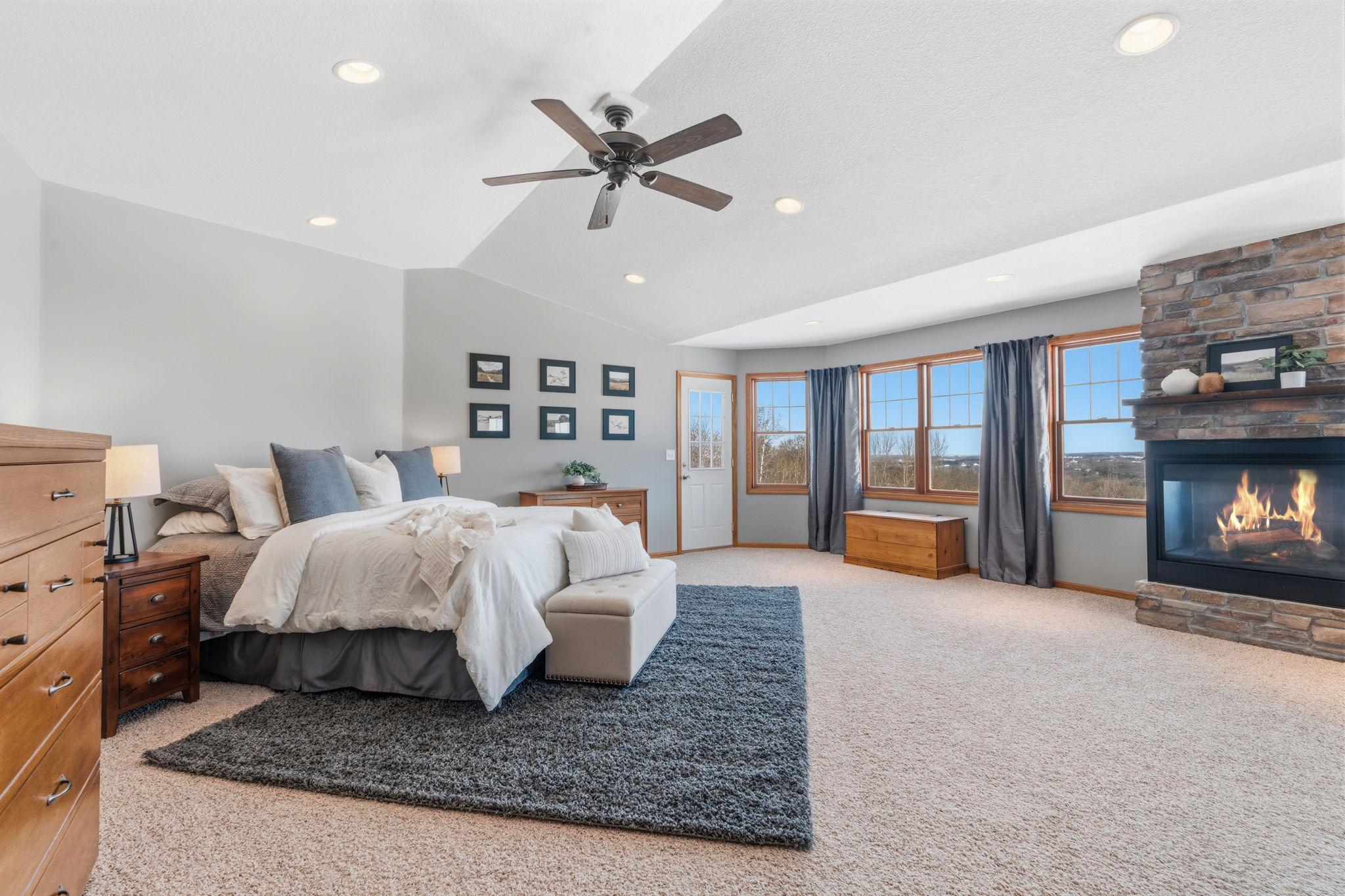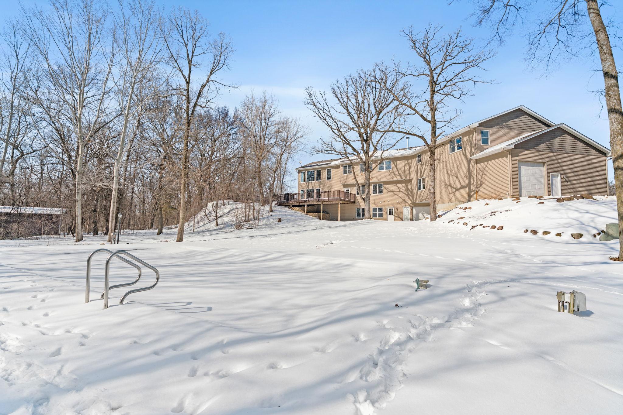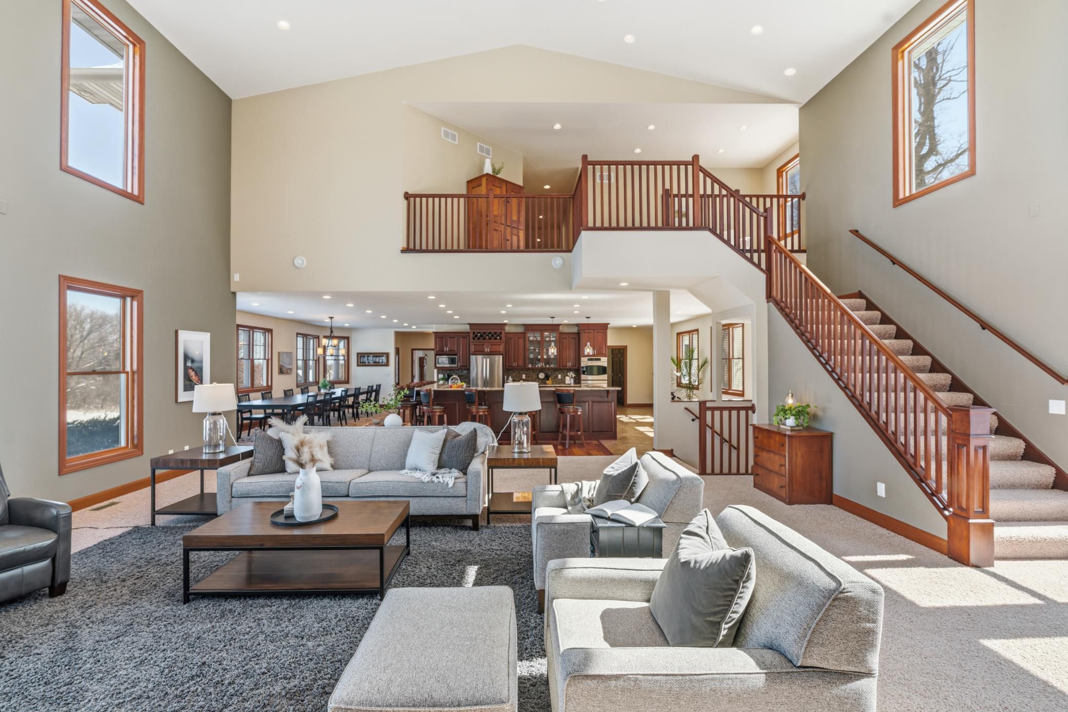 Escape to your private 2.5 acre retreat perched on top of an old ski hill with breathtaking panoramic views ! Step inside to a foyer that opens to the main level Great Room that is the " Show Stopper" Expansive 2 story windows, floor to ceiling stone fireplace, and a staircase leading to the upper level loft create a gathering space with a grandeur vibe. The kitchen showcasing rich cherry cabinets, walk in pantry, stainless steel appliances, double oven, and two kitchen islands creates a warm ambiance for cooking and entertaining alike. The main level also includes a separate living room, office and mudroom with ample closet storage. The spacious upper level primary suite offers a vaulted ceiling, cozy gas fireplace and a sitting area to relax and unwind. The primary bathroom features a space tub and walk in tiled shower with double sinks and vanity. From the primary suite, you can walk out to the wrap around deck to soak in the stunning view. The upper level includes 4 other bedrooms, 2 full bathrooms and a loft. The walk out lower level extends the living space with an additional 6th bedroom, 3/4th bath with a tiled walk in shower, recreation room with a fireplace, wet bar and ample storage. The lower level garage/workshop is accessible from this area and has endless opportunities for a new buyer with a garage door access to the backyard. Watch and enjoy the nature and wildlife in your private backyard space. Enjoy the summer months hosting a pool party in the heated pool. This is a one of a kind home that comes with excellent District 196 schools. Don't miss this opportunity to own this special property.