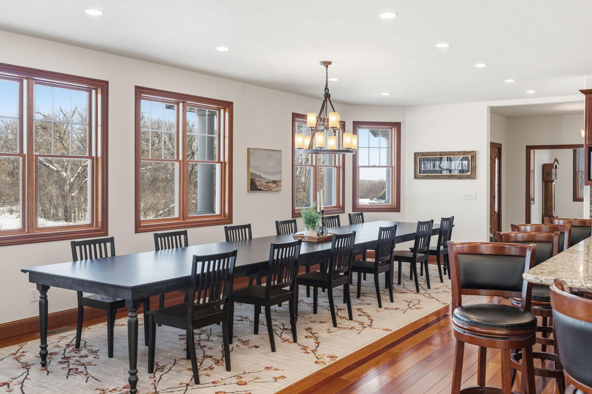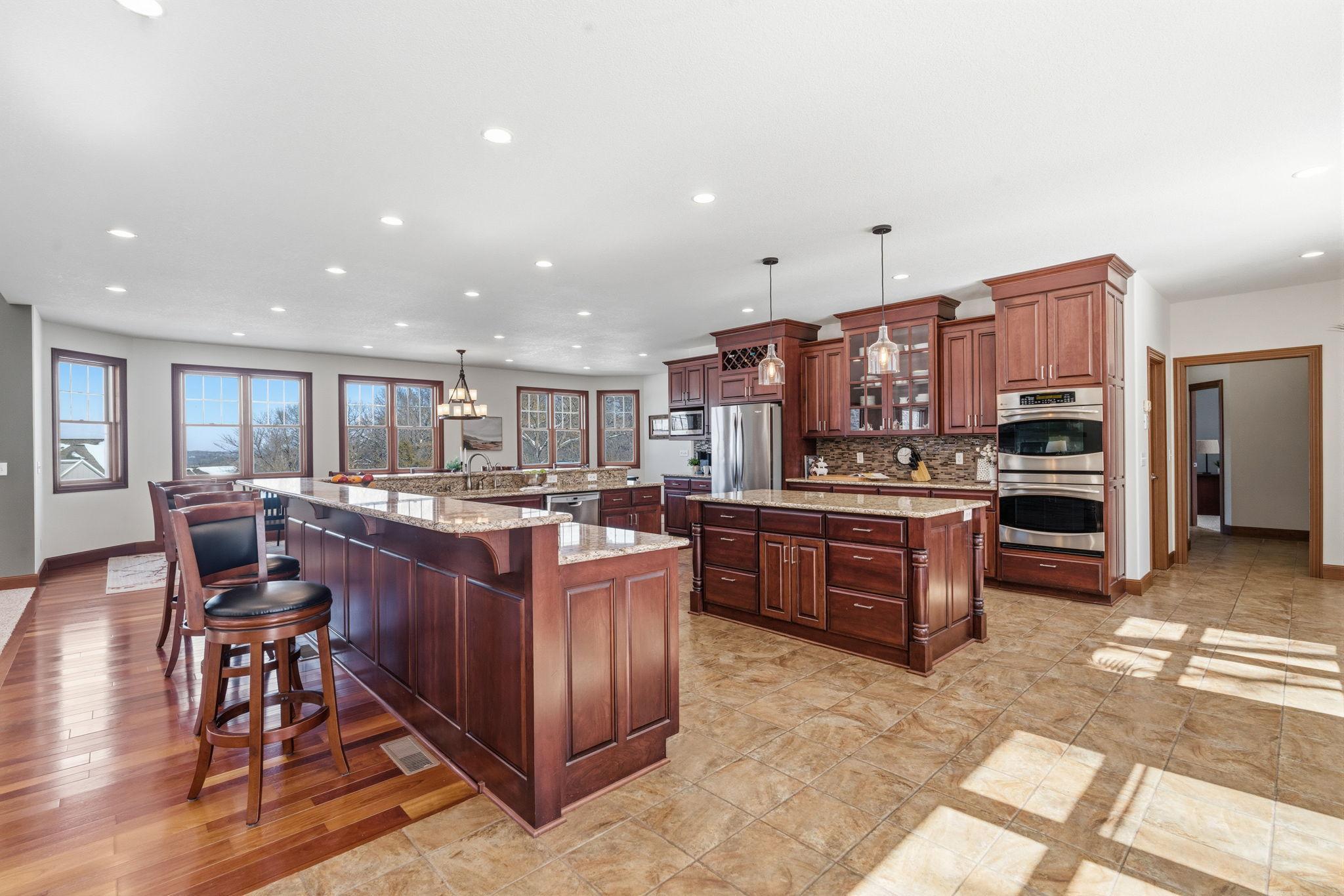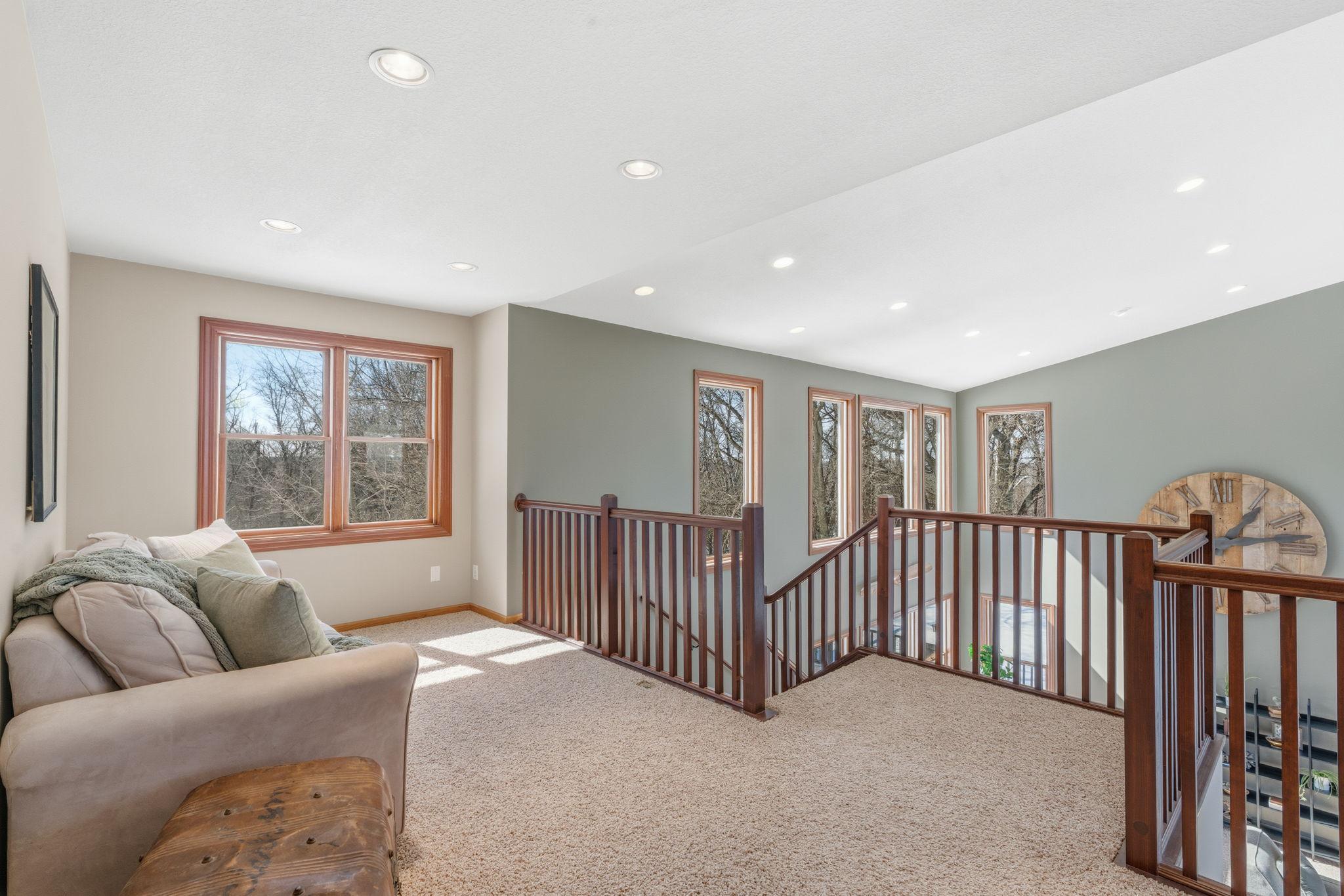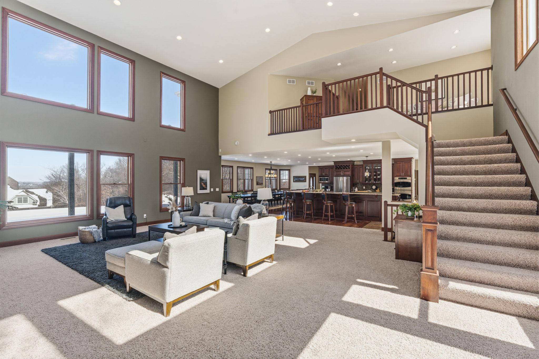 Escape to your private 2.5 acre retreat perched on top of an old ski hill with breathtaking panoramic views ! Step inside to a foyer that opens to the main level Great Room that is the " Show Stopper" Expansive 2 story windows, floor to ceiling stone fireplace, and a staircase leading to the upper level loft create a gathering space with a grandeur vibe. The kitchen showcasing rich cherry cabinets, walk in pantry, stainless steel appliances, double oven, and two kitchen islands creates a warm ambiance for cooking and entertaining alike. The main level also includes a separate living room, office and mudroom with ample closet storage. The spacious upper level primary suite offers a vaulted ceiling, cozy gas fireplace and a sitting area to relax and unwind. The primary bathroom features a space tub and walk in tiled shower with double sinks and vanity. From the primary suite, you can walk out to the wrap around deck to soak in the stunning view. The upper level includes 4 other bedrooms, 2 full bathrooms and a loft. The walk out lower level extends the living space with an additional 6th bedroom, 3/4th bath with a tiled walk in shower, recreation room with a fireplace, wet bar and ample storage. The lower level garage/workshop is accessible from this area and has endless opportunities for a new buyer with a garage door access to the backyard. Watch and enjoy the nature and wildlife in your private backyard space. Enjoy the summer months hosting a pool party in the heated pool. This is a one of a kind home that comes with excellent District 196 schools. Don't miss this opportunity to own this special property.
