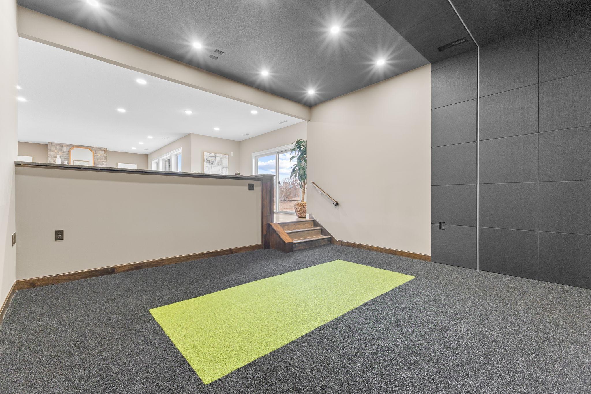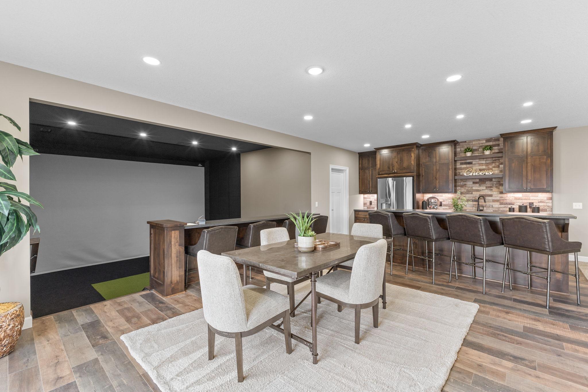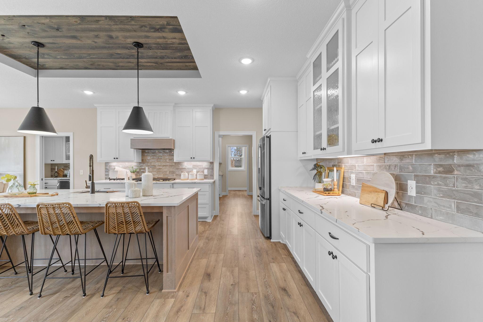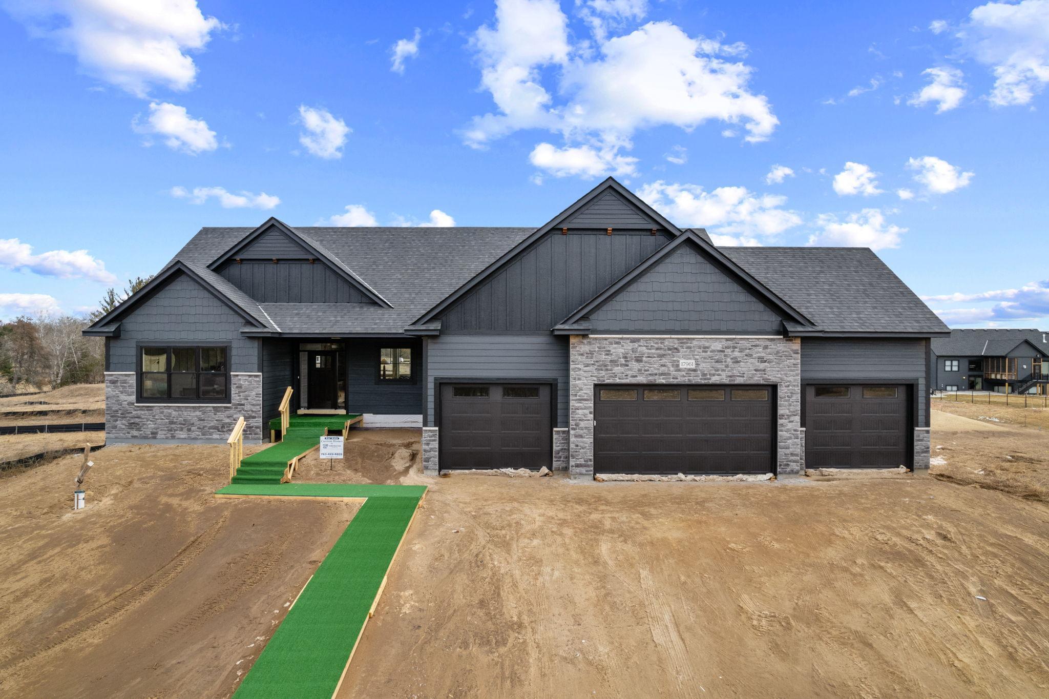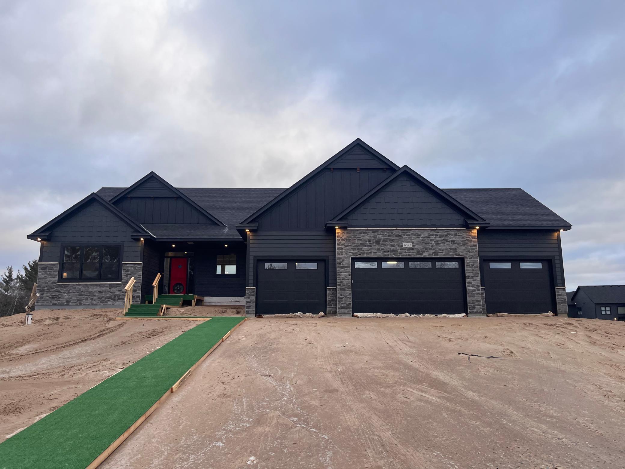 Situated on over an acre in Ham Lake, this stunning walkout rambler offers 4 bedrooms, 3 bathrooms, and exceptional craftsmanship throughout, built by TH Construction. The exterior commands attention with LP siding on the front with custom black accents and striking black Anderson windows. Take a step inside to be welcomed by an open concept living room with double box vaulted ceilings, lineal gas fireplace featuring tile to the ceiling with built-in cabinets on both sides. Massive windows flood the main level with natural light, leading you to a chef’s kitchen equipped with a white oak island, quartz countertops, a walk-in butler pantry, and custom cabinetry stretching to the ceiling. The main floor is designed for convenience and luxury, featuring a dining room with an oversized patio door, a home office/den, 2nd bedroom, full tile bath, an efficient laundry room, and a mudroom connecting to the expansive 46x28 4-stall garage. The primary suite is a true retreat, boasting box-vaulted ceilings, walk-in closet and a spa-like private bath with white oak cabinetry, a walk-in tile shower, and a free standing tub. Take a walk downstairs to find an entertainer`s dream, featuring a large open concept family room, including an additional gas fireplace with stone surround, a 14-foot wet bar, with two-tier island, and a thoughtfully designed bar top overlooking a dedicated golf simulator room—. Featuring custom built padding surround to perfectly fit the room. Two additional large bedrooms and a full tile bathroom round out the lower level. Zoned Heat for each level! Designed by a fully custom builder/architect with over 35 years of experience, this home makes your dream a reality. This Rambler has it all, check it out today!!
