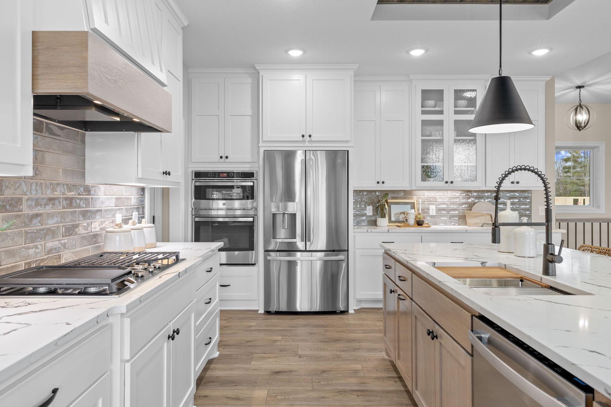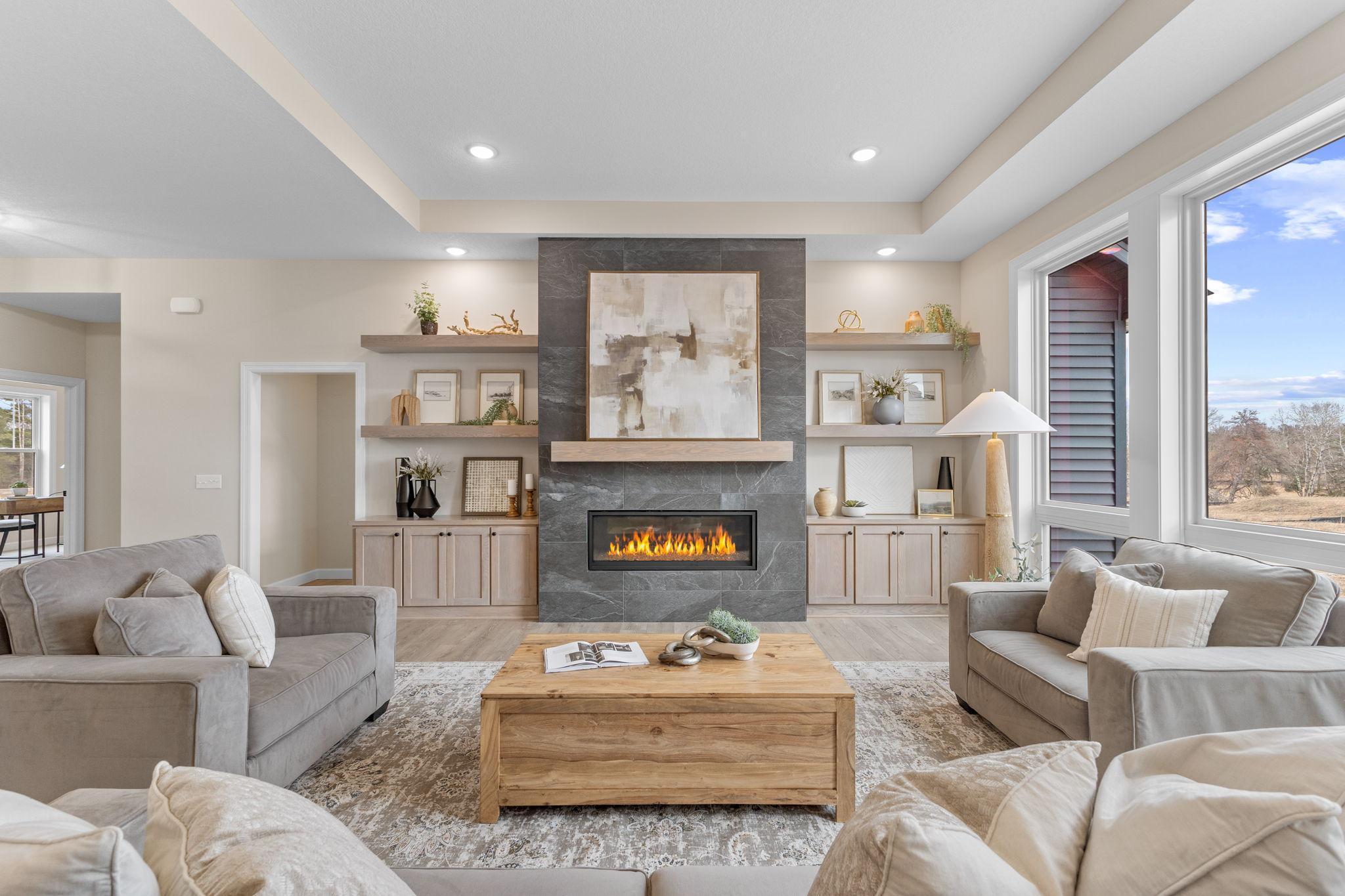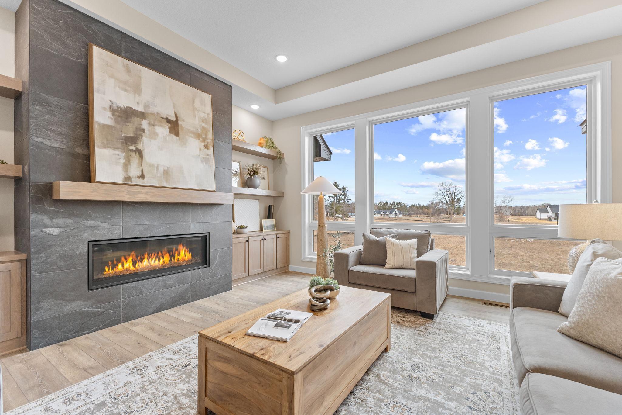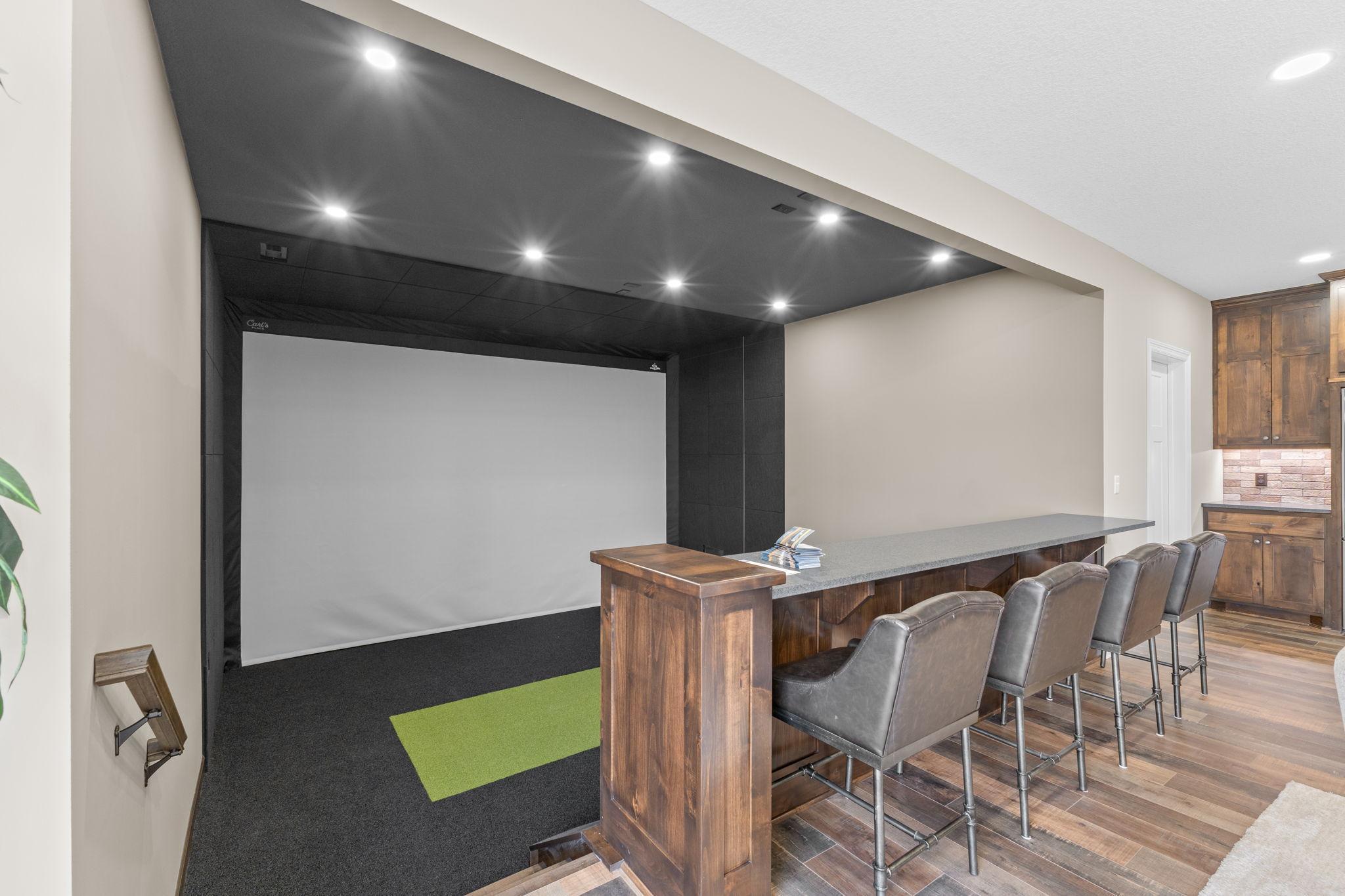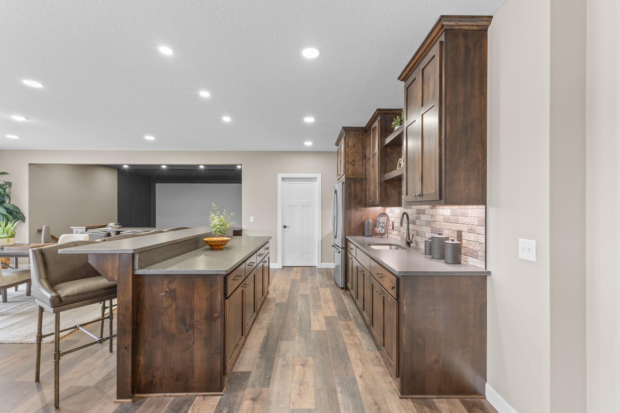 Situated on over an acre in Ham Lake, this stunning walkout rambler offers 4 bedrooms, 3 bathrooms, and exceptional craftsmanship throughout, built by TH Construction. The exterior commands attention with LP siding on the front with custom black accents and striking black Anderson windows. Take a step inside to be welcomed by an open concept living room with double box vaulted ceilings, lineal gas fireplace featuring tile to the ceiling with built-in cabinets on both sides. Massive windows flood the main level with natural light, leading you to a chef’s kitchen equipped with a white oak island, quartz countertops, a walk-in butler pantry, and custom cabinetry stretching to the ceiling. The main floor is designed for convenience and luxury, featuring a dining room with an oversized patio door, a home office/den, 2nd bedroom, full tile bath, an efficient laundry room, and a mudroom connecting to the expansive 46x28 4-stall garage. The primary suite is a true retreat, boasting box-vaulted ceilings, walk-in closet and a spa-like private bath with white oak cabinetry, a walk-in tile shower, and a free standing tub. Take a walk downstairs to find an entertainer`s dream, featuring a large open concept family room, including an additional gas fireplace with stone surround, a 14-foot wet bar, with two-tier island, and a thoughtfully designed bar top overlooking a dedicated golf simulator room—. Featuring custom built padding surround to perfectly fit the room. Two additional large bedrooms and a full tile bathroom round out the lower level. Zoned Heat for each level! Designed by a fully custom builder/architect with over 35 years of experience, this home makes your dream a reality. This Rambler has it all, check it out today!!