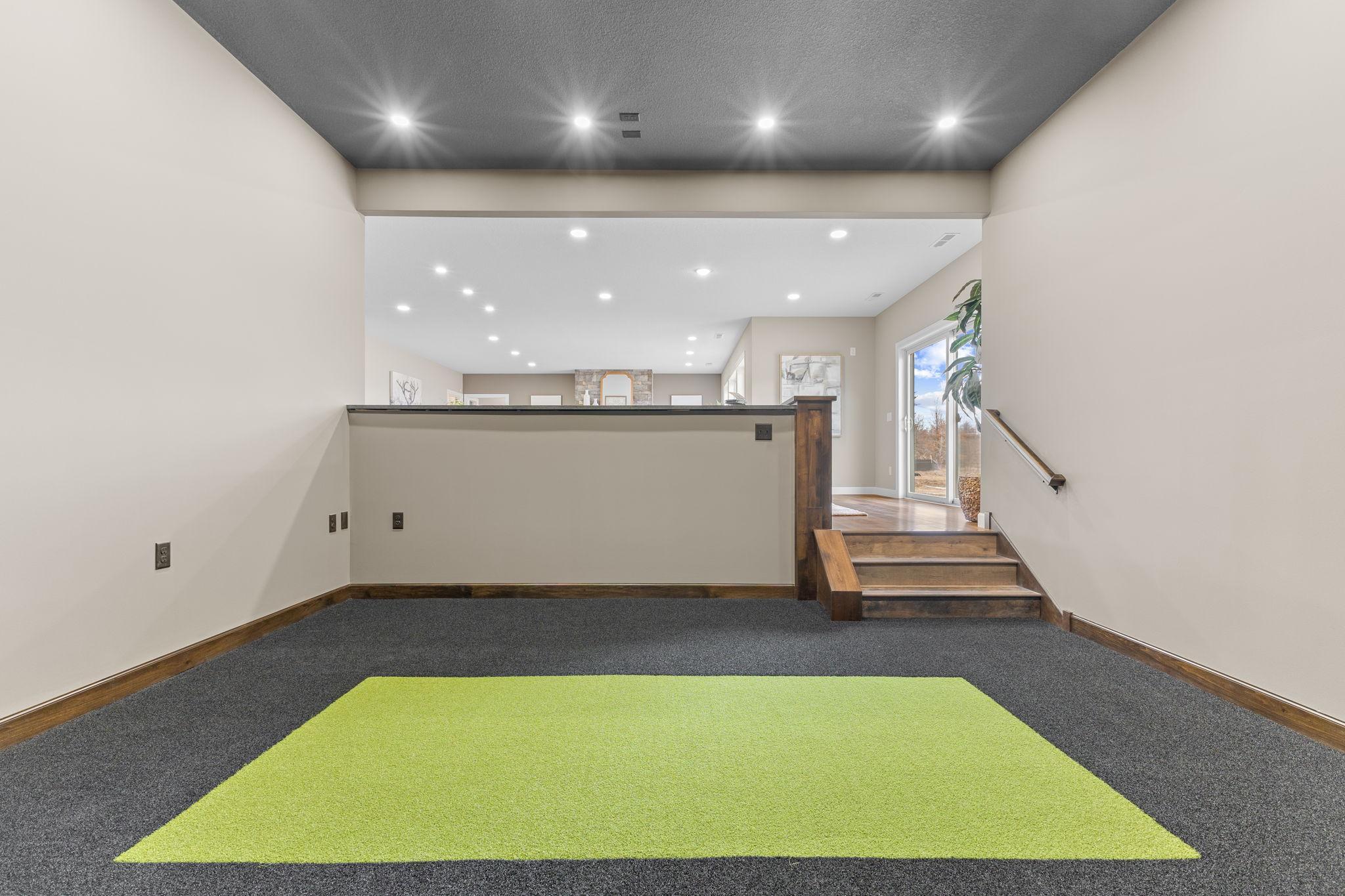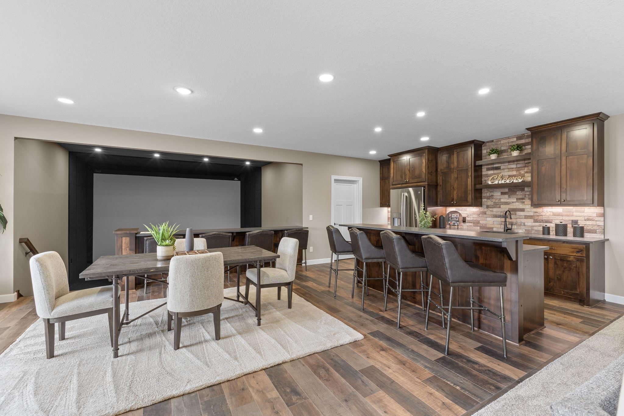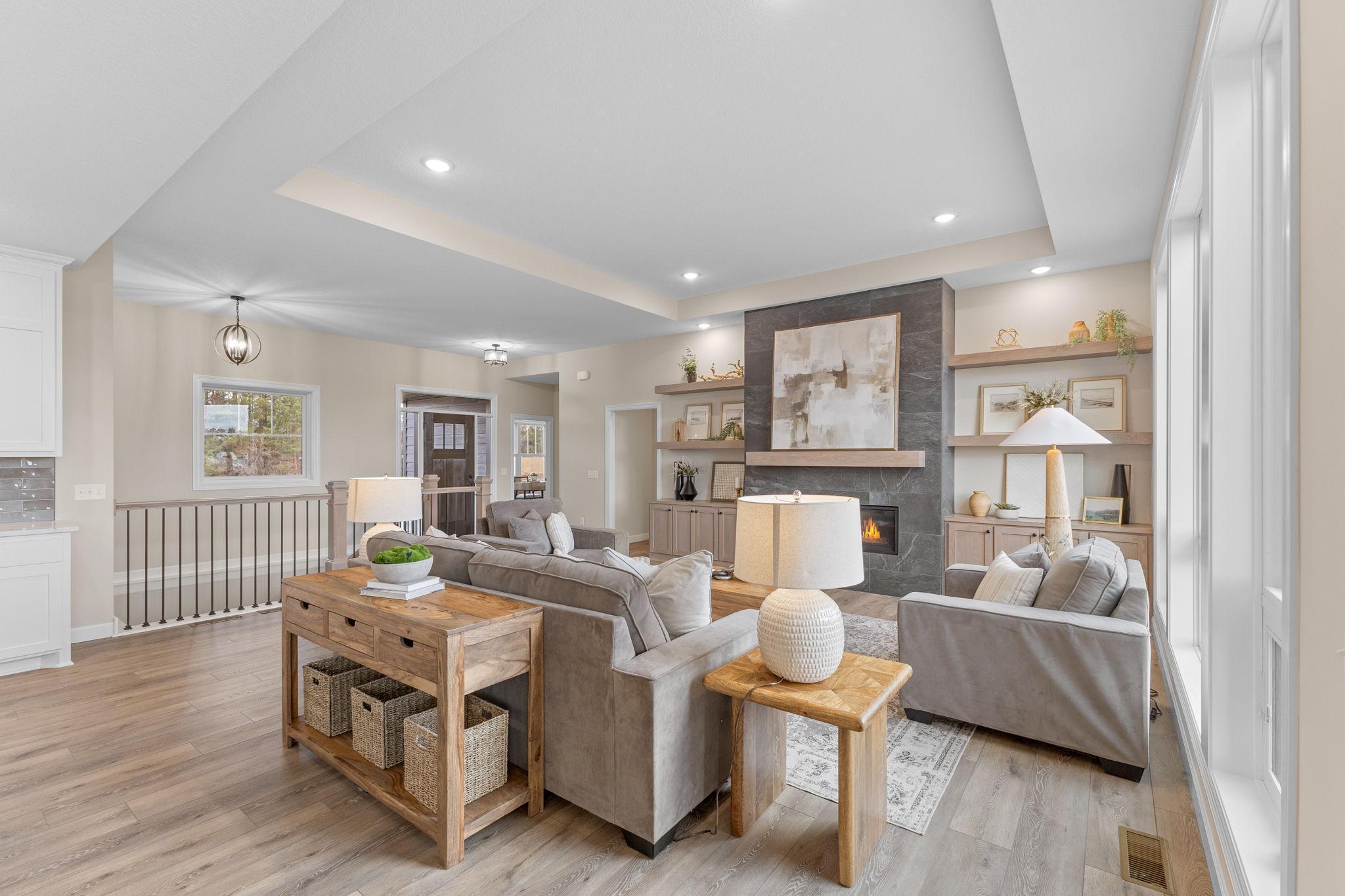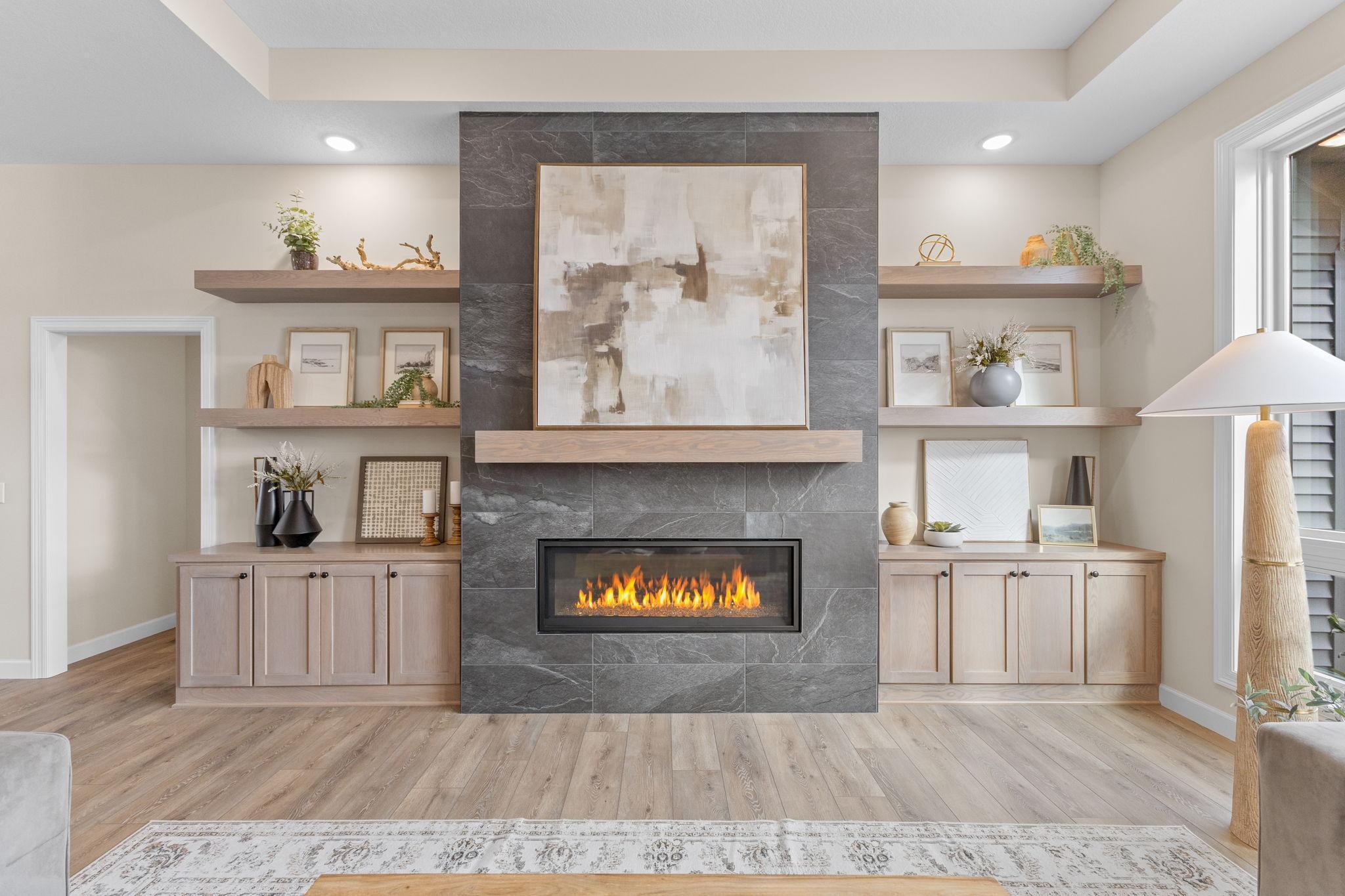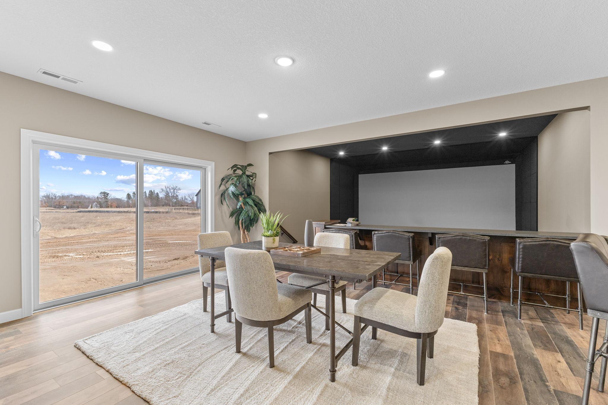 Situated on over an acre in Ham Lake, this stunning walkout rambler offers 4 bedrooms, 3 bathrooms, and exceptional craftsmanship throughout, built by TH Construction. The exterior commands attention with LP siding on the front with custom black accents and striking black Anderson windows. Take a step inside to be welcomed by an open concept living room with double box vaulted ceilings, lineal gas fireplace featuring tile to the ceiling with built-in cabinets on both sides. Massive windows flood the main level with natural light, leading you to a chef’s kitchen equipped with a white oak island, quartz countertops, a walk-in butler pantry, and custom cabinetry stretching to the ceiling. The main floor is designed for convenience and luxury, featuring a dining room with an oversized patio door, a home office/den, 2nd bedroom, full tile bath, an efficient laundry room, and a mudroom connecting to the expansive 46x28 4-stall garage. The primary suite is a true retreat, boasting box-vaulted ceilings, walk-in closet and a spa-like private bath with white oak cabinetry, a walk-in tile shower, and a free standing tub. Take a walk downstairs to find an entertainer`s dream, featuring a large open concept family room, including an additional gas fireplace with stone surround, a 14-foot wet bar, with two-tier island, and a thoughtfully designed bar top overlooking a dedicated golf simulator room—. Featuring custom built padding surround to perfectly fit the room. Two additional large bedrooms and a full tile bathroom round out the lower level. Zoned Heat for each level! Designed by a fully custom builder/architect with over 35 years of experience, this home makes your dream a reality. This Rambler has it all, check it out today!!