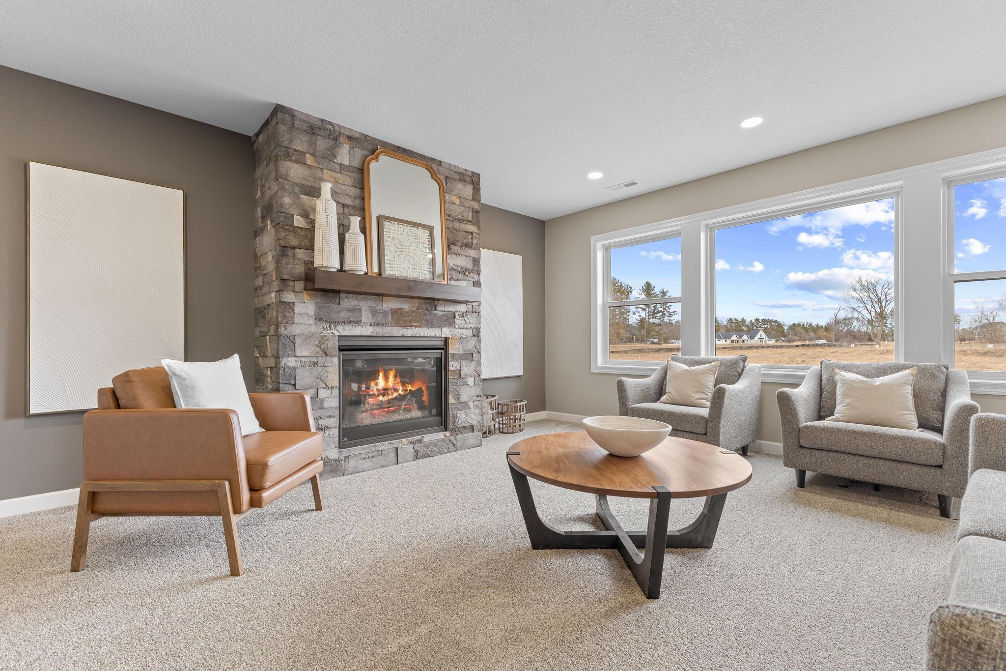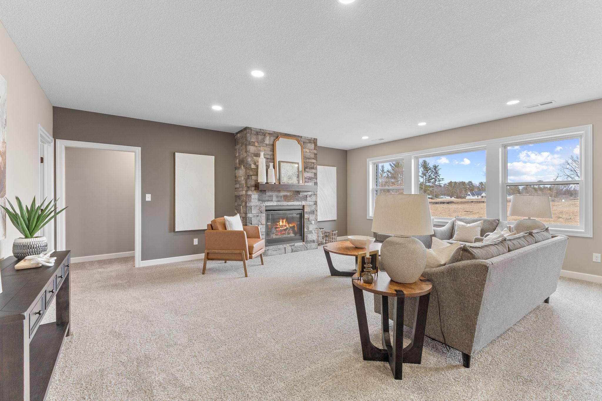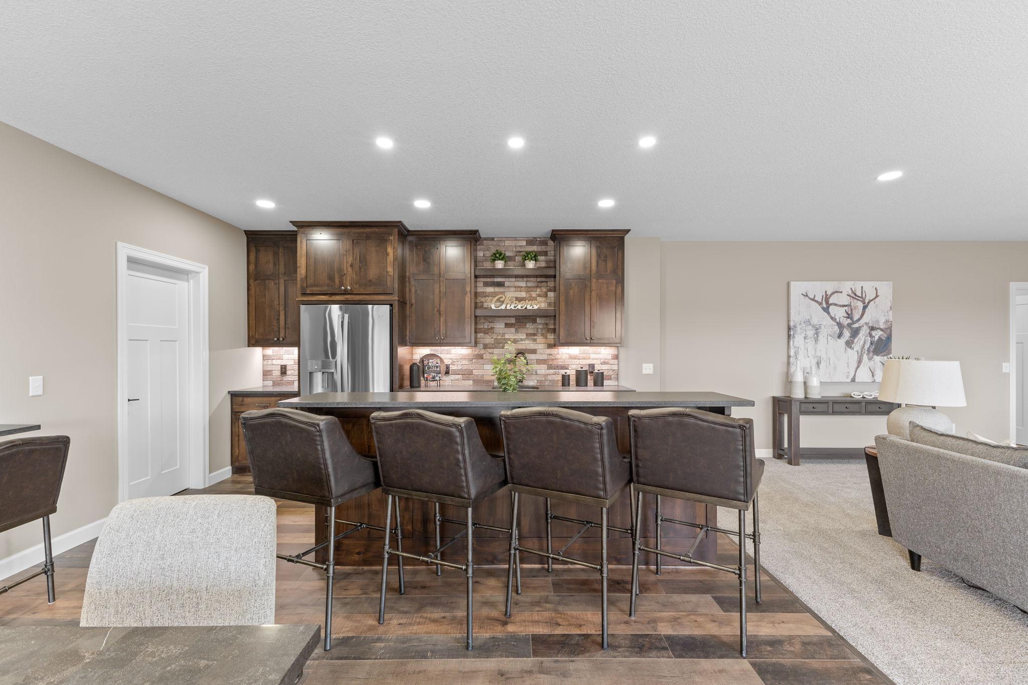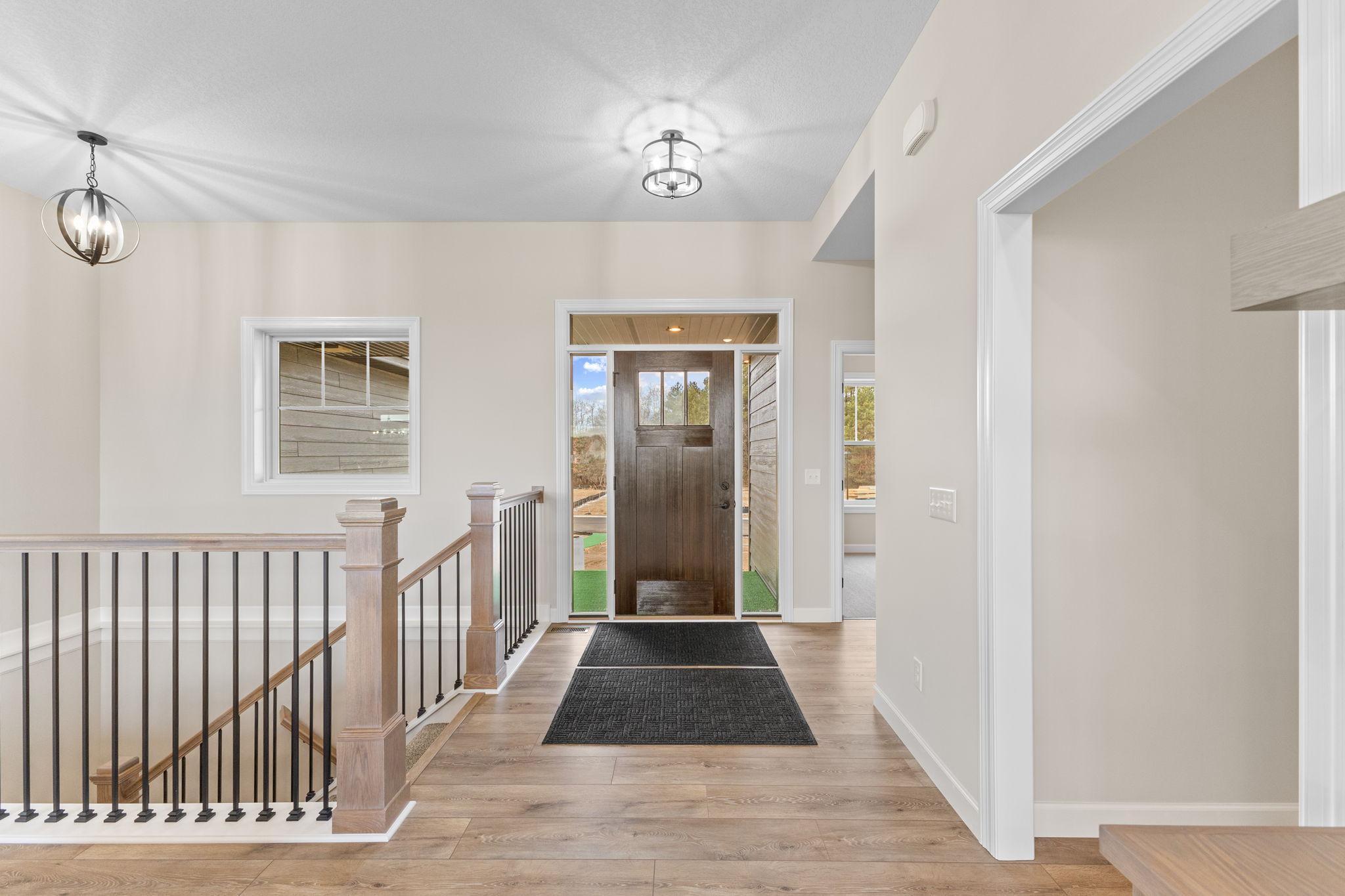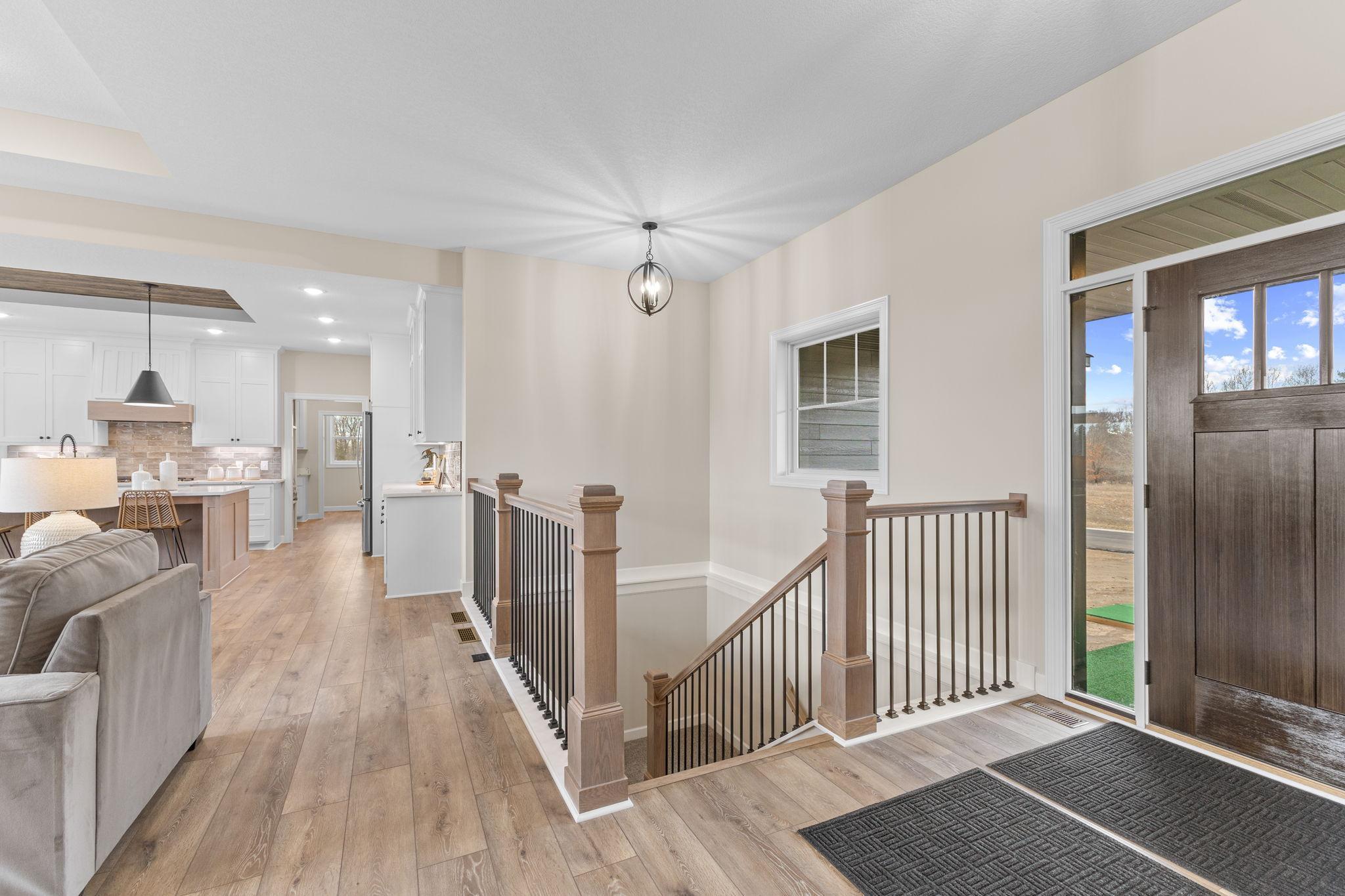 Situated on over an acre in Ham Lake, this stunning walkout rambler offers 4 bedrooms, 3 bathrooms, and exceptional craftsmanship throughout, built by TH Construction. The exterior commands attention with LP siding on the front with custom black accents and striking black Anderson windows. Take a step inside to be welcomed by an open concept living room with double box vaulted ceilings, lineal gas fireplace featuring tile to the ceiling with built-in cabinets on both sides. Massive windows flood the main level with natural light, leading you to a chef’s kitchen equipped with a white oak island, quartz countertops, a walk-in butler pantry, and custom cabinetry stretching to the ceiling. The main floor is designed for convenience and luxury, featuring a dining room with an oversized patio door, a home office/den, 2nd bedroom, full tile bath, an efficient laundry room, and a mudroom connecting to the expansive 46x28 4-stall garage. The primary suite is a true retreat, boasting box-vaulted ceilings, walk-in closet and a spa-like private bath with white oak cabinetry, a walk-in tile shower, and a free standing tub. Take a walk downstairs to find an entertainer`s dream, featuring a large open concept family room, including an additional gas fireplace with stone surround, a 14-foot wet bar, with two-tier island, and a thoughtfully designed bar top overlooking a dedicated golf simulator room—. Featuring custom built padding surround to perfectly fit the room. Two additional large bedrooms and a full tile bathroom round out the lower level. Zoned Heat for each level! Designed by a fully custom builder/architect with over 35 years of experience, this home makes your dream a reality. This Rambler has it all, check it out today!!