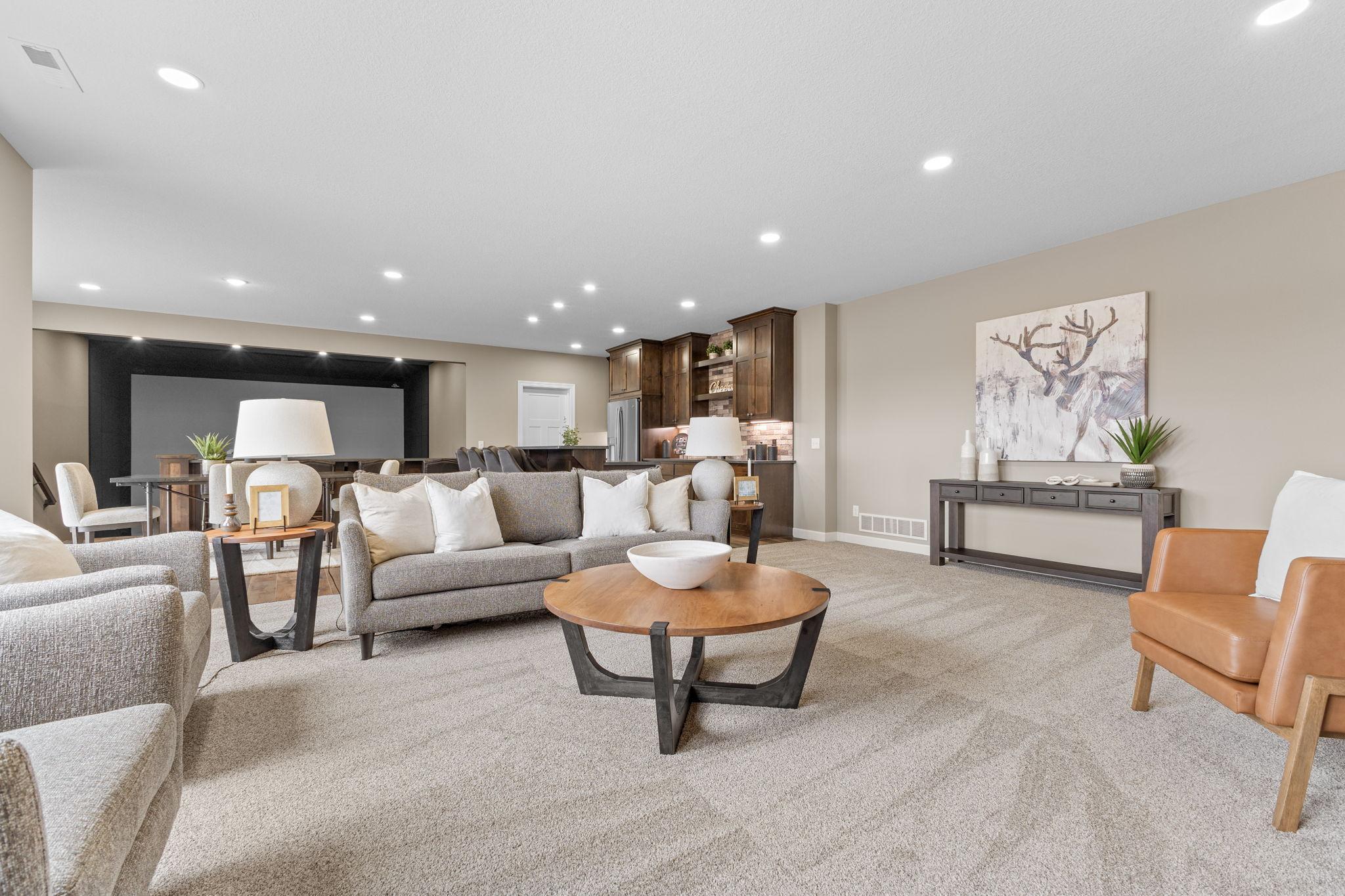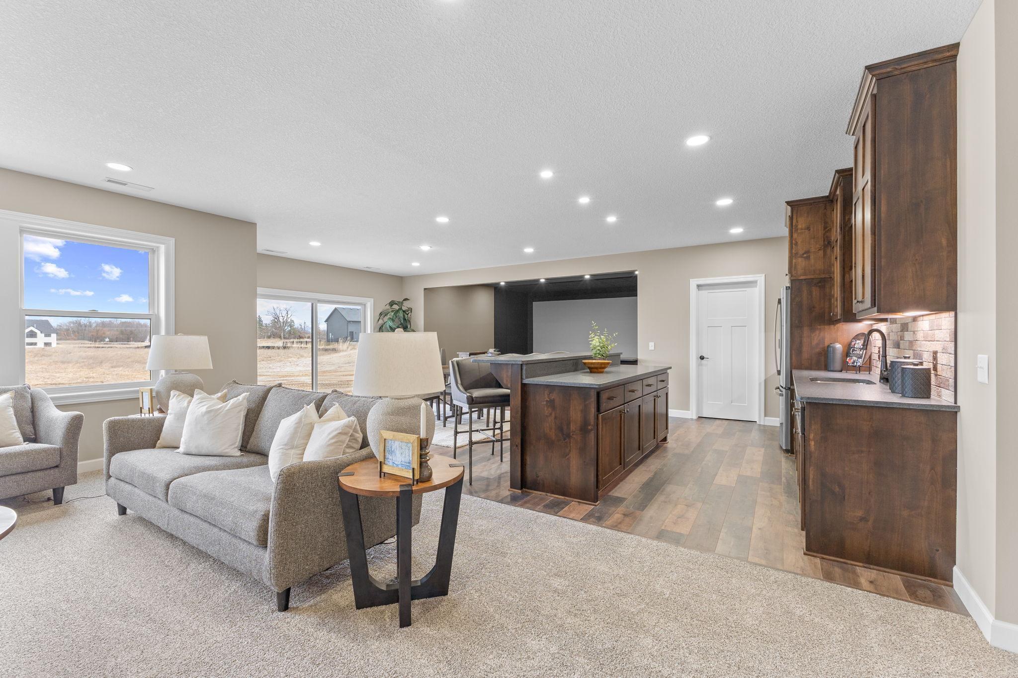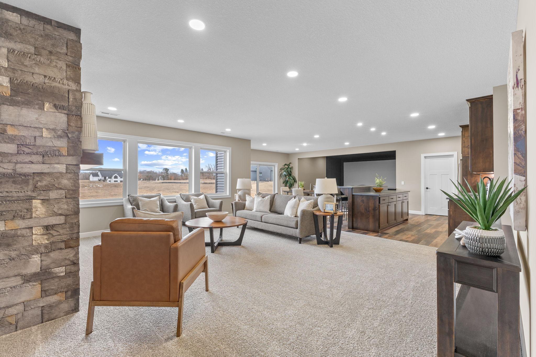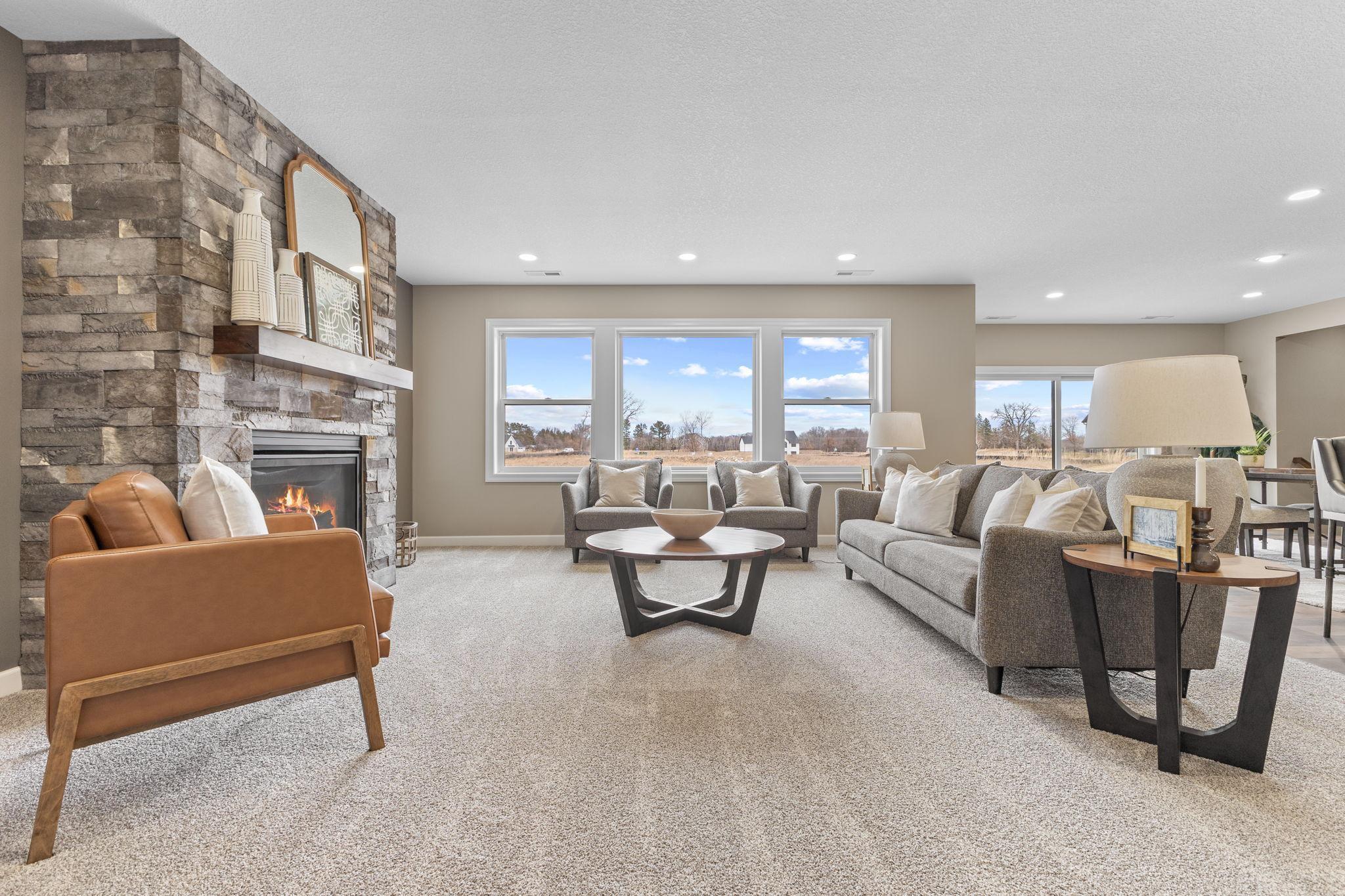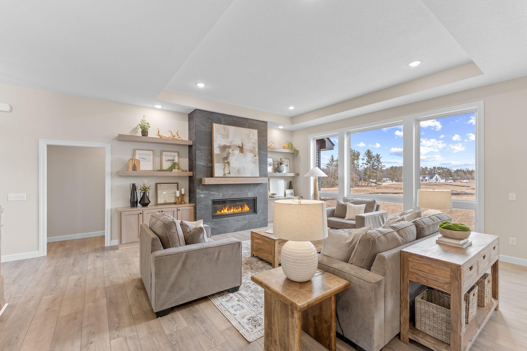 Situated on over an acre in Ham Lake, this stunning walkout rambler offers 4 bedrooms, 3 bathrooms, and exceptional craftsmanship throughout, built by TH Construction. The exterior commands attention with LP siding on the front with custom black accents and striking black Anderson windows. Take a step inside to be welcomed by an open concept living room with double box vaulted ceilings, lineal gas fireplace featuring tile to the ceiling with built-in cabinets on both sides. Massive windows flood the main level with natural light, leading you to a chef’s kitchen equipped with a white oak island, quartz countertops, a walk-in butler pantry, and custom cabinetry stretching to the ceiling. The main floor is designed for convenience and luxury, featuring a dining room with an oversized patio door, a home office/den, 2nd bedroom, full tile bath, an efficient laundry room, and a mudroom connecting to the expansive 46x28 4-stall garage. The primary suite is a true retreat, boasting box-vaulted ceilings, walk-in closet and a spa-like private bath with white oak cabinetry, a walk-in tile shower, and a free standing tub. Take a walk downstairs to find an entertainer`s dream, featuring a large open concept family room, including an additional gas fireplace with stone surround, a 14-foot wet bar, with two-tier island, and a thoughtfully designed bar top overlooking a dedicated golf simulator room—. Featuring custom built padding surround to perfectly fit the room. Two additional large bedrooms and a full tile bathroom round out the lower level. Zoned Heat for each level! Designed by a fully custom builder/architect with over 35 years of experience, this home makes your dream a reality. This Rambler has it all, check it out today!!