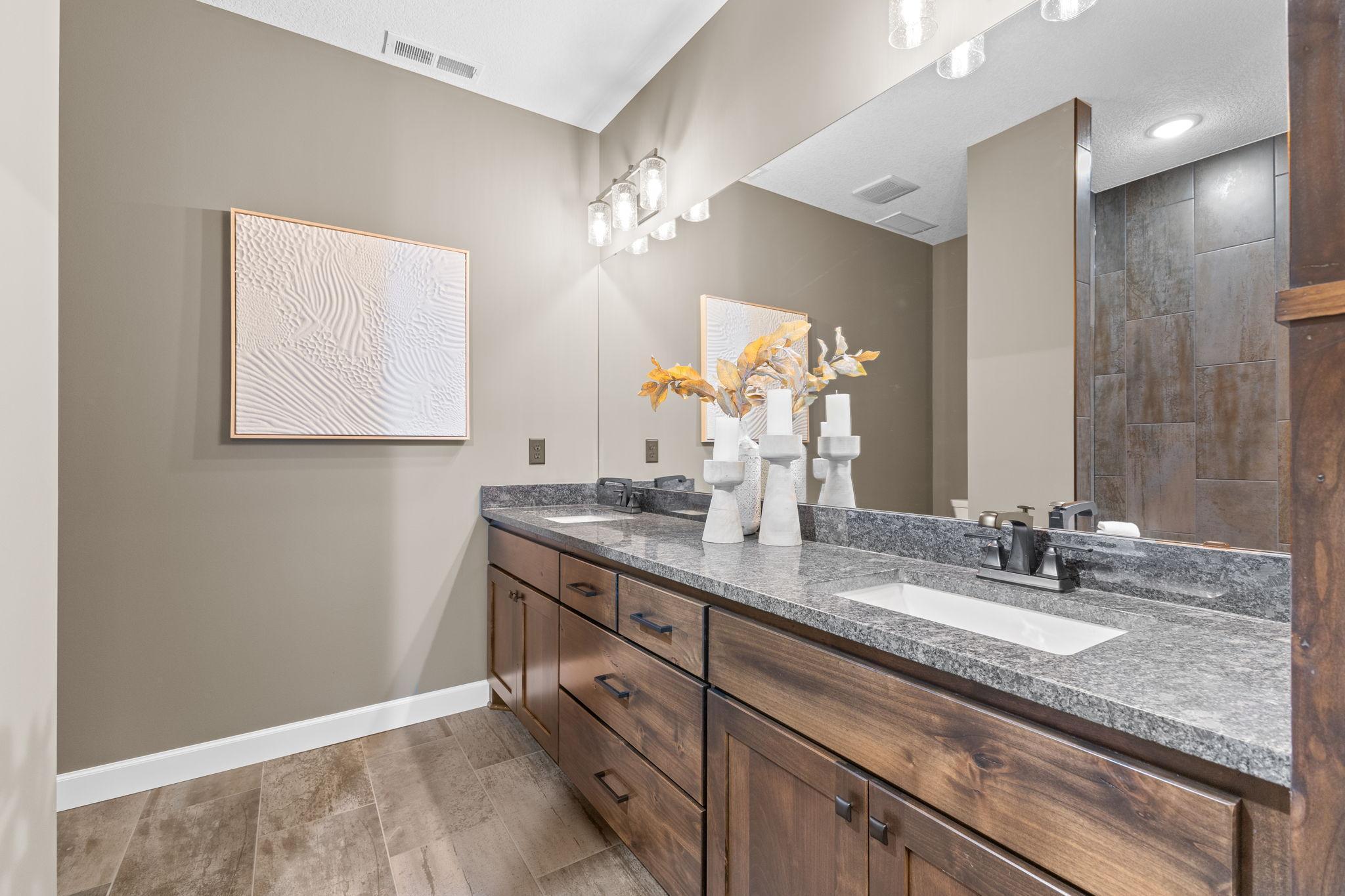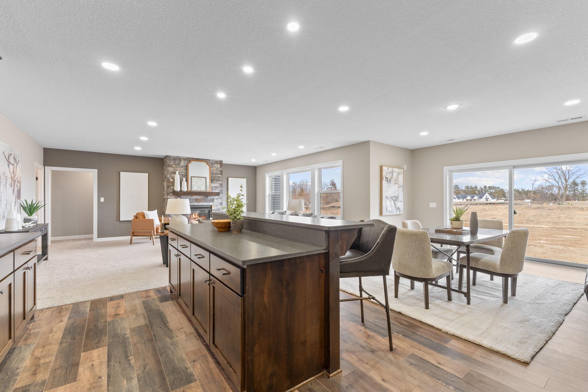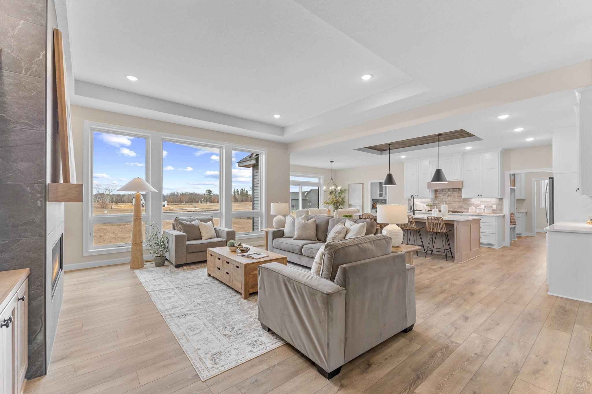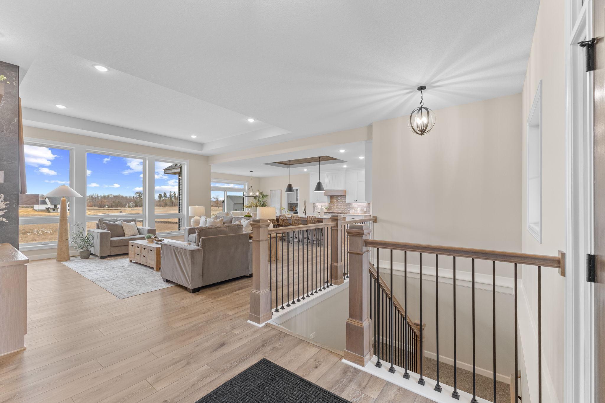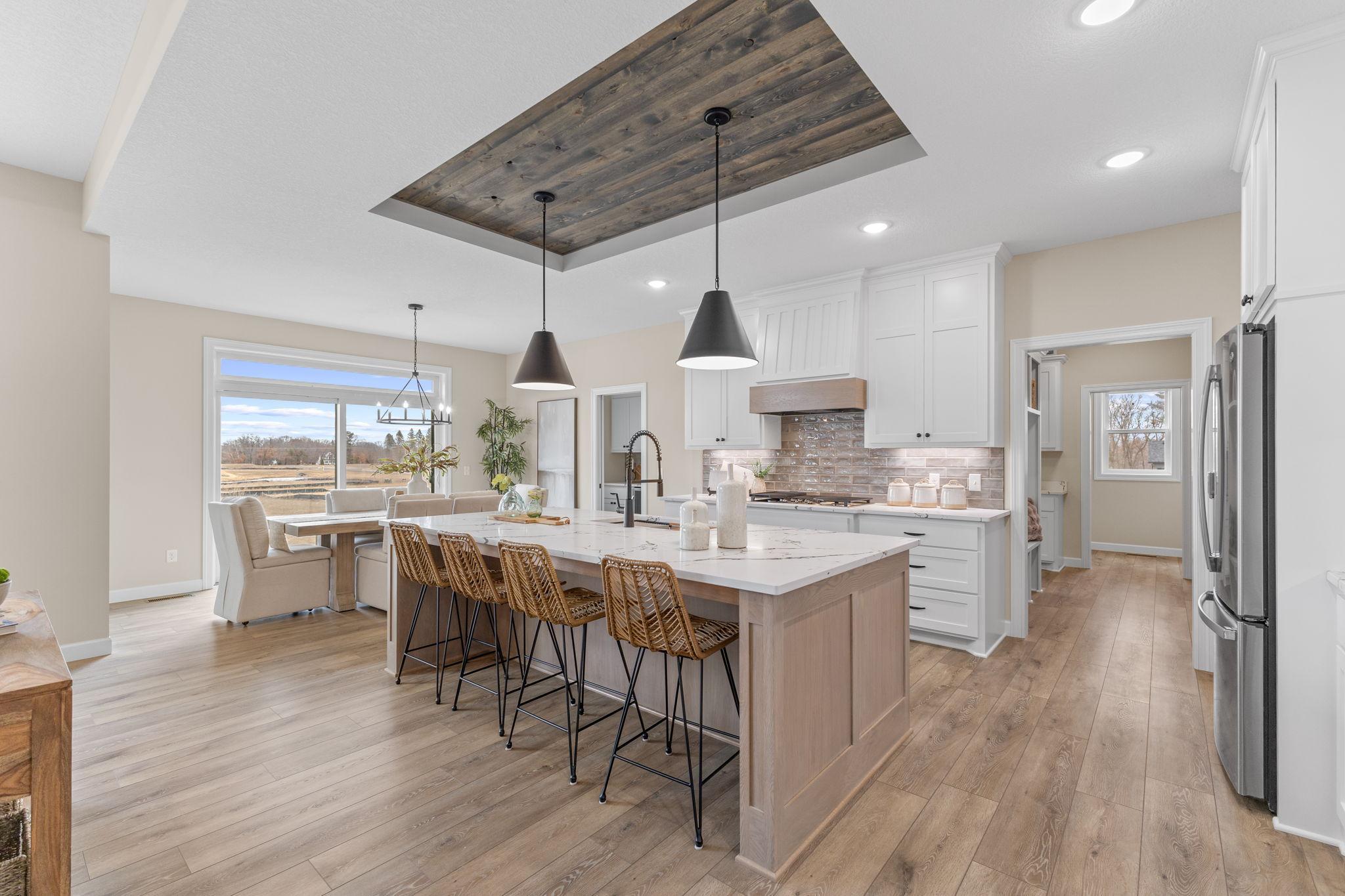 Situated on over an acre in Ham Lake, this stunning walkout rambler offers 4 bedrooms, 3 bathrooms, and exceptional craftsmanship throughout, built by TH Construction. The exterior commands attention with LP siding on the front with custom black accents and striking black Anderson windows. Take a step inside to be welcomed by an open concept living room with double box vaulted ceilings, lineal gas fireplace featuring tile to the ceiling with built-in cabinets on both sides. Massive windows flood the main level with natural light, leading you to a chef’s kitchen equipped with a white oak island, quartz countertops, a walk-in butler pantry, and custom cabinetry stretching to the ceiling. The main floor is designed for convenience and luxury, featuring a dining room with an oversized patio door, a home office/den, 2nd bedroom, full tile bath, an efficient laundry room, and a mudroom connecting to the expansive 46x28 4-stall garage. The primary suite is a true retreat, boasting box-vaulted ceilings, walk-in closet and a spa-like private bath with white oak cabinetry, a walk-in tile shower, and a free standing tub. Take a walk downstairs to find an entertainer`s dream, featuring a large open concept family room, including an additional gas fireplace with stone surround, a 14-foot wet bar, with two-tier island, and a thoughtfully designed bar top overlooking a dedicated golf simulator room—. Featuring custom built padding surround to perfectly fit the room. Two additional large bedrooms and a full tile bathroom round out the lower level. Zoned Heat for each level! Designed by a fully custom builder/architect with over 35 years of experience, this home makes your dream a reality. This Rambler has it all, check it out today!!