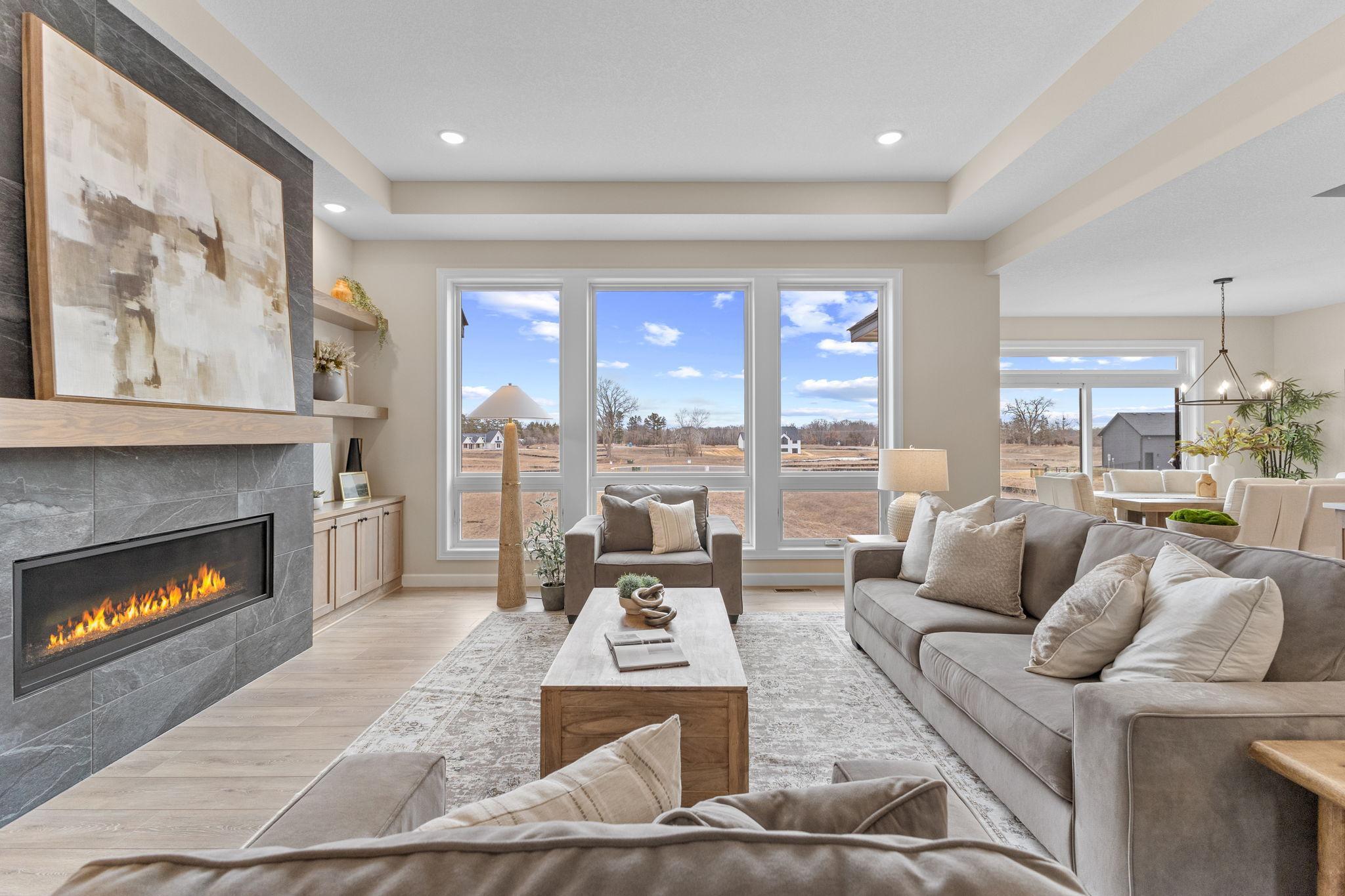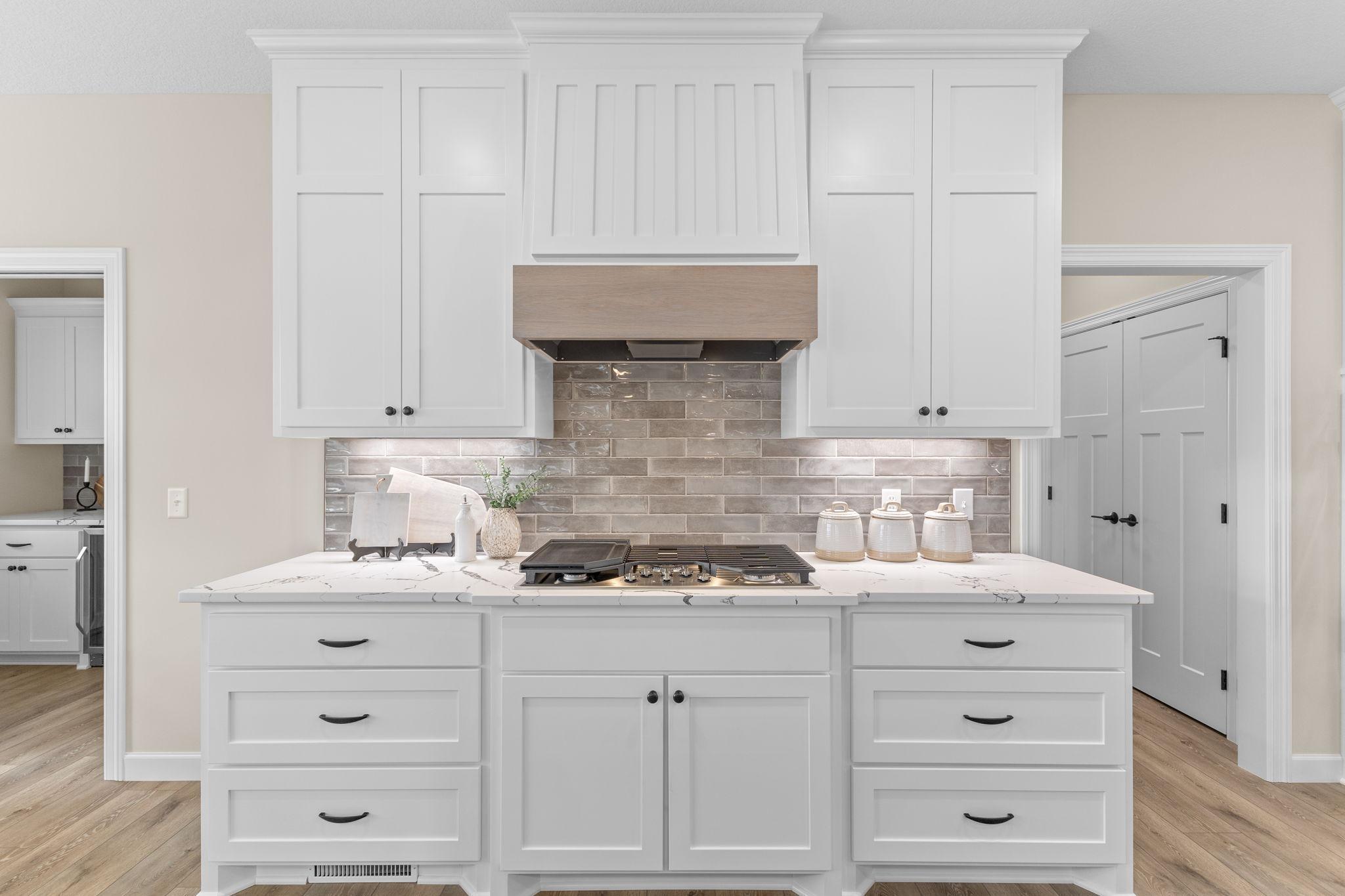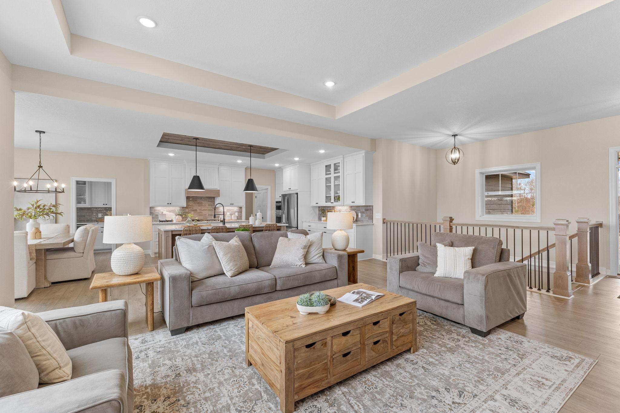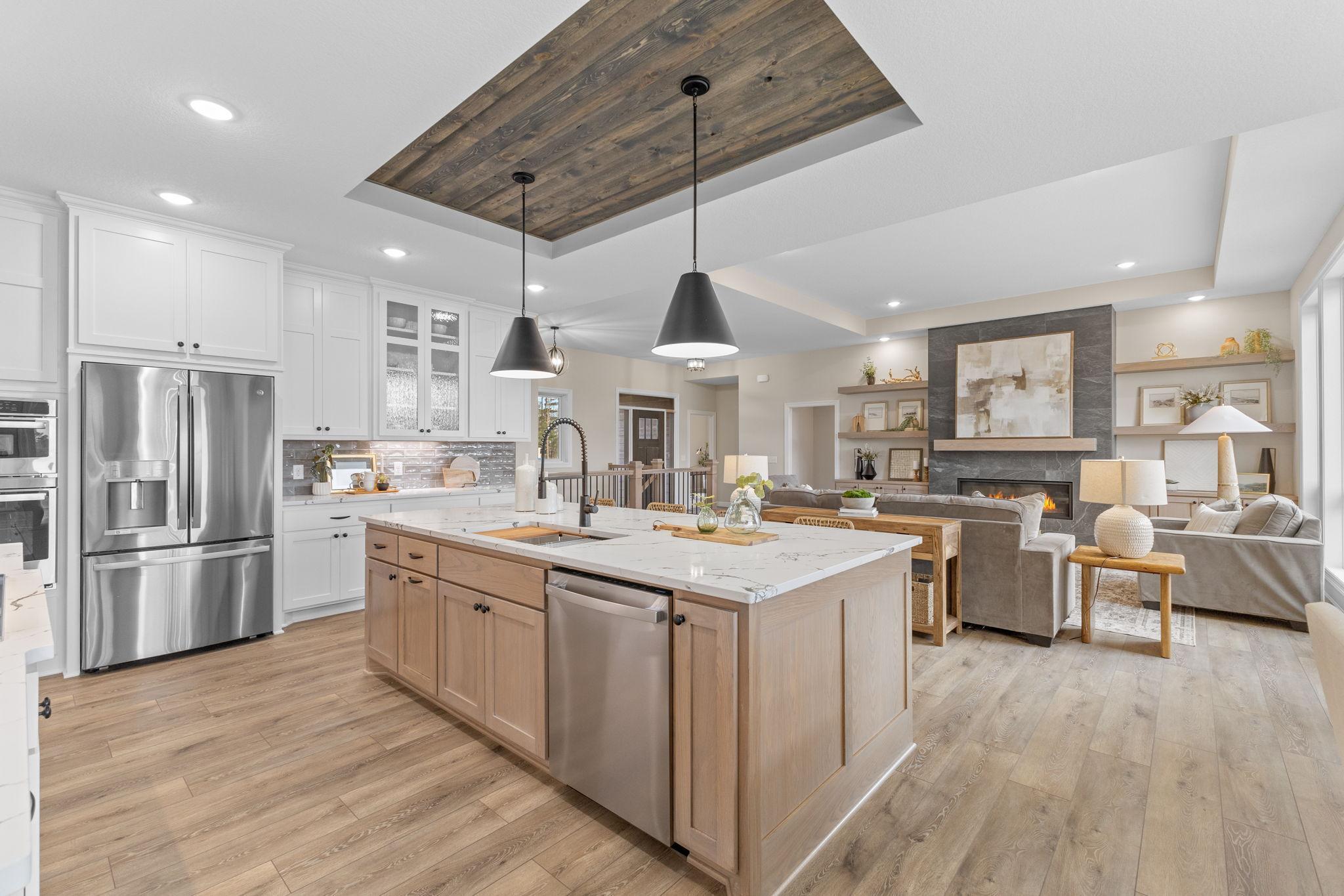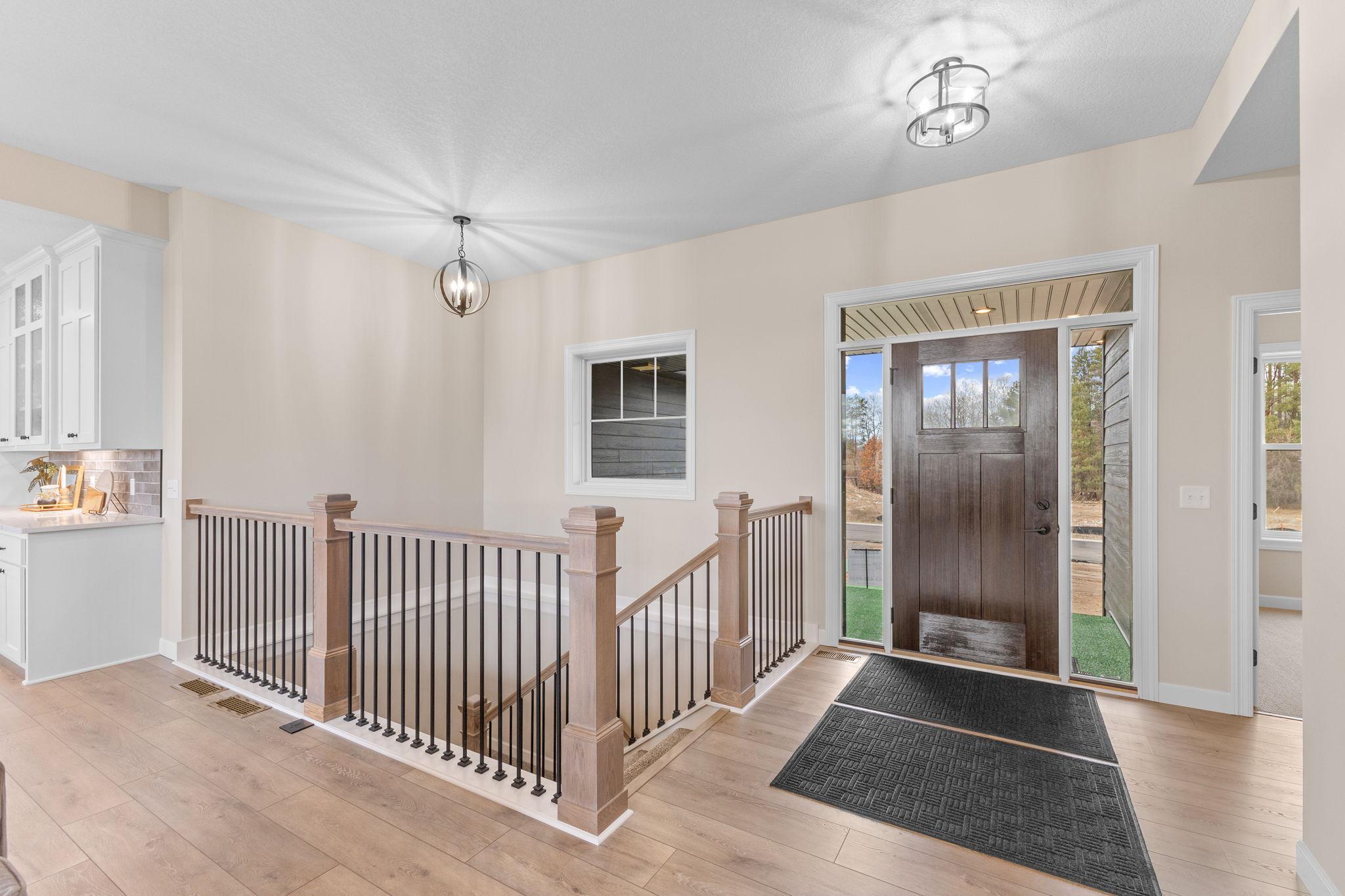 Situated on over an acre in Ham Lake, this stunning walkout rambler offers 4 bedrooms, 3 bathrooms, and exceptional craftsmanship throughout, built by TH Construction. The exterior commands attention with LP siding on the front with custom black accents and striking black Anderson windows. Take a step inside to be welcomed by an open concept living room with double box vaulted ceilings, lineal gas fireplace featuring tile to the ceiling with built-in cabinets on both sides. Massive windows flood the main level with natural light, leading you to a chef’s kitchen equipped with a white oak island, quartz countertops, a walk-in butler pantry, and custom cabinetry stretching to the ceiling. The main floor is designed for convenience and luxury, featuring a dining room with an oversized patio door, a home office/den, 2nd bedroom, full tile bath, an efficient laundry room, and a mudroom connecting to the expansive 46x28 4-stall garage. The primary suite is a true retreat, boasting box-vaulted ceilings, walk-in closet and a spa-like private bath with white oak cabinetry, a walk-in tile shower, and a free standing tub. Take a walk downstairs to find an entertainer`s dream, featuring a large open concept family room, including an additional gas fireplace with stone surround, a 14-foot wet bar, with two-tier island, and a thoughtfully designed bar top overlooking a dedicated golf simulator room—. Featuring custom built padding surround to perfectly fit the room. Two additional large bedrooms and a full tile bathroom round out the lower level. Zoned Heat for each level! Designed by a fully custom builder/architect with over 35 years of experience, this home makes your dream a reality. This Rambler has it all, check it out today!!