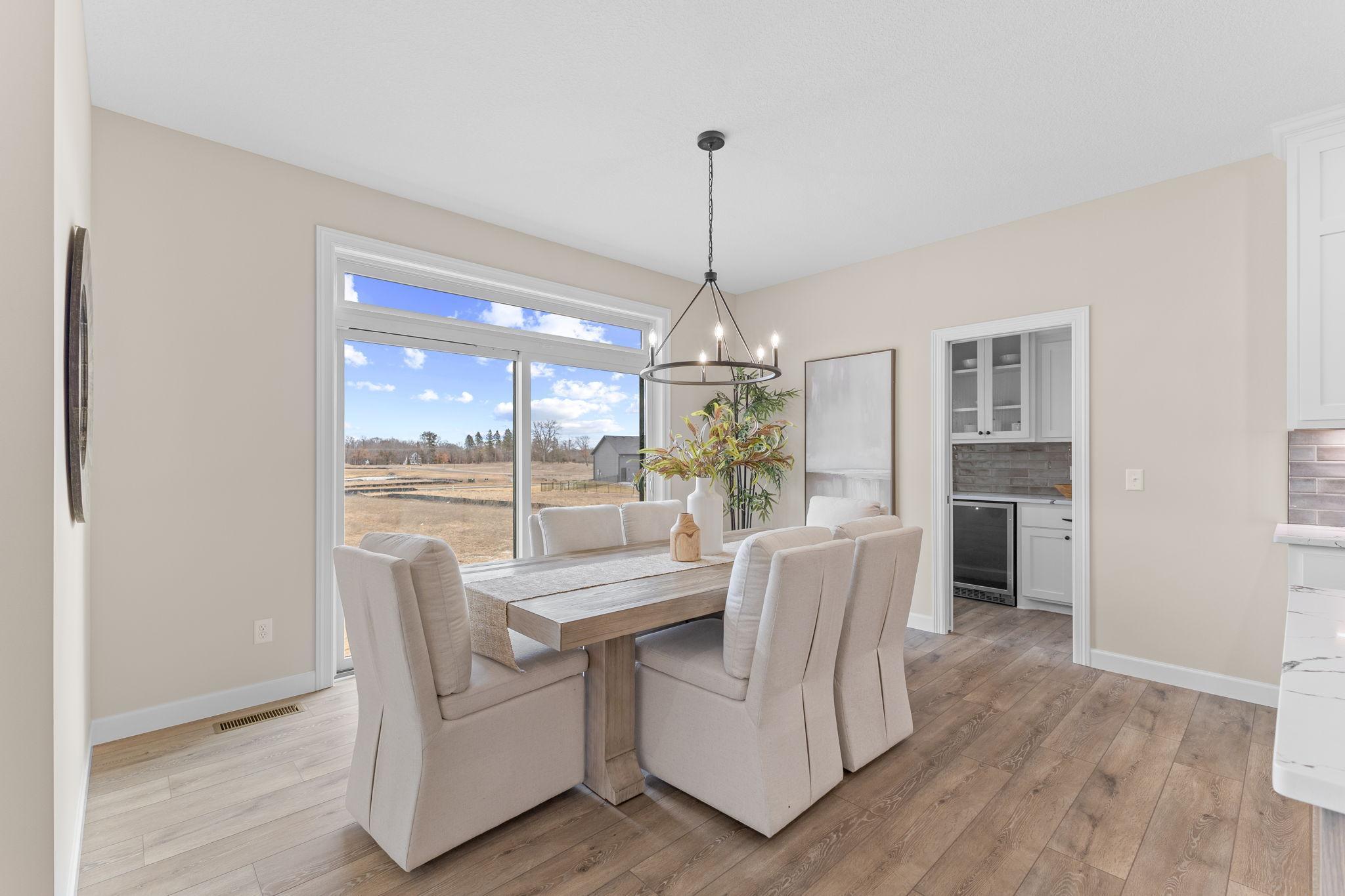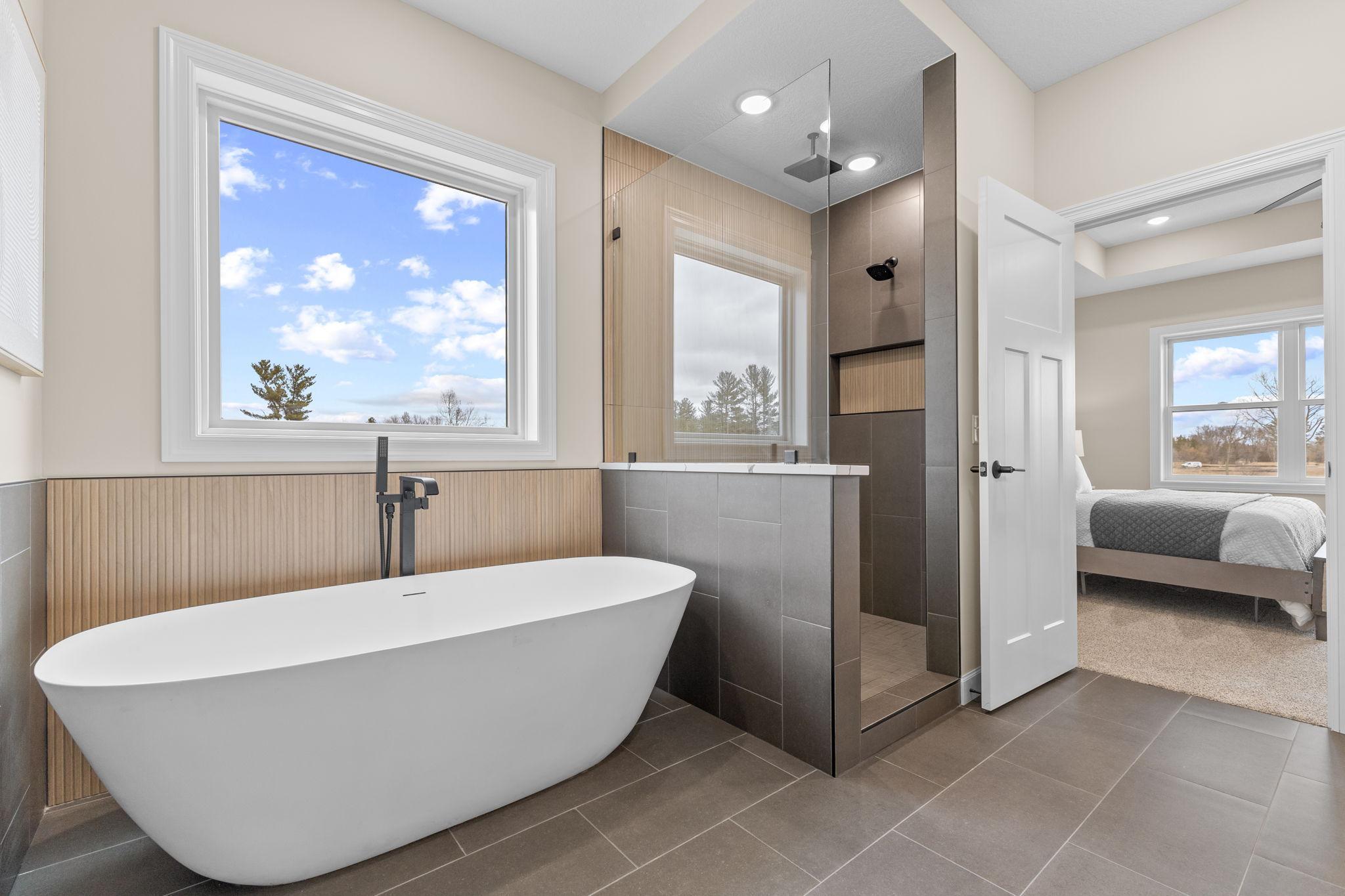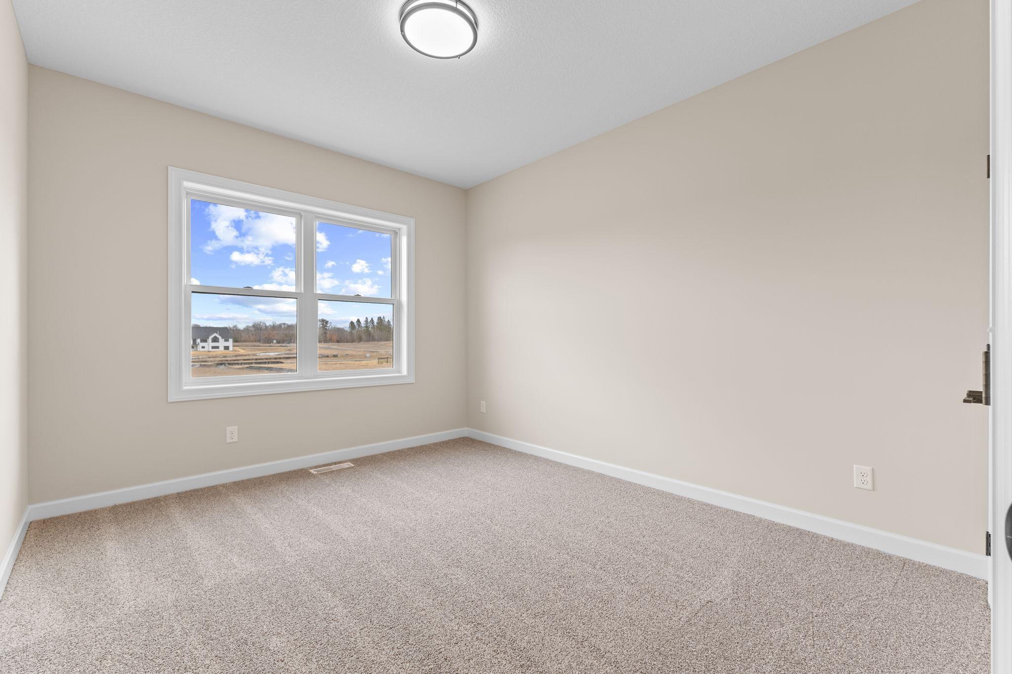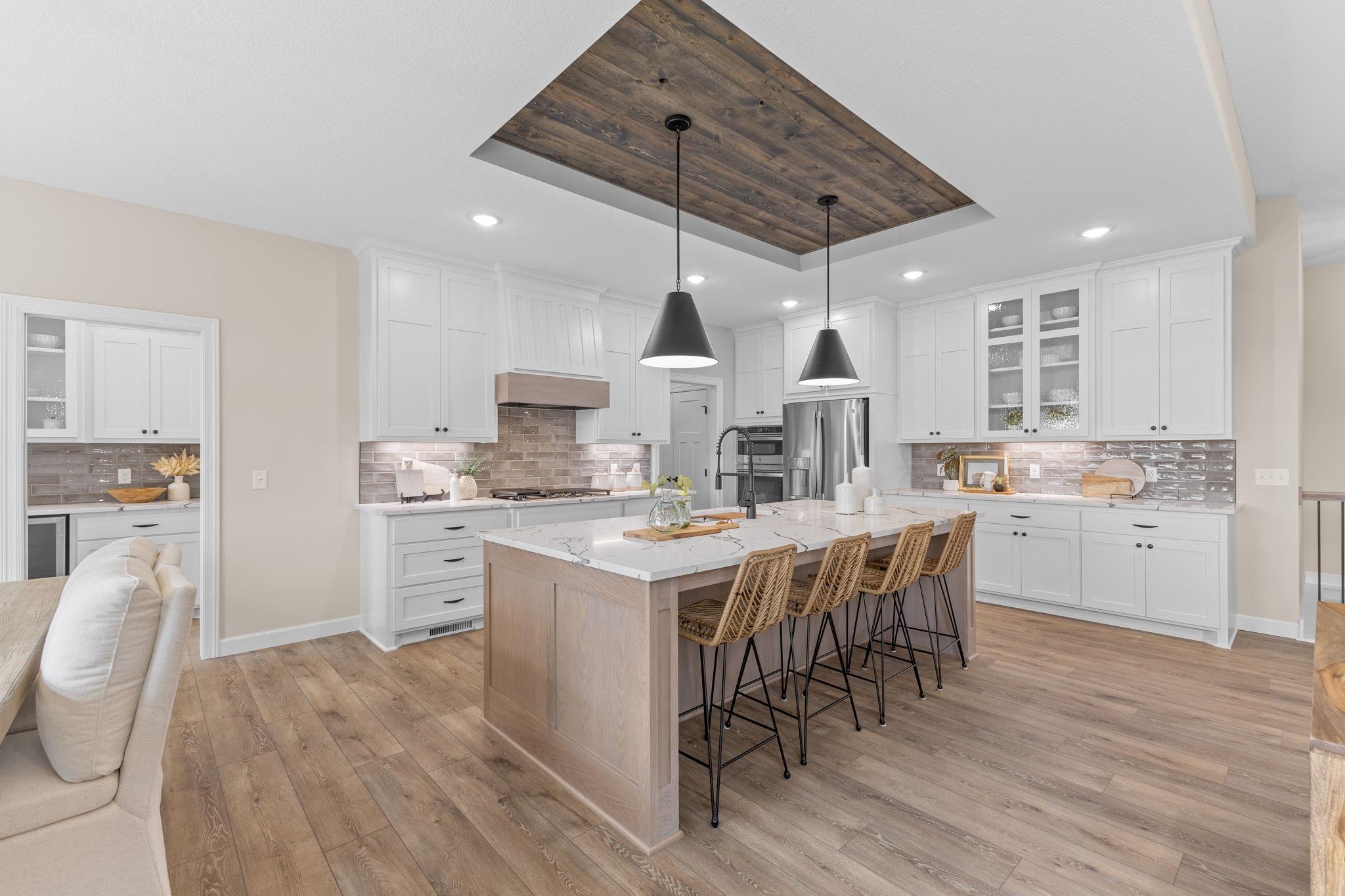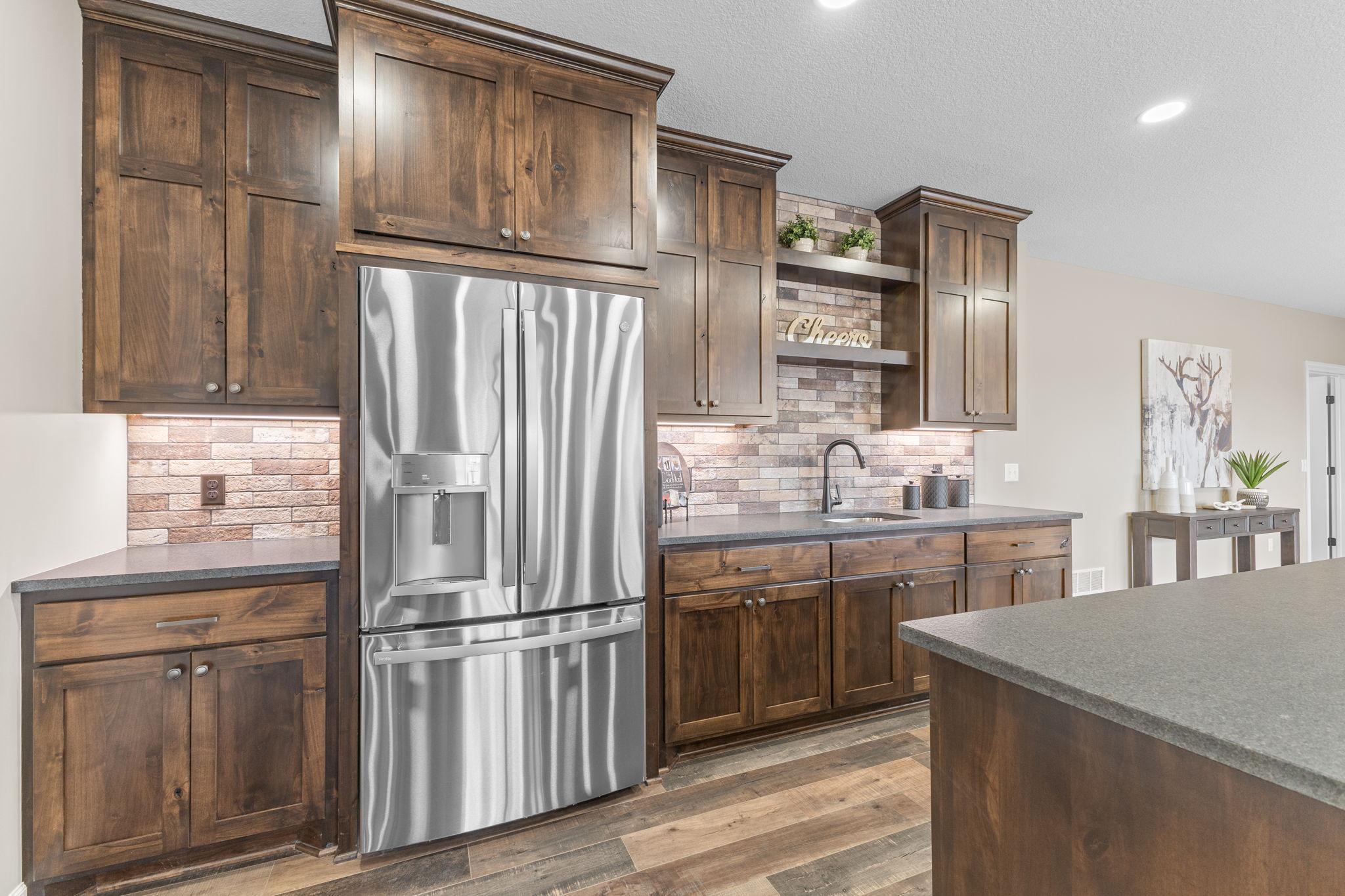 Situated on over an acre in Ham Lake, this stunning walkout rambler offers 4 bedrooms, 3 bathrooms, and exceptional craftsmanship throughout, built by TH Construction. The exterior commands attention with LP siding on the front with custom black accents and striking black Anderson windows. Take a step inside to be welcomed by an open concept living room with double box vaulted ceilings, lineal gas fireplace featuring tile to the ceiling with built-in cabinets on both sides. Massive windows flood the main level with natural light, leading you to a chef’s kitchen equipped with a white oak island, quartz countertops, a walk-in butler pantry, and custom cabinetry stretching to the ceiling. The main floor is designed for convenience and luxury, featuring a dining room with an oversized patio door, a home office/den, 2nd bedroom, full tile bath, an efficient laundry room, and a mudroom connecting to the expansive 46x28 4-stall garage. The primary suite is a true retreat, boasting box-vaulted ceilings, walk-in closet and a spa-like private bath with white oak cabinetry, a walk-in tile shower, and a free standing tub. Take a walk downstairs to find an entertainer`s dream, featuring a large open concept family room, including an additional gas fireplace with stone surround, a 14-foot wet bar, with two-tier island, and a thoughtfully designed bar top overlooking a dedicated golf simulator room—. Featuring custom built padding surround to perfectly fit the room. Two additional large bedrooms and a full tile bathroom round out the lower level. Zoned Heat for each level! Designed by a fully custom builder/architect with over 35 years of experience, this home makes your dream a reality. This Rambler has it all, check it out today!!