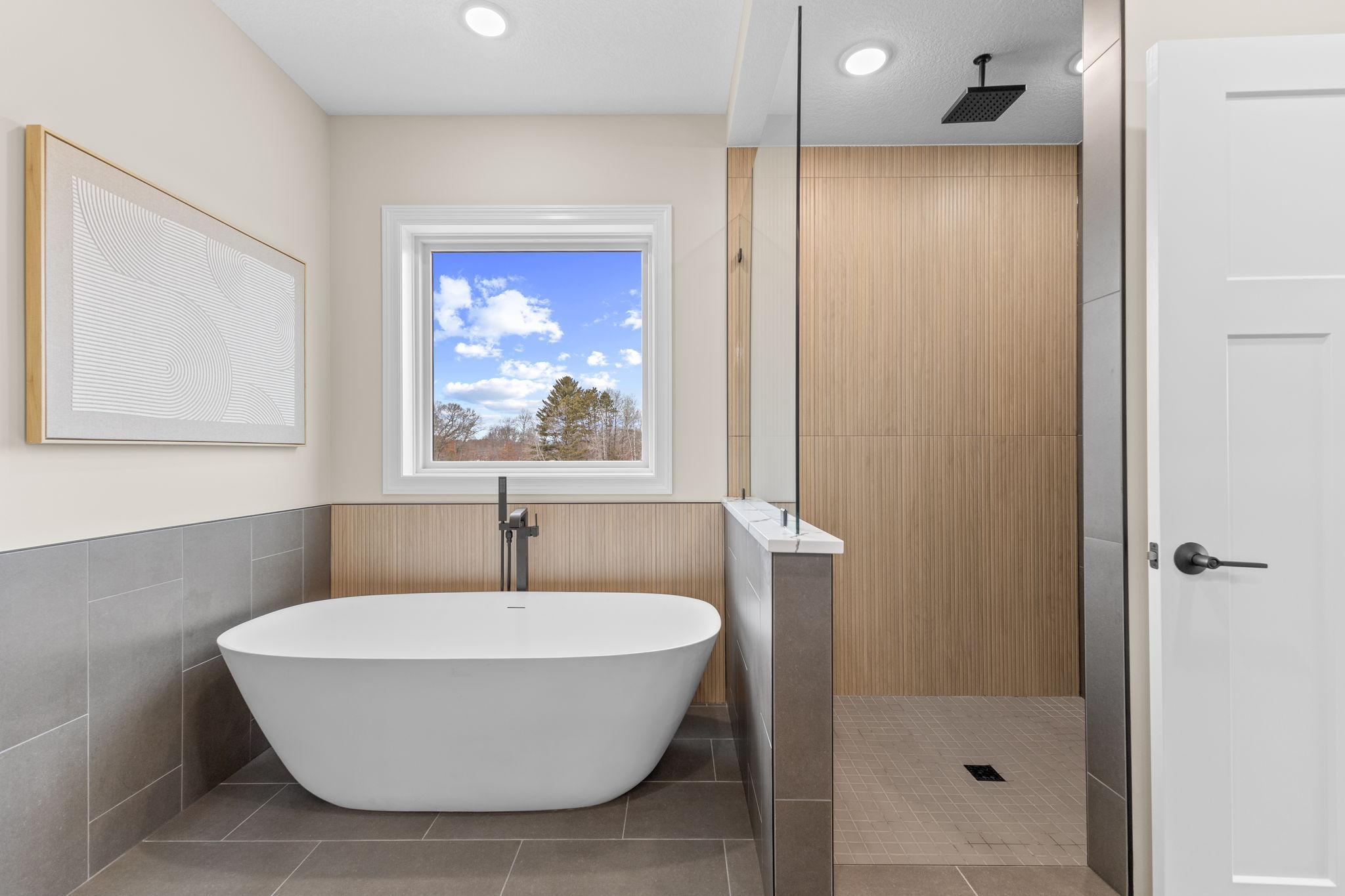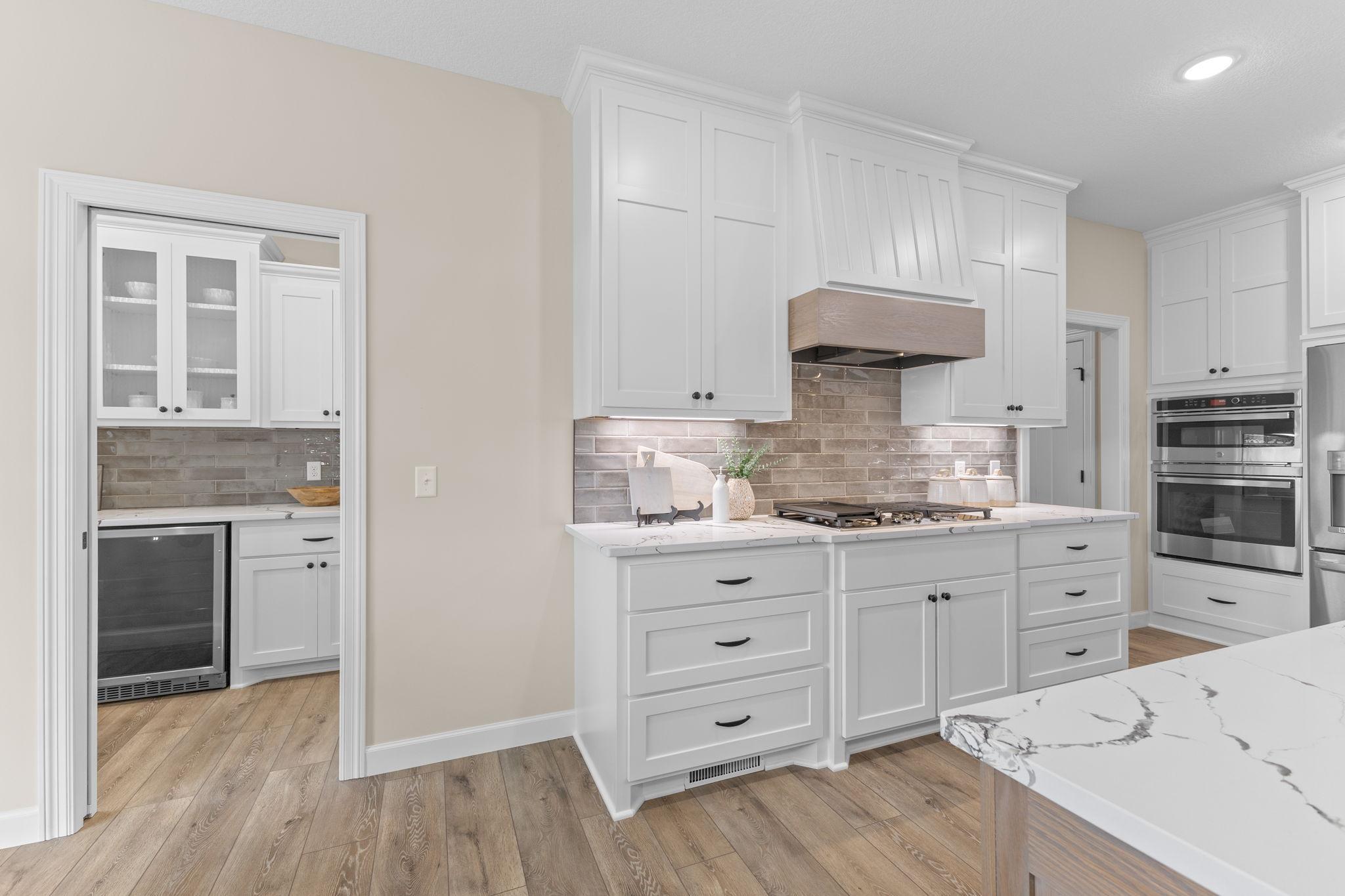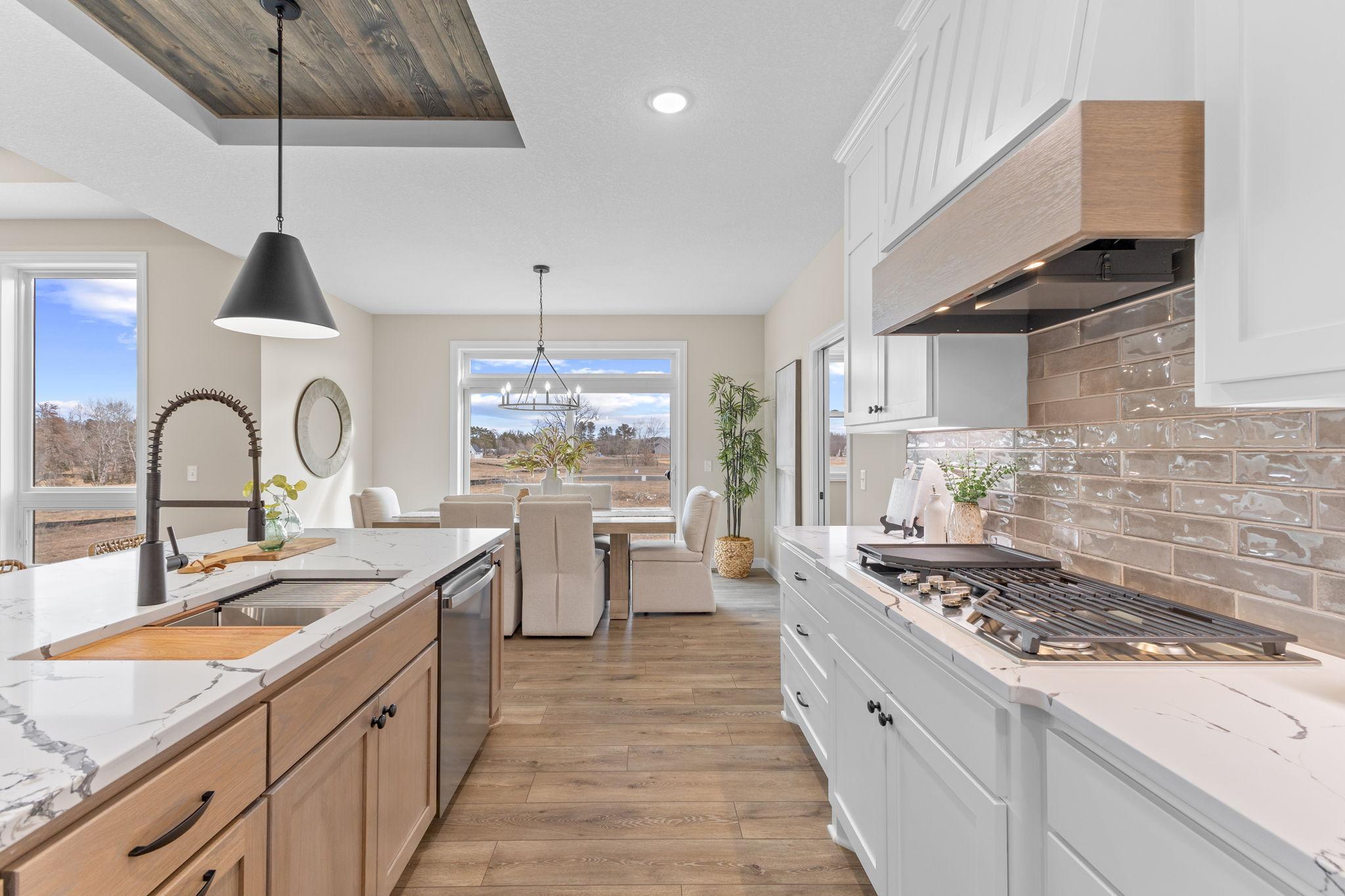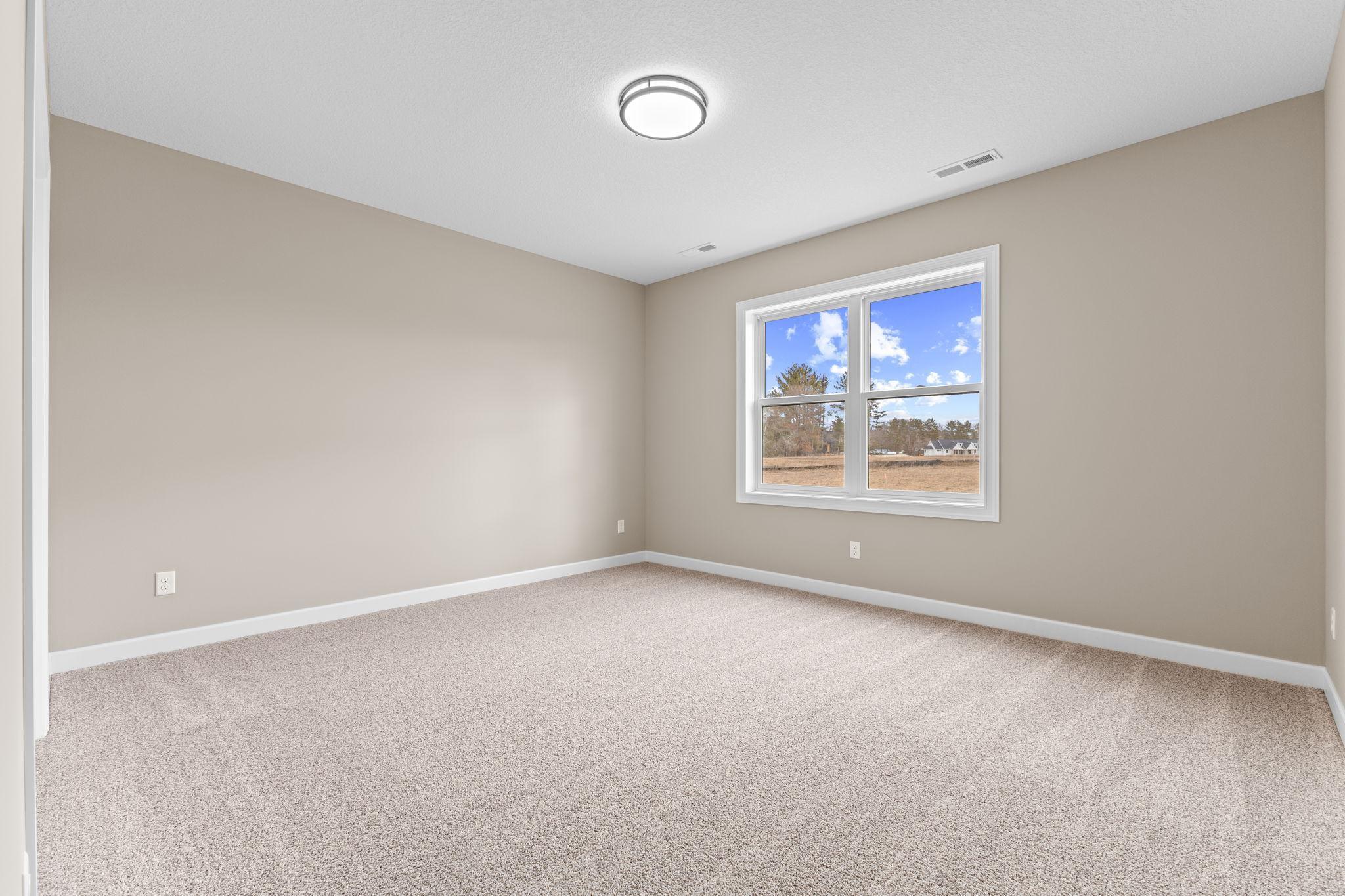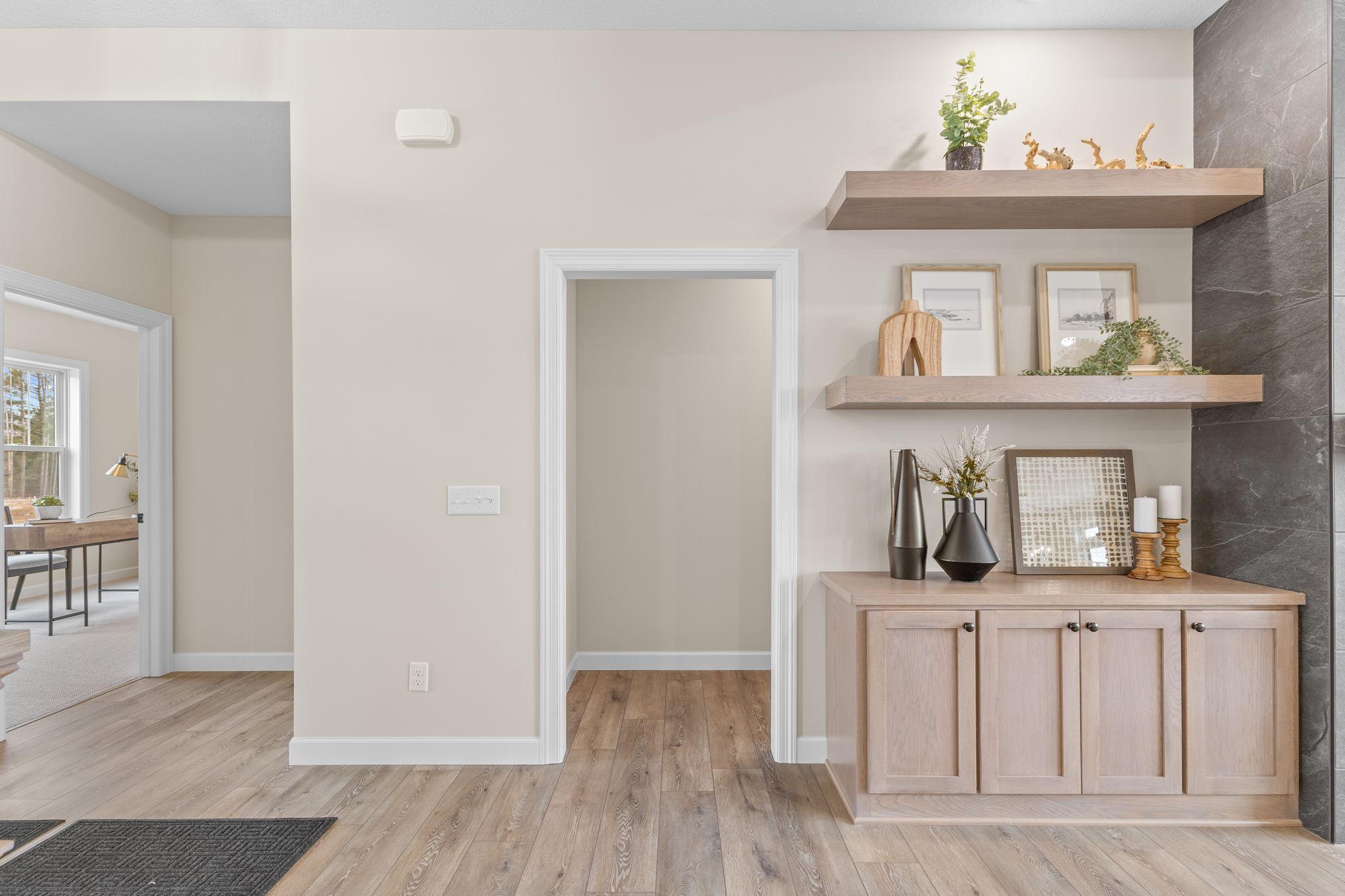 Situated on over an acre in Ham Lake, this stunning walkout rambler offers 4 bedrooms, 3 bathrooms, and exceptional craftsmanship throughout, built by TH Construction. The exterior commands attention with LP siding on the front with custom black accents and striking black Anderson windows. Take a step inside to be welcomed by an open concept living room with double box vaulted ceilings, lineal gas fireplace featuring tile to the ceiling with built-in cabinets on both sides. Massive windows flood the main level with natural light, leading you to a chef’s kitchen equipped with a white oak island, quartz countertops, a walk-in butler pantry, and custom cabinetry stretching to the ceiling. The main floor is designed for convenience and luxury, featuring a dining room with an oversized patio door, a home office/den, 2nd bedroom, full tile bath, an efficient laundry room, and a mudroom connecting to the expansive 46x28 4-stall garage. The primary suite is a true retreat, boasting box-vaulted ceilings, walk-in closet and a spa-like private bath with white oak cabinetry, a walk-in tile shower, and a free standing tub. Take a walk downstairs to find an entertainer`s dream, featuring a large open concept family room, including an additional gas fireplace with stone surround, a 14-foot wet bar, with two-tier island, and a thoughtfully designed bar top overlooking a dedicated golf simulator room—. Featuring custom built padding surround to perfectly fit the room. Two additional large bedrooms and a full tile bathroom round out the lower level. Zoned Heat for each level! Designed by a fully custom builder/architect with over 35 years of experience, this home makes your dream a reality. This Rambler has it all, check it out today!!