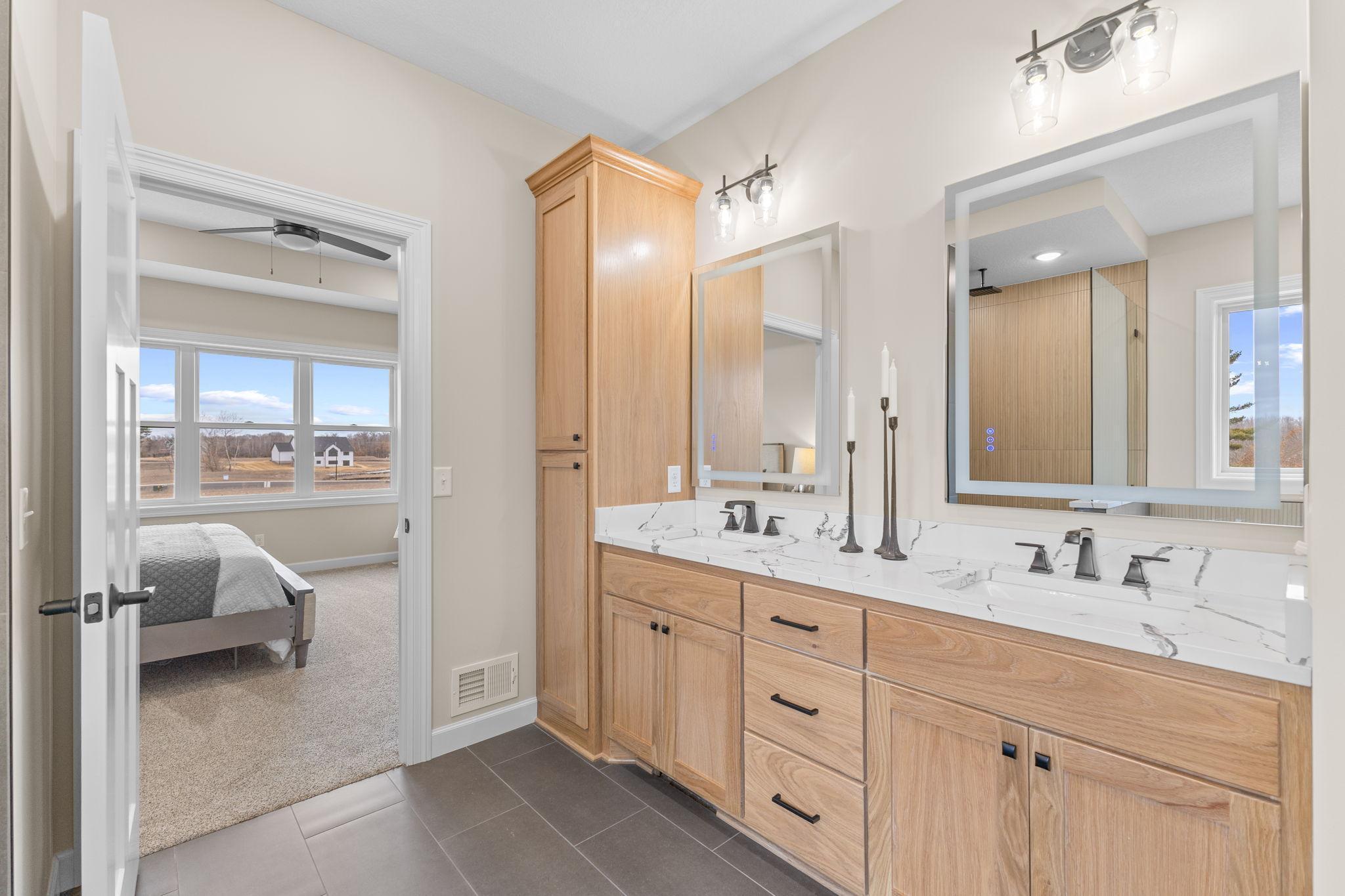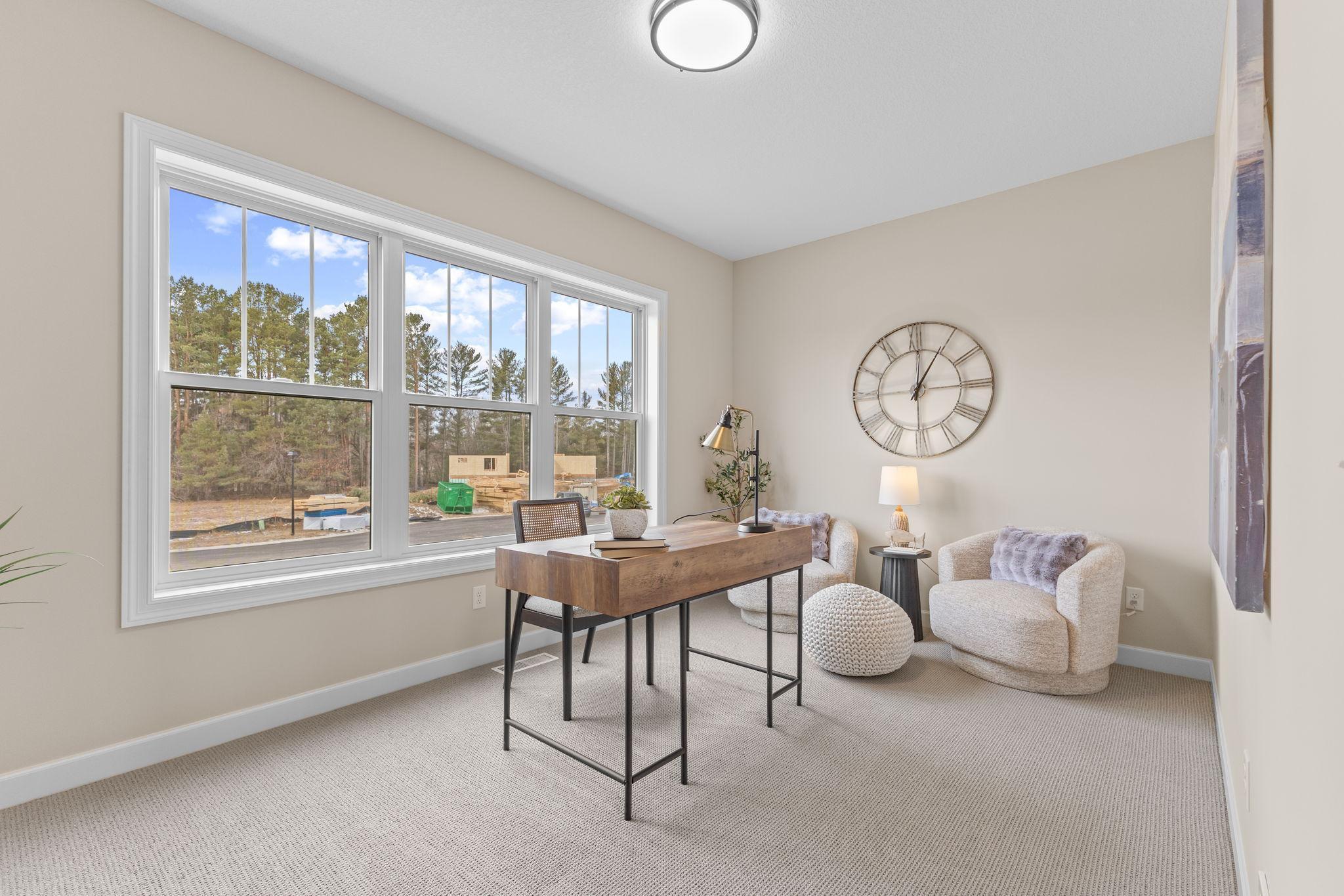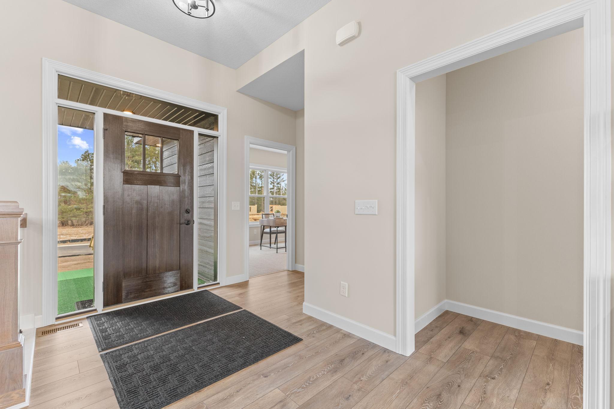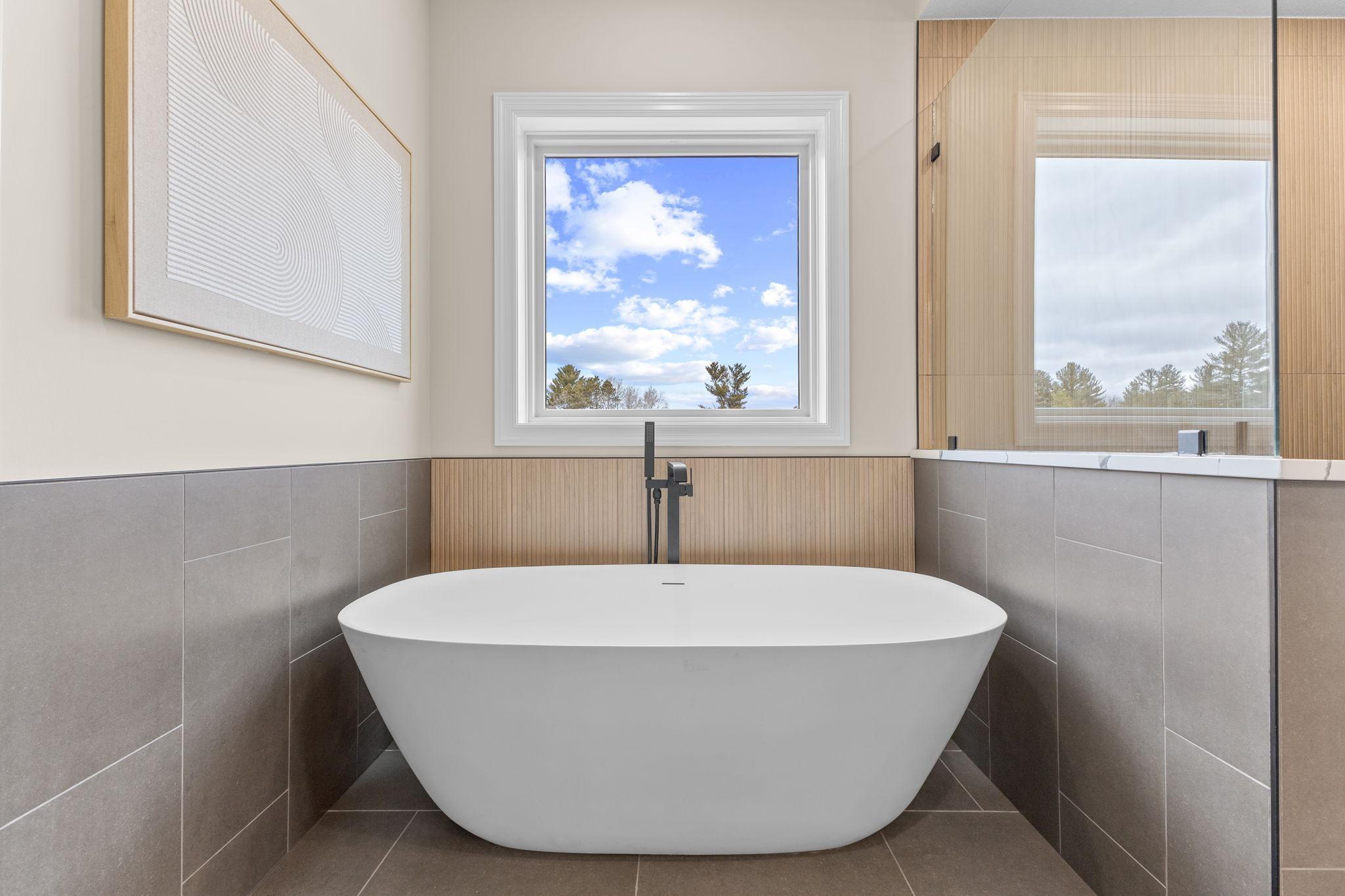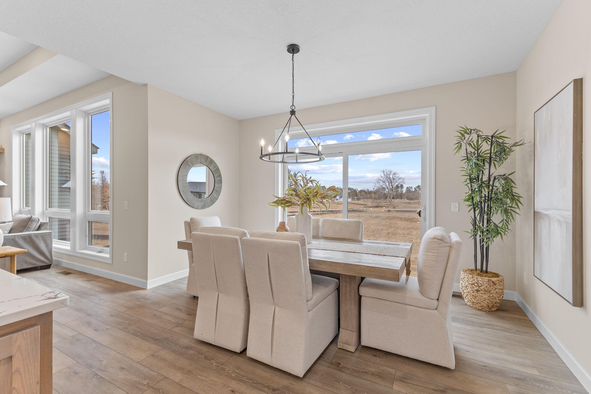 Situated on over an acre in Ham Lake, this stunning walkout rambler offers 4 bedrooms, 3 bathrooms, and exceptional craftsmanship throughout, built by TH Construction. The exterior commands attention with LP siding on the front with custom black accents and striking black Anderson windows. Take a step inside to be welcomed by an open concept living room with double box vaulted ceilings, lineal gas fireplace featuring tile to the ceiling with built-in cabinets on both sides. Massive windows flood the main level with natural light, leading you to a chef’s kitchen equipped with a white oak island, quartz countertops, a walk-in butler pantry, and custom cabinetry stretching to the ceiling. The main floor is designed for convenience and luxury, featuring a dining room with an oversized patio door, a home office/den, 2nd bedroom, full tile bath, an efficient laundry room, and a mudroom connecting to the expansive 46x28 4-stall garage. The primary suite is a true retreat, boasting box-vaulted ceilings, walk-in closet and a spa-like private bath with white oak cabinetry, a walk-in tile shower, and a free standing tub. Take a walk downstairs to find an entertainer`s dream, featuring a large open concept family room, including an additional gas fireplace with stone surround, a 14-foot wet bar, with two-tier island, and a thoughtfully designed bar top overlooking a dedicated golf simulator room—. Featuring custom built padding surround to perfectly fit the room. Two additional large bedrooms and a full tile bathroom round out the lower level. Zoned Heat for each level! Designed by a fully custom builder/architect with over 35 years of experience, this home makes your dream a reality. This Rambler has it all, check it out today!!