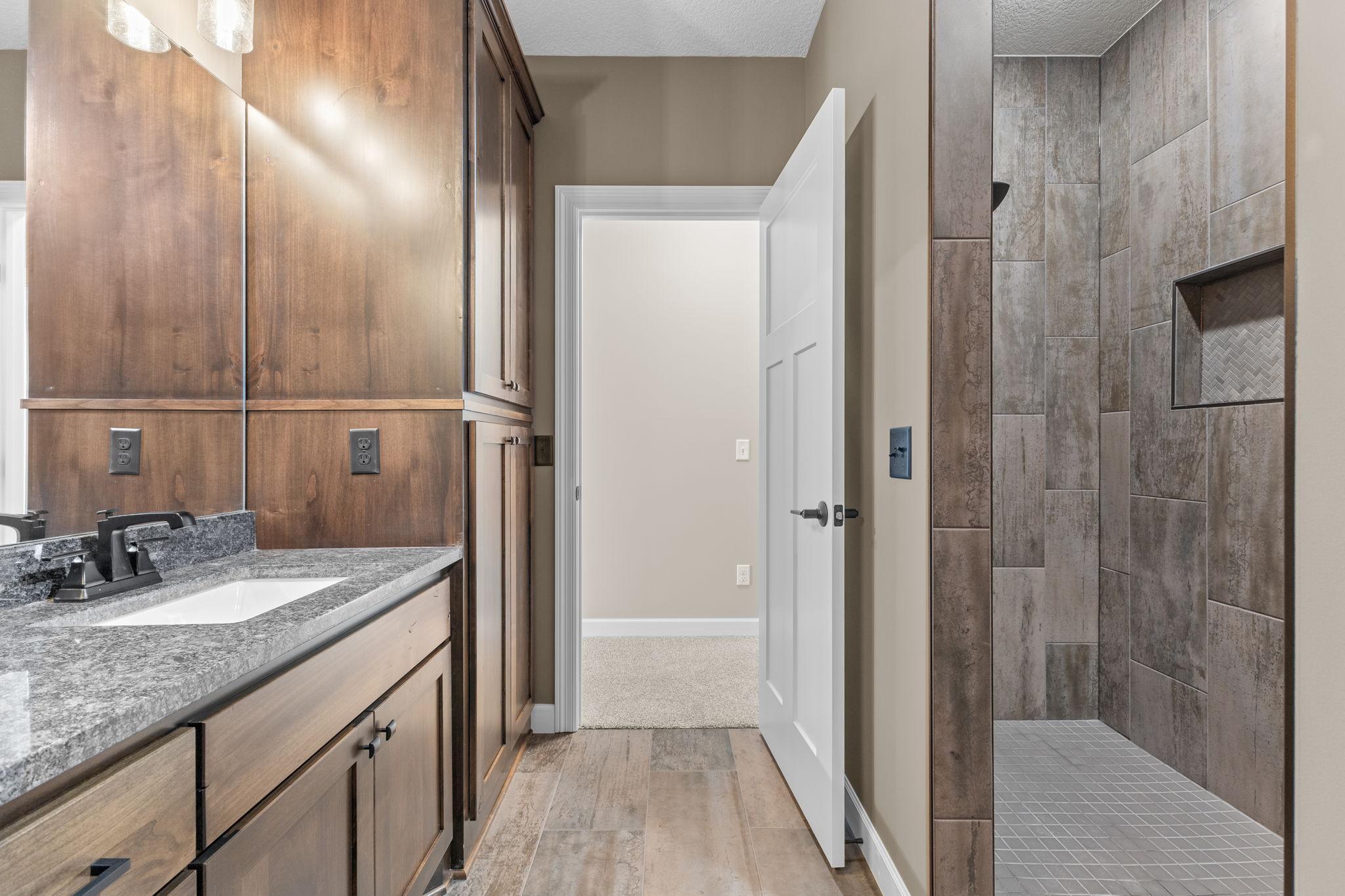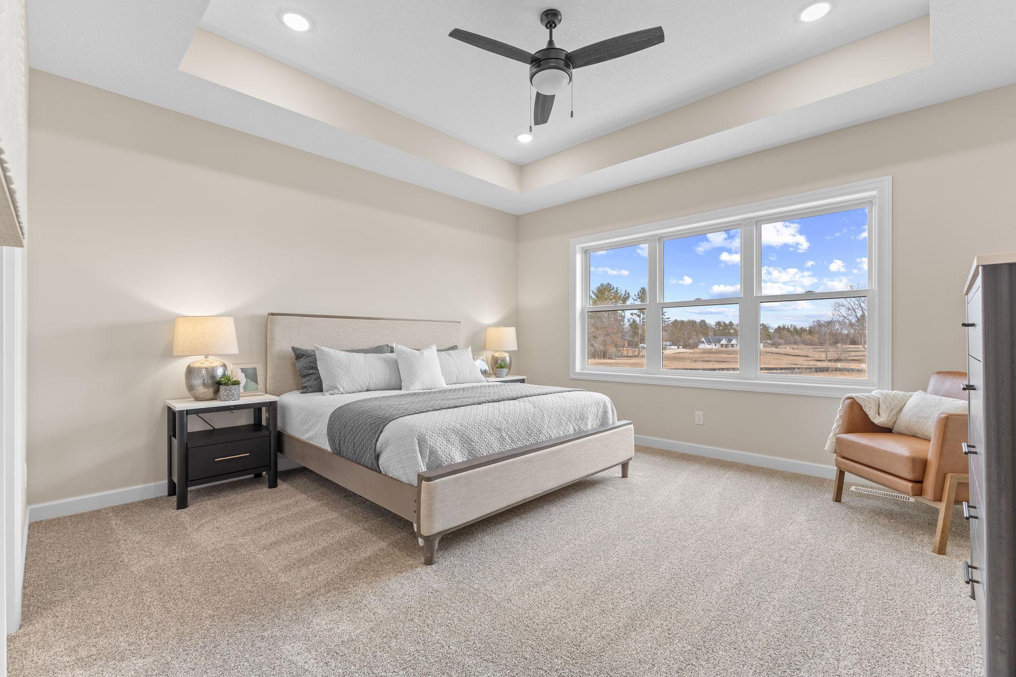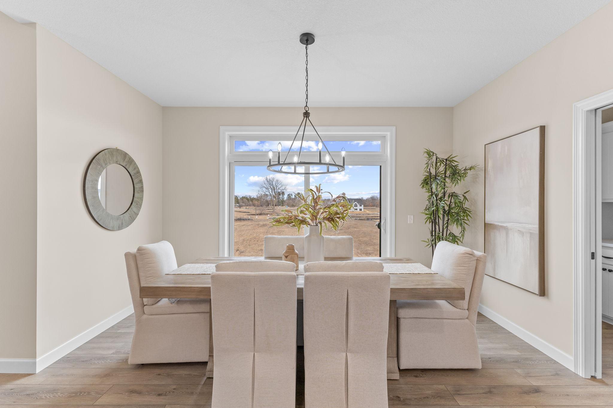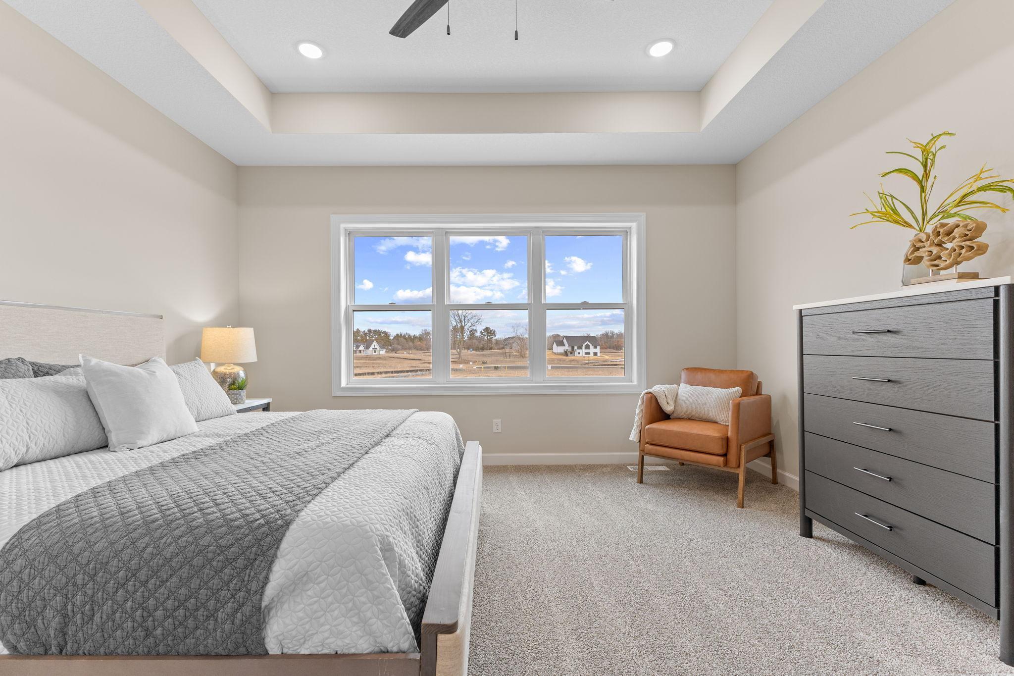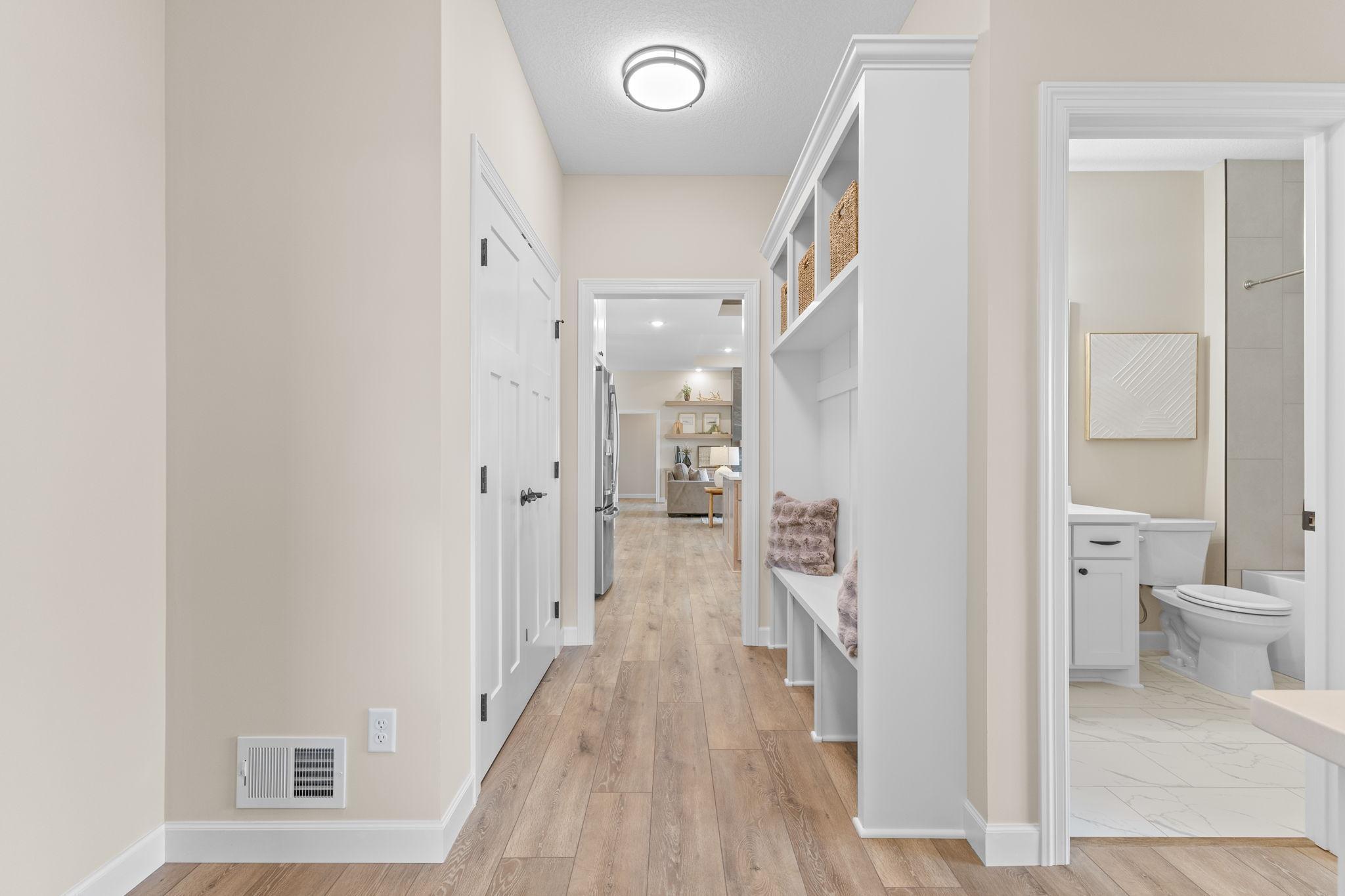 Situated on over an acre in Ham Lake, this stunning walkout rambler offers 4 bedrooms, 3 bathrooms, and exceptional craftsmanship throughout, built by TH Construction. The exterior commands attention with LP siding on the front with custom black accents and striking black Anderson windows. Take a step inside to be welcomed by an open concept living room with double box vaulted ceilings, lineal gas fireplace featuring tile to the ceiling with built-in cabinets on both sides. Massive windows flood the main level with natural light, leading you to a chef’s kitchen equipped with a white oak island, quartz countertops, a walk-in butler pantry, and custom cabinetry stretching to the ceiling. The main floor is designed for convenience and luxury, featuring a dining room with an oversized patio door, a home office/den, 2nd bedroom, full tile bath, an efficient laundry room, and a mudroom connecting to the expansive 46x28 4-stall garage. The primary suite is a true retreat, boasting box-vaulted ceilings, walk-in closet and a spa-like private bath with white oak cabinetry, a walk-in tile shower, and a free standing tub. Take a walk downstairs to find an entertainer`s dream, featuring a large open concept family room, including an additional gas fireplace with stone surround, a 14-foot wet bar, with two-tier island, and a thoughtfully designed bar top overlooking a dedicated golf simulator room—. Featuring custom built padding surround to perfectly fit the room. Two additional large bedrooms and a full tile bathroom round out the lower level. Zoned Heat for each level! Designed by a fully custom builder/architect with over 35 years of experience, this home makes your dream a reality. This Rambler has it all, check it out today!!