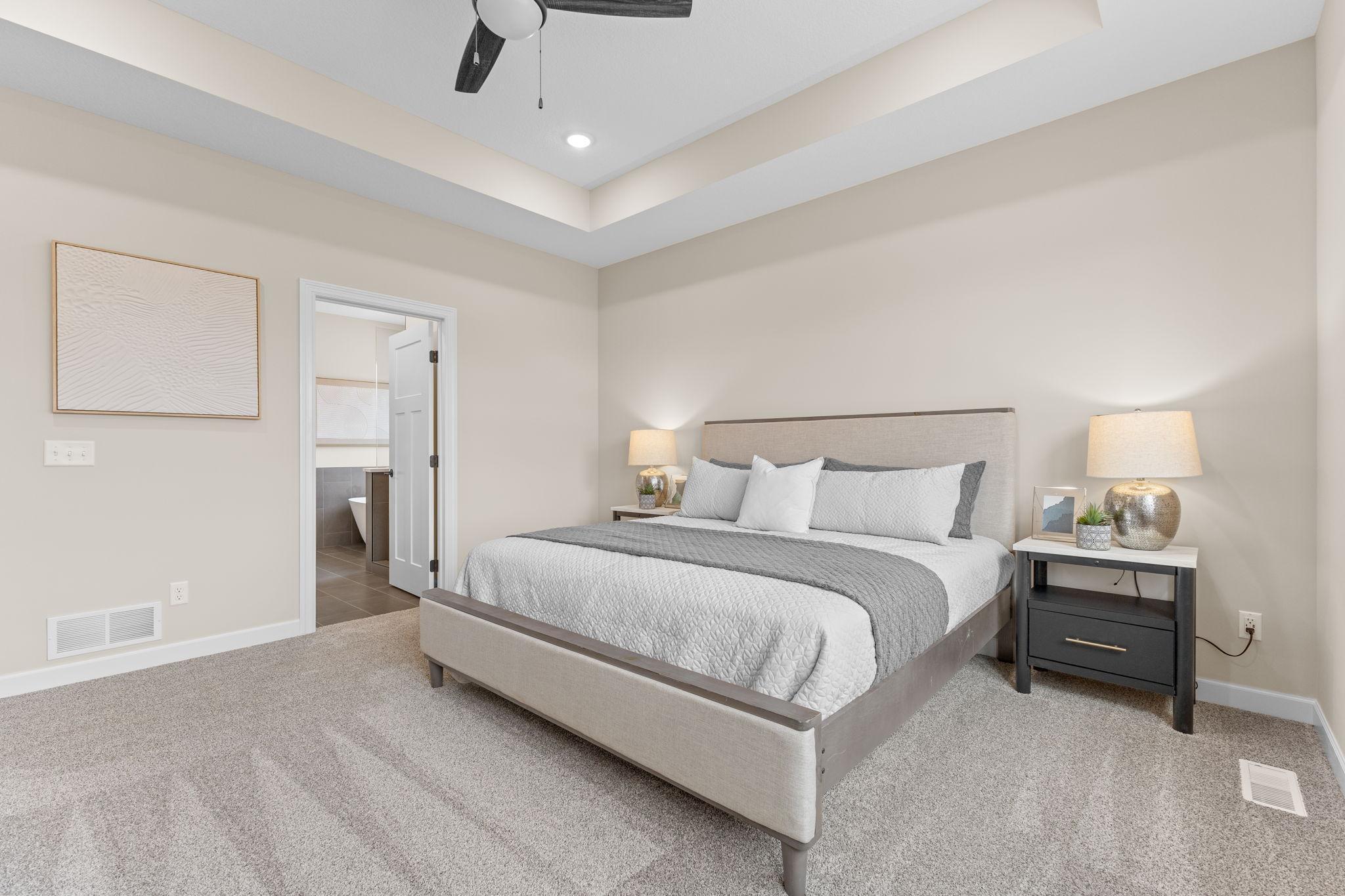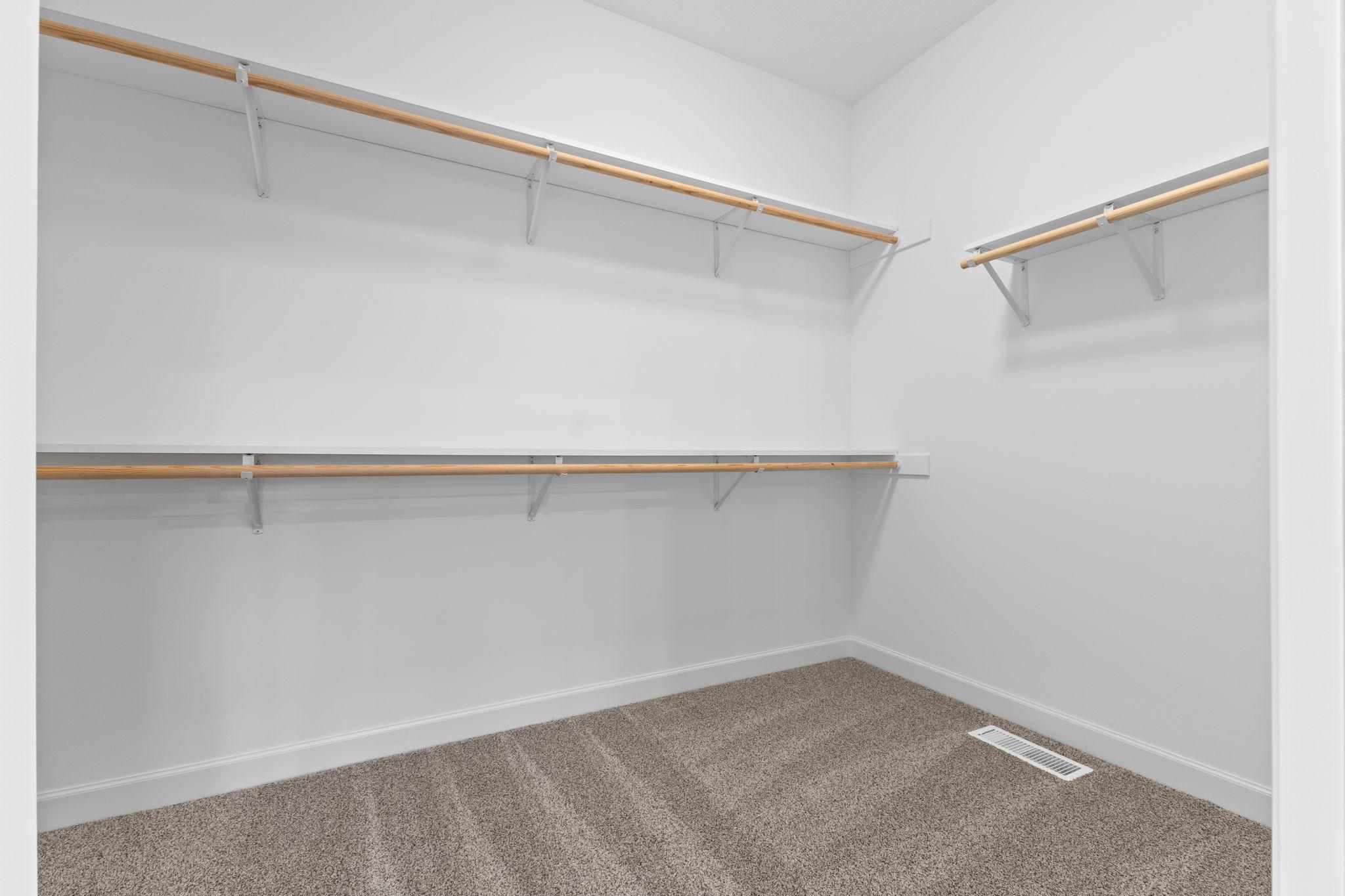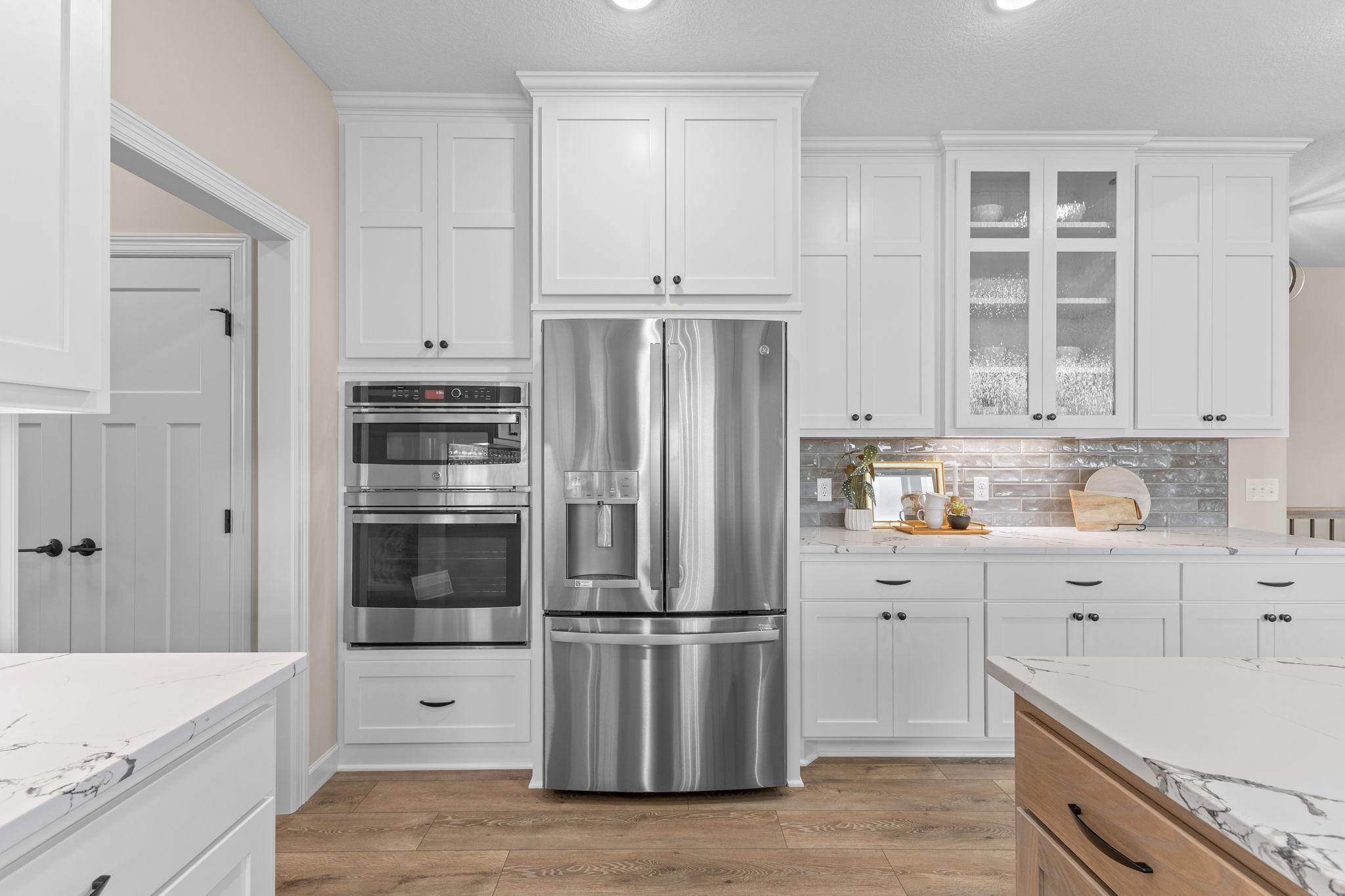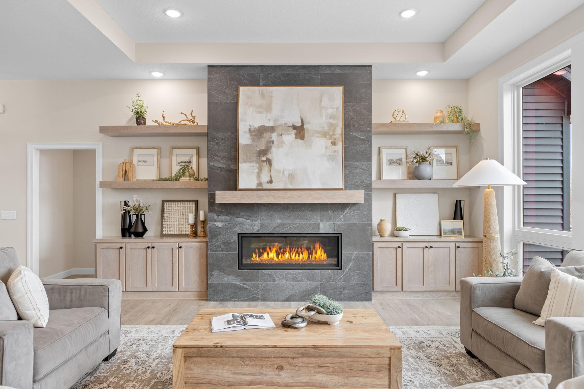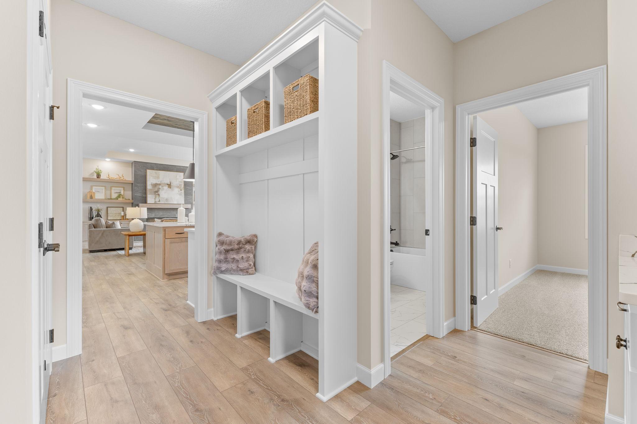 Situated on over an acre in Ham Lake, this stunning walkout rambler offers 4 bedrooms, 3 bathrooms, and exceptional craftsmanship throughout, built by TH Construction. The exterior commands attention with LP siding on the front with custom black accents and striking black Anderson windows. Take a step inside to be welcomed by an open concept living room with double box vaulted ceilings, lineal gas fireplace featuring tile to the ceiling with built-in cabinets on both sides. Massive windows flood the main level with natural light, leading you to a chef’s kitchen equipped with a white oak island, quartz countertops, a walk-in butler pantry, and custom cabinetry stretching to the ceiling. The main floor is designed for convenience and luxury, featuring a dining room with an oversized patio door, a home office/den, 2nd bedroom, full tile bath, an efficient laundry room, and a mudroom connecting to the expansive 46x28 4-stall garage. The primary suite is a true retreat, boasting box-vaulted ceilings, walk-in closet and a spa-like private bath with white oak cabinetry, a walk-in tile shower, and a free standing tub. Take a walk downstairs to find an entertainer`s dream, featuring a large open concept family room, including an additional gas fireplace with stone surround, a 14-foot wet bar, with two-tier island, and a thoughtfully designed bar top overlooking a dedicated golf simulator room—. Featuring custom built padding surround to perfectly fit the room. Two additional large bedrooms and a full tile bathroom round out the lower level. Zoned Heat for each level! Designed by a fully custom builder/architect with over 35 years of experience, this home makes your dream a reality. This Rambler has it all, check it out today!!