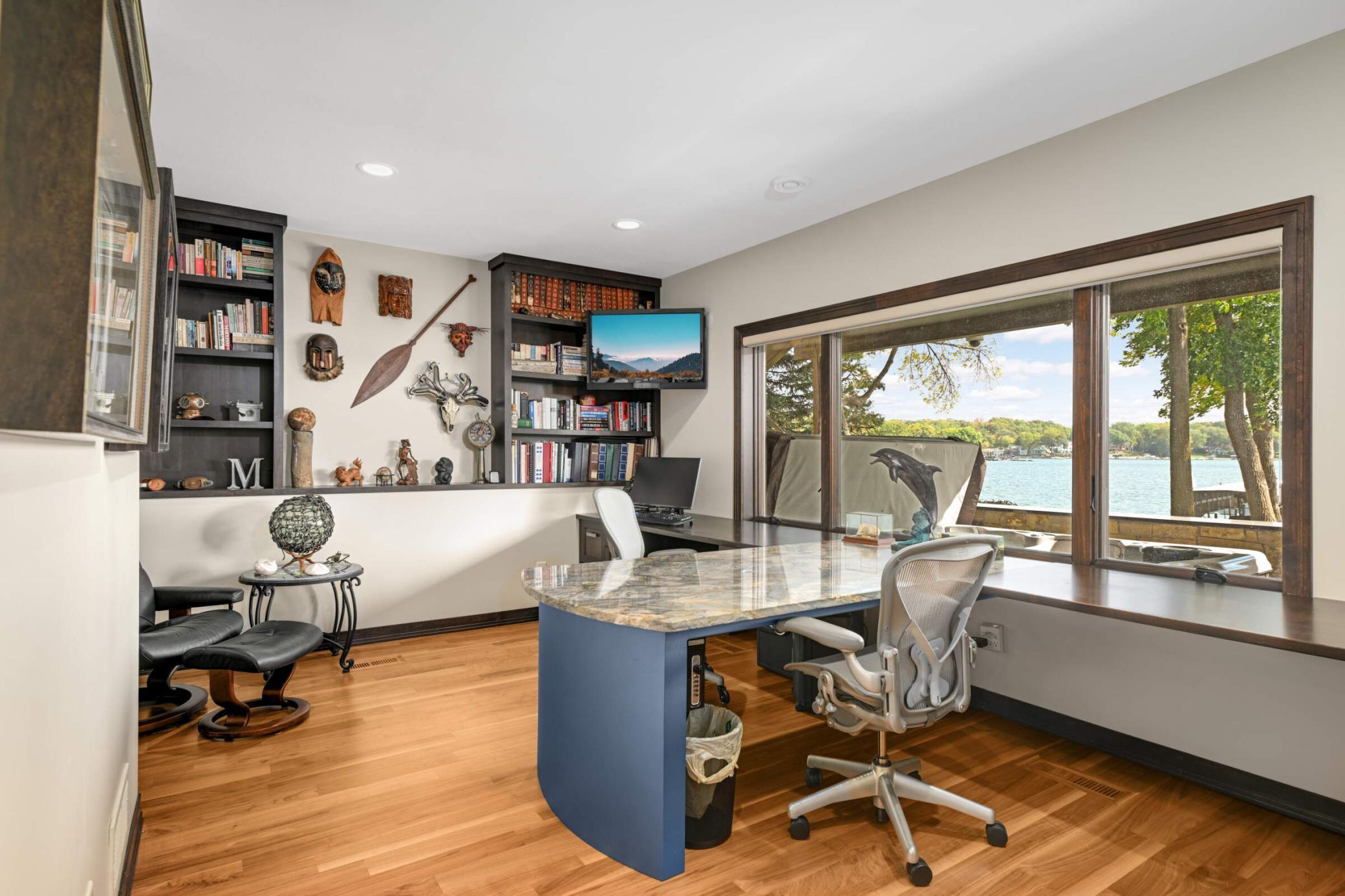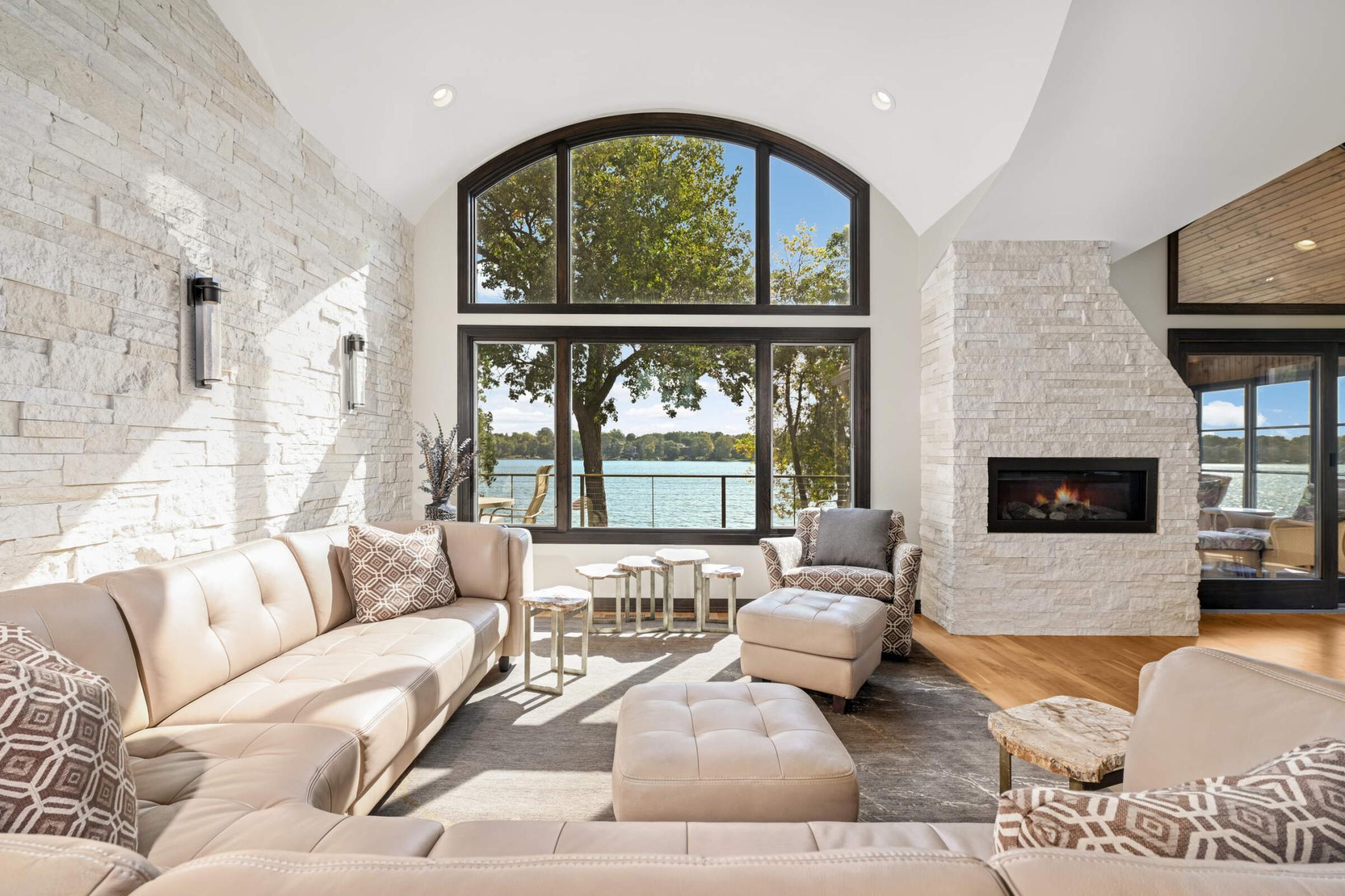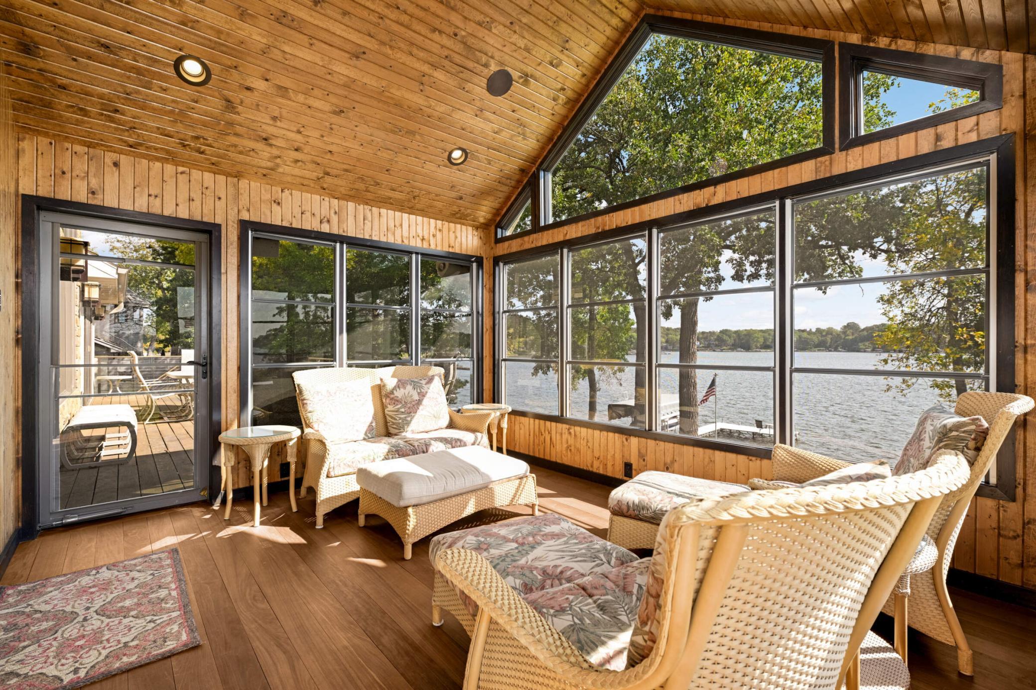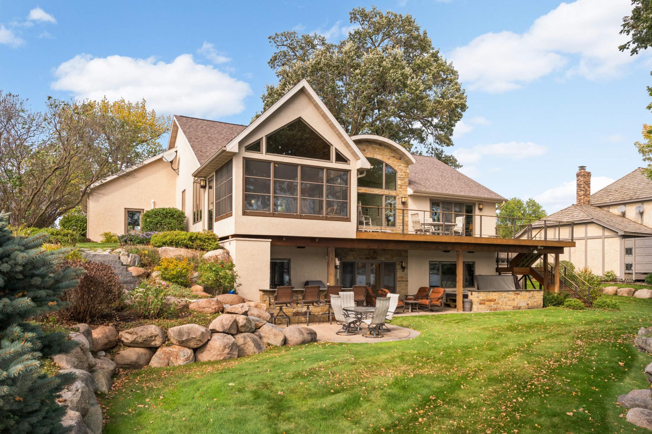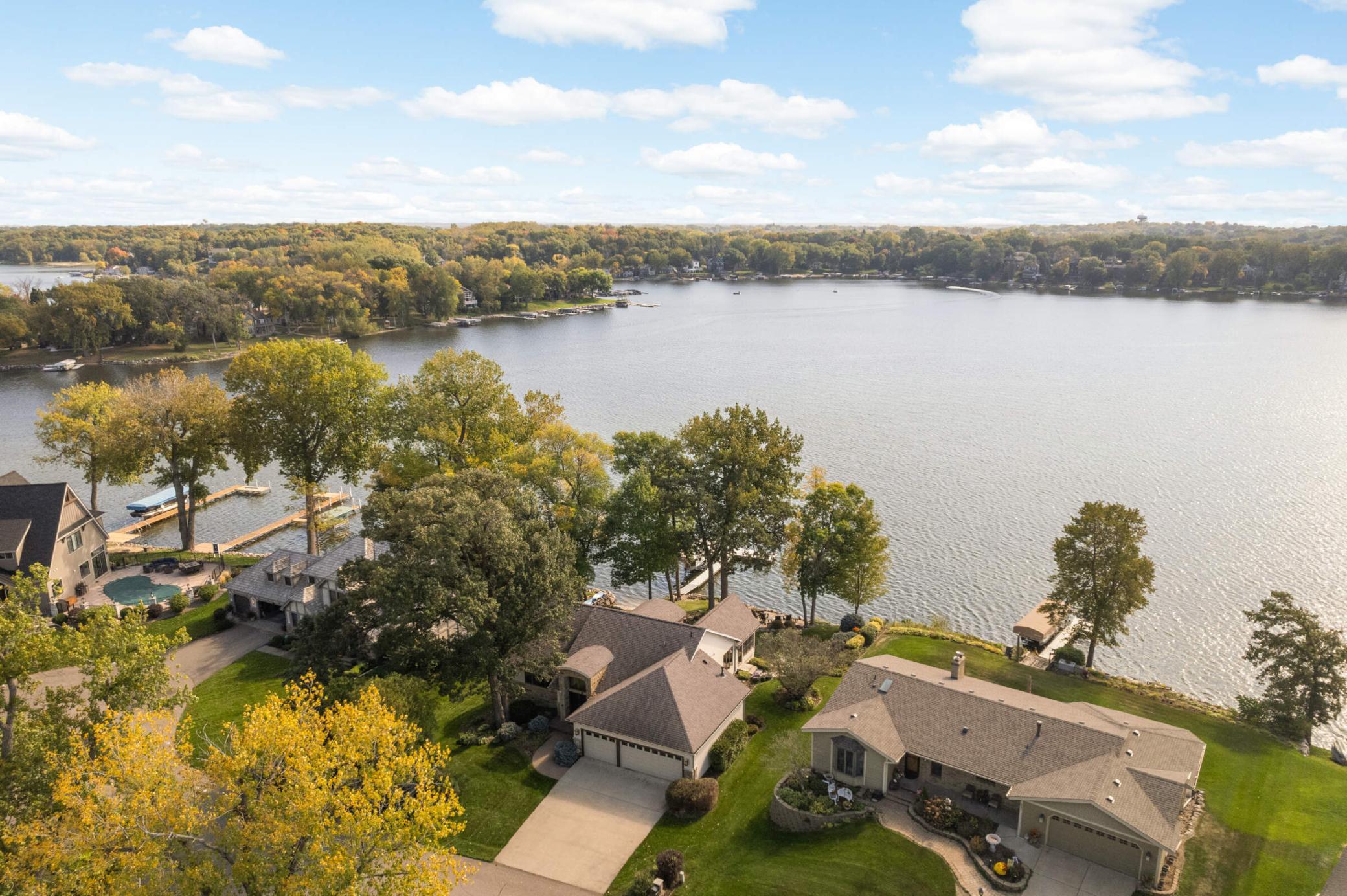 Set along 114 feet of flat shoreline on Prior Lake, this exceptional lakeside residence blends refined design, cutting-edge technology, and effortless indoor-outdoor living. Reimagined in 2012 with meticulous craftsmanship, the home welcomes you with rich walnut hardwood floors, expansive lakeside windows, and an open-concept layout designed to frame sweeping water views from nearly every main living space. At the heart of the home, the chef’s kitchen is both striking and functional—appointed with Sub-Zero, Wolf, and Viking appliances. The lakeside primary suite offers direct deck access, a spa-inspired bath with low-iron glass shower, and a custom walk-in closet. Just off the dining area, a beautifully finished three-season porch creates a seamless transition to the outdoors, opening to the expansive ipe wood deck and a stone staircase down to the backyard. Throughout the home, integrated smart technology offers control of lighting, security, climate, and whole-home audio—delivered through a premium sound system with DALI, GoldenEar, and Niles speakers indoors and out. The walkout lower level was designed for gathering and entertaining, featuring a custom bar, wine cellar, and built-in entertainment center, along with three additional bedrooms and a ¾ bath—providing generous space for family, guests, or a home office. Outdoor living is equally impressive. The expansive lakeside deck steps down to a stunning lower patio anchored by a covered stone outdoor kitchen and bar, multiple lounge areas, and a hot tub—creating the perfect setting for evenings by the water. A tiered patio at the shoreline invites fireside gatherings, while the sandy beach and flat backyard provide easy access to the lake and endless opportunities to enjoy the waterfront lifestyle. A temperature controlled garage, professional landscaping with strategically placed canopy lighting, and a convenient storage shed complete the property. All just minutes from shopping, dining, both downtown Minneapolis and Saint Paul, MSP International & Flying Cloud airports, Mystic Lake, Canterbury Park, and five world-class golf courses.