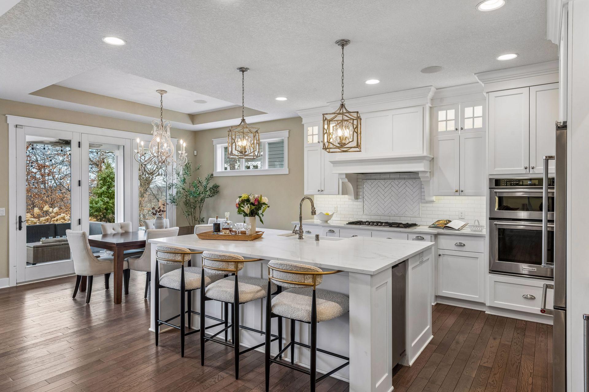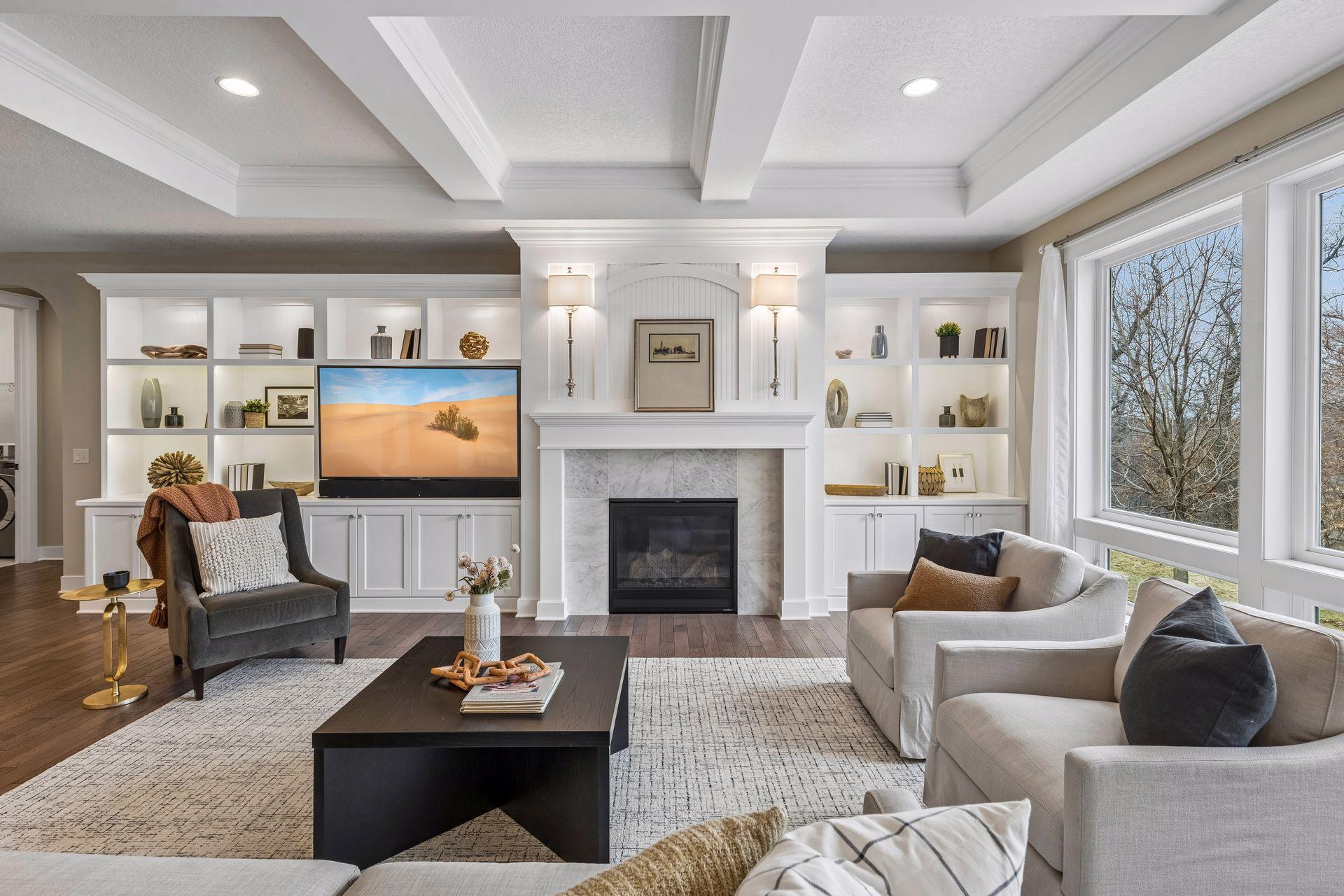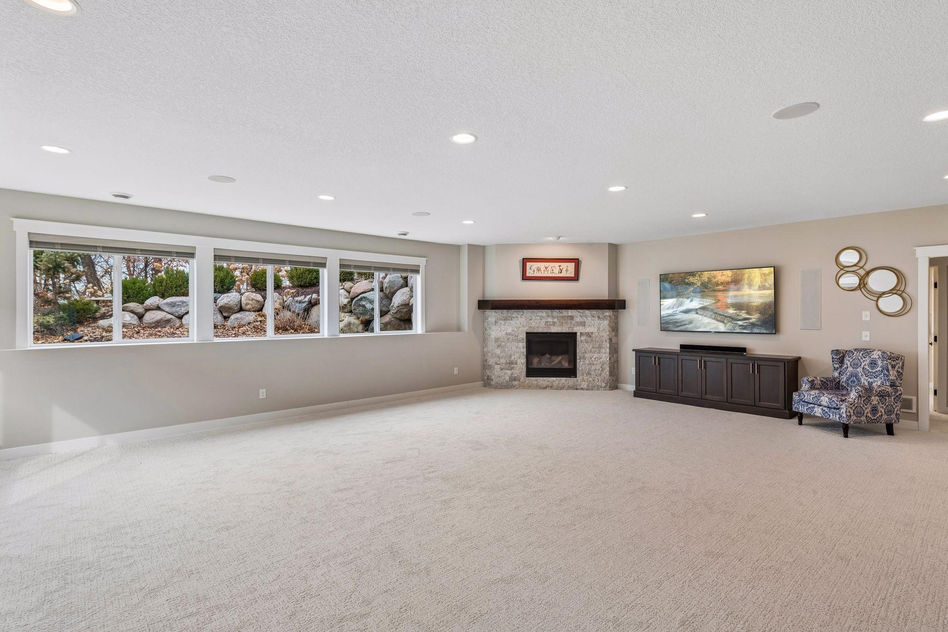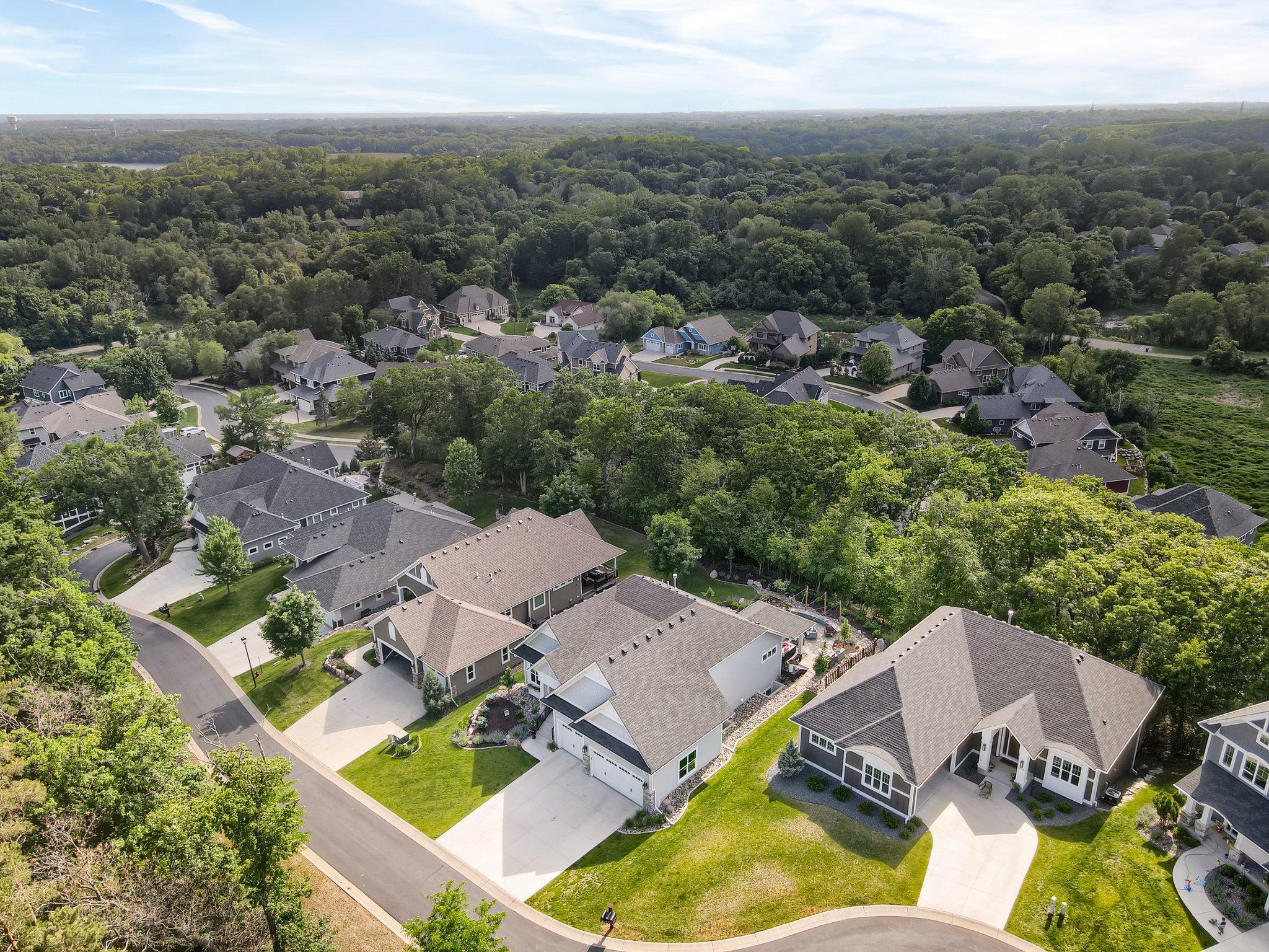 Set on the edge of a quiet cul-de-sac on a private road in The Enclave, this executive home blends refined finishes with a thoughtfully designed layout. The main level is filled with natural light from floor to ceiling windows that frame the living spaces, highlighting coffered ceilings, custom built-ins, and a gas fireplace. The kitchen is designed for both everyday living and entertaining with premium appliances, wine fridge, ice maker, custom cabinetry, a generous center island with seating, and a walk-in pantry. The main-floor primary suite offers a private retreat with a luxurious ensuite bath featuring a spa-like shower, separate sinks and vanity. A dedicated office and main-floor laundry add everyday convenience all on one level. The lower level provides an inviting family room with tall ceilings, fireplace, wet bar, surround sound speakers throughout, a large storage room and bright lookout windows. Extend your living space outdoors in the private and professionally landscaped yard with bluestone patio and covered deck. The heated three-car garage features epoxy flooring and a level driveway. Conveniently located near Hwy 62, 494, shopping, restaurants, and just 20 minutes from downtown,... you get the best of all worlds tucked within a quiet, exclusive neighborhood.