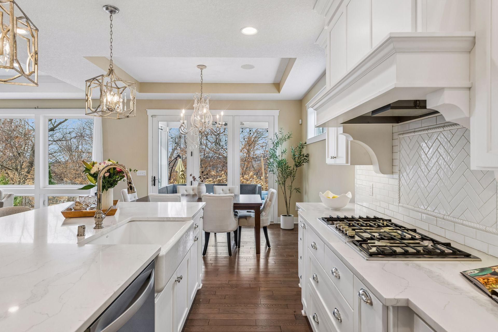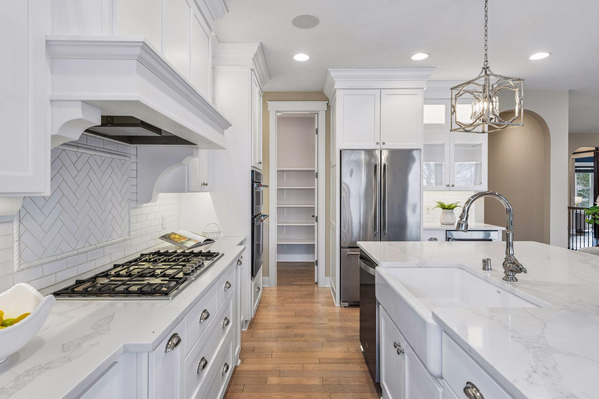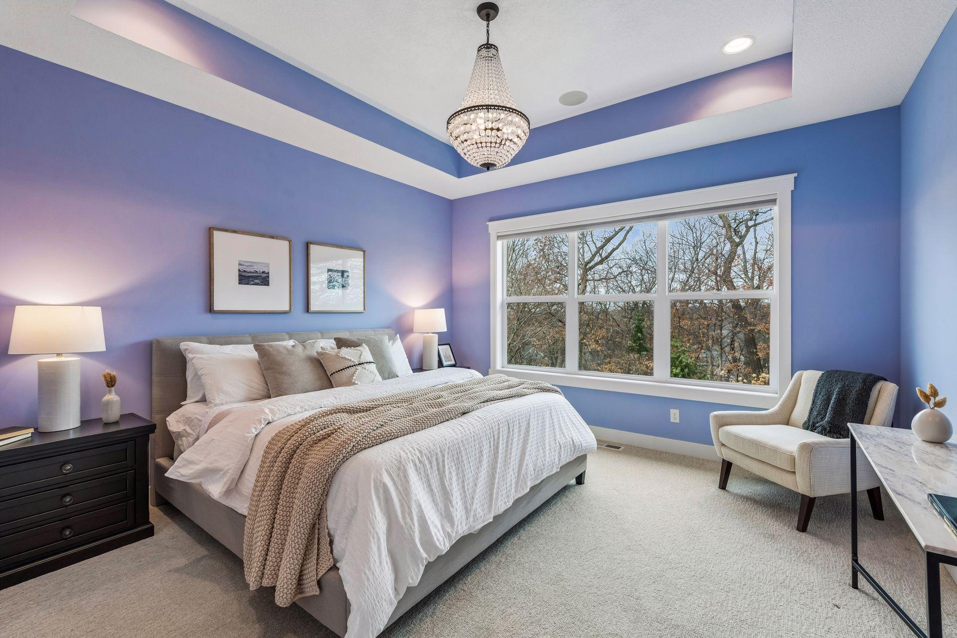 Set on the edge of a quiet cul-de-sac on a private road in The Enclave, this executive home blends refined finishes with a thoughtfully designed layout. The main level is filled with natural light from floor to ceiling windows that frame the living spaces, highlighting coffered ceilings, custom built-ins, and a gas fireplace. The kitchen is designed for both everyday living and entertaining with premium appliances, wine fridge, ice maker, custom cabinetry, a generous center island with seating, and a walk-in pantry. The main-floor primary suite offers a private retreat with a luxurious ensuite bath featuring a spa-like shower, separate sinks and vanity. A dedicated office and main-floor laundry add everyday convenience all on one level. The lower level provides an inviting family room with tall ceilings, fireplace, wet bar, surround sound speakers throughout, a large storage room and bright lookout windows. Extend your living space outdoors in the private and professionally landscaped yard with bluestone patio and covered deck. The heated three-car garage features epoxy flooring and a level driveway. Conveniently located near Hwy 62, 494, shopping, restaurants, and just 20 minutes from downtown,... you get the best of all worlds tucked within a quiet, exclusive neighborhood.