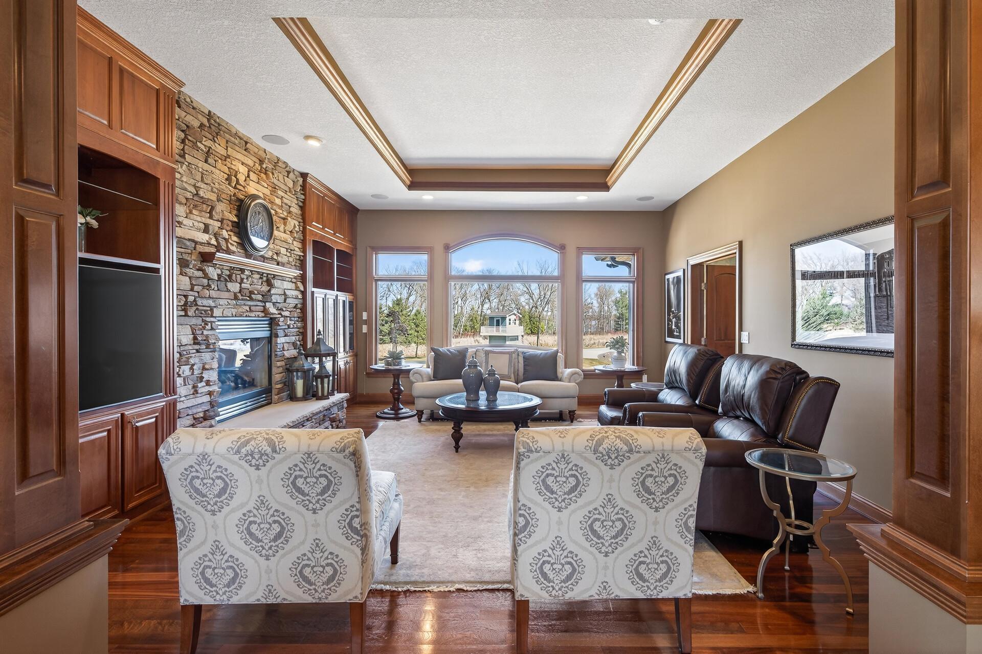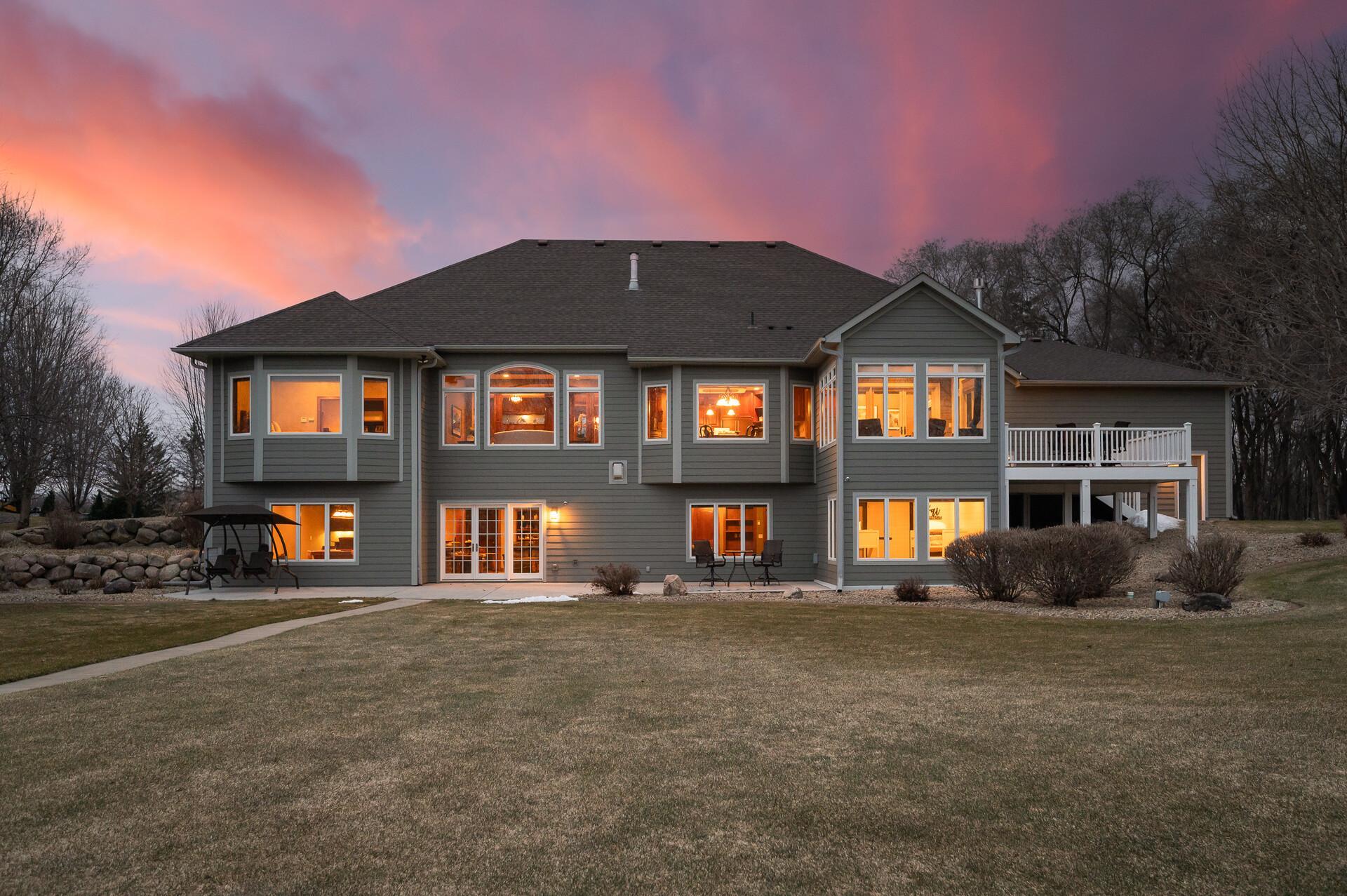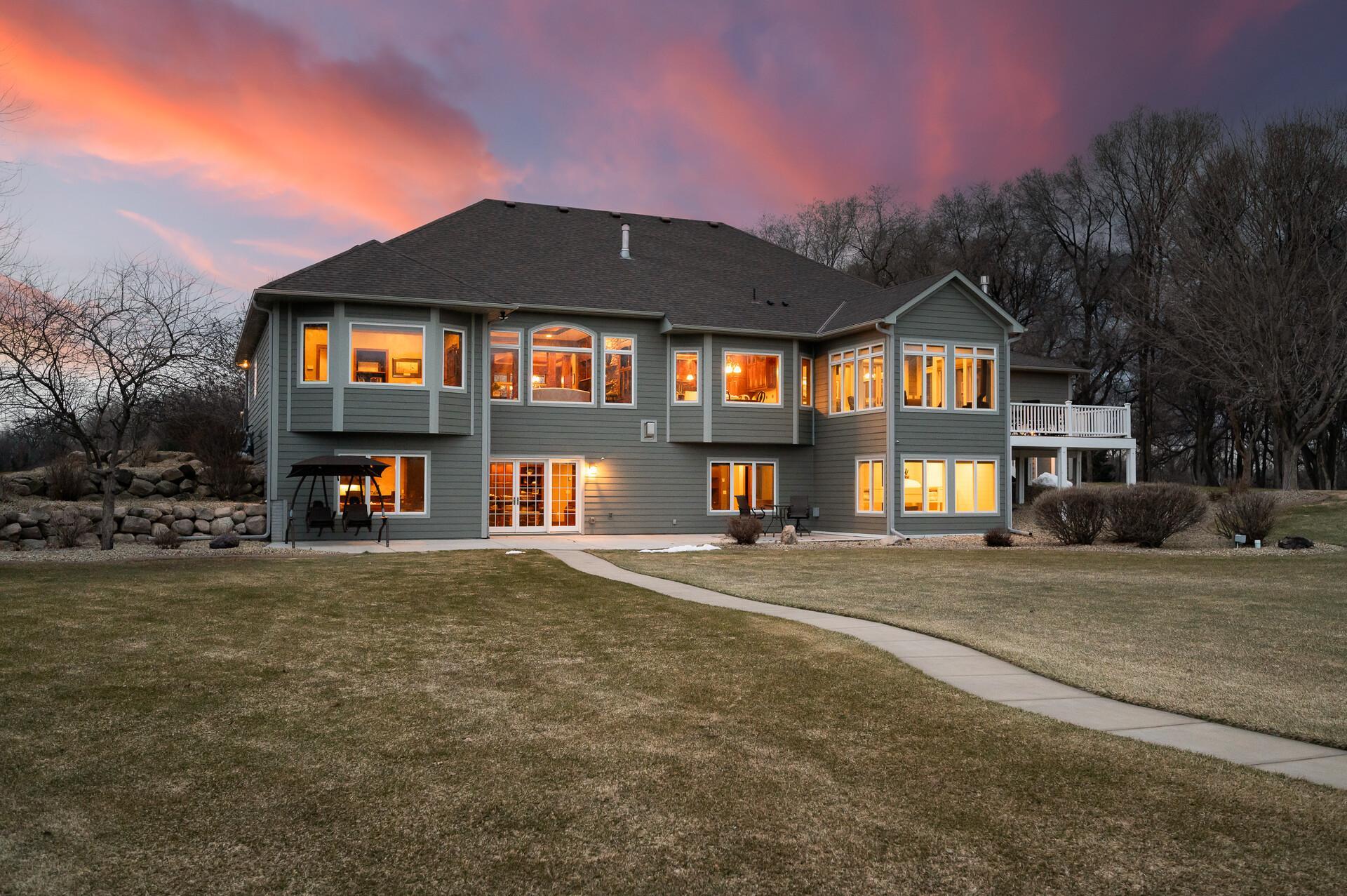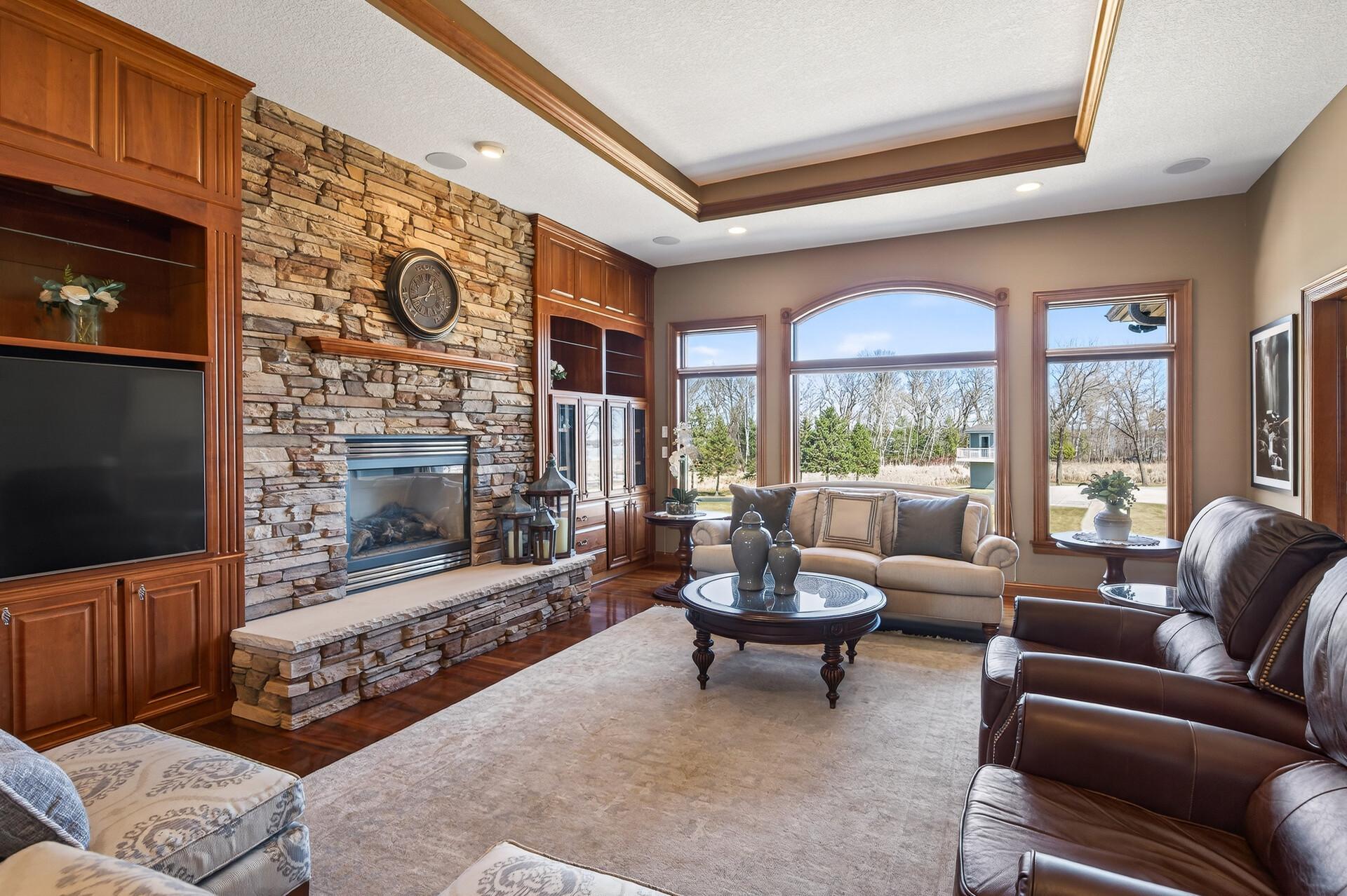 Take a look at this meticulously maintained custom rambler on Lake George nestled on a quiet cul-de-sac, this exceptional lake home offers stunning views, quality craftsmanship, and countless upgrades throughout. Enjoy true lake living with a sand beach, boat house, and beautifully landscaped setting. This fully finished home features 3 bedrooms and 4 bathrooms, with rich cherry wood cabinetry and suppeli wood flooring adding warmth and elegance throughout. The spacious primary suite overlooks the lake and includes dual sinks, a jetted tub, walk-in shower, and an oversized walk-in closet. The kitchen is beautifully appointed with bronze appliances and granite countertops throughout, offering both style and functionality. The main level also features a cozy living room with a brick-surround gas fireplace, a dedicated in-home office with built-ins, enjoy a relaxing sunroom with a vaulted cedar ceiling surrounded by windows attached to a a relaxing 4-season porch with a fireplace—perfect for enjoying peaceful sunrises and evening sunsets over the water. The lower level is designed for entertaining, featuring a large family room with a second gas fireplace, a full wet bar, a theater room with projector and reclining seating, a full bathroom with jetted tub, and an additional flex room ideal for a gym, playroom, or lounge. In-floor heat runs throughout the basement and both garages for year-round comfort. Car enthusiasts and hobbyists will love the oversized, heated, and insulated 4-car garage with epoxy flooring, plus an additional 22x30 attached garage/shop with a 12’ overhead door—perfect for storing a camper or recreational vehicles. Additional highlights include a newer 300’ asphalt driveway leading to the lake, complete with parking and utility hookups for campers. This home offers the perfect blend of luxury, comfort, and lakefront living—ideal for both everyday living and entertaining. Don’t miss this rare opportunity on Lake George!