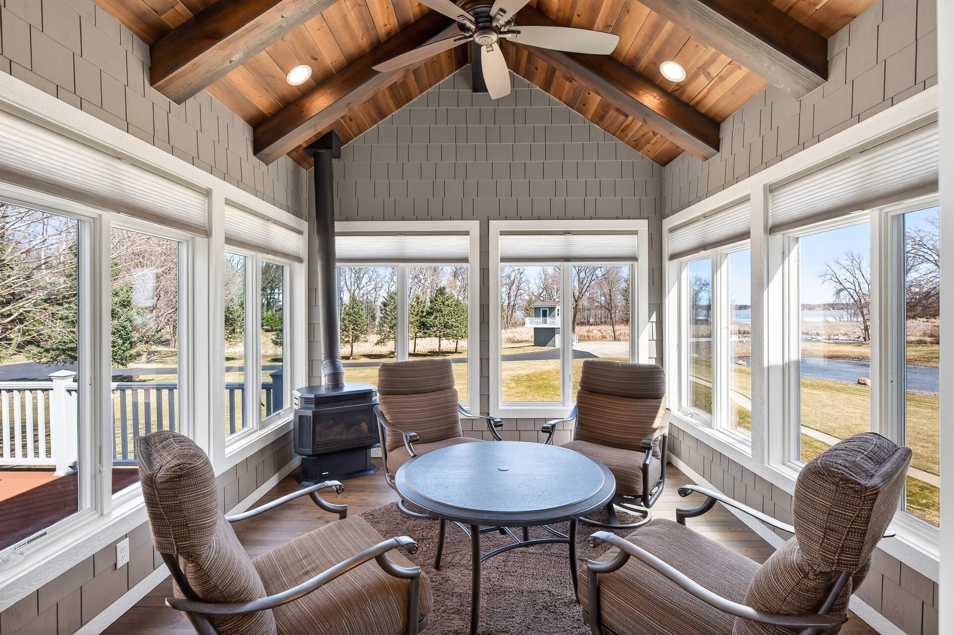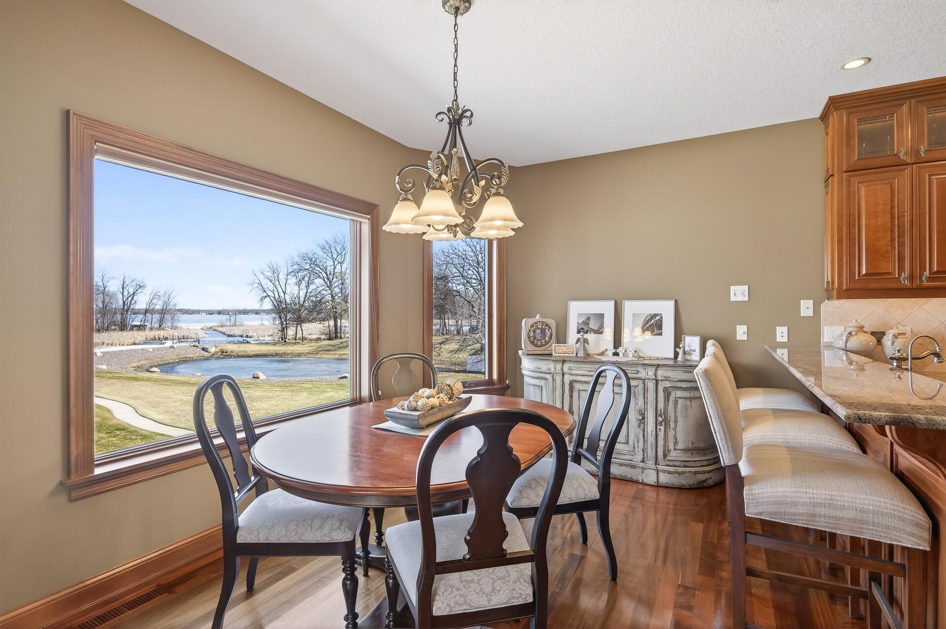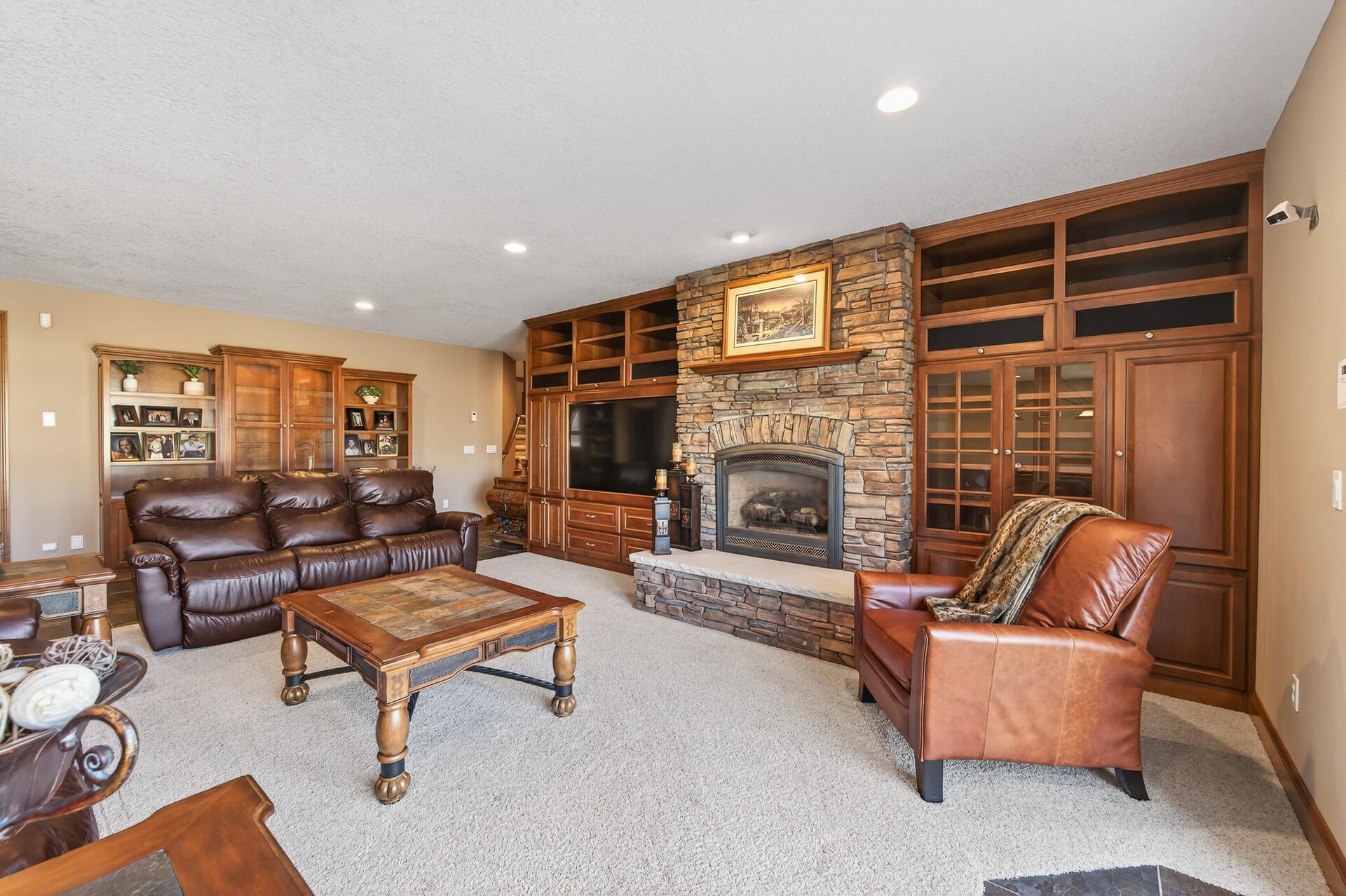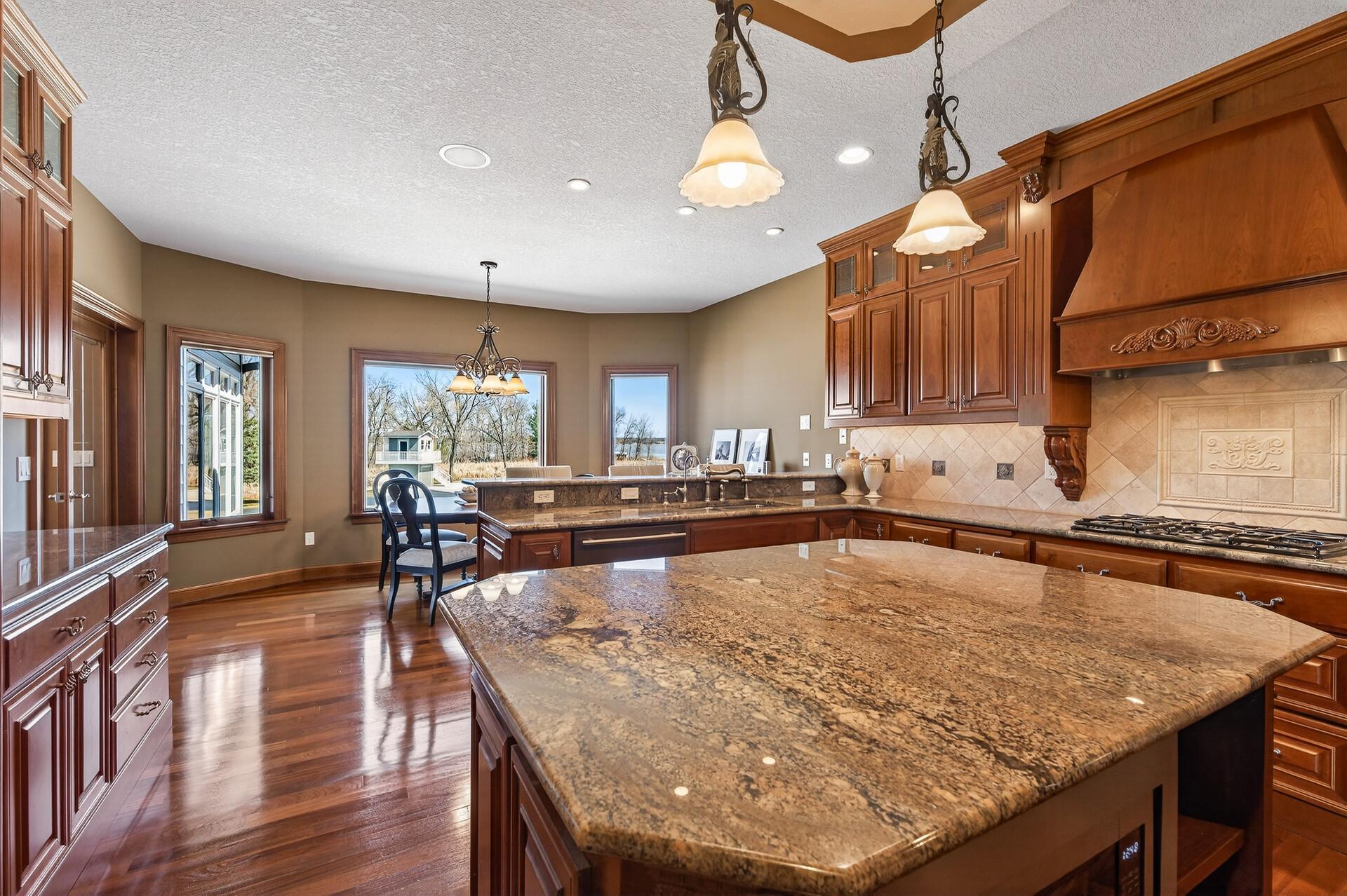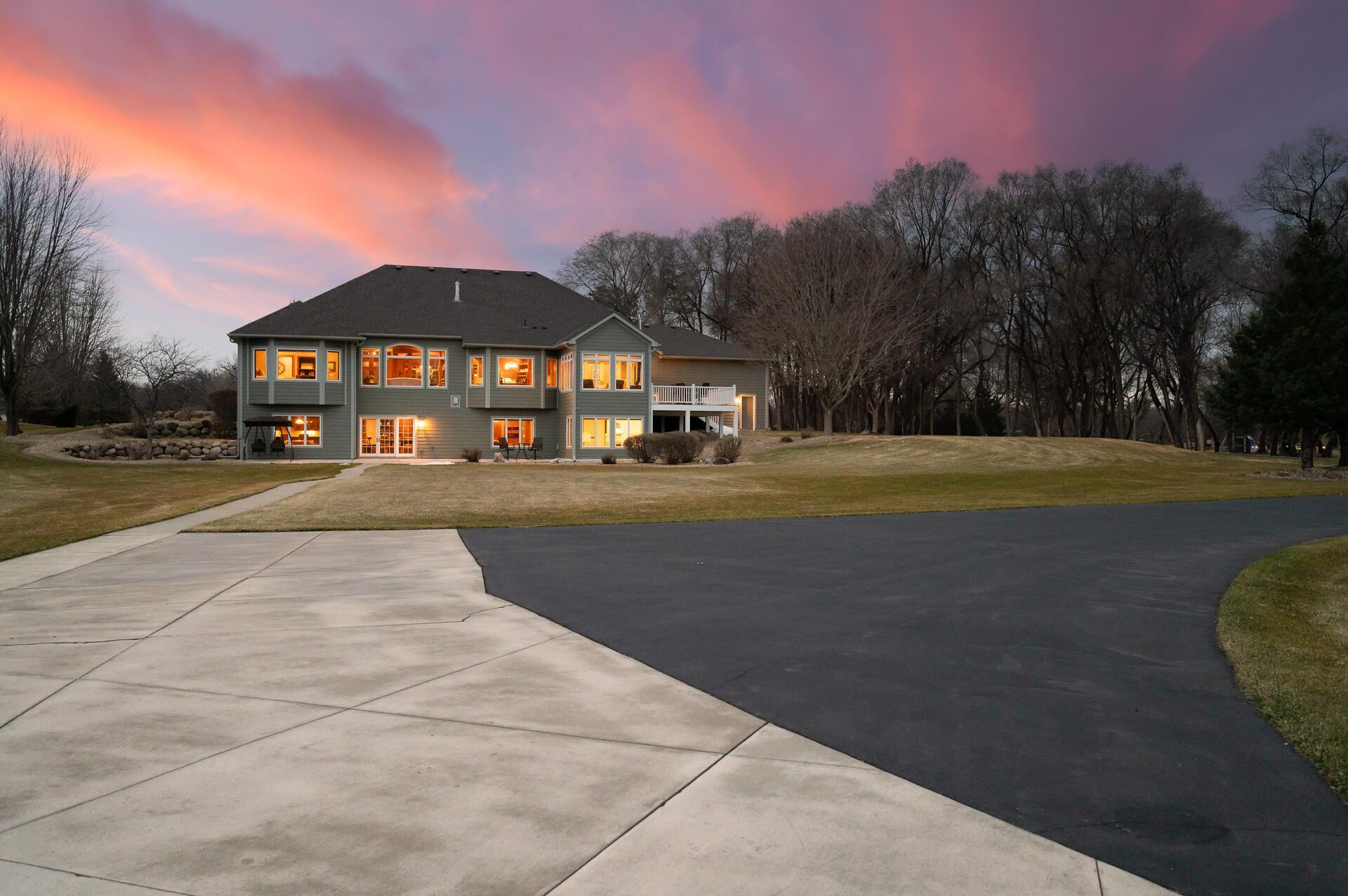Take a look at this meticulously maintained custom rambler on Lake George nestled on a quiet cul-de-sac, this exceptional lake home offers stunning views, quality craftsmanship, and countless upgrades throughout. Enjoy true lake living with a sand beach, boat house, and beautifully landscaped setting. This fully finished home features 3 bedrooms and 4 bathrooms, with rich cherry wood cabinetry and suppeli wood flooring adding warmth and elegance throughout. The spacious primary suite overlooks the lake and includes dual sinks, a jetted tub, walk-in shower, and an oversized walk-in closet. The kitchen is beautifully appointed with bronze appliances and granite countertops throughout, offering both style and functionality. The main level also features a cozy living room with a brick-surround gas fireplace, a dedicated in-home office with built-ins, enjoy a relaxing sunroom with a vaulted cedar ceiling surrounded by windows attached to a a relaxing 4-season porch with a fireplace—perfect for enjoying peaceful sunrises and evening sunsets over the water. The lower level is designed for entertaining, featuring a large family room with a second gas fireplace, a full wet bar, a theater room with projector and reclining seating, a full bathroom with jetted tub, and an additional flex room ideal for a gym, playroom, or lounge. In-floor heat runs throughout the basement and both garages for year-round comfort. Car enthusiasts and hobbyists will love the oversized, heated, and insulated 4-car garage with epoxy flooring, plus an additional 22x30 attached garage/shop with a 12’ overhead door—perfect for storing a camper or recreational vehicles. Additional highlights include a newer 300’ asphalt driveway leading to the lake, complete with parking and utility hookups for campers. This home offers the perfect blend of luxury, comfort, and lakefront living—ideal for both everyday living and entertaining. Don’t miss this rare opportunity on Lake George!
