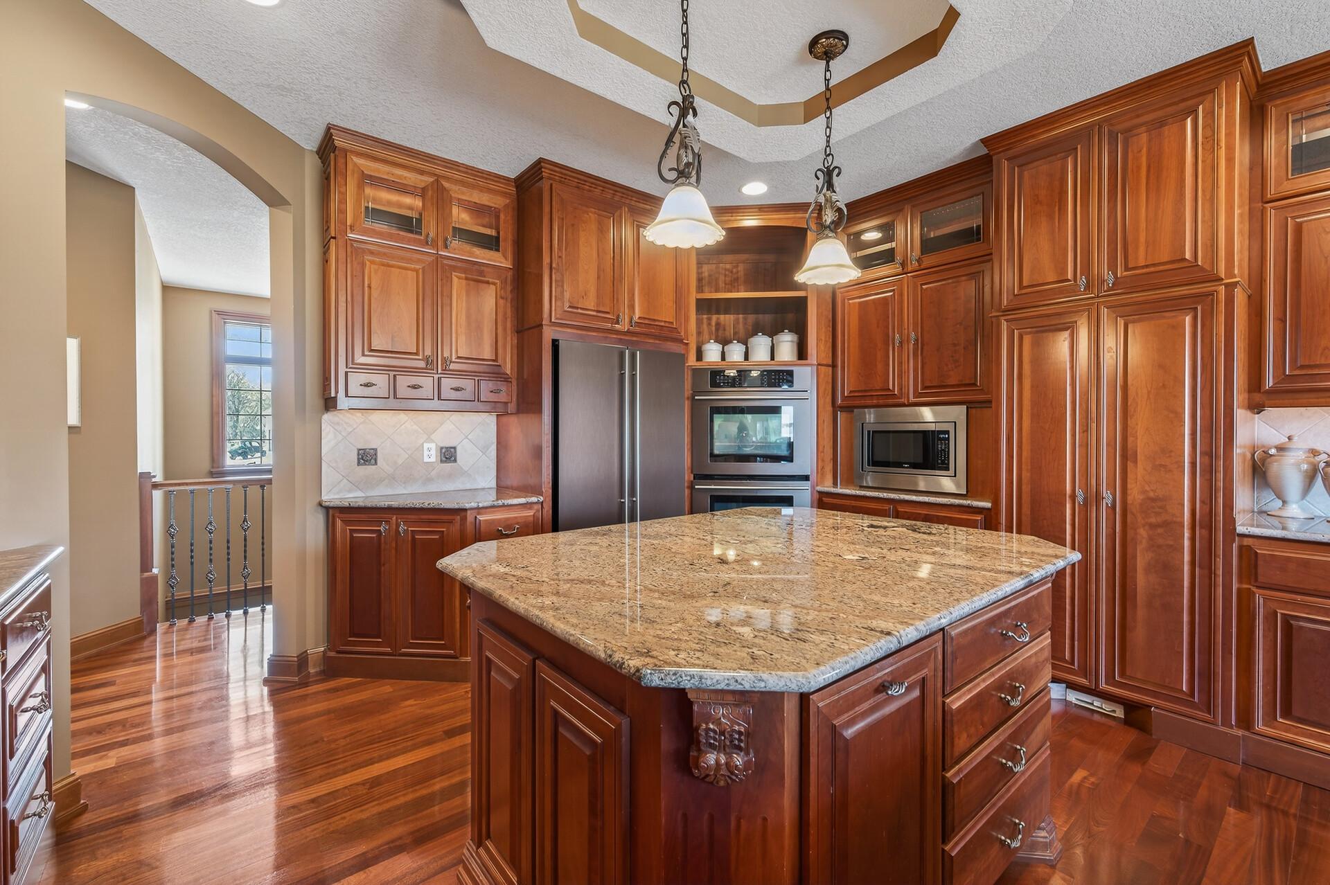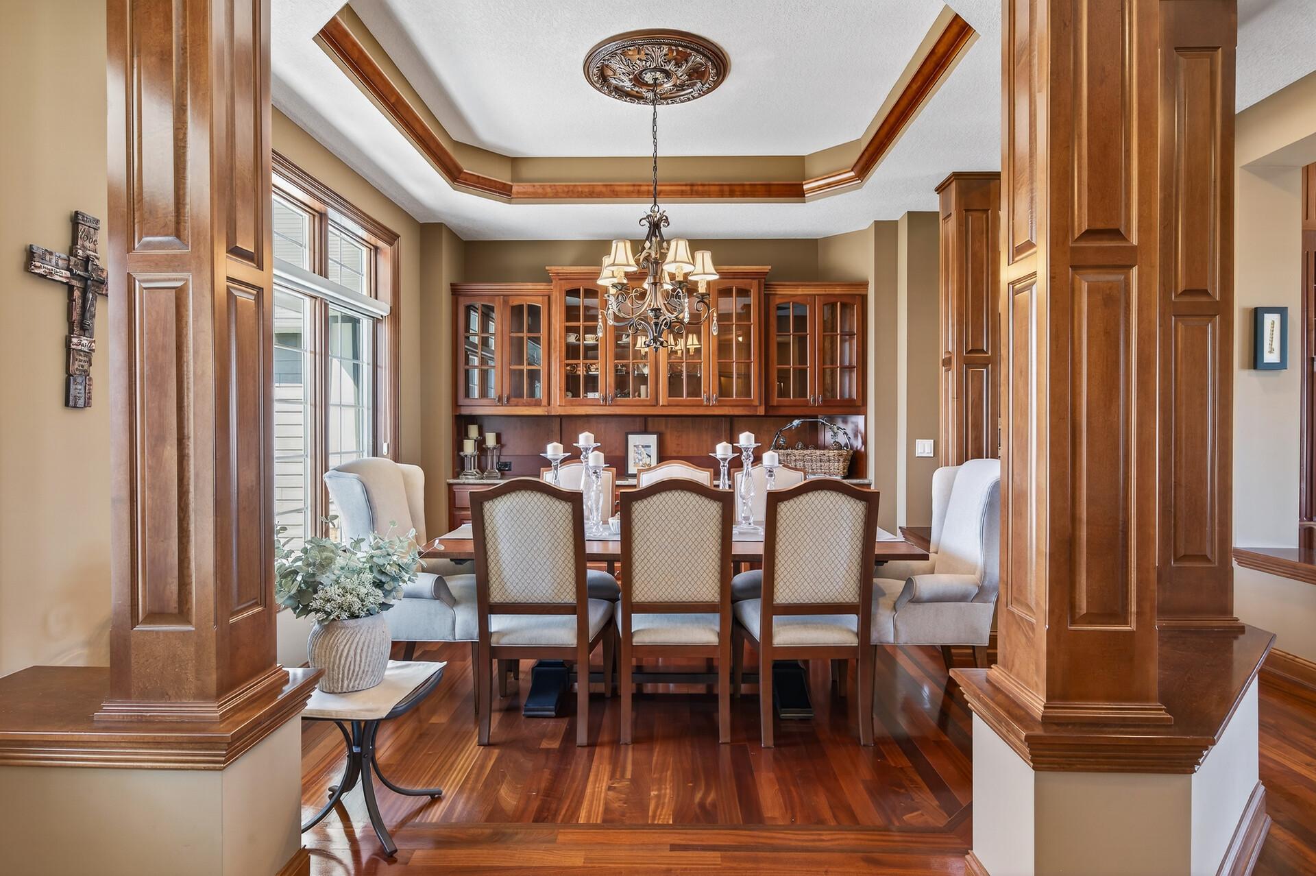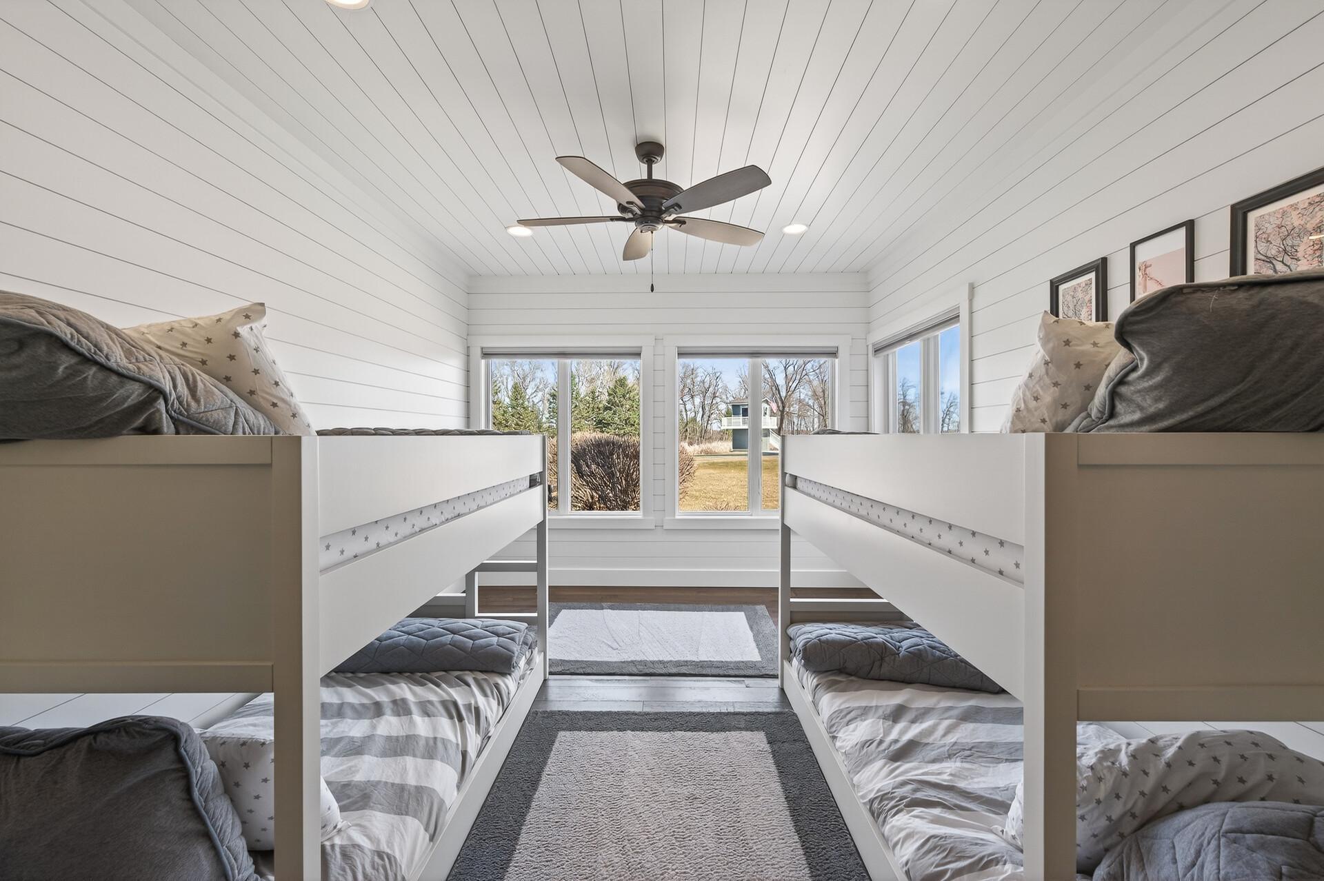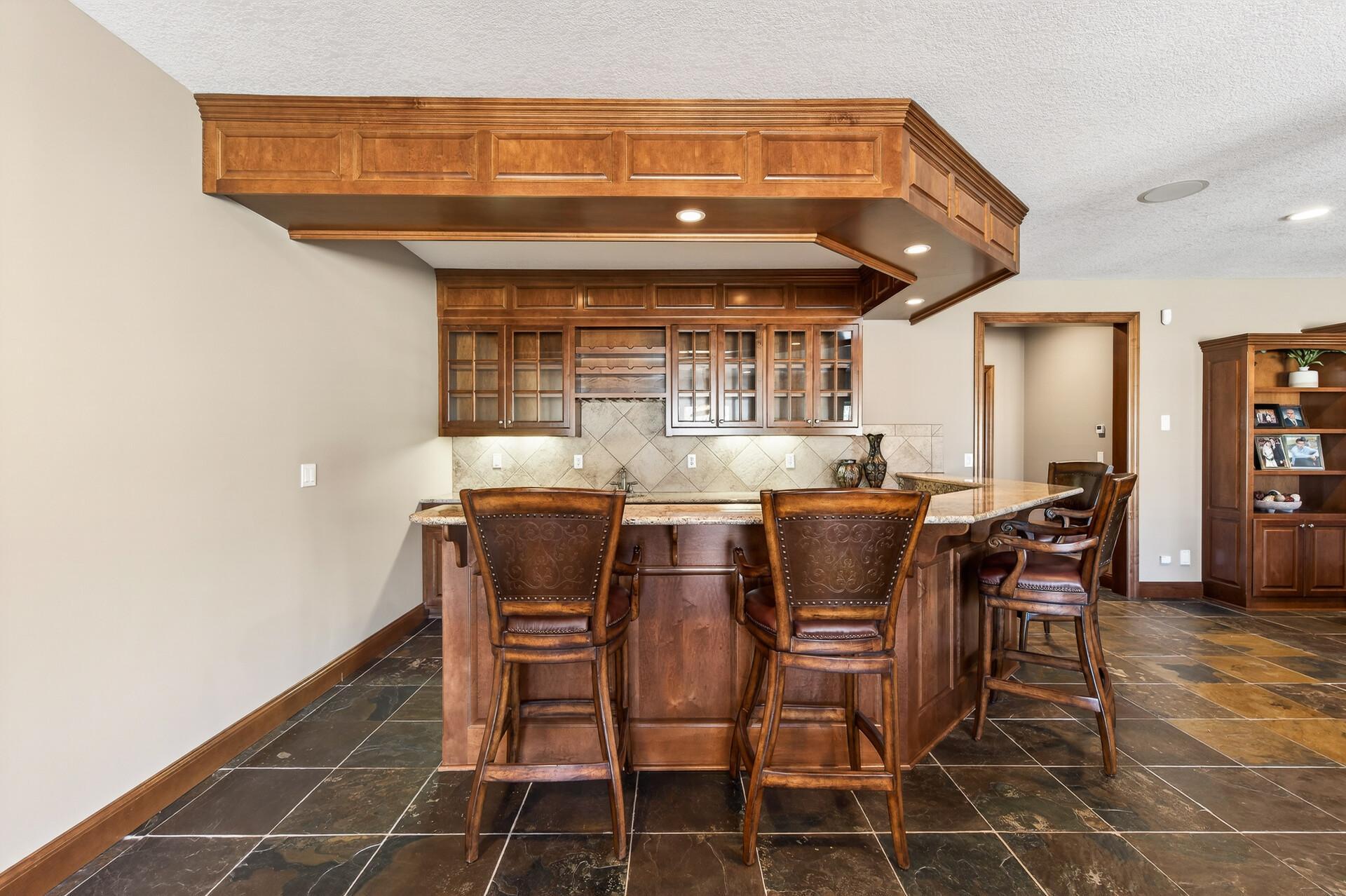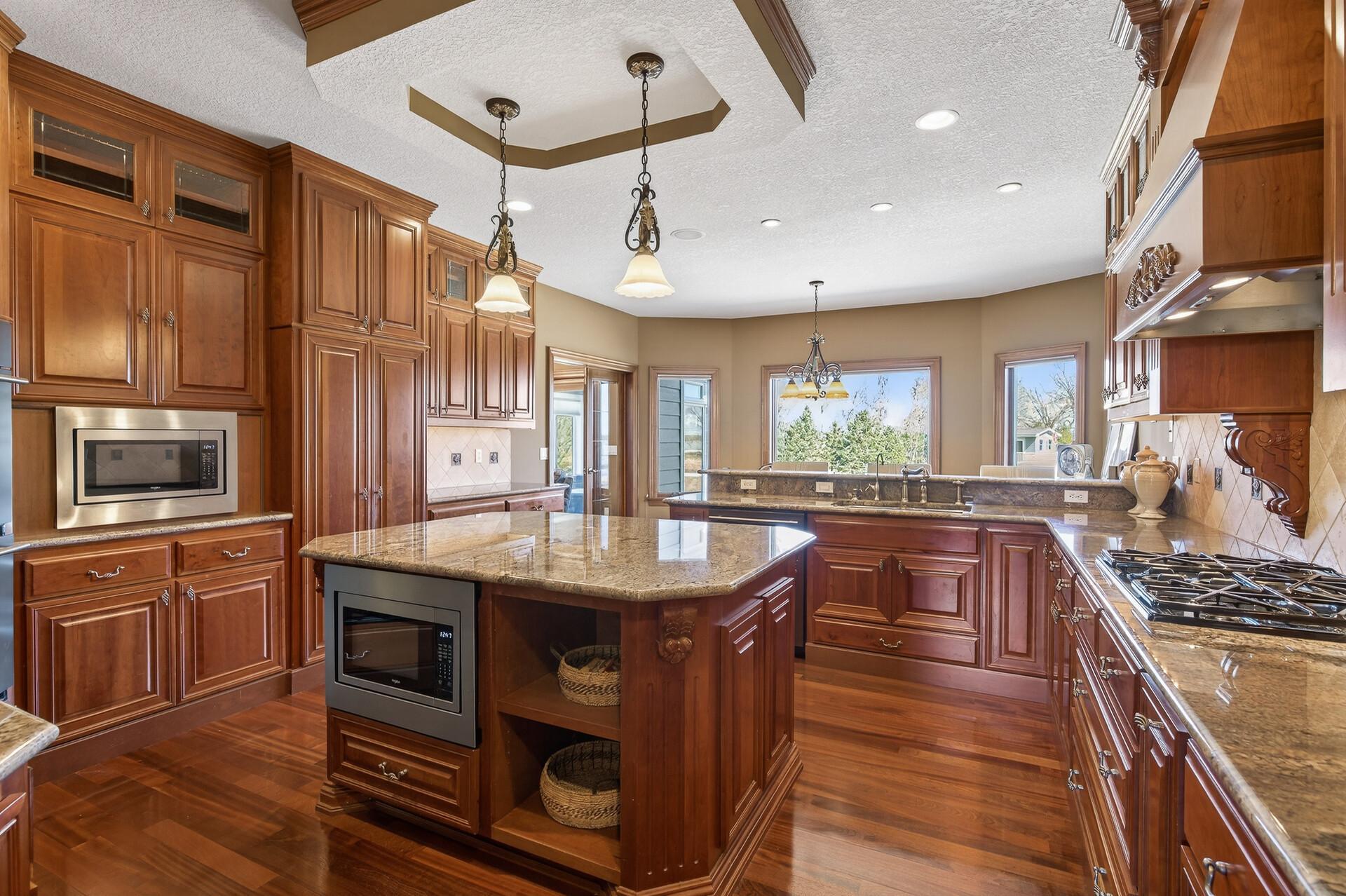 Take a look at this meticulously maintained custom rambler on Lake George nestled on a quiet cul-de-sac, this exceptional lake home offers stunning views, quality craftsmanship, and countless upgrades throughout. Enjoy true lake living with a sand beach, boat house, and beautifully landscaped setting. This fully finished home features 3 bedrooms and 4 bathrooms, with rich cherry wood cabinetry and suppeli wood flooring adding warmth and elegance throughout. The spacious primary suite overlooks the lake and includes dual sinks, a jetted tub, walk-in shower, and an oversized walk-in closet. The kitchen is beautifully appointed with bronze appliances and granite countertops throughout, offering both style and functionality. The main level also features a cozy living room with a brick-surround gas fireplace, a dedicated in-home office with built-ins, enjoy a relaxing sunroom with a vaulted cedar ceiling surrounded by windows attached to a a relaxing 4-season porch with a fireplace—perfect for enjoying peaceful sunrises and evening sunsets over the water. The lower level is designed for entertaining, featuring a large family room with a second gas fireplace, a full wet bar, a theater room with projector and reclining seating, a full bathroom with jetted tub, and an additional flex room ideal for a gym, playroom, or lounge. In-floor heat runs throughout the basement and both garages for year-round comfort. Car enthusiasts and hobbyists will love the oversized, heated, and insulated 4-car garage with epoxy flooring, plus an additional 22x30 attached garage/shop with a 12’ overhead door—perfect for storing a camper or recreational vehicles. Additional highlights include a newer 300’ asphalt driveway leading to the lake, complete with parking and utility hookups for campers. This home offers the perfect blend of luxury, comfort, and lakefront living—ideal for both everyday living and entertaining. Don’t miss this rare opportunity on Lake George!