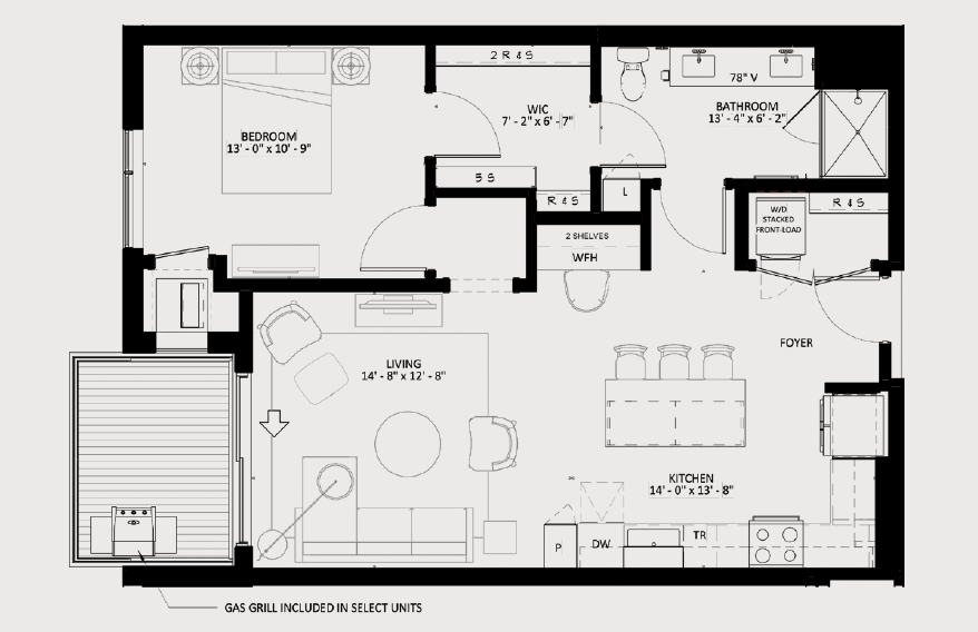 Welcome to The Winn! This spacious 1-bedroom residence offers 908 square feet of thoughtfully designed living space with an open layout ideal for both everyday living and working from home. The Bassett features a chef-inspired kitchen with island, a dedicated work-from-home tech center with smart outlets, and a custom-designed walk-thru closet connecting the bedroom and bathroom. Select homes include a private inset balcony with gas grill. The bathroom features backlit mirrors and tile flooring for a clean, modern finish.
