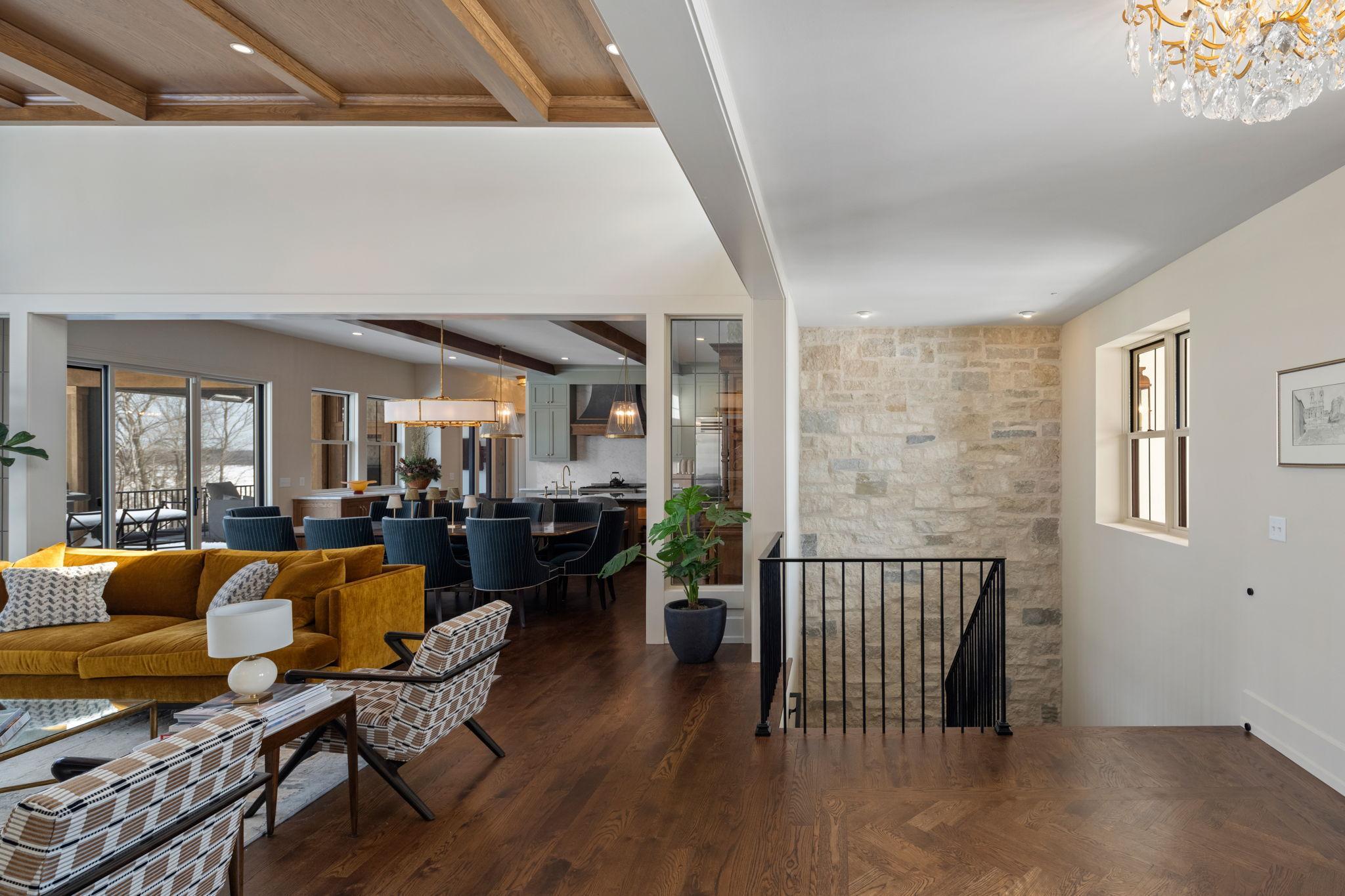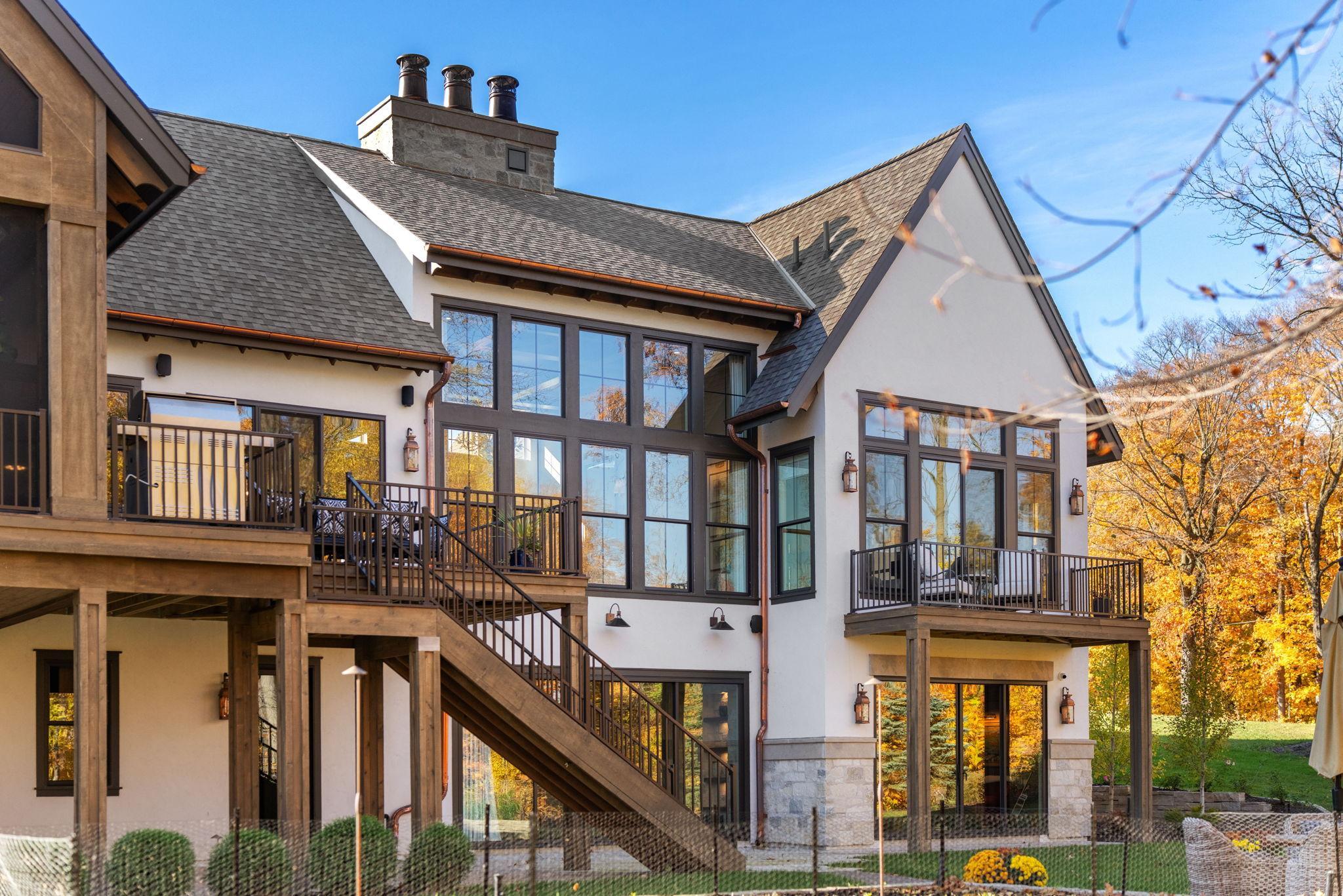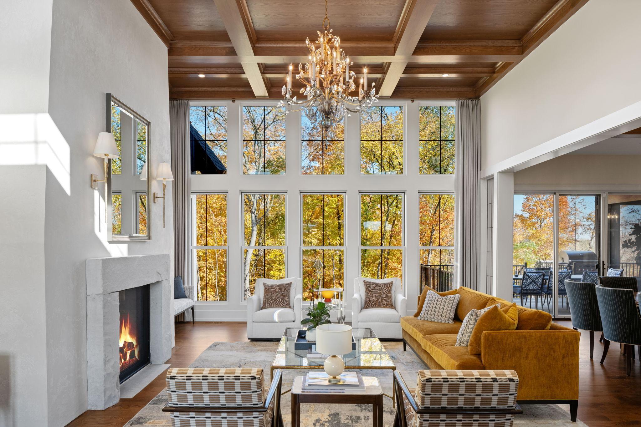 A true statement in architectural design, the home's exterior blends refined materials and clean lines to create a bold and elegant presence. The inspiring great room showcases detailed coffered ceilings with rich woodwork setting the stage, complimented by a statement chandelier and expansive floor-to-ceiling windows that flood the space with natural light. The stone fireplace serves as a warm focal point, creating an inviting atmosphere perfect for both everyday living and entertaining. Where design meets function- the kitchen is built to gather. An expansive island invites conversation, while layered textures- from the stone wall to the custom cabinetry and warm wood beams- create a space that is elevated yet engaging. A well-appointed scullery is a hidden surprise. The primary suite is expansive, with no expense spared, featuring floor-to-ceiling windows and a gas fireplace in the bedroom, a spa-like bath with rich marble and soaking tub as the focal point surrounded by serene natural views, in-unit laundry, and an oversized custom closet designed to accommodate even the most extensive wardrobe. Exceptional three season porch featuring a dramatic vaulted wood ceiling, statement chandelier, infrared heating system, and a full-height stone fireplace. Additional amenities elevate the home's lifestyle appeal, including a fully equipped lower level with wet bar, golf simulator, home gym, and dedicated massage area, complemented by a custom wine room, outdoor hot tub, raised stone vegetable garden, and a charming potting shed. Located within the award winning Orono school district.