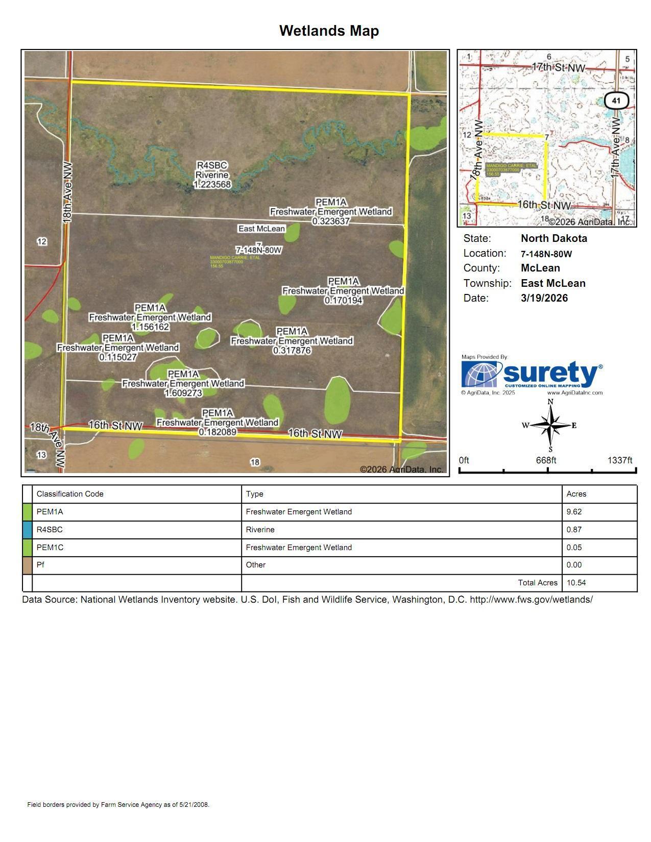 FSA records identify Tract 4811 as containing 322.94 farmland acres, 172.47 cropland acres, and 172.47 DCP cropland acres. The DCP crop data for Tract 4811 includes 6.10 base acres of wheat with a PLC yield of 27 and 15.40 base acres of oats with a PLC yield of 44, for a total of 21.50 base acres. This tract is also noted by FSA as containing a wetland or farmed wetland, adding to the strong habitat mix found throughout the property. Any mineral rights owned by sellers are retained by sellers