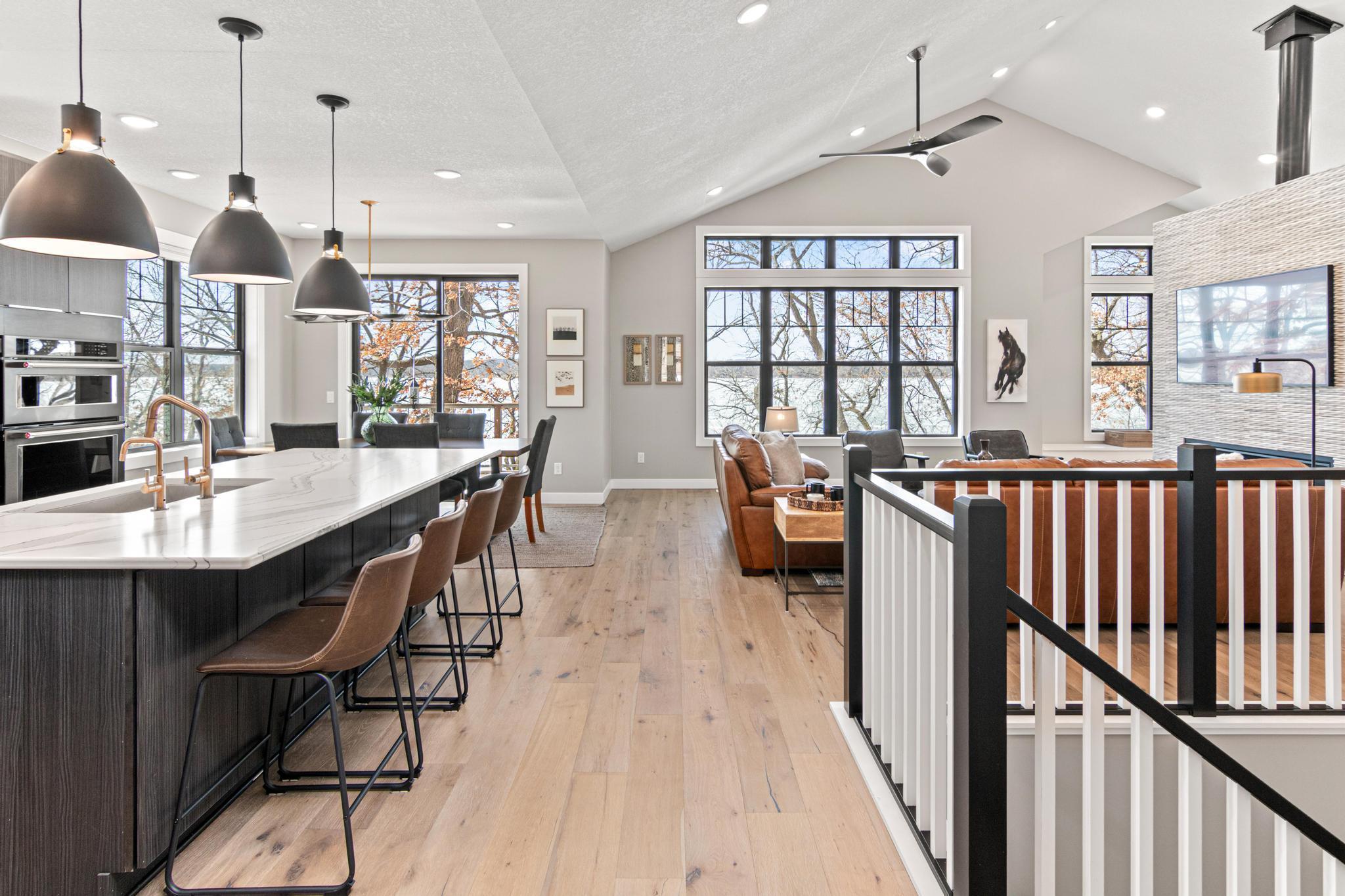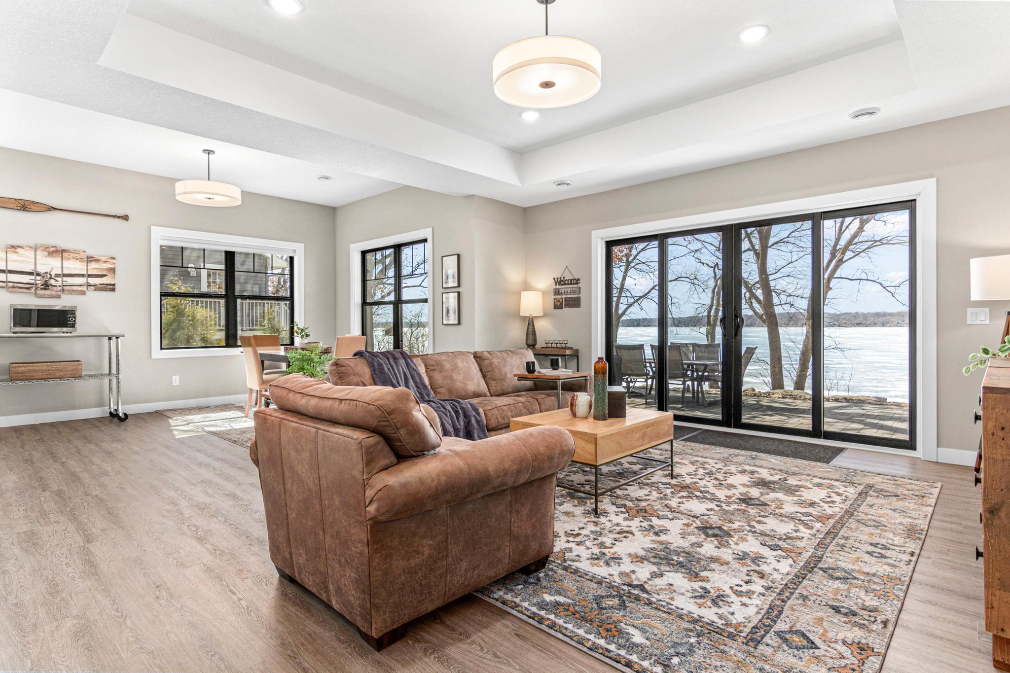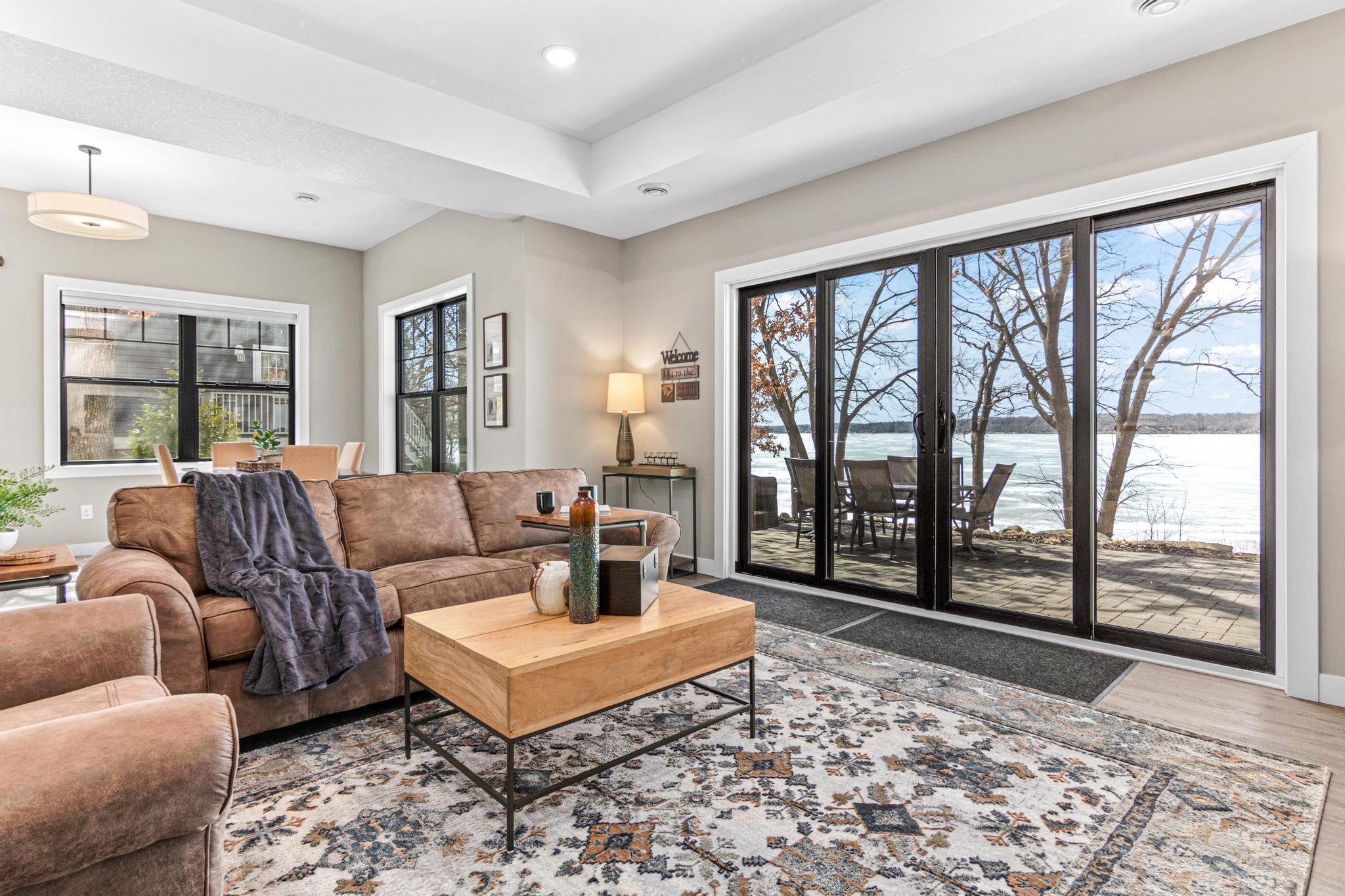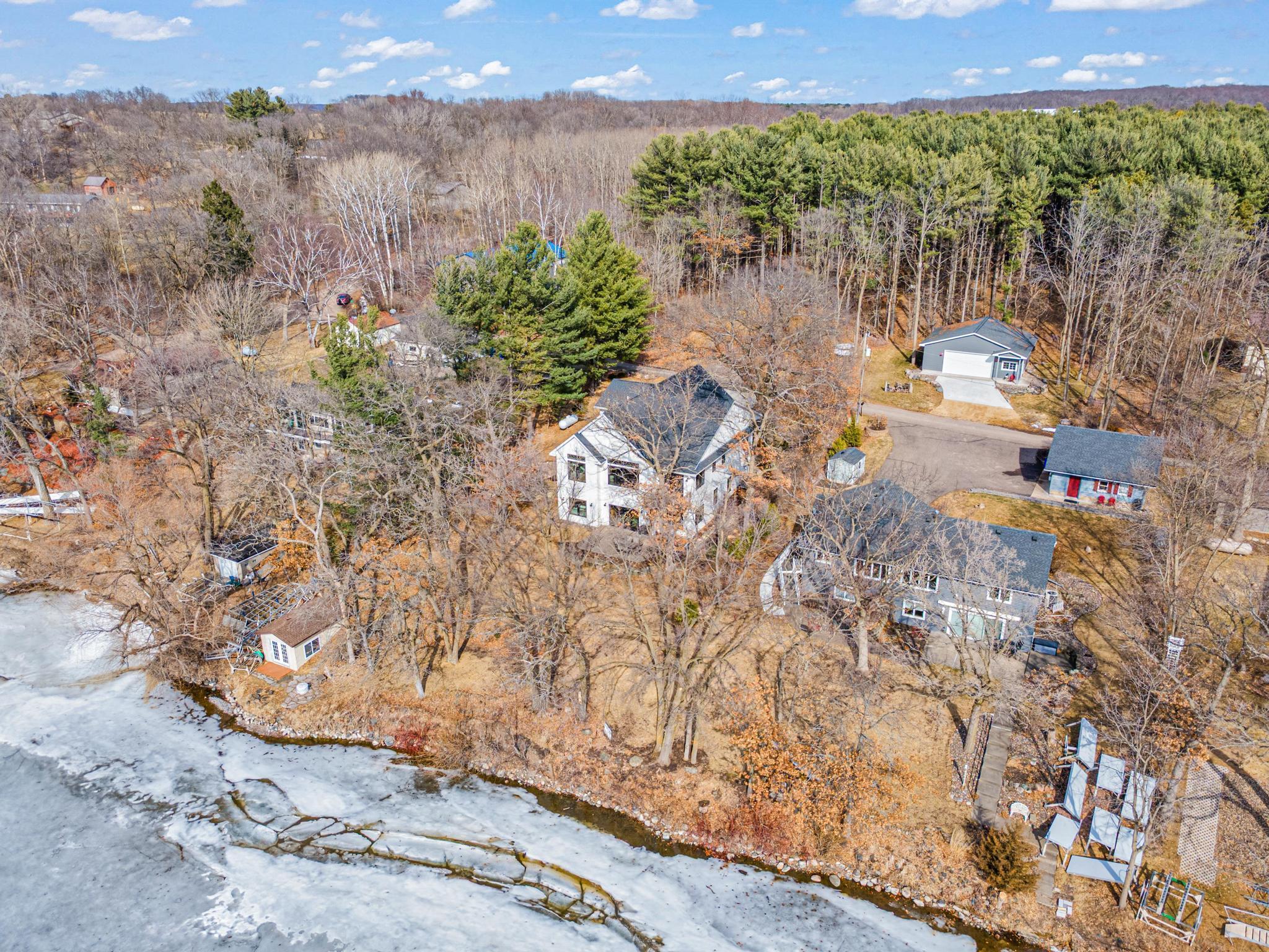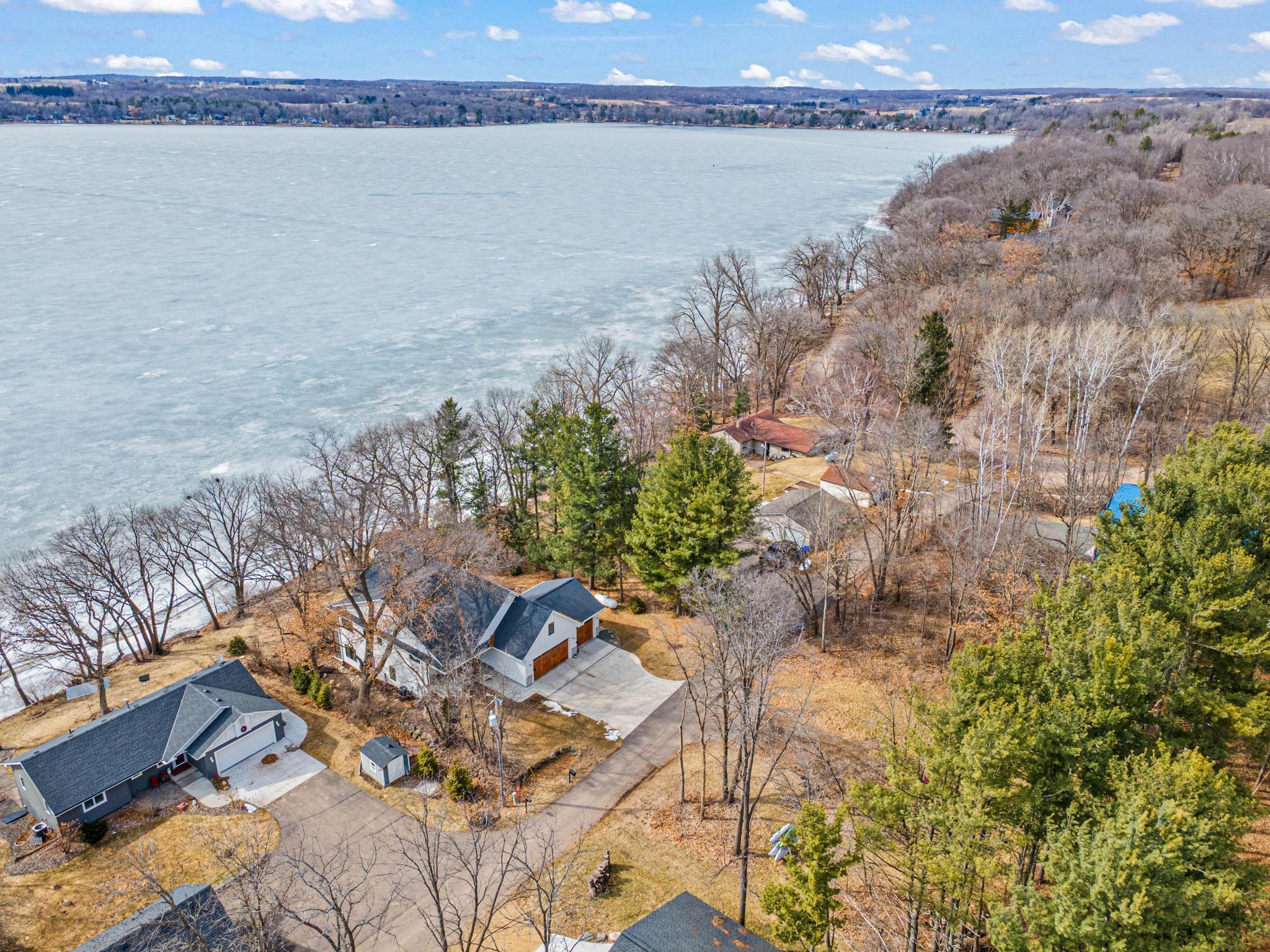 Welcome to an exceptional lakeshore retreat on Cedar Lake just minutes from the Twin Cities! This opportunity offers nearly 1 acre of beautifully positioned land and 100+ feet of prime frontage with breathtaking panoramic views. A beautiful fieldstone patio by the lake with a fire pit creates the perfect setting to relax, entertain, and take in the stunning surroundings. This thoughtfully designed home blends modern finishes with a warm, inviting feel—perfect for both everyday living and entertaining. Step inside to an open-concept main level highlighted by vaulted ceilings, expansive windows, and stunning 180 degree lake views that flood the home with natural light. The spacious living area centers around a sleek fireplace, creating a comfortable gathering space year-round. The gourmet kitchen features a large center island, custom cabinetry, and high-end finishes—ideal for hosting and everyday functionality. The main level offers a desirable layout with multiple bedrooms and a private primary suite, providing comfort and convenience with all living facilities on one level. The walkout lower level expands your living space with a large family room, wet bar area, additional bedrooms, and is enhanced by radiant in-floor heating, delivering consistent comfort throughout the colder months. Outdoor living is where this property truly shines. Enjoy peaceful mornings and unforgettable sunsets from the patio overlooking the water. The property features a spacious boathouse, making lake life effortless, along with gradual elevation to the shoreline and excellent water clarity—ideal for swimming, boating, and recreation. The heated and attached three car garage will keep your cars toasty in the winter and the additional land across the road is the perfect spot to build an additional garage or outbuilding. Great opportunity to combine lakeshore living with modern amenities!