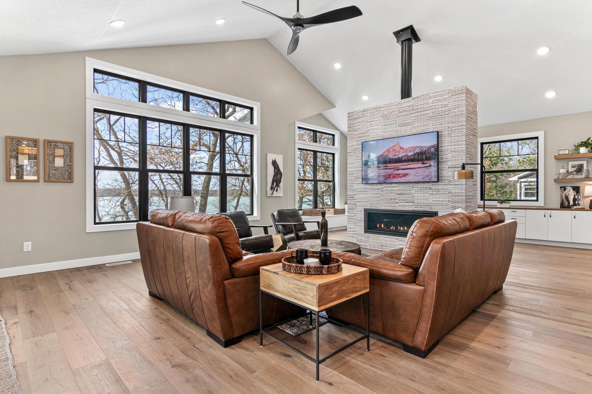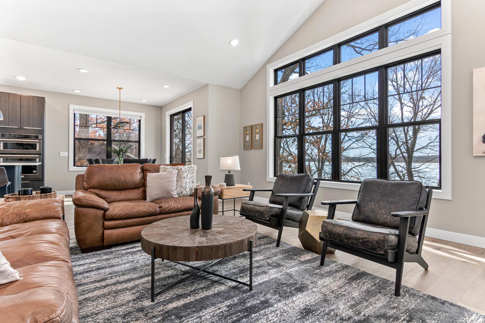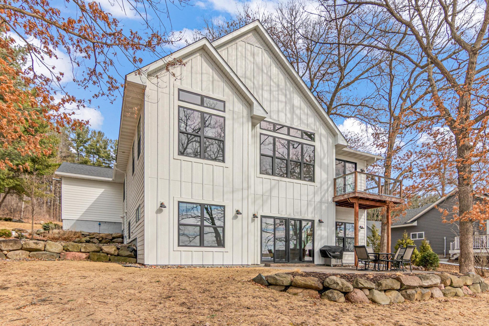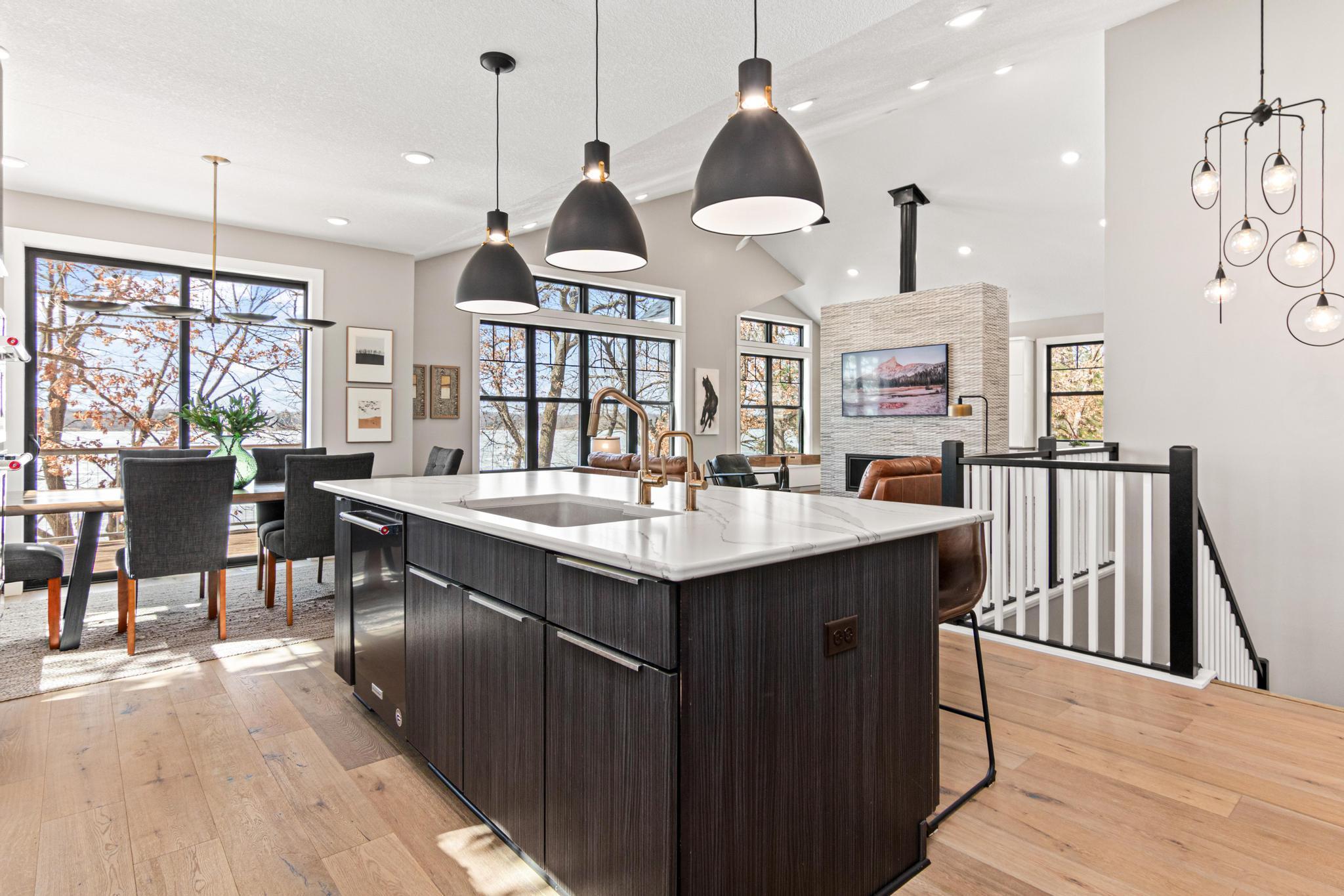 Welcome to an exceptional lakeshore retreat on Cedar Lake just minutes from the Twin Cities! This opportunity offers nearly 1 acre of beautifully positioned land and 100+ feet of prime frontage with breathtaking panoramic views. A beautiful fieldstone patio by the lake with a fire pit creates the perfect setting to relax, entertain, and take in the stunning surroundings. This thoughtfully designed home blends modern finishes with a warm, inviting feel—perfect for both everyday living and entertaining. Step inside to an open-concept main level highlighted by vaulted ceilings, expansive windows, and stunning 180 degree lake views that flood the home with natural light. The spacious living area centers around a sleek fireplace, creating a comfortable gathering space year-round. The gourmet kitchen features a large center island, custom cabinetry, and high-end finishes—ideal for hosting and everyday functionality. The main level offers a desirable layout with multiple bedrooms and a private primary suite, providing comfort and convenience with all living facilities on one level. The walkout lower level expands your living space with a large family room, wet bar area, additional bedrooms, and is enhanced by radiant in-floor heating, delivering consistent comfort throughout the colder months. Outdoor living is where this property truly shines. Enjoy peaceful mornings and unforgettable sunsets from the patio overlooking the water. The property features a spacious boathouse, making lake life effortless, along with gradual elevation to the shoreline and excellent water clarity—ideal for swimming, boating, and recreation. The heated and attached three car garage will keep your cars toasty in the winter and the additional land across the road is the perfect spot to build an additional garage or outbuilding. Great opportunity to combine lakeshore living with modern amenities!