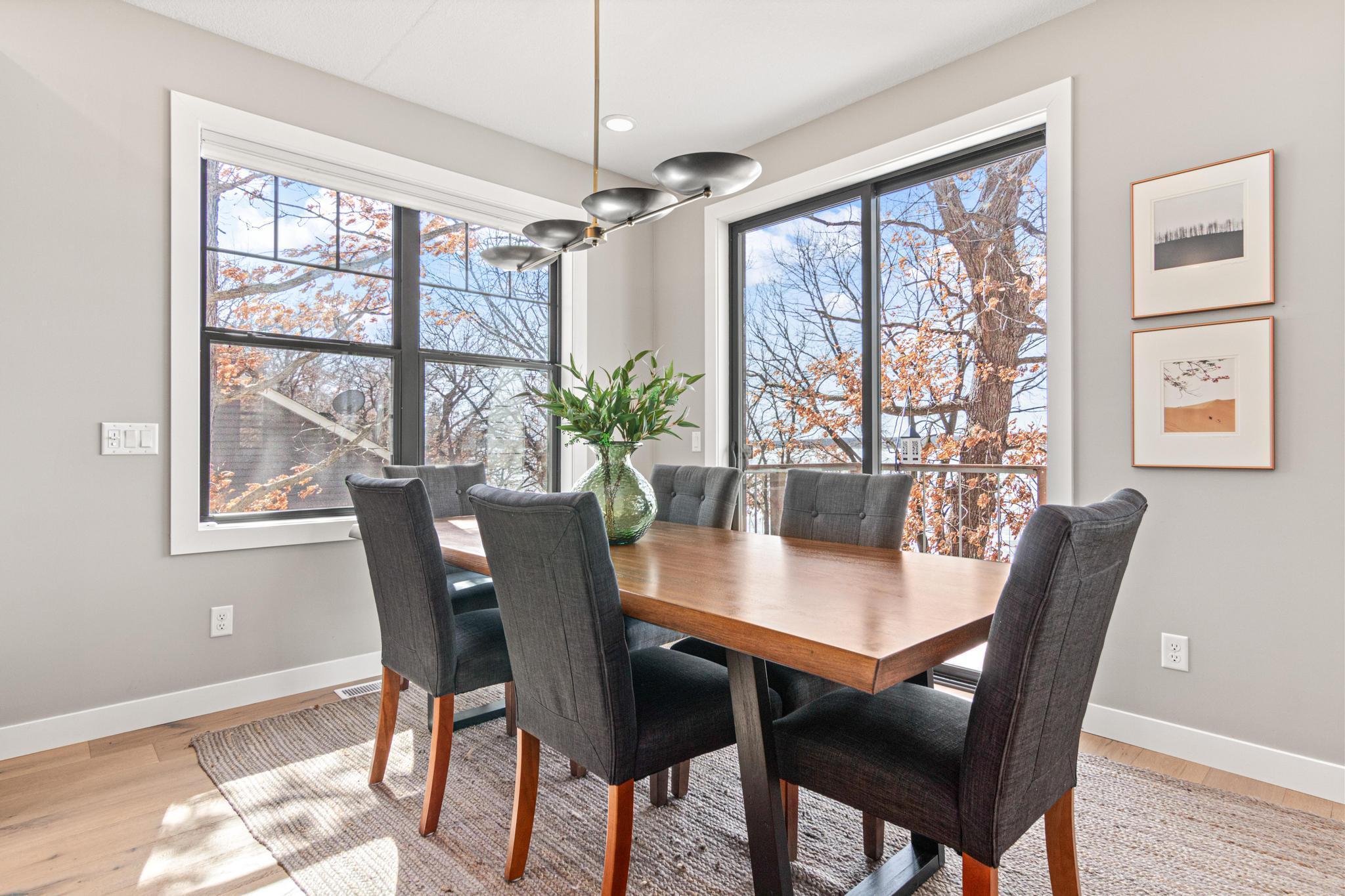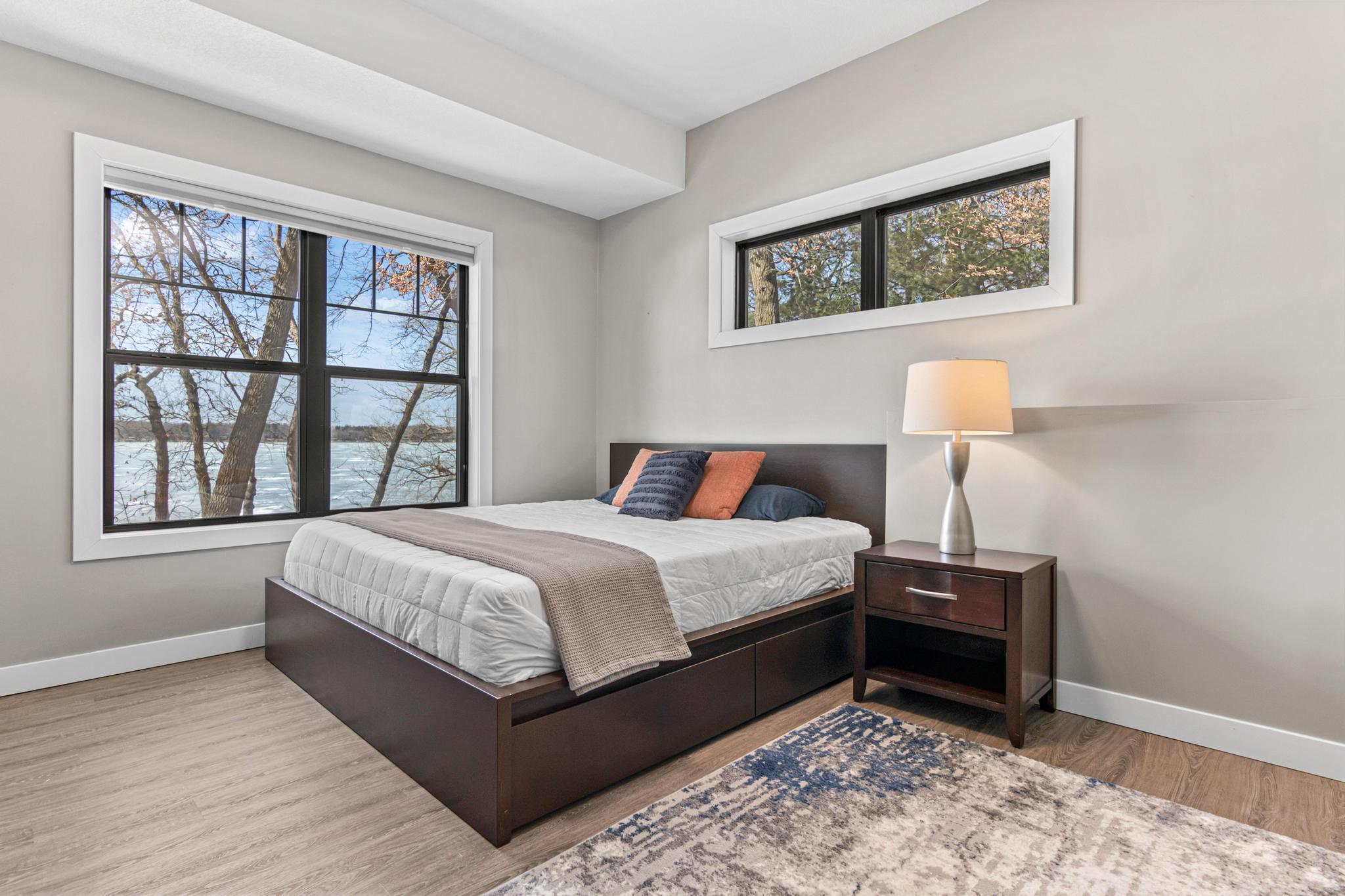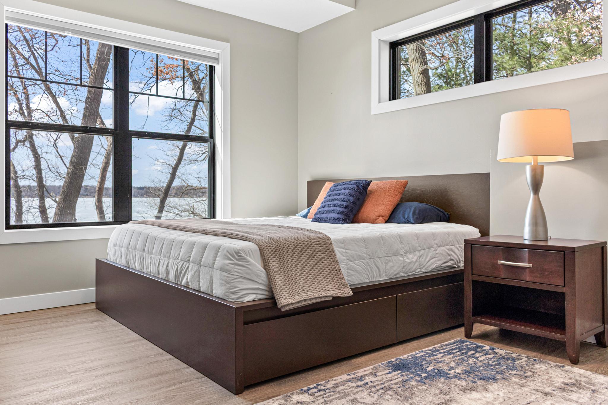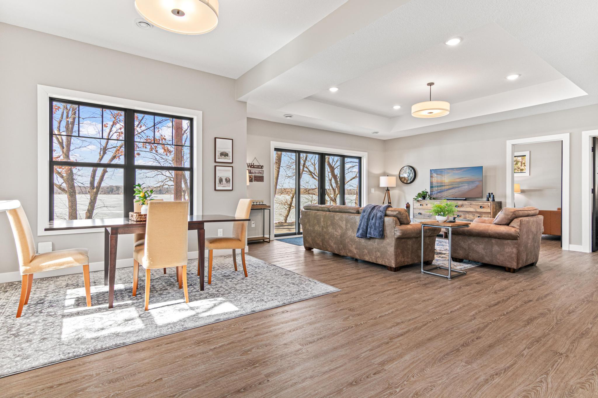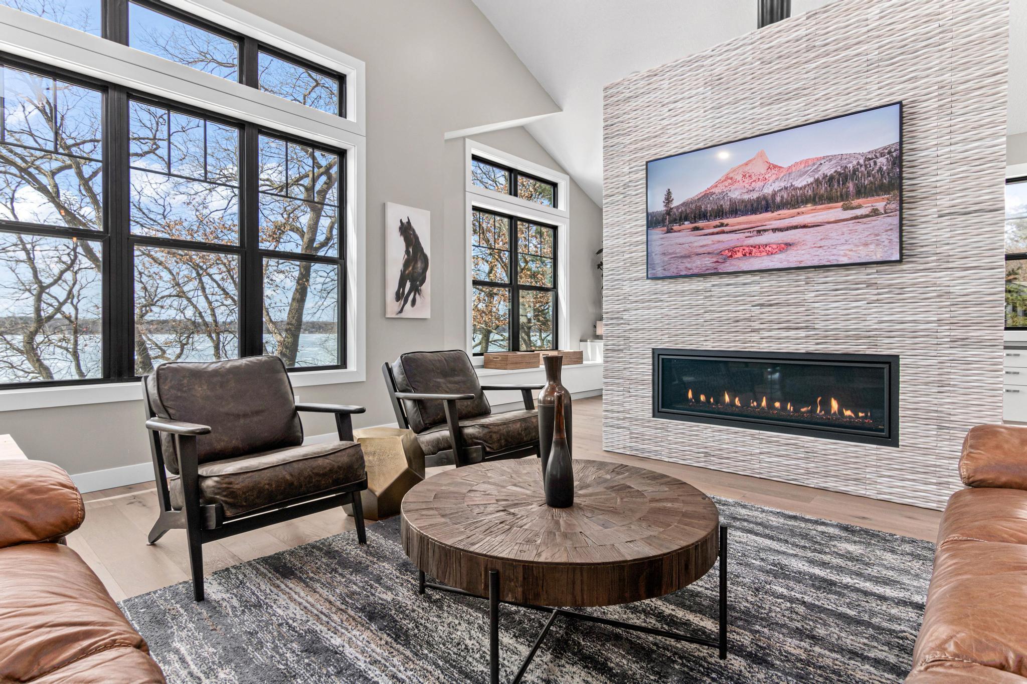 Welcome to an exceptional lakeshore retreat on Cedar Lake just minutes from the Twin Cities! This opportunity offers nearly 1 acre of beautifully positioned land and 100+ feet of prime frontage with breathtaking panoramic views. A beautiful fieldstone patio by the lake with a fire pit creates the perfect setting to relax, entertain, and take in the stunning surroundings. This thoughtfully designed home blends modern finishes with a warm, inviting feel—perfect for both everyday living and entertaining. Step inside to an open-concept main level highlighted by vaulted ceilings, expansive windows, and stunning 180 degree lake views that flood the home with natural light. The spacious living area centers around a sleek fireplace, creating a comfortable gathering space year-round. The gourmet kitchen features a large center island, custom cabinetry, and high-end finishes—ideal for hosting and everyday functionality. The main level offers a desirable layout with multiple bedrooms and a private primary suite, providing comfort and convenience with all living facilities on one level. The walkout lower level expands your living space with a large family room, wet bar area, additional bedrooms, and is enhanced by radiant in-floor heating, delivering consistent comfort throughout the colder months. Outdoor living is where this property truly shines. Enjoy peaceful mornings and unforgettable sunsets from the patio overlooking the water. The property features a spacious boathouse, making lake life effortless, along with gradual elevation to the shoreline and excellent water clarity—ideal for swimming, boating, and recreation. The heated and attached three car garage will keep your cars toasty in the winter and the additional land across the road is the perfect spot to build an additional garage or outbuilding. Great opportunity to combine lakeshore living with modern amenities!