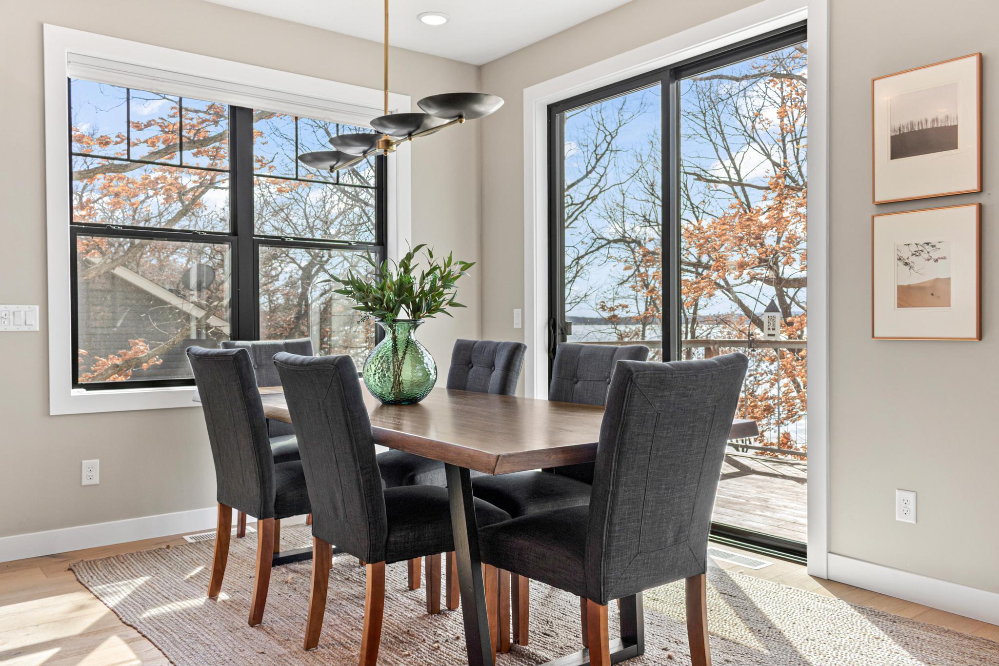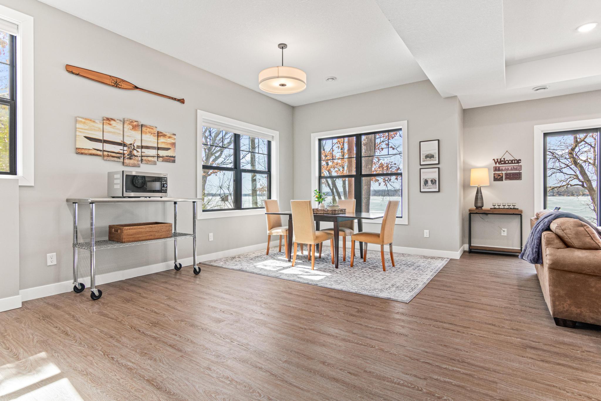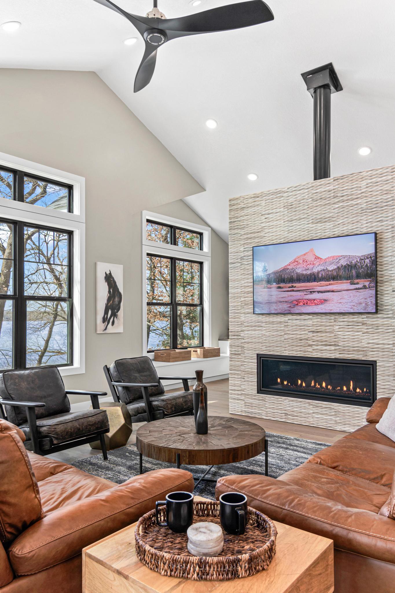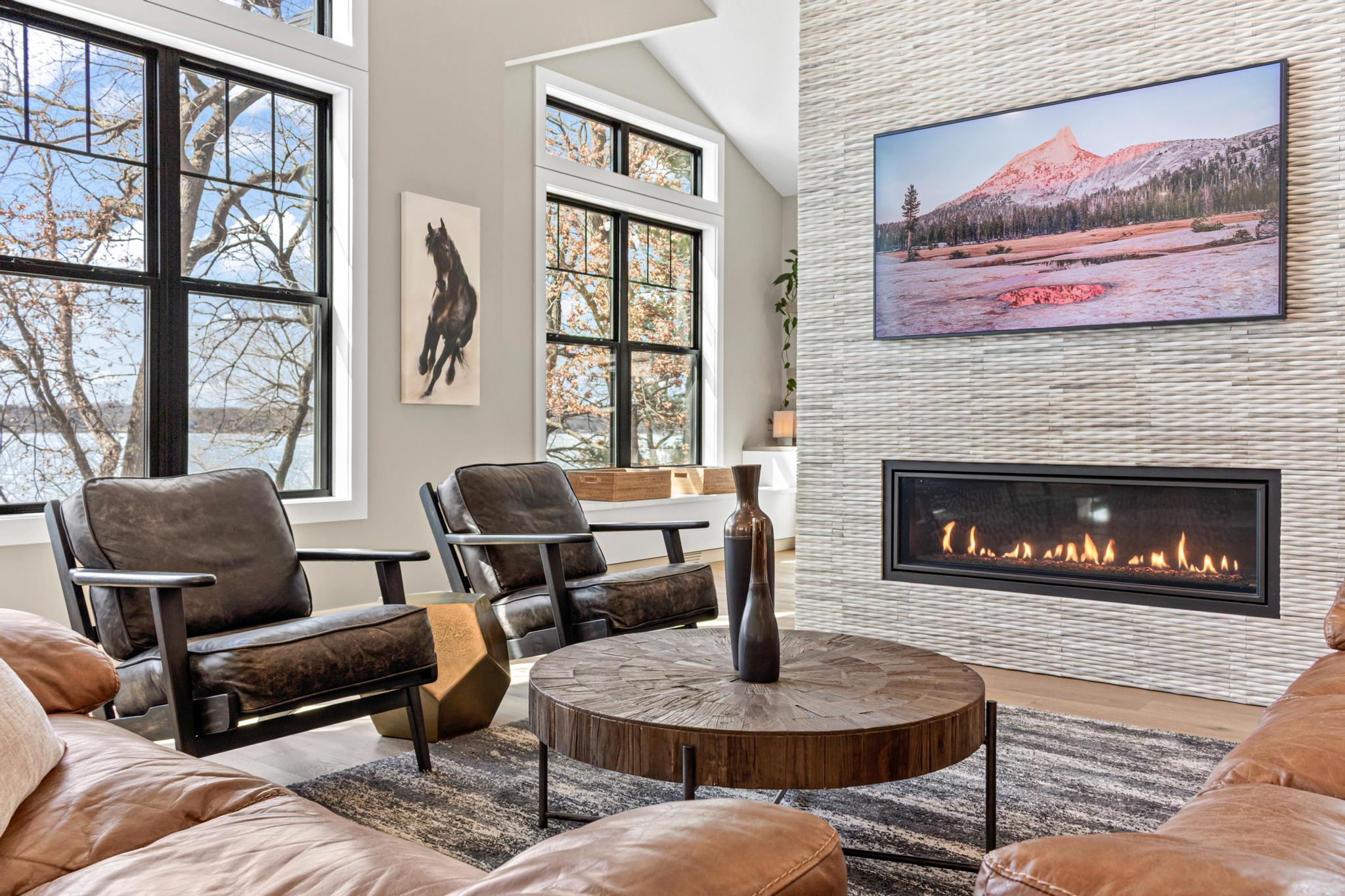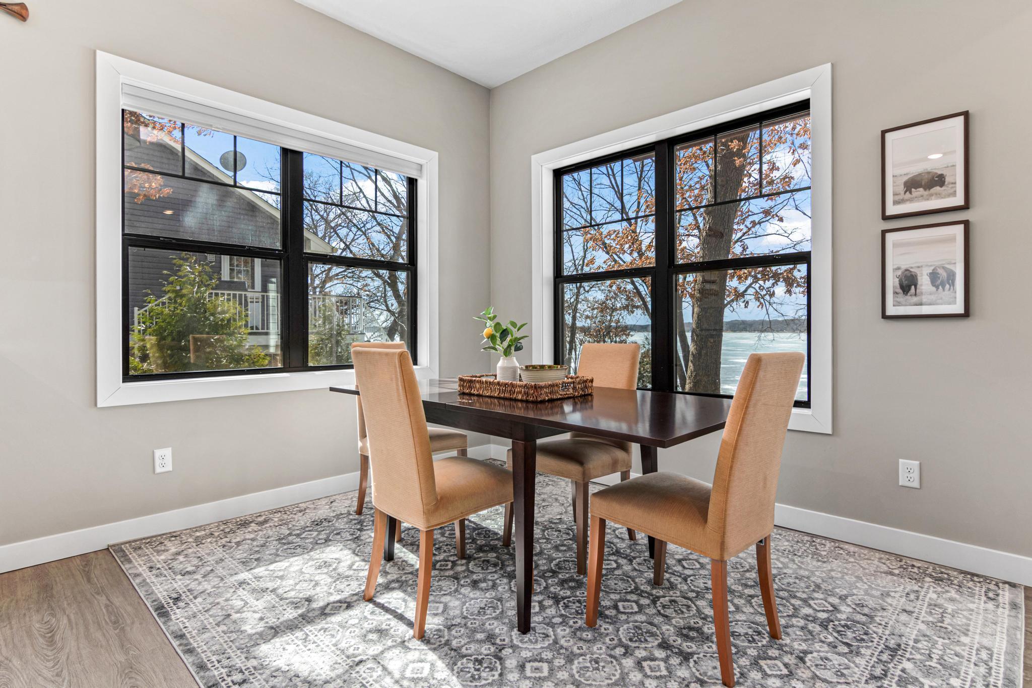 Welcome to an exceptional lakeshore retreat on Cedar Lake just minutes from the Twin Cities! This opportunity offers nearly 1 acre of beautifully positioned land and 100+ feet of prime frontage with breathtaking panoramic views. A beautiful fieldstone patio by the lake with a fire pit creates the perfect setting to relax, entertain, and take in the stunning surroundings. This thoughtfully designed home blends modern finishes with a warm, inviting feel—perfect for both everyday living and entertaining. Step inside to an open-concept main level highlighted by vaulted ceilings, expansive windows, and stunning 180 degree lake views that flood the home with natural light. The spacious living area centers around a sleek fireplace, creating a comfortable gathering space year-round. The gourmet kitchen features a large center island, custom cabinetry, and high-end finishes—ideal for hosting and everyday functionality. The main level offers a desirable layout with multiple bedrooms and a private primary suite, providing comfort and convenience with all living facilities on one level. The walkout lower level expands your living space with a large family room, wet bar area, additional bedrooms, and is enhanced by radiant in-floor heating, delivering consistent comfort throughout the colder months. Outdoor living is where this property truly shines. Enjoy peaceful mornings and unforgettable sunsets from the patio overlooking the water. The property features a spacious boathouse, making lake life effortless, along with gradual elevation to the shoreline and excellent water clarity—ideal for swimming, boating, and recreation. The heated and attached three car garage will keep your cars toasty in the winter and the additional land across the road is the perfect spot to build an additional garage or outbuilding. Great opportunity to combine lakeshore living with modern amenities!