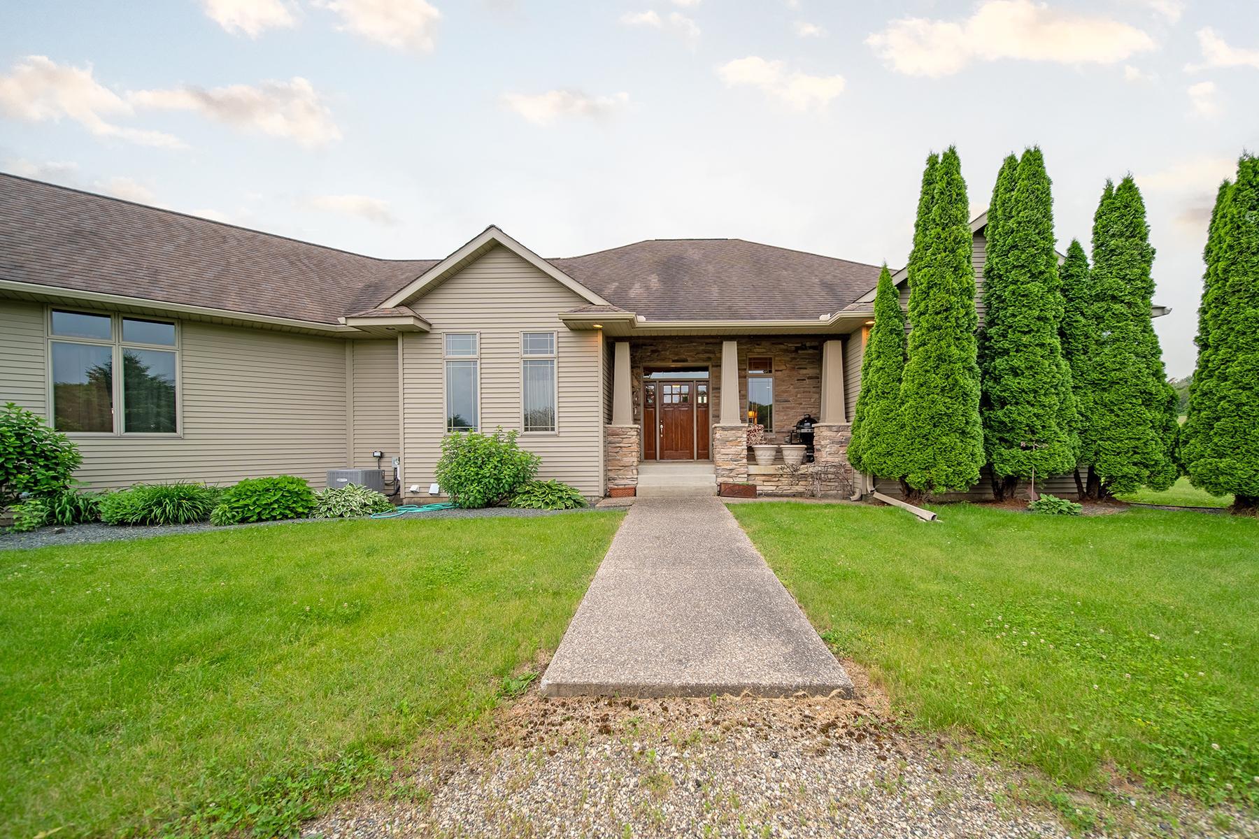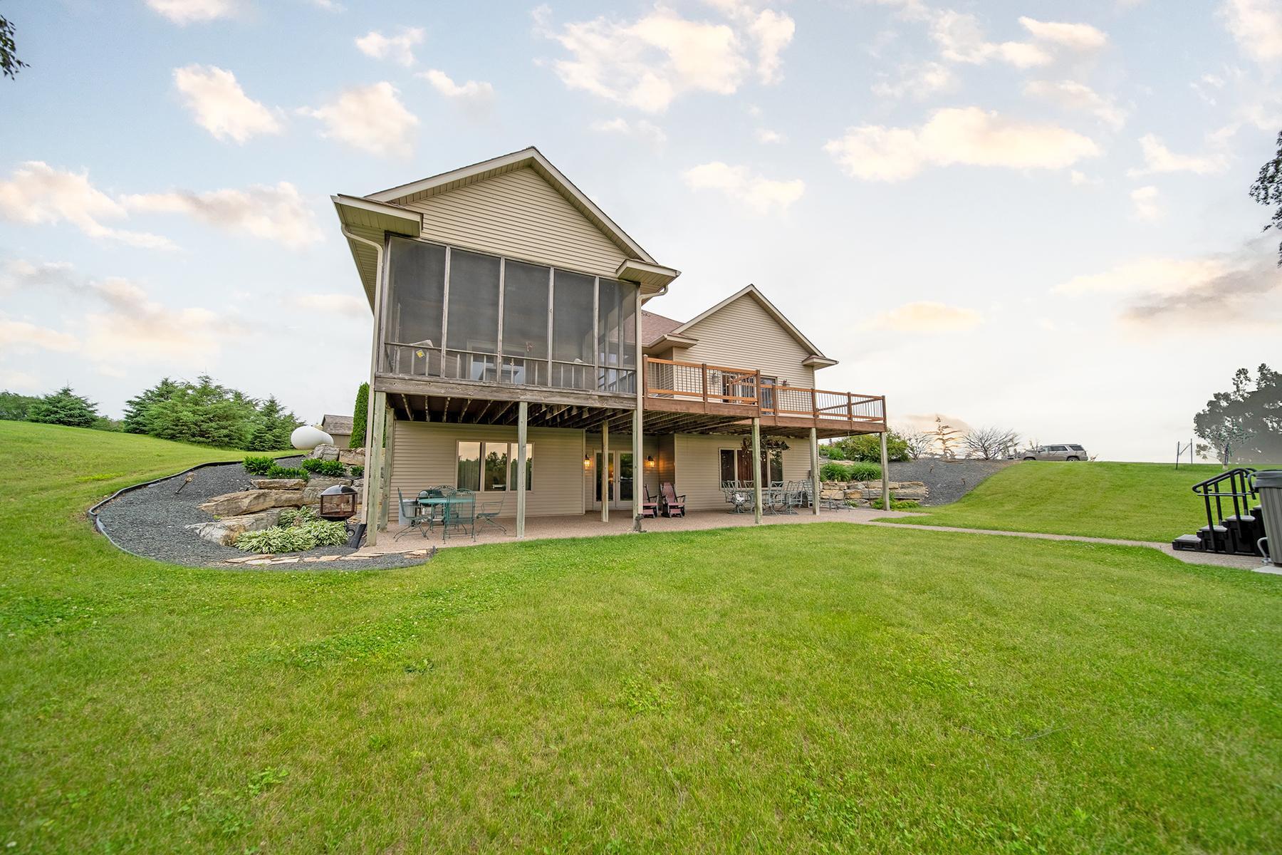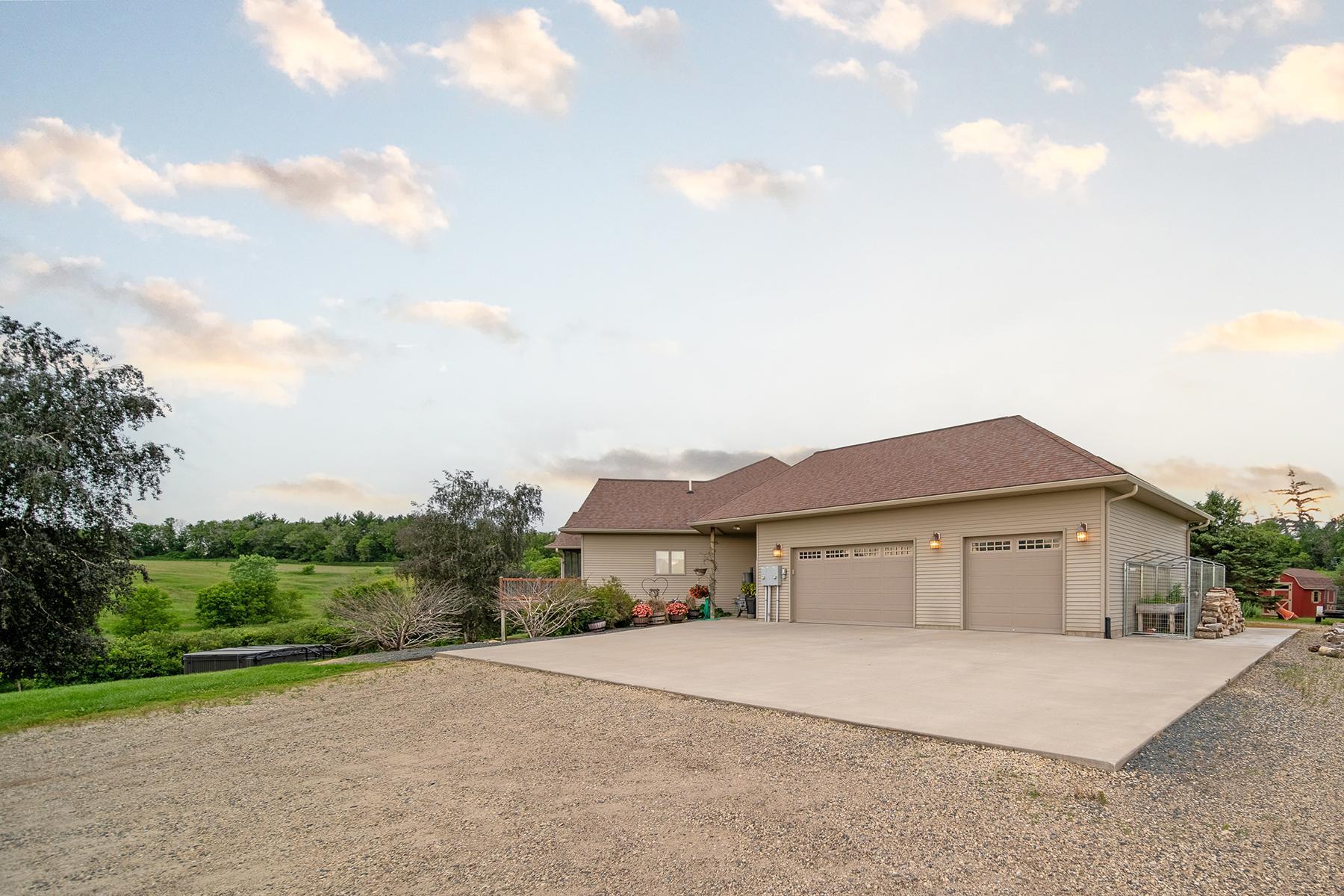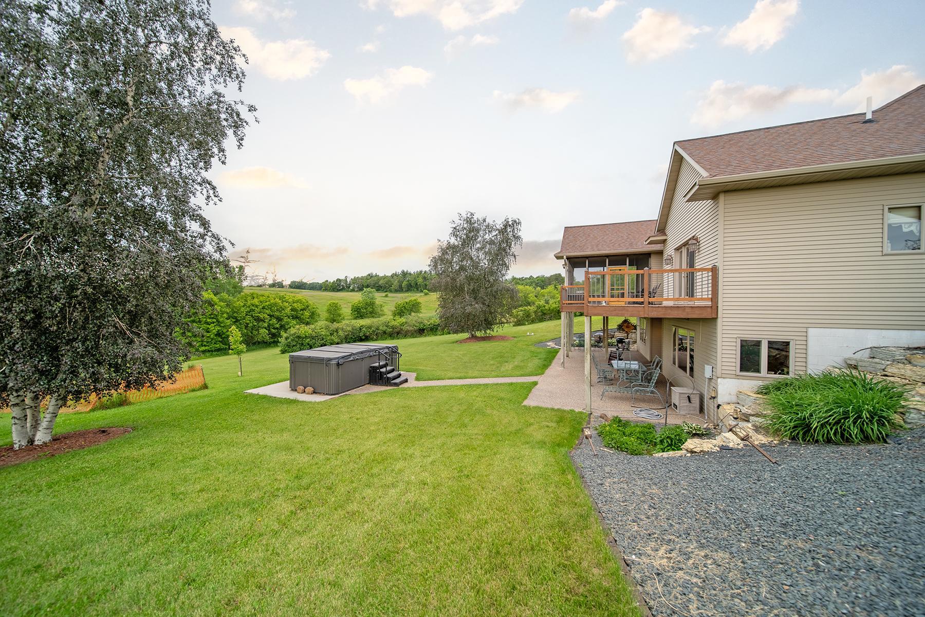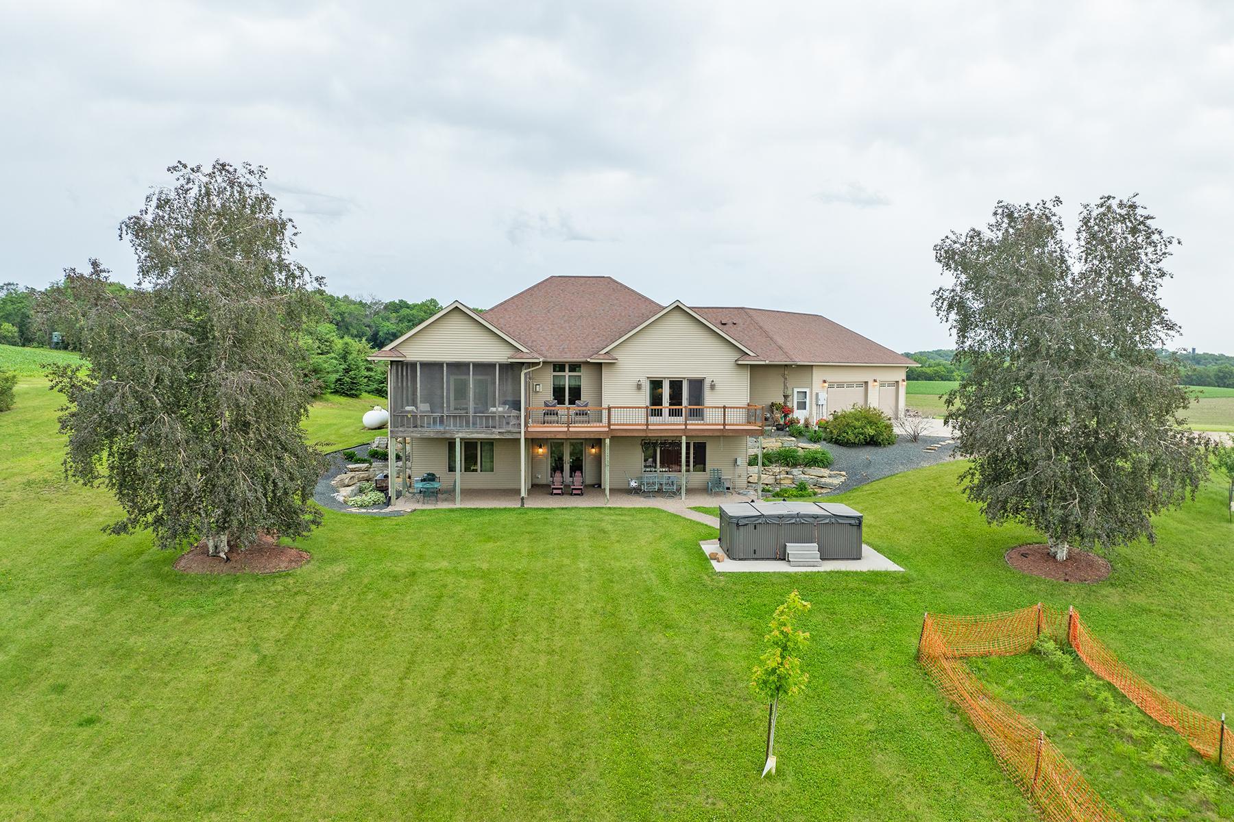 Custom built rambler on 57 acres just outside of Mazeppa! Beautiful country setting with amazing views! Spacious open floor plan with all one level living ! Ten foot ceilings, beautiful mission style trim and doors .- perfect for entertaining family and friends! Start inside and work your way out to the lovely backyard deck enjoying the expansive views - peaceful and quiet! Enjoy coffee in the morning or a glass of wine in the evening in the screened in porch off the master bedroom. Master on the main level and two additional bedrooms on the lower level of the home. A cozy fireplace in the main level living room and enjoy in floor heat in the lower level and garage! Second kitchen area/bar in the lower level walkout! Enjoy a night with friends around the bonfire or in the salt water chemical free swim spa! The land consists of 13 acres that could be fenced for cattle (fence posts are there - just needed fencing), 35 acres of crop land and approximately 10 acres of woods! Must see to appreciate all this home has to offer.