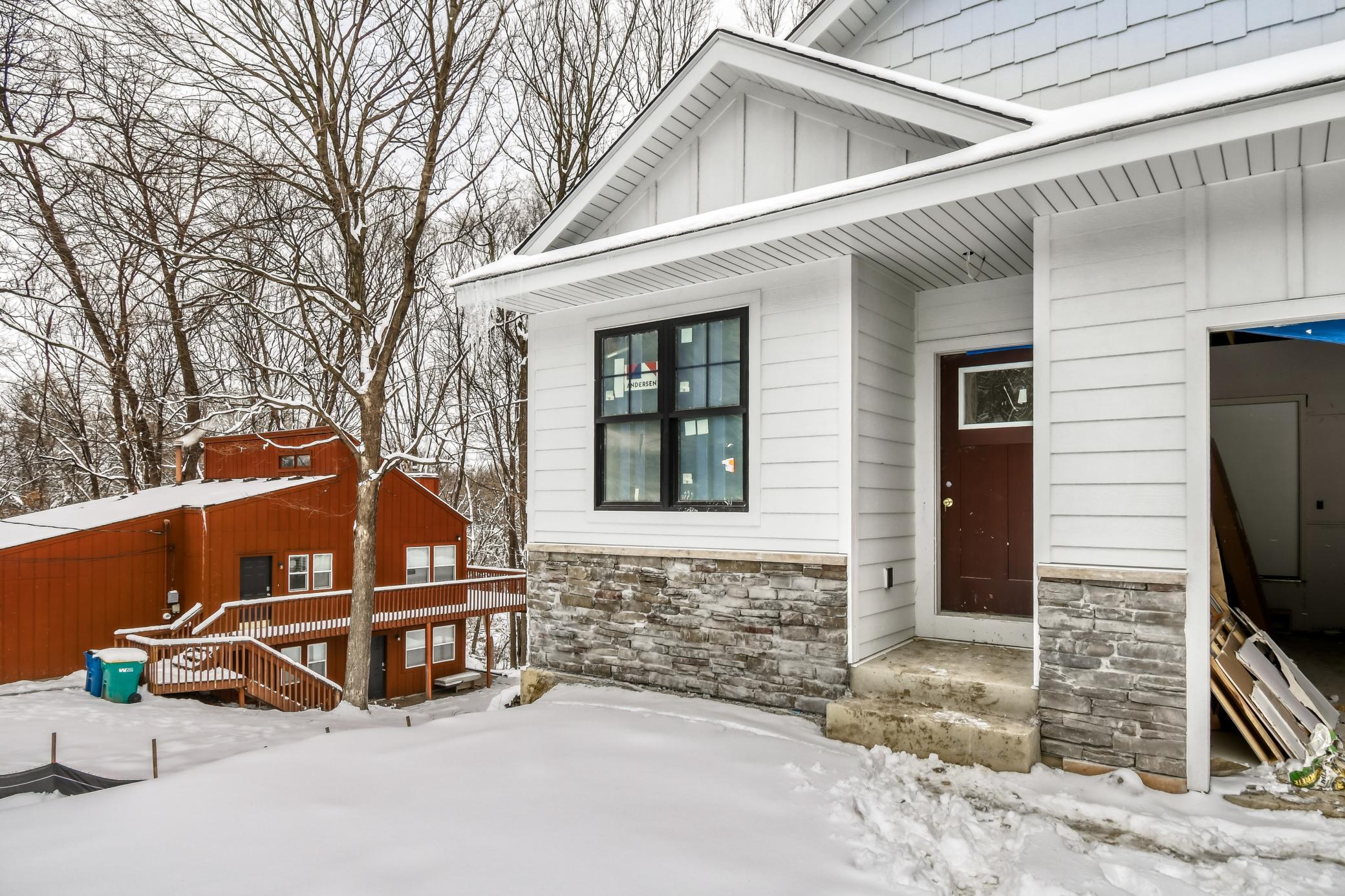 Luxury, design, and comfort meet in this luxury main-level living twin home with NO HOA DUES! Gourmet kitchen boasts large kitchen island, custom cabinetry, and quartz countertops. Spacious main level primary bedroom overlooks the private backyard and features a large walk-in closet with custom built-ins and spa-like bathroom. Private primary bathroom has a tiled walk-in shower with bench, double-sinks, and a walk through to the laundry room! Large living room with gorgeous tray-ceiling and gas fireplace. Front room is a versatile flex room complete with sliding barn-door that could be used as a bedroom, office, or sitting room! Bright and sunny lower-level family room features a gas fireplace, large wet-bar, and walks out to beautiful backyard. Enjoy the serene outdoors with the vaulted-ceiling 4-season porch, the deck, or the large paver patio. Enjoy your own piece of paradise in this home built on a gorgeous lot exuding privacy and serenity. No detail has been missed!