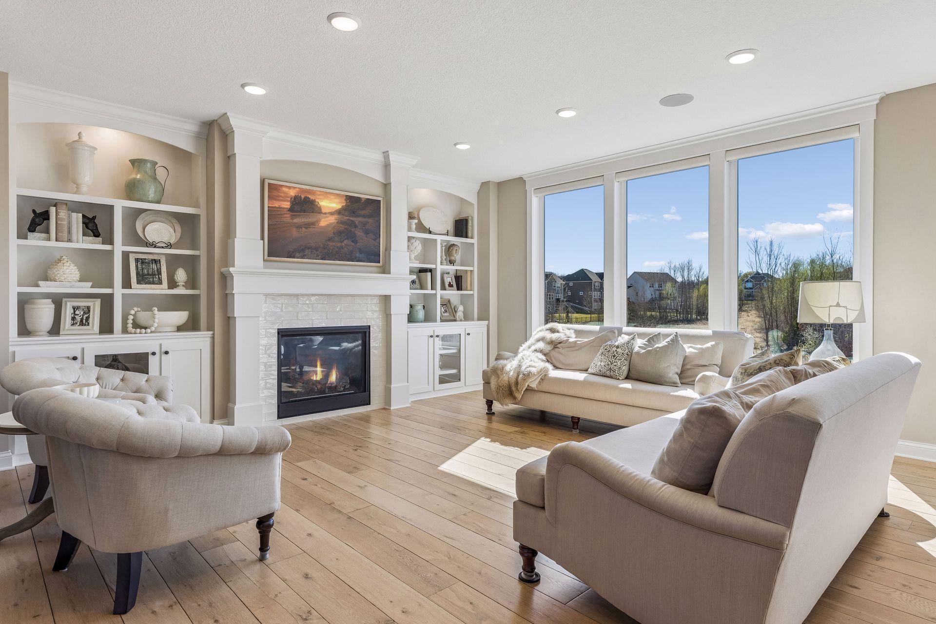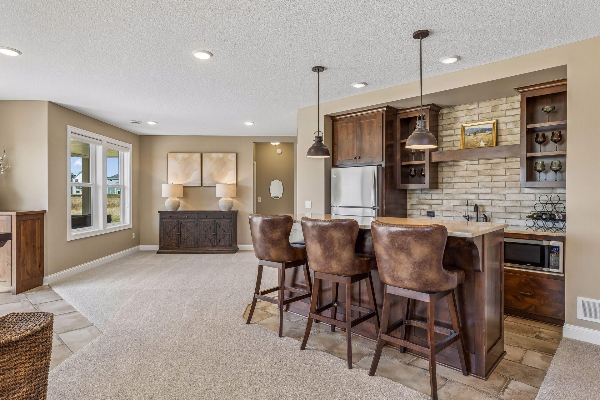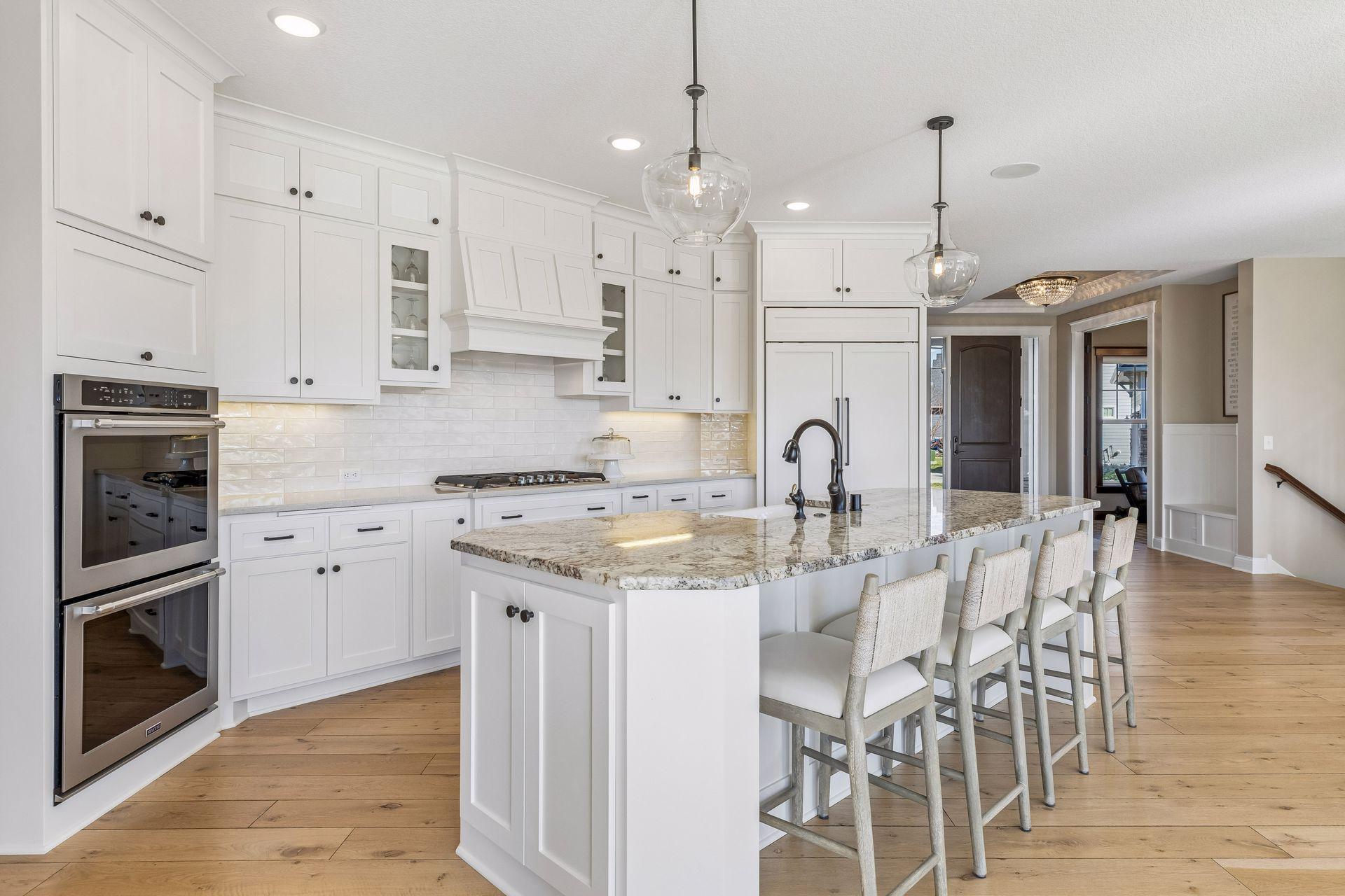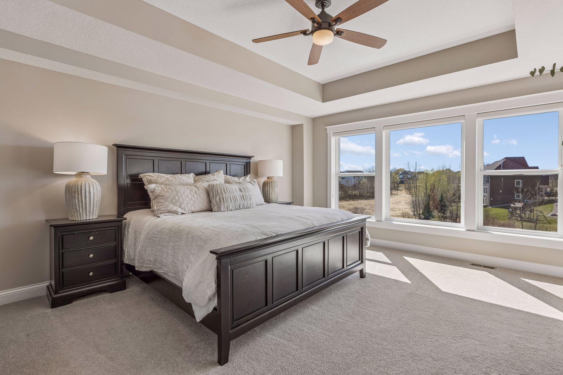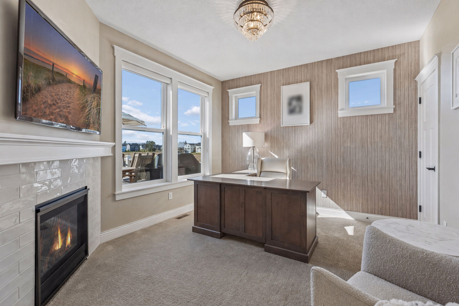 Welcome to this exceptional custom-built home in the highly sought-after Maple Creek Meadows neighborhood—perfectly situated within walking distance to Meadow Ridge Elementary. Built in 2017 by Hanson Builders, this thoughtfully designed residence blends luxury, comfort, and functionality across every level. The main floor showcases an inviting angled kitchen with a dedicated coffee bar, an eat-in dinette, and a formal dining room—ideal for both everyday living and entertaining. A private study offers a quiet workspace, while the Great Room is filled with natural light from stunning 84" windows. A versatile main-level bedroom—perfect as a guest suite or sunroom—features its own cozy fireplace, and is complemented by a nearby 3/4 bathroom with a convenient roll-in shower. Upstairs, you'll find four spacious bedrooms, including a luxurious Owner’s Suite retreat complete with a spa-like bathroom featuring a steam shower, soaking tub, and a generous walk-in closet. A bonus room with a closet offers flexibility as a fifth upper-level bedroom if desired. The home’s outdoor living spaces are equally impressive. Enjoy the screened porch with fireplace and Phantom screens—perfect for relaxing year-round. Step out to a maintenance-free deck overlooking a beautifully landscaped yard with a paver patio, built-in fire pit with gas line, and a hot tub—all set against breathtaking panoramic views of a pond and serene wetlands. The lower level is designed for entertainment and recreation, featuring a spacious family room with fireplace and built-in cabinetry, a theater rail, wet bar, exercise room, whimsical kids’ fort, an additional bedroom, and bathroom. Additional highlights include an insulated and heated garage with epoxy flooring and ample storage, as well as Hunter Douglas blinds throughout the home. This is a rare opportunity to own a truly remarkable home in an unbeatable location—where thoughtful design meets everyday luxury.