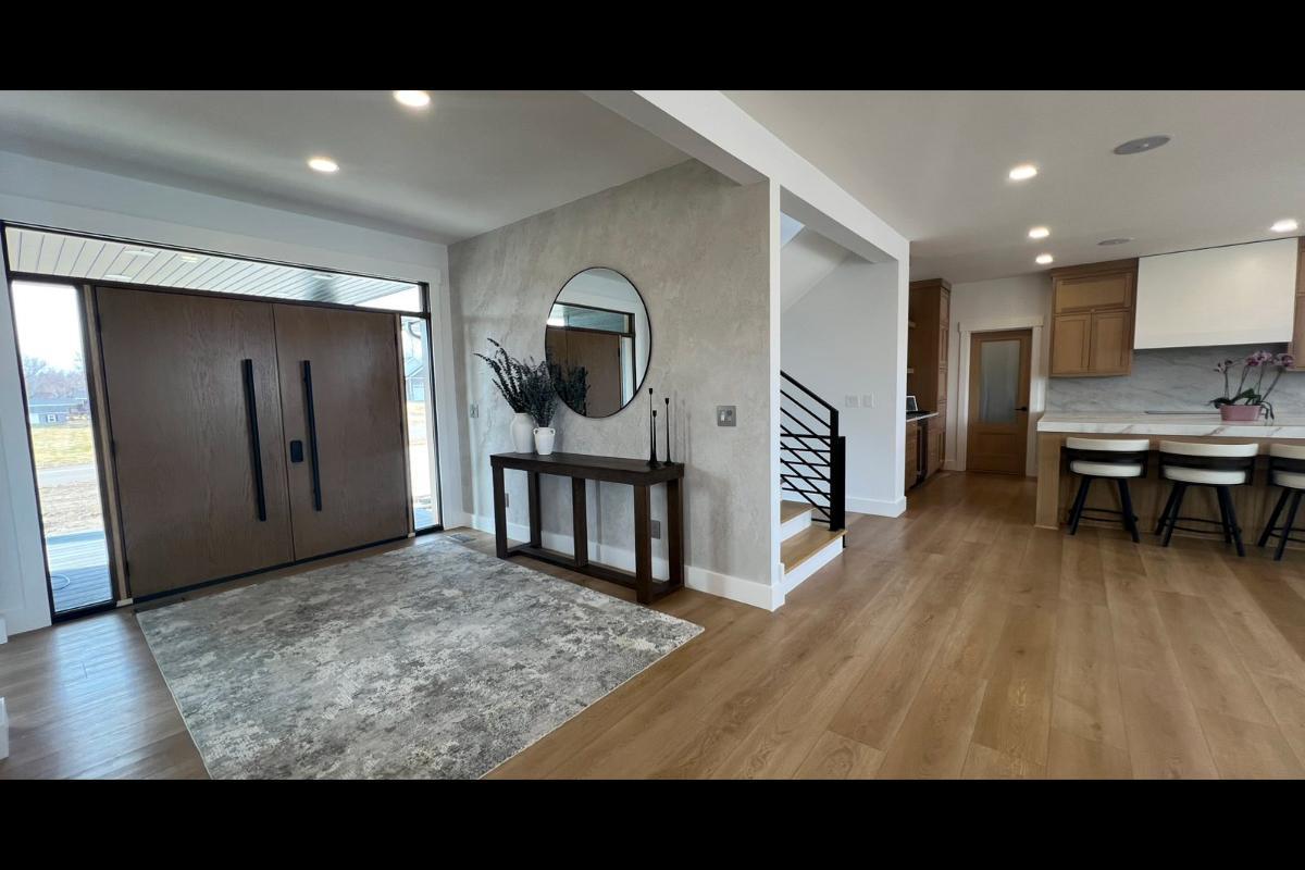 Exceptional custom-built 5,116 sq ft home featuring 4 bedrooms, 7 bathrooms, 2 kitchens, 2 laundries, office, study room, play room, and an oversized 4-car garage. Nestled on 2-acre lot with picturesque pond view, this stunning modern residence offers an exceptional blend of upscale design and thoughtful functionality across two beautifully finished levels - plus an expansive lower level brimming with potential. Main Level - 1,748 sq ft. Step inside and be immediately impressed by an open, elegant layout crafted for both everyday living and effortless entertaining. The showstopping gourmet kitchen is a chef’s dream, appointed with custom white oak cabinetry, gleaming countertops, a designer backsplash, and a generous center island. A fully equipped walk-in butler's pantry — complete with its own sink, refrigerator, gas oven, electric oven, and abundant cabinetry — adds unmatched convenience and storage. A striking stone electric fireplace anchors the living area with warmth and sophistication. Additional main-level features include a private office off the foyer, a spacious mudroom, a full laundry area, a walk-through closet, a stylish powder room for guests, and a large shower bathroom with double sinks conveniently located near the mudroom. The entire floor features an in-ceiling 10-speaker 3-zone audio system for full sound immersion when watching your favorite movies and TV shows, or simply listening to music. Upper Level - 1,714 sq ft The second floor offers four generously sized bedrooms, each with its own private ensuite bathroom - providing comfort and privacy for every member of the household. The lavish primary suite serves as a true sanctuary, boasting a spa-inspired bathroom, an expansive walk-in closet, and a cozy electric fireplace. A large, dedicated laundry room on this level adds everyday ease and practicality. Lower Level - 1,295 sq ft. Unfinished & Full of Potential. The walkout lower level presents an incredible opportunity to customize and expand your living space. Already framed and roughed-in with electrical, plumbing, and HVAC, this level is ready for your vision - with space designated for a large family room, a study room, a playroom, a full bathroom, and generous storage. Garage - 1,098 sq ft. Car enthusiasts and hobbyists will love the oversized 4-car garage - an impressive 43 feet wide and 25 feet deep on one side - fully insulated and ready to accommodate all your vehicles, tools, and toys. Premium Finishes. This home is built to the highest standards, featuring Pella windows, luxury surfaces, custom soft-close cabinetry, LP Smart Siding, Rockwool insulation, and so much more.