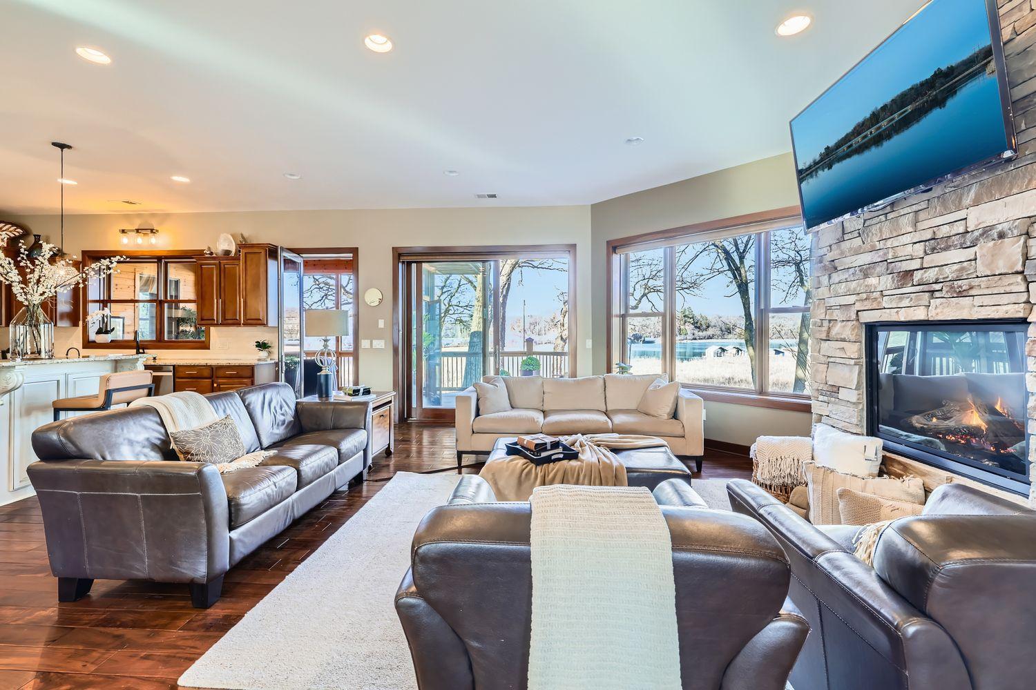 Imagine enjoying lakefront luxury perched in the heart of prestigious Deephaven at this Cottagewood Road “treetop” masterpiece designed to dazzle & inspire! Entertainer’s delight! Step past its understated exterior & this fully-loaded & exceptionally crafted “Restoration Hardware” style gem offers the ultimate experience in comfort and relaxation and offers the perfect backdrop for gatherings small & large! This NEWER-built* open-concept ranch-style RAMBLER on 147’ of LAKE MINNETONKA LAKE SHORE offers a PRIVATE & SERENE OVERSIZED .56 ACRE LOT, **BOAT SLIPS**, 4.5-CAR GARAGE & NIGHT VIEWS!! on the prestigious CARSON’S BAY in premier Deephaven, Mn! A truly amazing home yet the majority of the value of this property is in the HIGH ELEVATION LAND and its breathtaking year-round views! Highlights include: MAIN-LEVEL PRIMARY, 10’ CEILINGS, LUXURIOUS BAR, MOVIE ROOM, UPSCALE APPLIANCES, HEATED FLOORING, EXTENSIVE LANDSCAPING, WALK-THRU CLOSET, 2-SIDED FIREPLACE, WELL WATER & so much more! In addition to unusual privacy on LAKE MINNETONKA LAKESHORE, this fully-loaded 5 BR (+den/office)/6 bath, 4.5-car*** home offers Deephaven Elementary/MTKA EAST/MHS schools, voluminous ceilings & windows, all NEW LIGHTING inside & out, finished & HEATED GARAGE, AMPLE PARKING, LOWER LAKE TAXES, designer finishes! 4 DOCKS/COVERED SLIPS SHARED between 3 homes, private 3-season CEDAR PORCH, GRANITE OPEN-CONCEPT KITCHEN, lower-level GRANITE BAR complete w/sink, Bosch dishwasher, wine fridge, newer outdoor SHED, 2 finished & painted garages (lg one heated), in-floor heating in 65+% of the home & large unfinished storage room. 6 well-appt bathrooms, hand-scraped walnut floors, premium Hunter Douglas window treatments, stunning entrance & DR chandeliers! Even a Mother-In-Law Suite!! ASK us for information on easy conversions to 5 to 6, 7 or even 8 bedrooms! Designed to take full advantage of the stunning views, the main level offers 3 BR +office & 3 baths, a grand open-concept kitchen that features tons of cabinets, a walk-in pantry & high-end appliances, incl: Jen Aire oven/stove, Wolff microwave & Liebherr refrigerator. Huge owner’s suite w/lg windows, lg walk-thru closet, sitting area, 2-sided fireplc, lg mounted TV & 14-in. thick windowsills (thru-out most of the home)! Spacious en-suite bathroom w/dble shower, jacuzzi bath, in-floor heat & lg walk-thru closet. Primary suite & kitchen both open to a screened 3-season porch. Beautiful wrought iron spindles lead you to the lower level of this retreat, featuring walls of windows, 9’ ceilings, luxurious bar & a stamped concrete deck that greet you along w/3 sparkling bathrooms,1 w/jacuzzi! Gorgeous, lg sun-filled granite bar area w/Bosch dishwasher, built-in wine fridge, sink & ample cabinetry. Prof decorated movie room w/upscale theater seating, dimmable lighting, built-in shelving & lg screen TV. Add’l game/music/sitting room w/built-in shelving. Dble-sz spare br/office w/a spacious walk-in closet, 3 lg+2 sm windows (could be split into 2BRs by adding a wall & door). 2 add’l rooms w/doors past movie room, 1 w/outdoor access. In-floor heating thruout, 2 HVAC units (1 new), commercial-grade water heater, water softener, whole house water filter +3-stage R/O system, irrigation system, well water w/strong pressure. Lower level opens to beautiful bkyd featuring lg deck, new shed, fire pit & picturesque dock. A finished & painted 1.5+ stall 2nd garage w/3 windows, DRAIN(!) & WATER SUPPLY just past a lg frnc/strg room. 3-foot eaves(!), solid-core doors, recessed lighting, professional closets thru-out. This is a “Must See in Person” home steps from Cottagewood, Mtka Regional Trail & the Minnetonka Yacht Club & minutes from Thorpe Park, dt Excelsior, popular shopping & world-class restaurants. 22 min to msp airport. Seller financing, and all offers considered. *2011=90% foundation new,rare for Mtka lakefront.
