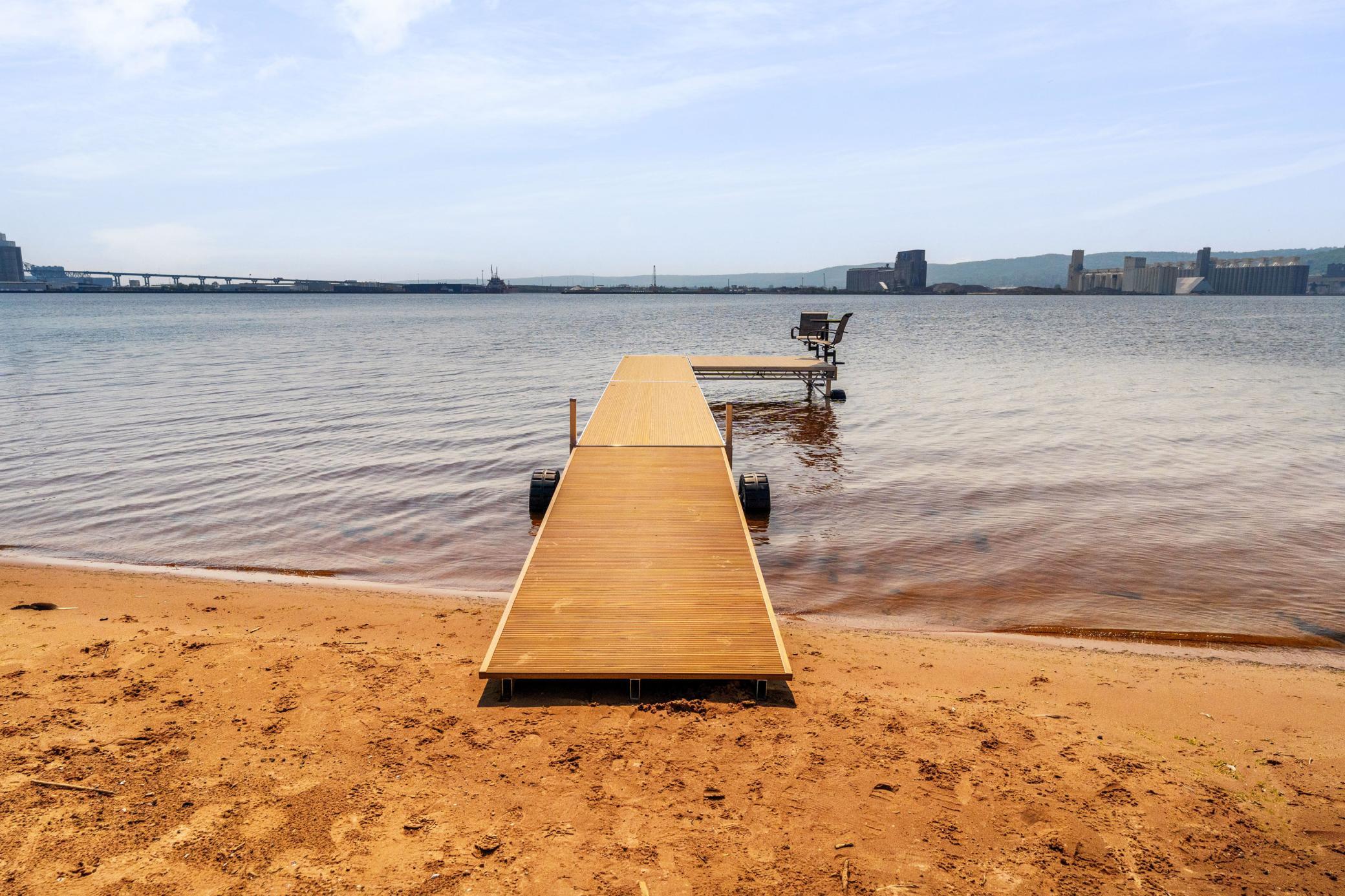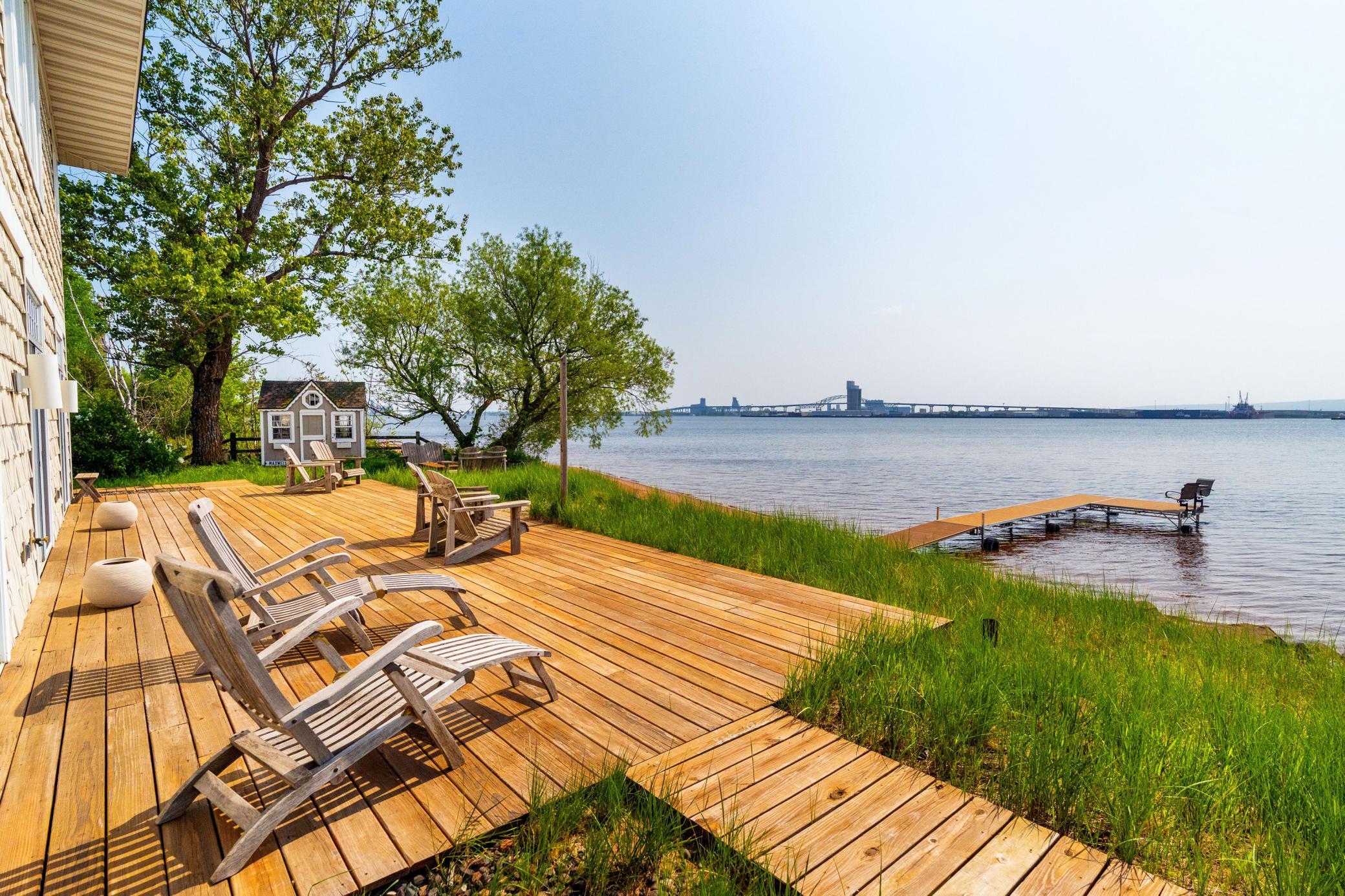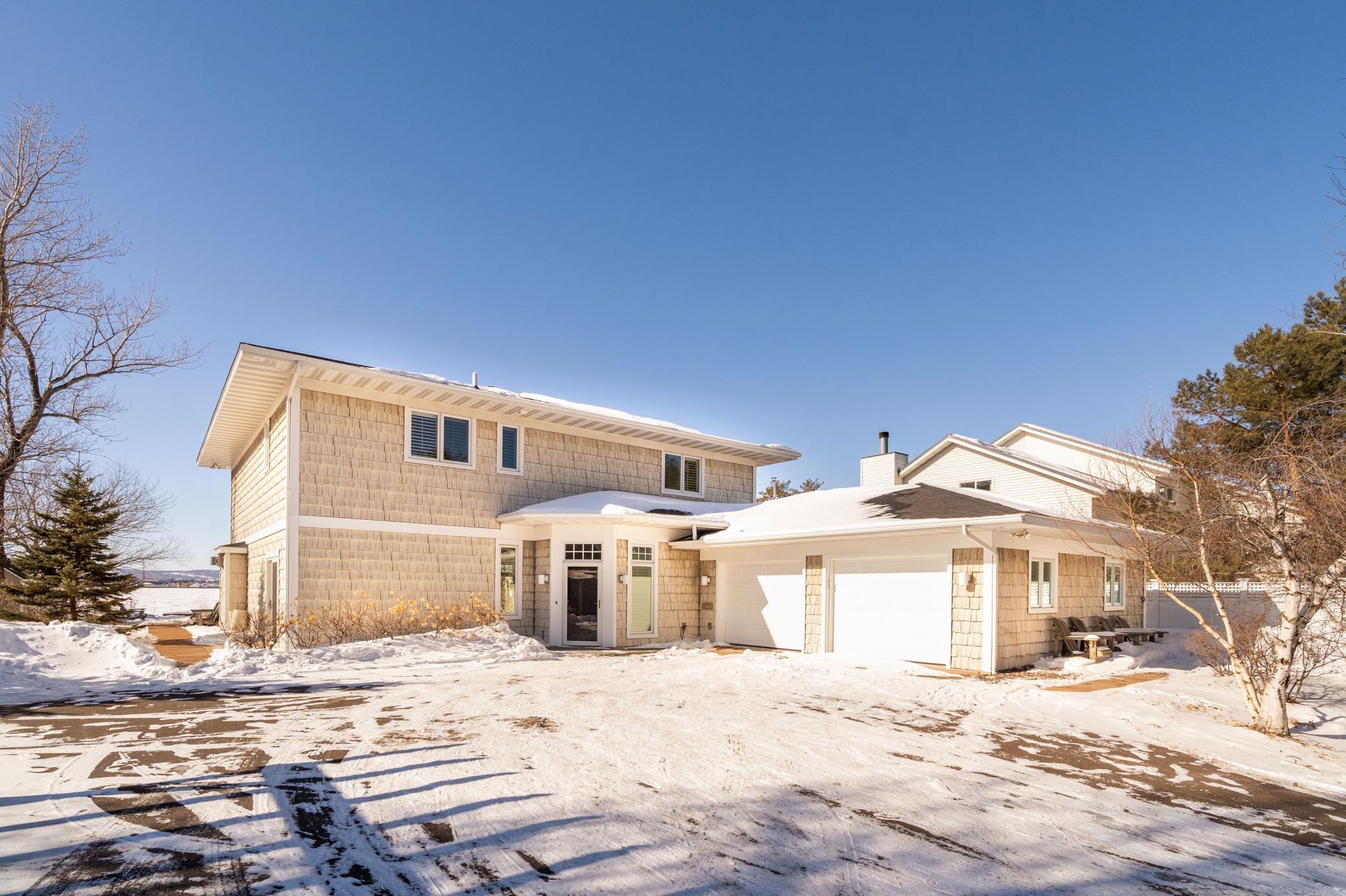 Welcome to a breathtaking paradise on Duluth’s Park Point. This stunning home sits on a spectacular lot boasting mesmerizing views, lush landscaping, vibrant gardens, and a fabulous sandy beach with a dock into the bay! Sunlight pours into every room, creating a bright and inviting ambiance. The main floor features a spacious great room with built-in bookshelves and cozy gas fireplace framed by a grand mantle. You'll love the chef’s dream kitchen with 12-burner Jade range and indoor grill beneath a striking copper hood. Three French doors open to a deck overlooking the water, seamlessly merging indoor and outdoor spaces. Adjacent to the kitchen are a generous pantry, a laundry/mudroom, and access to the 2-car garage. Upstairs, 4 bedrooms include a luxurious primary suite with 2 walk-in closets and private bath featuring a tiled shower and soaking tub. Enjoy the best of lake life watching sunsets on the deck, sitting around the gas fire pit next to the water, or taking a dip from your own beach. A new bluestone patio and vine covered pergola set amongst the well established gardens is the perfect place to admire the flourishing blueberry bushes, amazing peonies and movable beds. Other highlights include an office/wine room, newer windows, boiler and shoreline riprap, and 3 gardening sheds. Don’t miss this rare opportunity to own a waterfront retreat blending elegance, comfort, and nature.