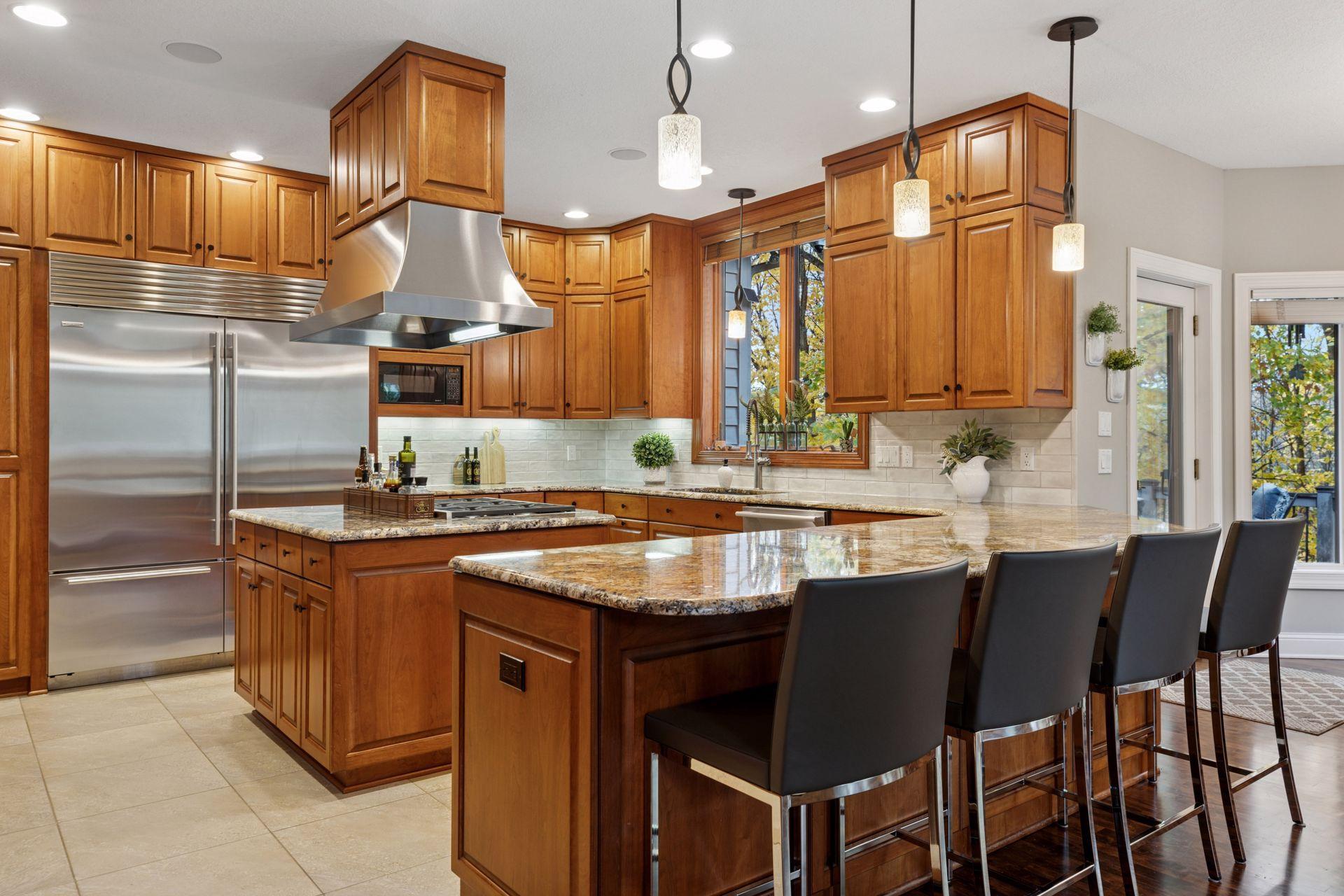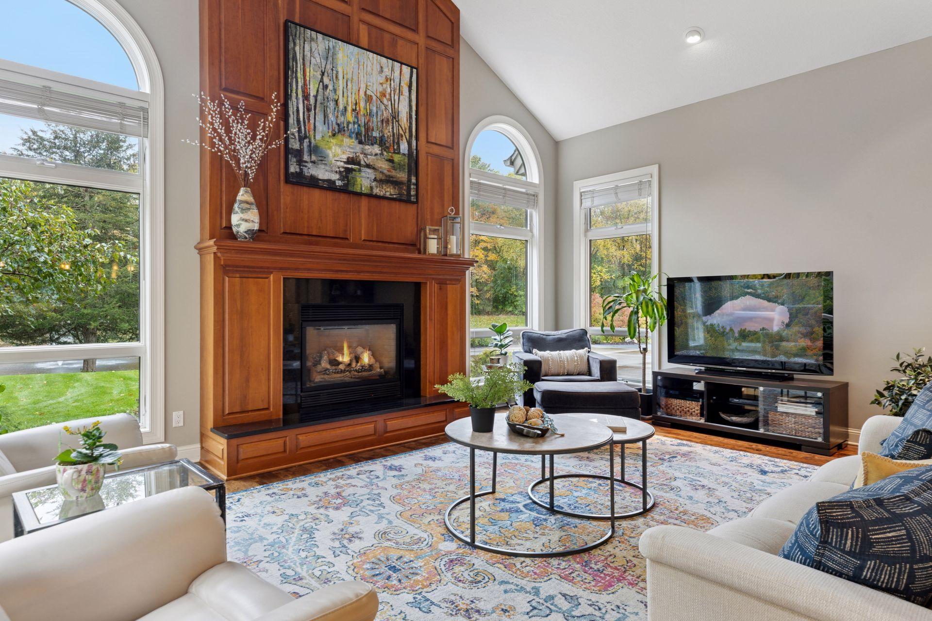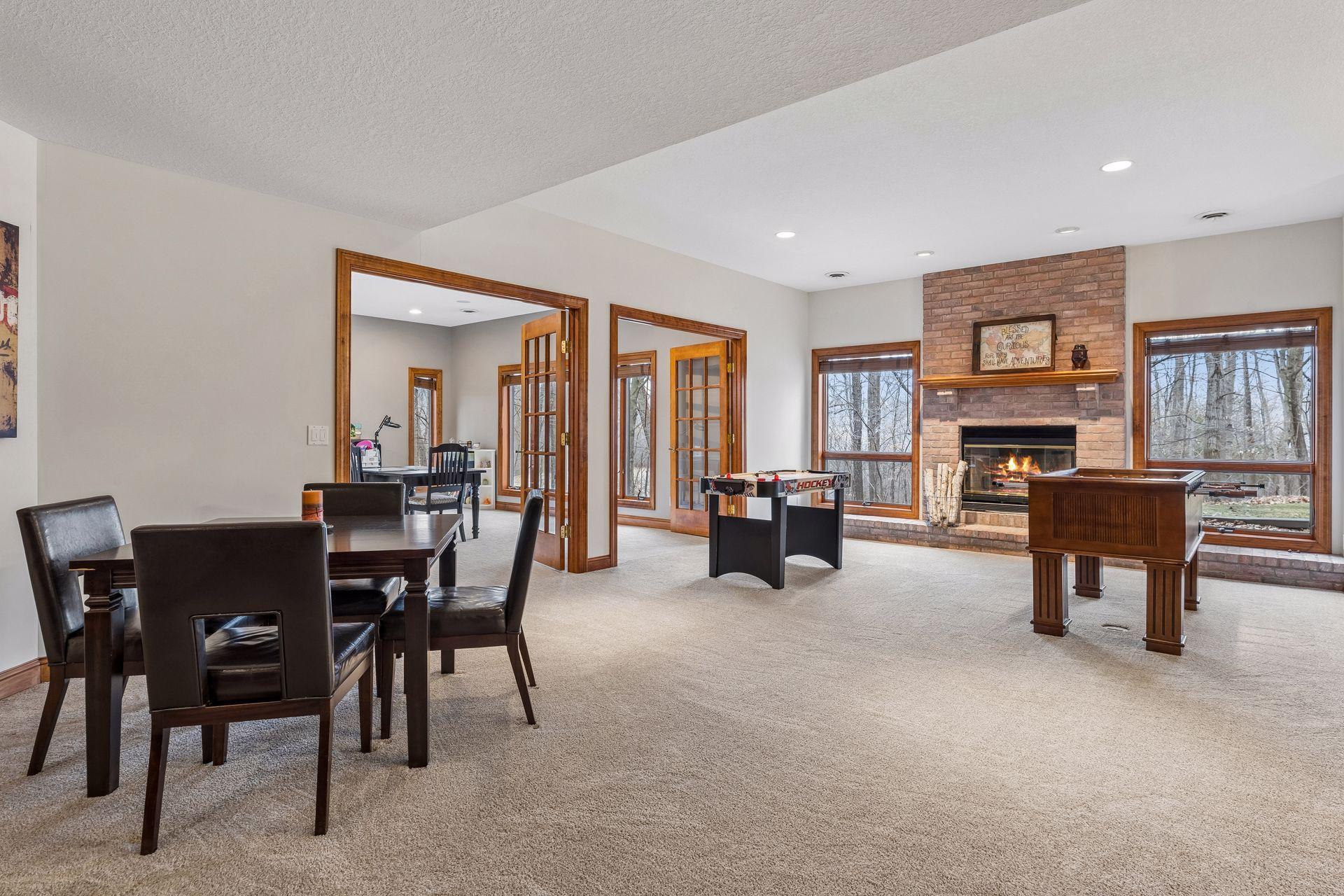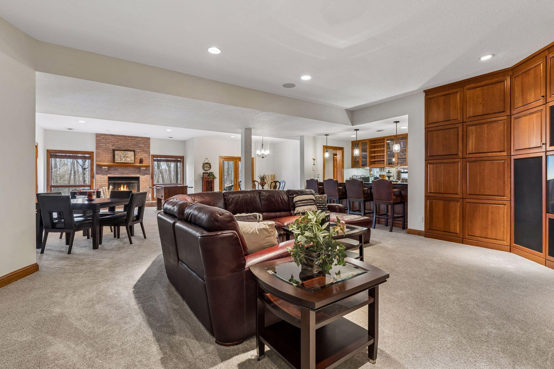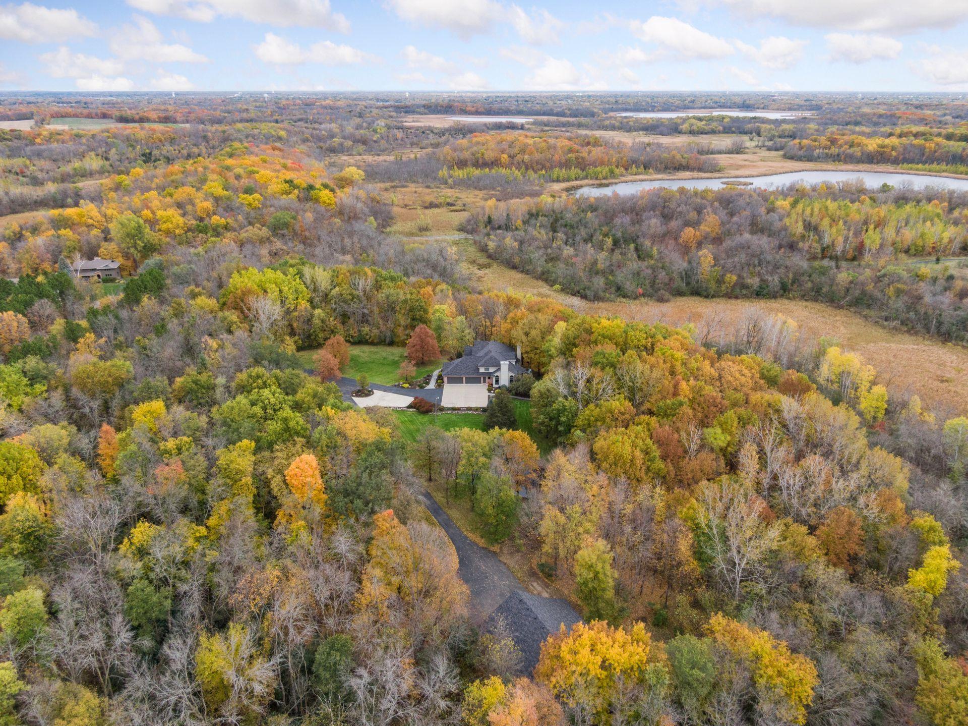 Tucked away on over 9 acres of scenic privacy, this custom-built retreat offers a rare combination of peaceful seclusion and convenient access to all that Maple Grove has to offer. Adjacent to Elm Creek Park Reserve, you’ll enjoy breathtaking natural surroundings, miles of trails, and abundant wildlife right in your backyard. Designed with enduring quality and attention to detail throughout, the main level showcases a true chef’s kitchen equipped with Sub-Zero and Wolf appliances, seamlessly connected to a stunning two-story vaulted family room filled with natural light. Formal living and dining spaces provide elegant entertaining options, complemented by a butler’s pantry with wet bar. The main-floor primary suite is a luxurious retreat, featuring dual closets, a dedicated dressing area, dual vanities, a large steam shower, and a separate jetted tub. A beautifully appointed main floor office with a full wall of cherry built-ins adds both function and sophistication. Upstairs, you’ll find three additional bedrooms, including a private ensuite, along with a full bath and a versatile study or lounge space. The walkout lower level expands the home’s living and entertaining potential with 9-foot ceilings, a spacious family room with built-in media center, a theater room, wet bar, flexible craft or exercise room with French doors, a fifth bedroom, and a ¾ bath. Outside, the setting is truly exceptional—complete with a private pond with fountain, plus a 60x40 outbuilding ideal for hobbies, storage, or recreational use in addition to the attached fully finished and heated four-car garage. A one-of-a-kind property offering space, privacy, and refined living—all within minutes of shopping, dining, and major freeway access.