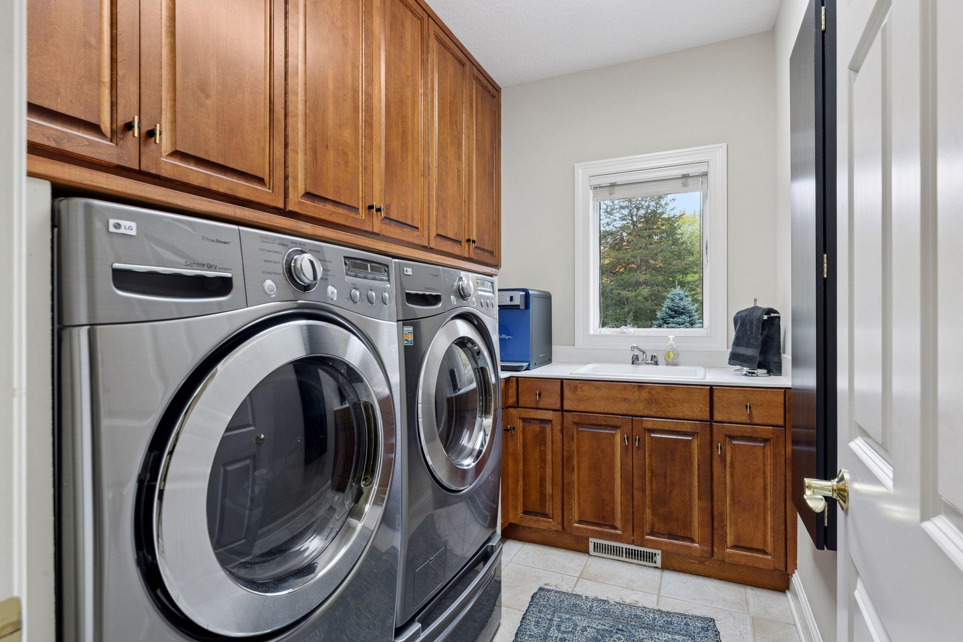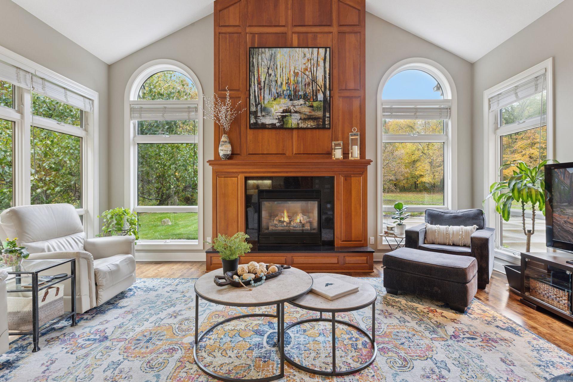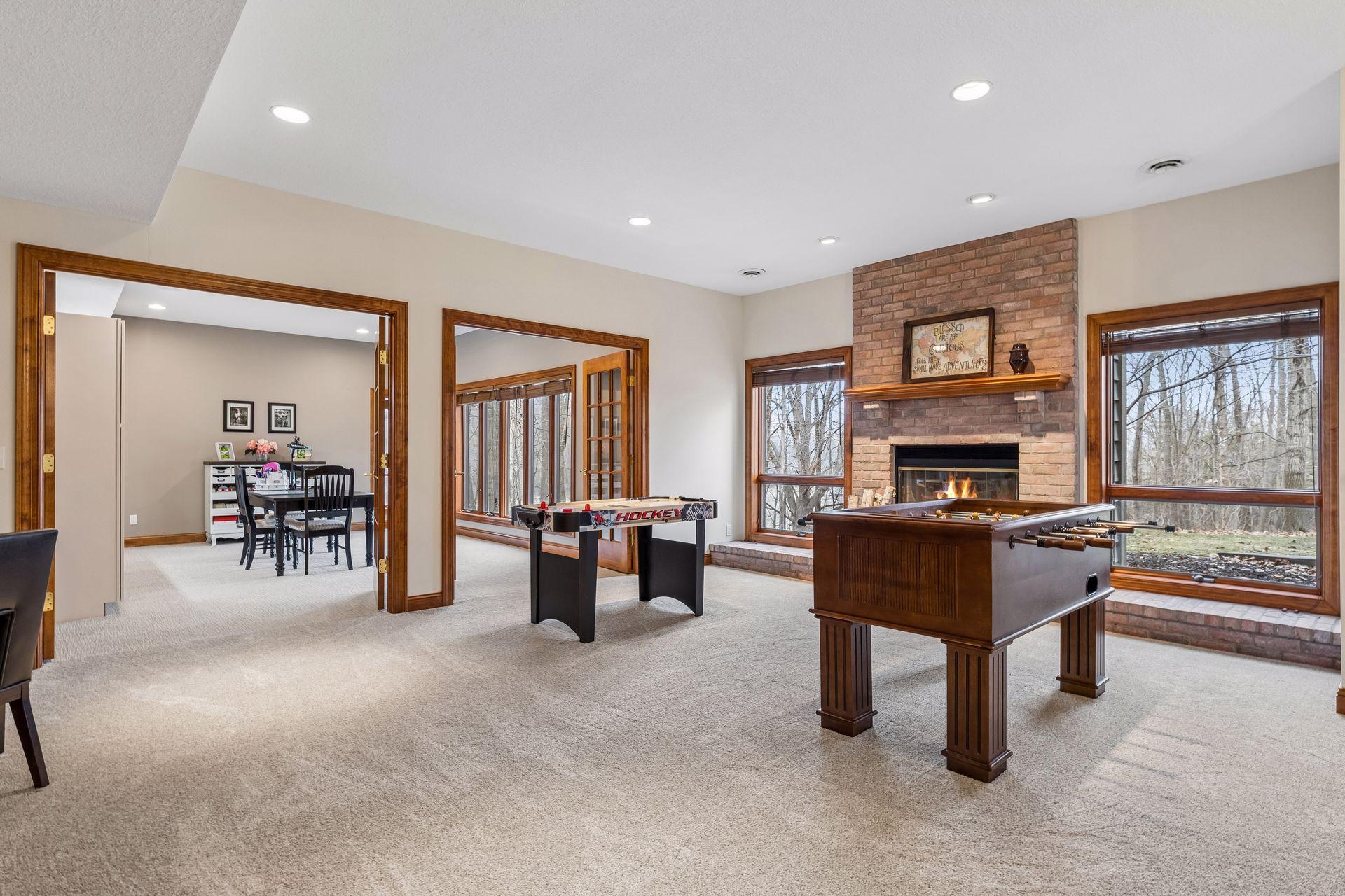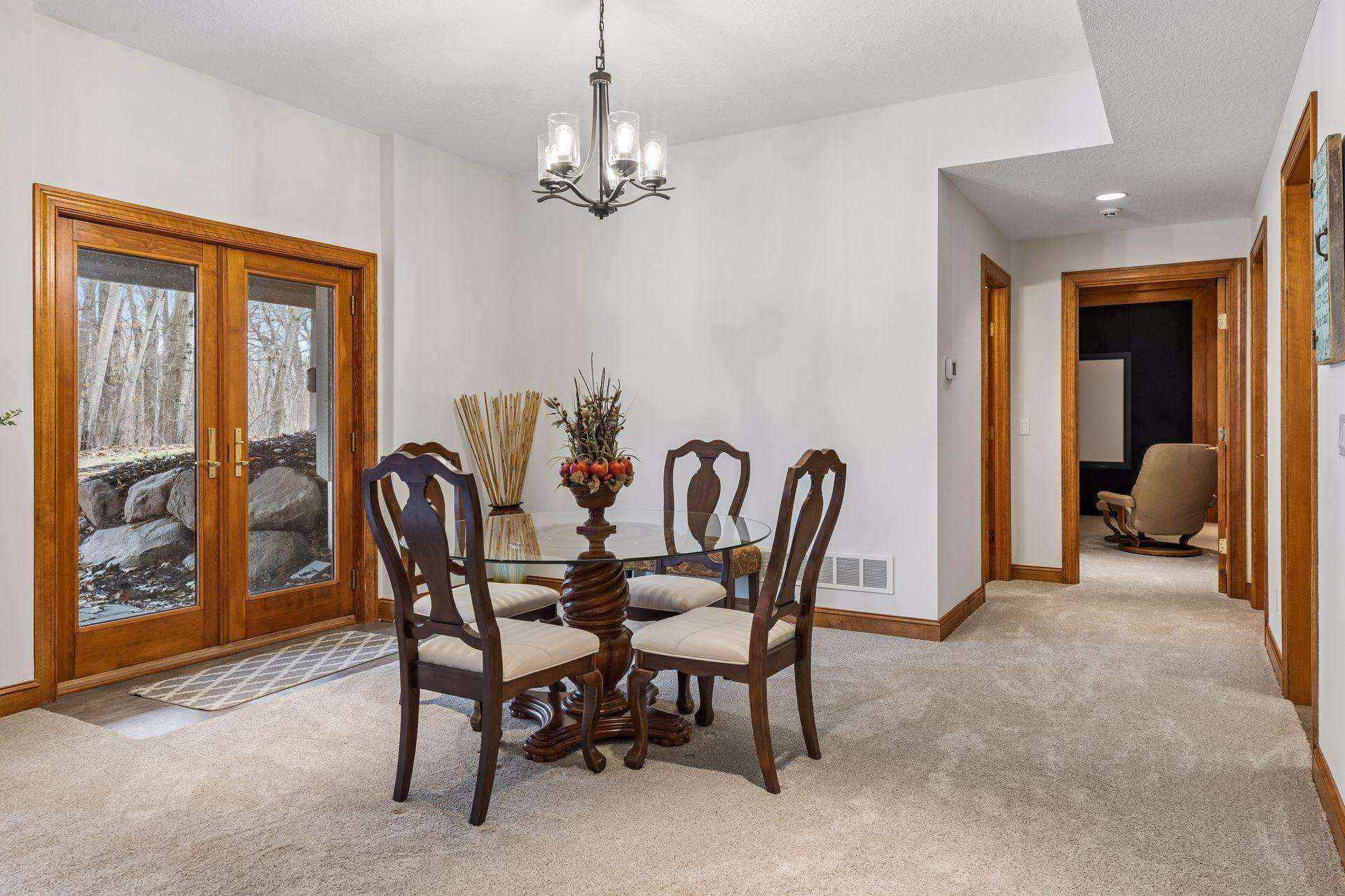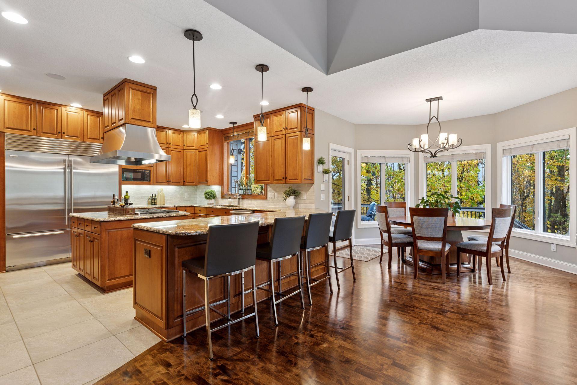 Tucked away on over 9 acres of scenic privacy, this custom-built retreat offers a rare combination of peaceful seclusion and convenient access to all that Maple Grove has to offer. Adjacent to Elm Creek Park Reserve, you’ll enjoy breathtaking natural surroundings, miles of trails, and abundant wildlife right in your backyard. Designed with enduring quality and attention to detail throughout, the main level showcases a true chef’s kitchen equipped with Sub-Zero and Wolf appliances, seamlessly connected to a stunning two-story vaulted family room filled with natural light. Formal living and dining spaces provide elegant entertaining options, complemented by a butler’s pantry with wet bar. The main-floor primary suite is a luxurious retreat, featuring dual closets, a dedicated dressing area, dual vanities, a large steam shower, and a separate jetted tub. A beautifully appointed main floor office with a full wall of cherry built-ins adds both function and sophistication. Upstairs, you’ll find three additional bedrooms, including a private ensuite, along with a full bath and a versatile study or lounge space. The walkout lower level expands the home’s living and entertaining potential with 9-foot ceilings, a spacious family room with built-in media center, a theater room, wet bar, flexible craft or exercise room with French doors, a fifth bedroom, and a ¾ bath. Outside, the setting is truly exceptional—complete with a private pond with fountain, plus a 60x40 outbuilding ideal for hobbies, storage, or recreational use in addition to the attached fully finished and heated four-car garage. A one-of-a-kind property offering space, privacy, and refined living—all within minutes of shopping, dining, and major freeway access.