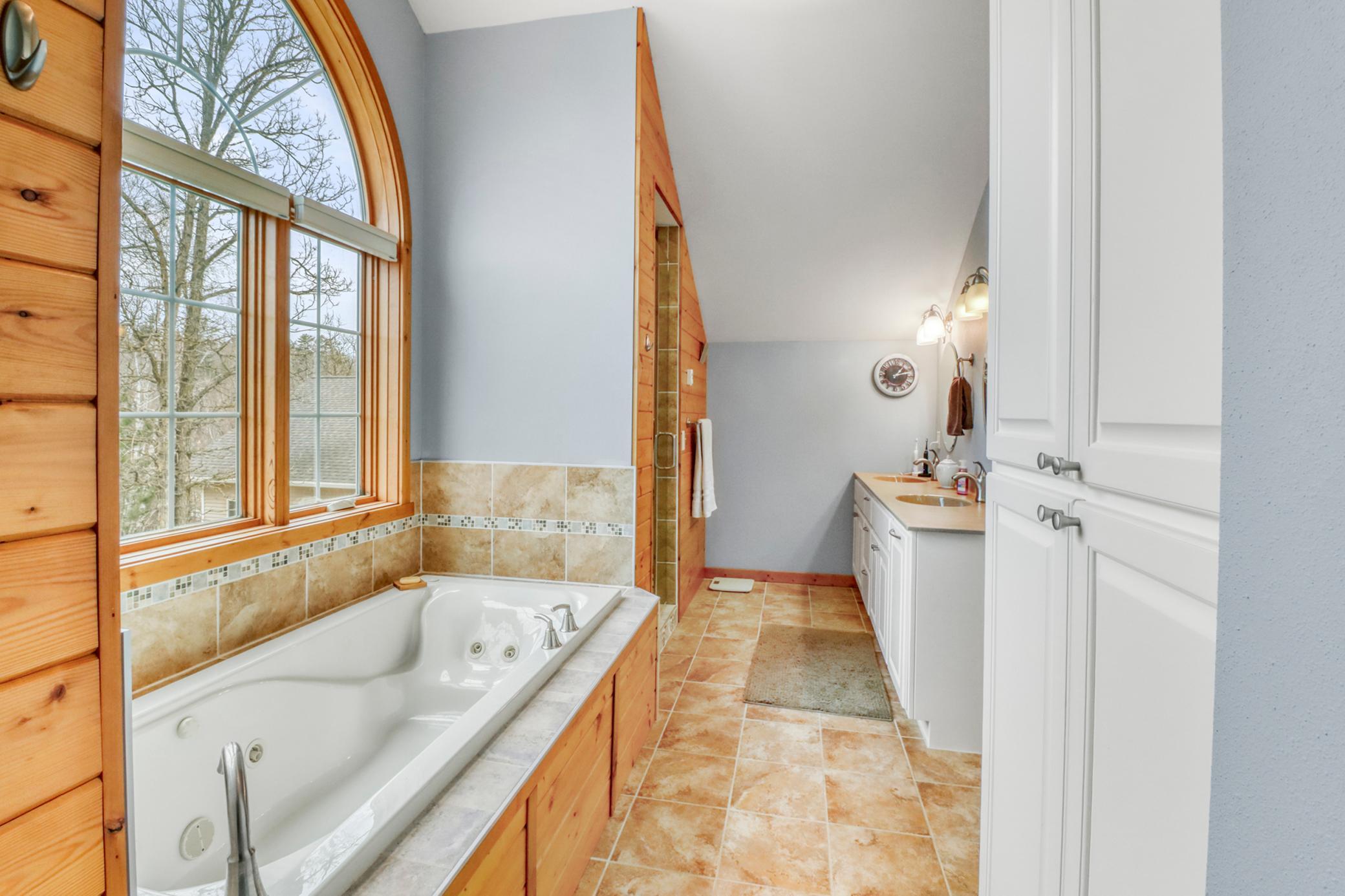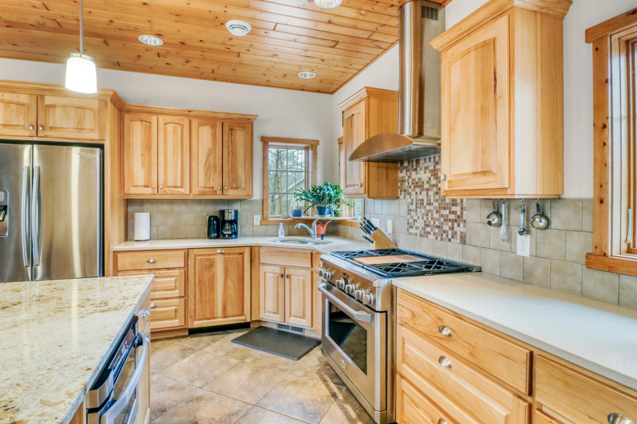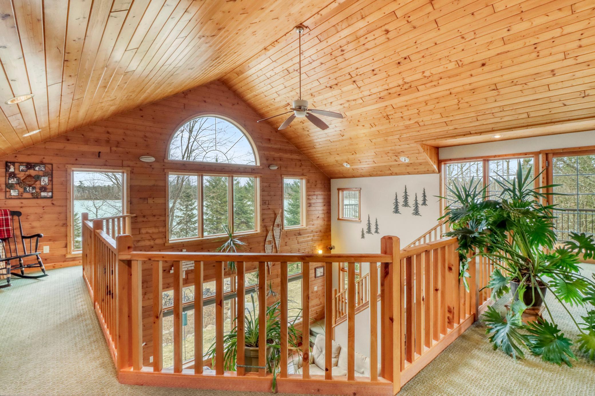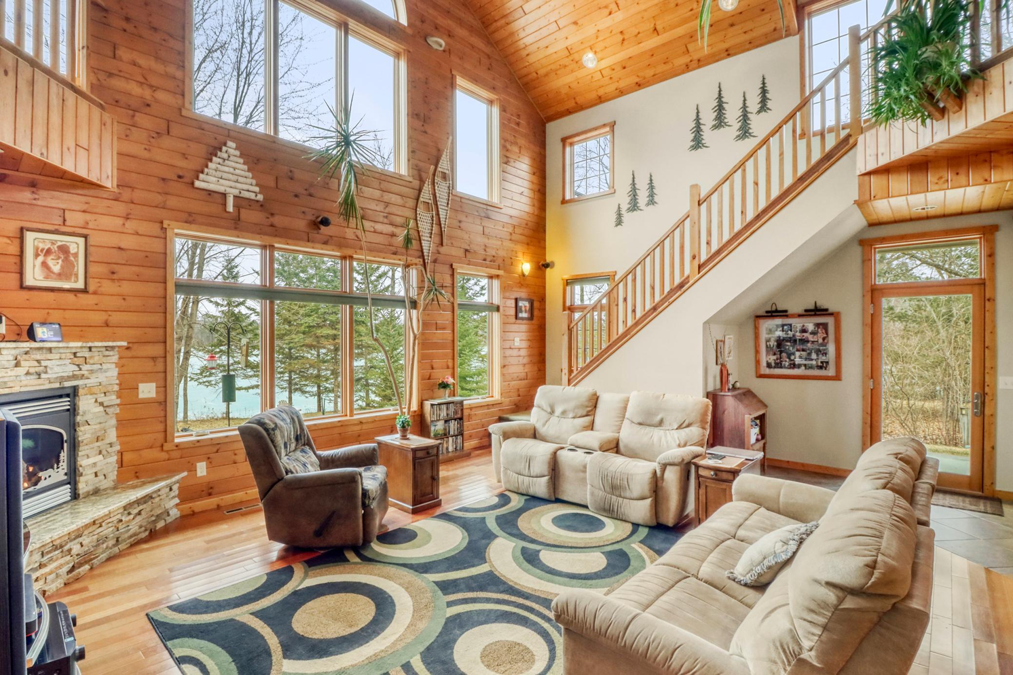 Inside the home you are immediately greeted by the vaulted ceilings and floor to ceiling windows taking in that gorgeous lake view. Main floor has two bedrooms and full bathroom. With main floor laundry for added convenience. Kitchen has stainless steel appliances, custom cabinetry, granite large center island and quartz counter tops. Upstairs in the loft is additional sleeping space with its own private bathroom and walk-in closet.
