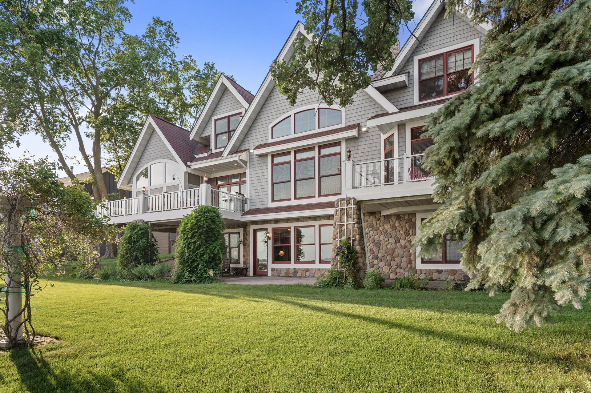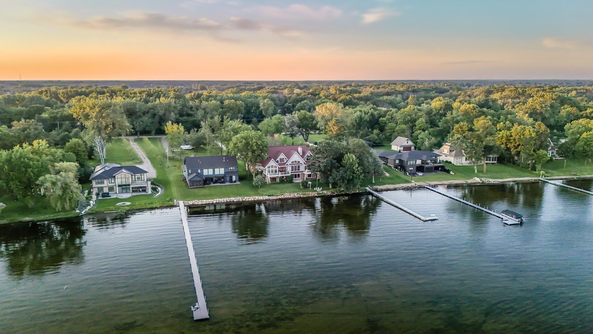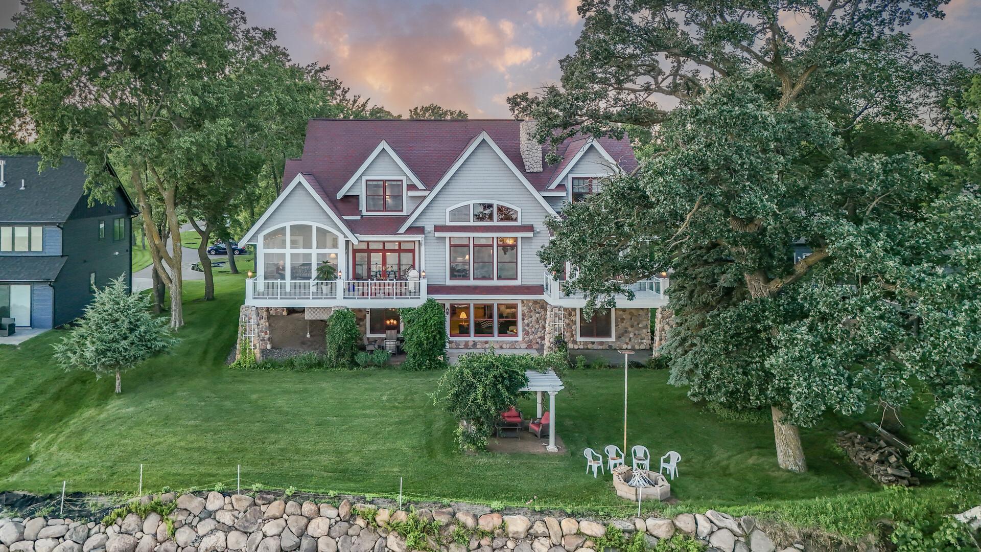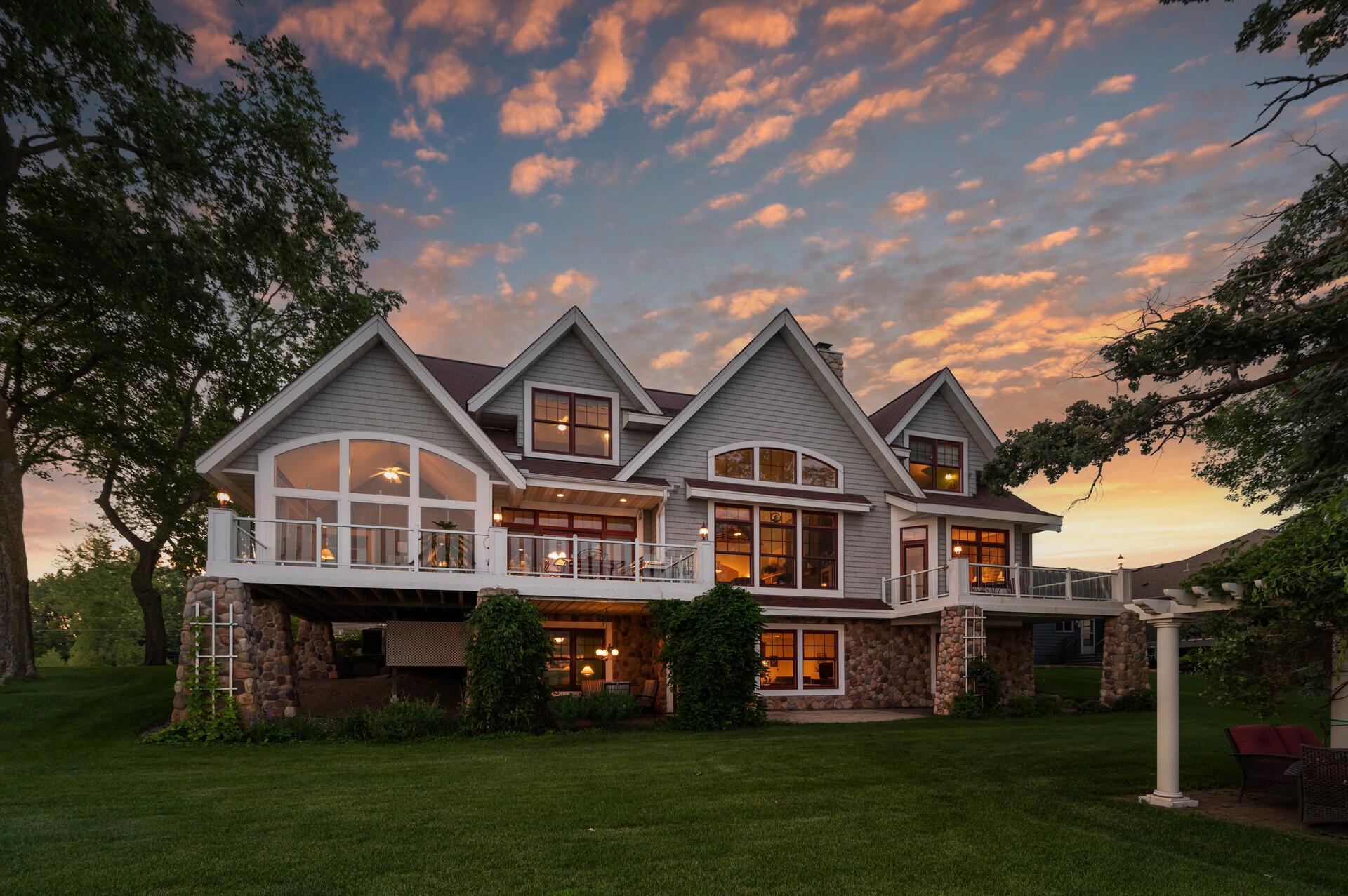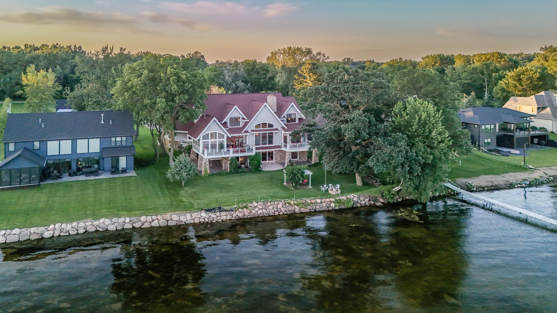 Welcome to a once-in-a-lifetime opportunity on Forest Lake’s coveted “Gold Coast” — a 1 owner, custom built lakeshore estate designed to feel like a timeless 1920s seaside cottage. Crafted in 2005, this one-of-a-kind home rests on a beautifully landscaped 550’ deep lot with 100’ of south-facing sandy shoreline on Forest Lake’s desirable First Lake. Positioned 400 feet from the road, the home offers serenity, abundant natural light & gentle summer breezes—just minutes from local amenities & freeway access, allowing for an easy 35-minute commute to the Twin Cities. Designed by renowned architect Ben Nelson, the home showcases exceptional craftsmanship with 12” precast Spancrete floors, TimberStrand framing & in-floor radiant heat on all three levels (excluding the upper garage & guest apartment). Energy-efficient features include 2x6 construction, Corbond foam insulation, Owens Corning Berkshire shingles & maintenance-free Nailite siding with Azek trim. The property features an impressive, attached garage configuration with a 3+ car upper garage and a 4+ car lower garage—offering exceptional space for vehicles, hobbies & all your recreational equipment, from lake gear to outdoor toys. The lower garage is fully equipped with in-floor heat, a floor drain, insulated walls & a 100-amp subpanel, adding functionality & year-round usability. The home offers 4 bedrooms, a dedicated office & additional flexible spaces perfect for a sewing room, workout room, or creative studio. It also includes a separate living suite—providing versatility for a variety of lifestyles, multi-generational living, or extended guests. There are 3 full baths, 3 three-quarter baths & 1 half baths. Most bedrooms feature beautiful lake views, enhancing the connection to the setting throughout. The spectacular great room features soaring cathedral ceilings, a floor-to-ceiling stone gas fireplace, custom built-ins & panoramic lake views. Majestic eagles often glide across the water, adding to the peaceful, scenic setting. The home also features a dedicated 13-seat theater room—perfect for movie nights, entertaining, or enjoying the big game in comfort. The main-floor primary suite offers a private lakeview balcony, a marble fireplace, a jetted tub, a rain shower, dual marble sinks, a walk-in closet & a charming nautical porthole window with patio seating. The chef’s kitchen is thoughtfully designed with a 6-burner Viking range, double wall oven, Miele panel-front dishwasher, granite island, copper ceiling & custom cabinetry. Adjacent are a formal dining room & an inviting breakfast space. The main-floor laundry features Zodiac blue quartz counters, a washer/dryer, a sink & a convenient laundry chute. Enjoy year-round lakeside living in the 3-season porch, which features a vaulted ceiling & E-Z Breeze window system, along with a maintenance-free Azek deck added in 2023. Every space reflects thoughtful design, comfort & timeless character. The private guest apartment above the garage offers access from the loft & a separate entrance from the main-level garage, providing excellent flexibility & privacy. This space includes a full kitchen, dining area, bedroom, three-quarter bath with a fully tiled shower, hickory floors, skylight & baseboard heat—ideal for guests, extended family, or independent living.