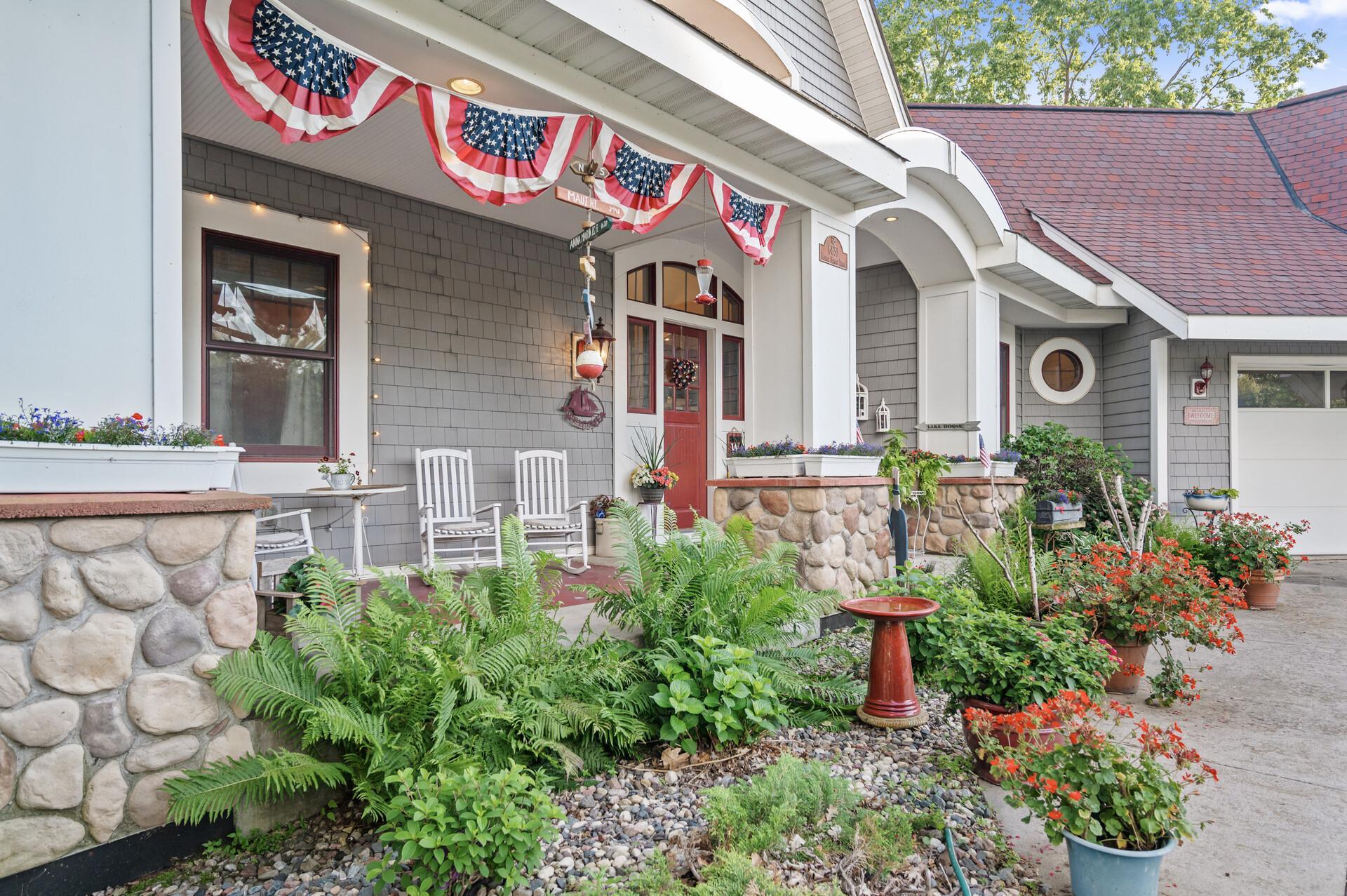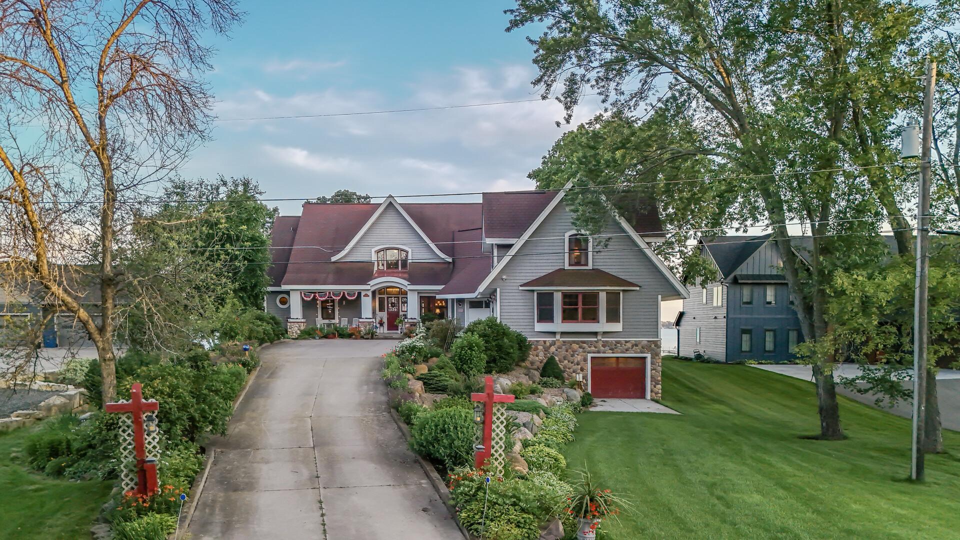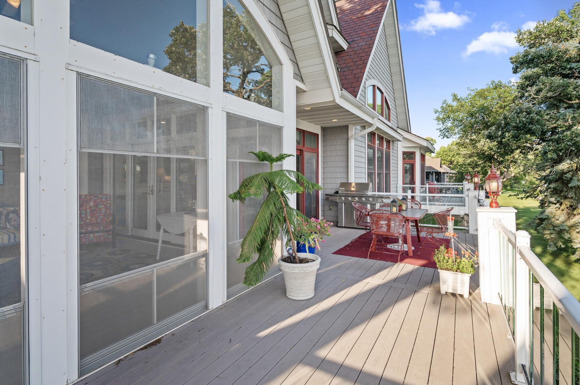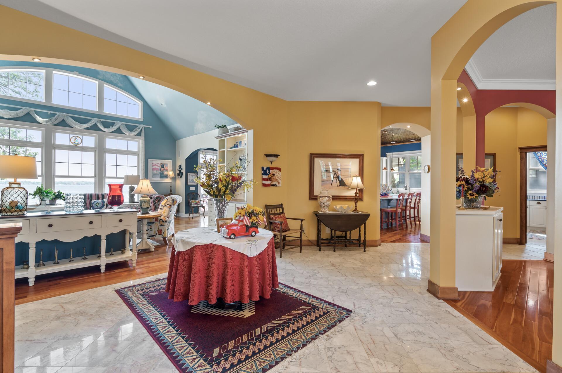 Welcome to a once-in-a-lifetime opportunity on Forest Lake’s coveted “Gold Coast” — a 1 owner, custom built lakeshore estate designed to feel like a timeless 1920s seaside cottage. Crafted in 2005, this one-of-a-kind home rests on a beautifully landscaped 550’ deep lot with 100’ of south-facing sandy shoreline on Forest Lake’s desirable First Lake. Positioned 400 feet from the road, the home offers serenity, abundant natural light & gentle summer breezes—just minutes from local amenities & freeway access, allowing for an easy 35-minute commute to the Twin Cities. Designed by renowned architect Ben Nelson, the home showcases exceptional craftsmanship with 12” precast Spancrete floors, TimberStrand framing & in-floor radiant heat on all three levels (excluding the upper garage & guest apartment). Energy-efficient features include 2x6 construction, Corbond foam insulation, Owens Corning Berkshire shingles & maintenance-free Nailite siding with Azek trim. The property features an impressive, attached garage configuration with a 3+ car upper garage and a 4+ car lower garage—offering exceptional space for vehicles, hobbies & all your recreational equipment, from lake gear to outdoor toys. The lower garage is fully equipped with in-floor heat, a floor drain, insulated walls & a 100-amp subpanel, adding functionality & year-round usability. The home offers 4 bedrooms, a dedicated office & additional flexible spaces perfect for a sewing room, workout room, or creative studio. It also includes a separate living suite—providing versatility for a variety of lifestyles, multi-generational living, or extended guests. There are 3 full baths, 3 three-quarter baths & 1 half baths. Most bedrooms feature beautiful lake views, enhancing the connection to the setting throughout. The spectacular great room features soaring cathedral ceilings, a floor-to-ceiling stone gas fireplace, custom built-ins & panoramic lake views. Majestic eagles often glide across the water, adding to the peaceful, scenic setting. The home also features a dedicated 13-seat theater room—perfect for movie nights, entertaining, or enjoying the big game in comfort. The main-floor primary suite offers a private lakeview balcony, a marble fireplace, a jetted tub, a rain shower, dual marble sinks, a walk-in closet & a charming nautical porthole window with patio seating. The chef’s kitchen is thoughtfully designed with a 6-burner Viking range, double wall oven, Miele panel-front dishwasher, granite island, copper ceiling & custom cabinetry. Adjacent are a formal dining room & an inviting breakfast space. The main-floor laundry features Zodiac blue quartz counters, a washer/dryer, a sink & a convenient laundry chute. Enjoy year-round lakeside living in the 3-season porch, which features a vaulted ceiling & E-Z Breeze window system, along with a maintenance-free Azek deck added in 2023. Every space reflects thoughtful design, comfort & timeless character. The private guest apartment above the garage offers access from the loft & a separate entrance from the main-level garage, providing excellent flexibility & privacy. This space includes a full kitchen, dining area, bedroom, three-quarter bath with a fully tiled shower, hickory floors, skylight & baseboard heat—ideal for guests, extended family, or independent living.