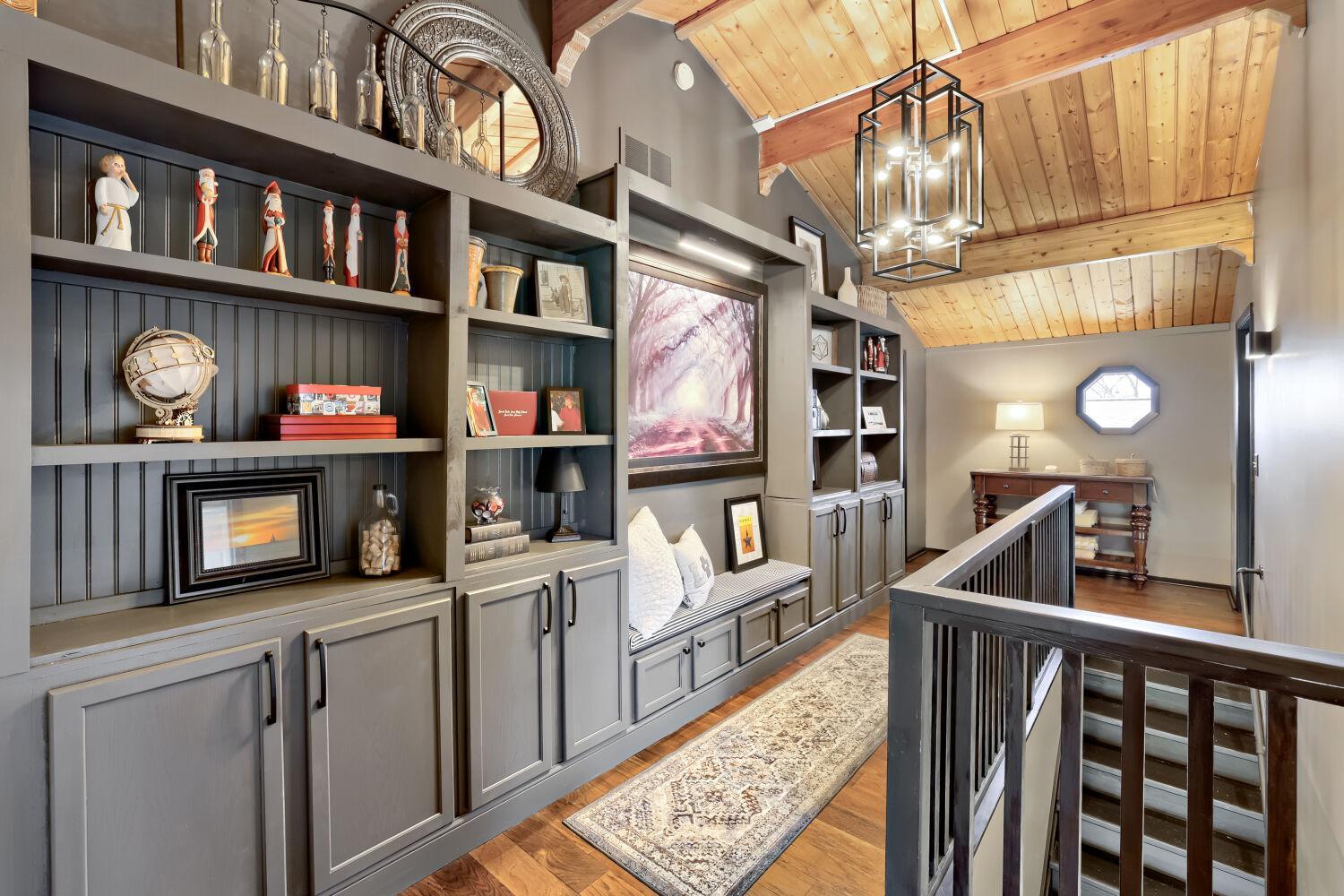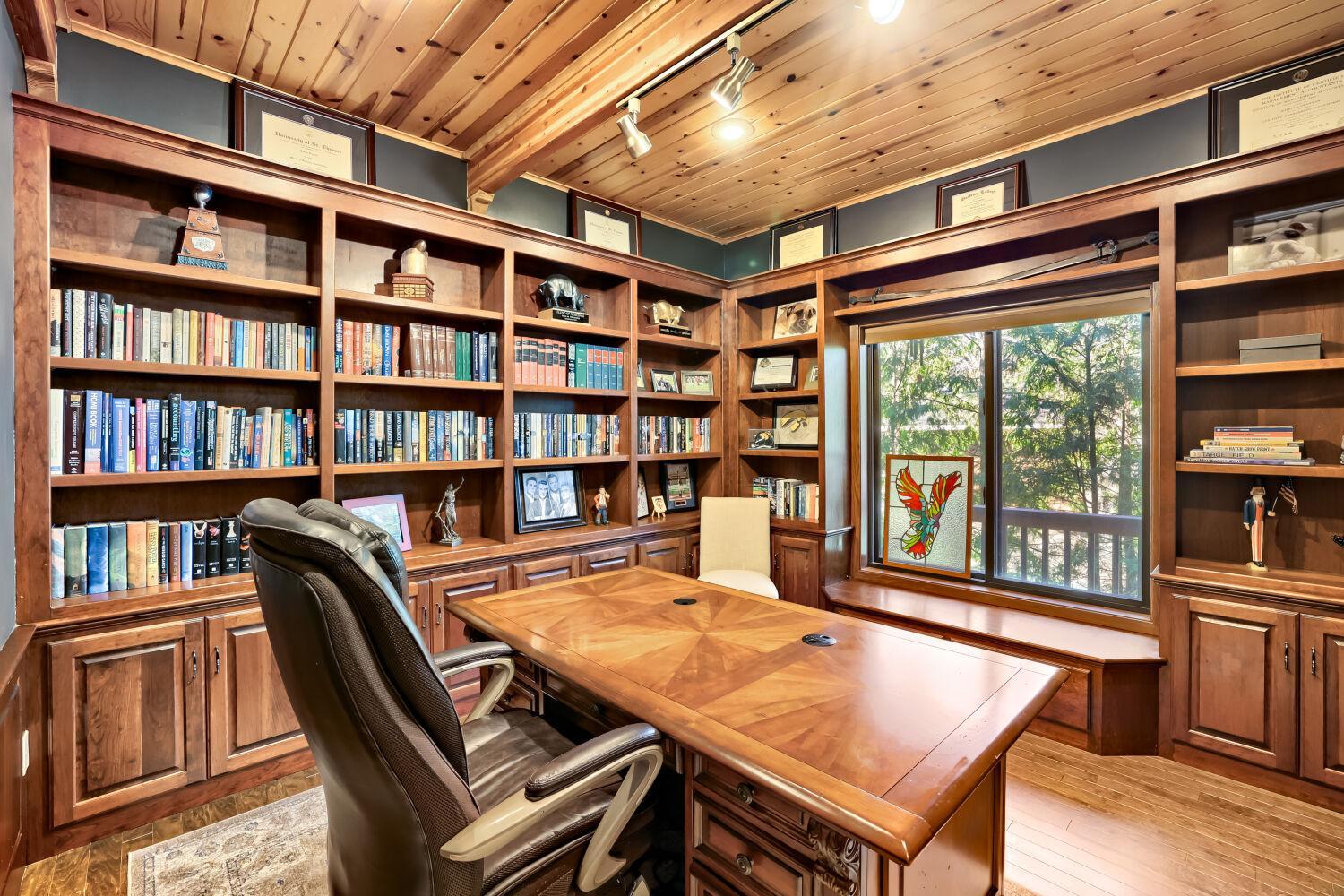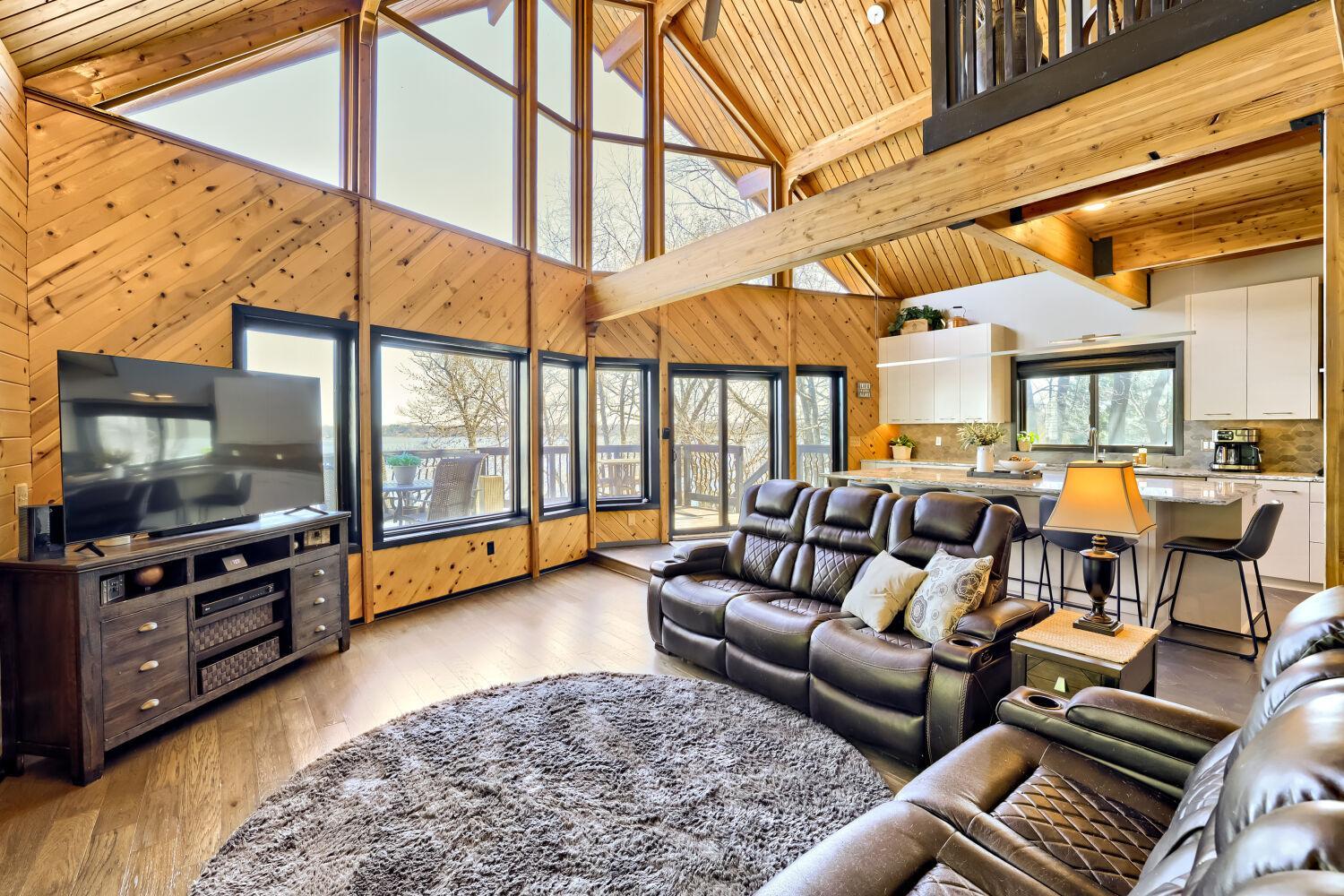 Perfectly perched and nestled upon the serene, exclusive shores of Forest Lake's 3rd lake, this fully renovated five-bedroom, four-bath residence offers a premier, tranquil waterfront lifestyle with refined, modern rustic elegance. COMMANDING elevated views captivate you as you gaze out at the beauty that the lake provides. The A-Frame style just under 4,700 sq ft home maximizes stunning, direct lake vistas through soaring ceilings and expansive windows, merging bright, sophisticated interiors.